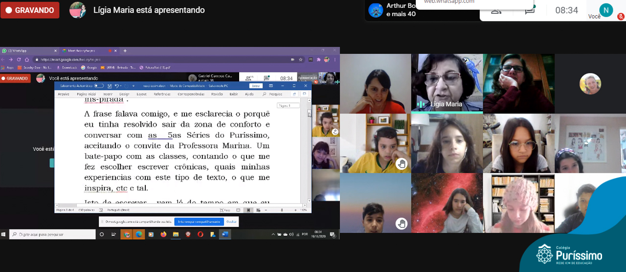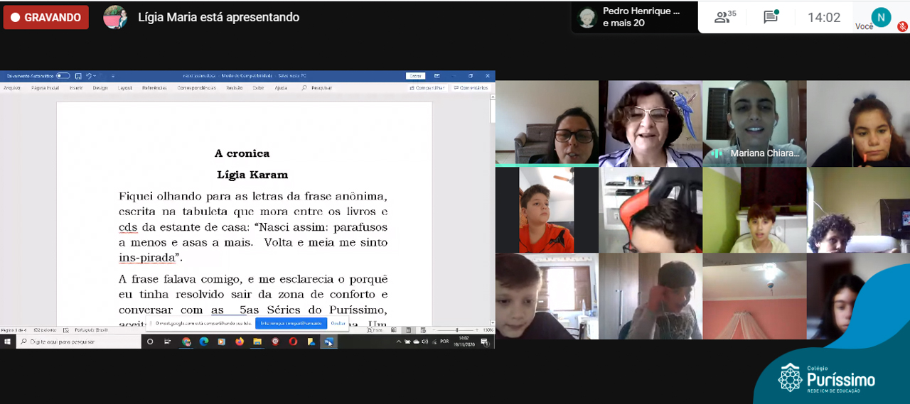 Na última quinta-feira, 19 de novembro, os alunos dos 5ºs anos receberam na aula on-line a cronista Lígia Maria Karam para uma palestra interessante sobre o assunto, o qual é tema de estudo do final do trimestre.
