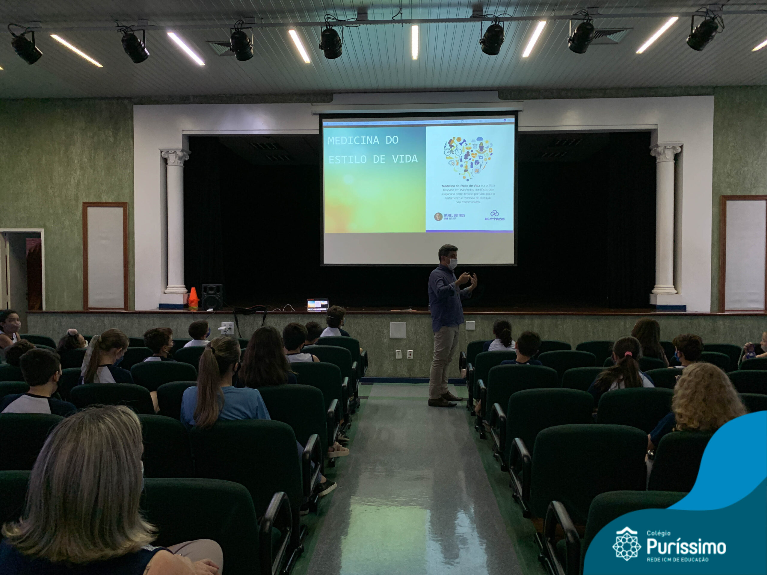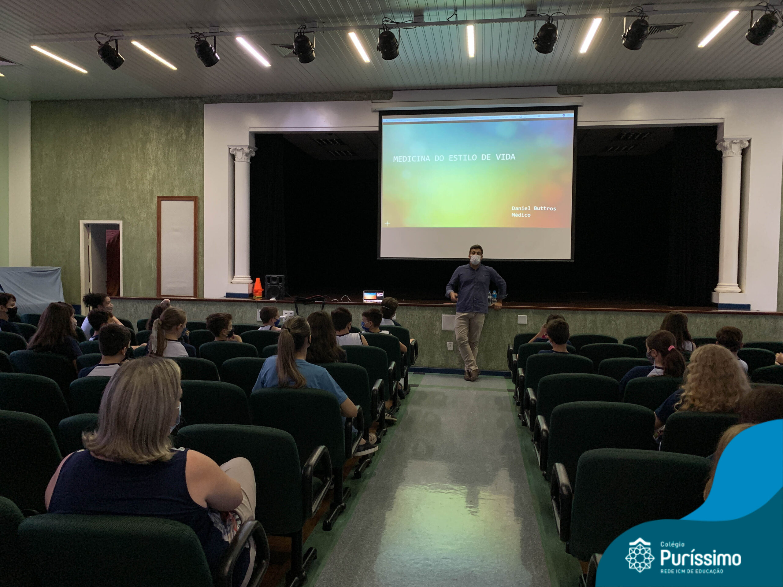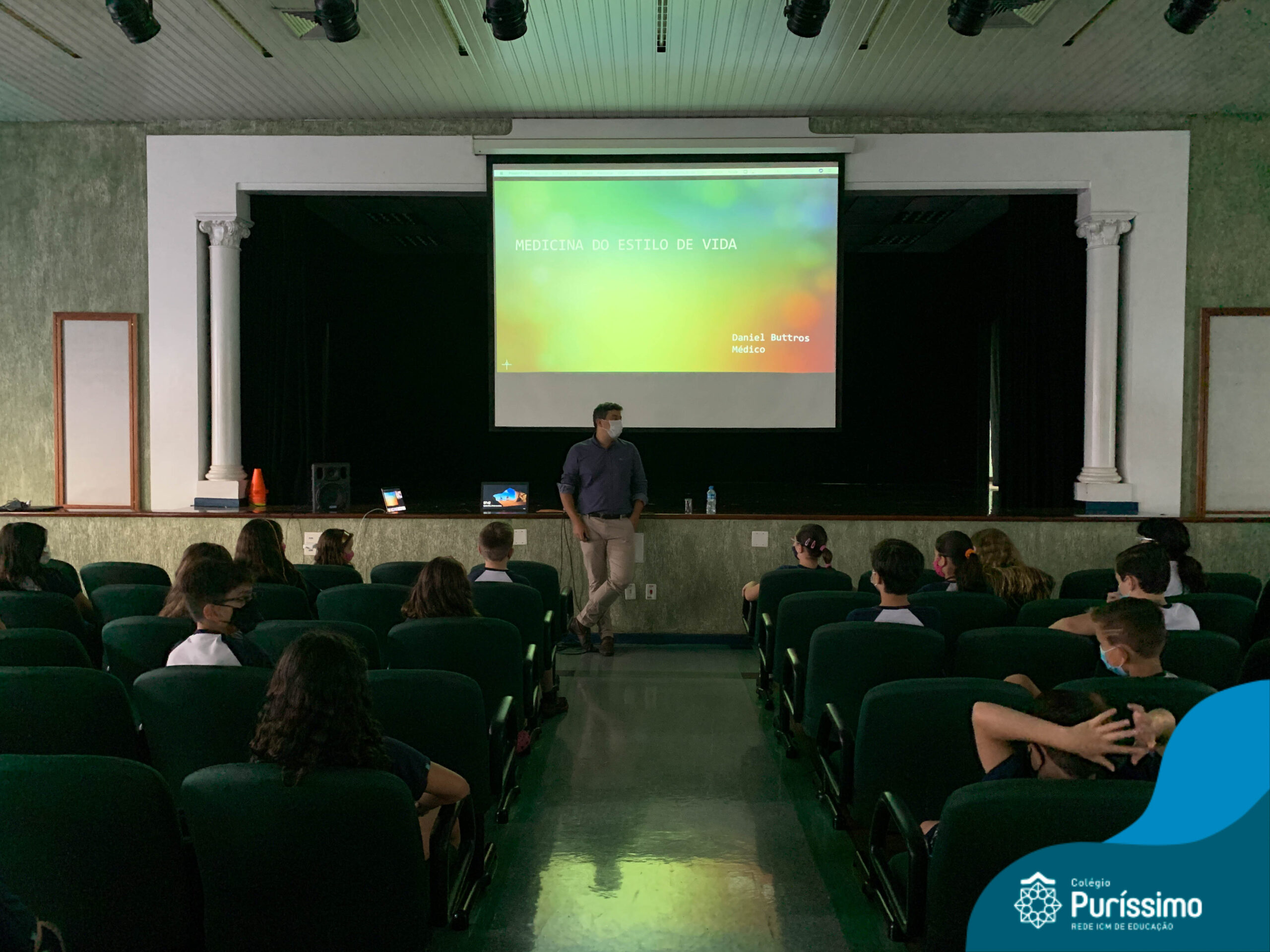 Daniel, que é pai das alunas Isabela e Lara, explicou para as turmas que a medicina do estilo de vida possui seis pilares: a nutrição (alimentação saudável), exercícios físicos, qualidade do sono, o controle do estresse, a prevenção de tabaco e álcool e os relacionamentos saudáveis entre pessoas.