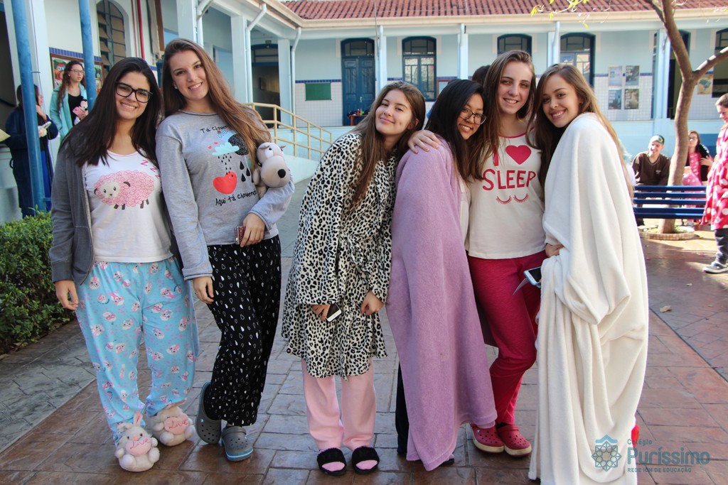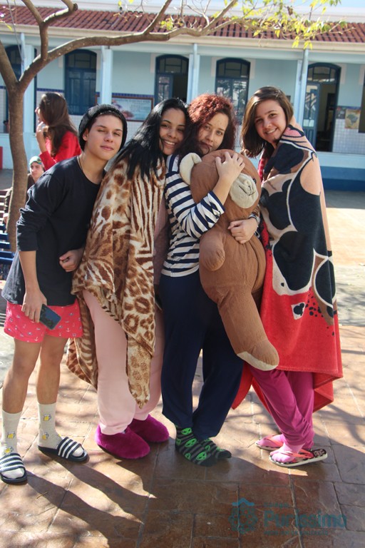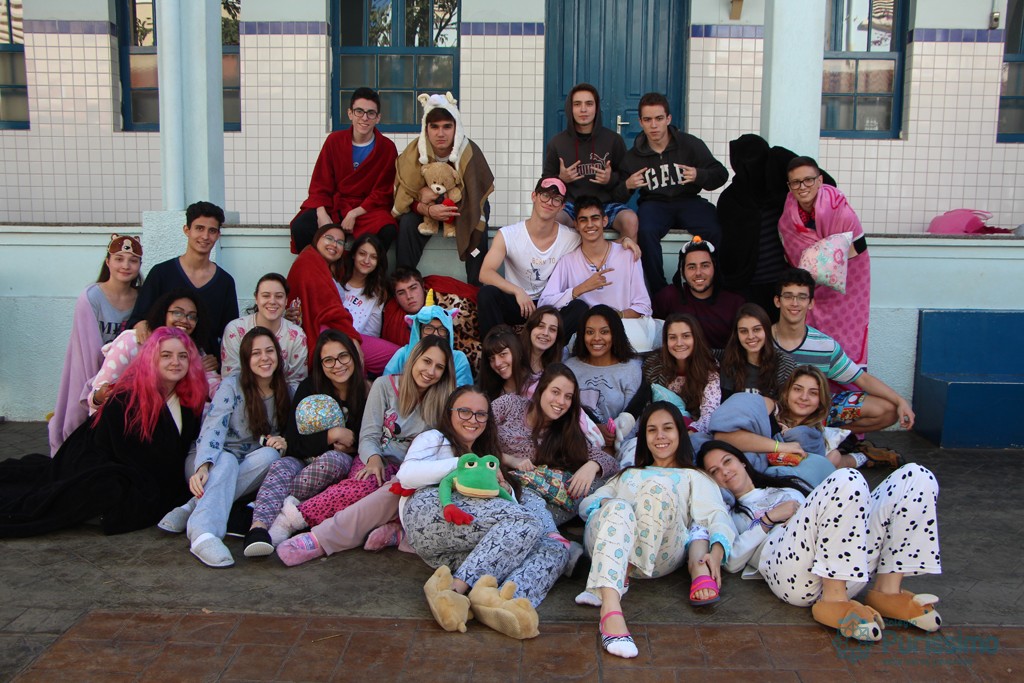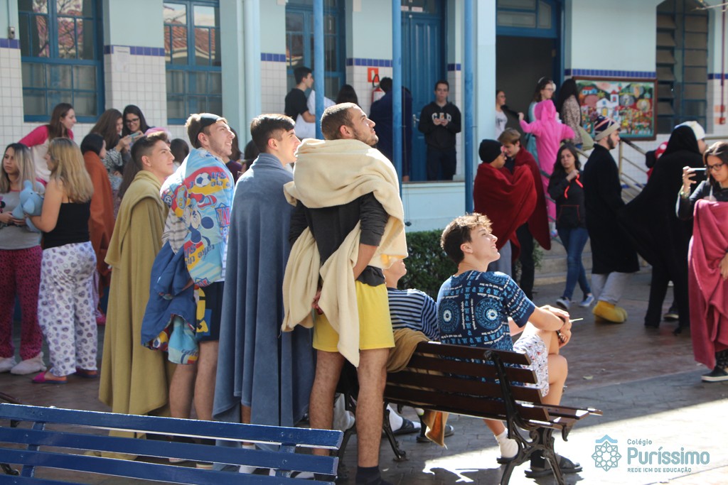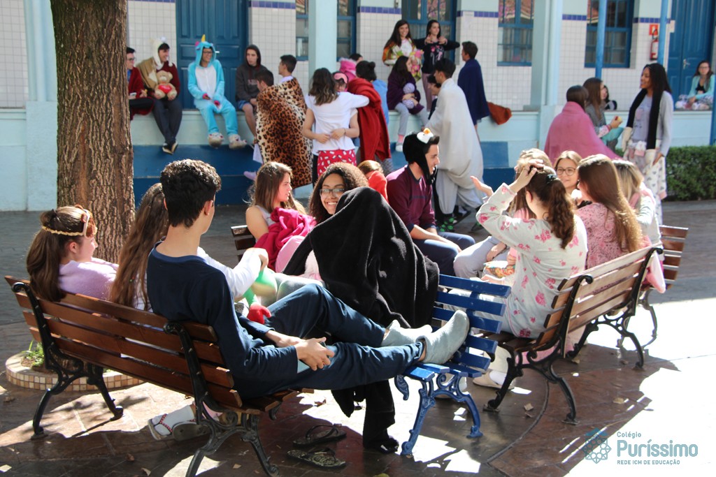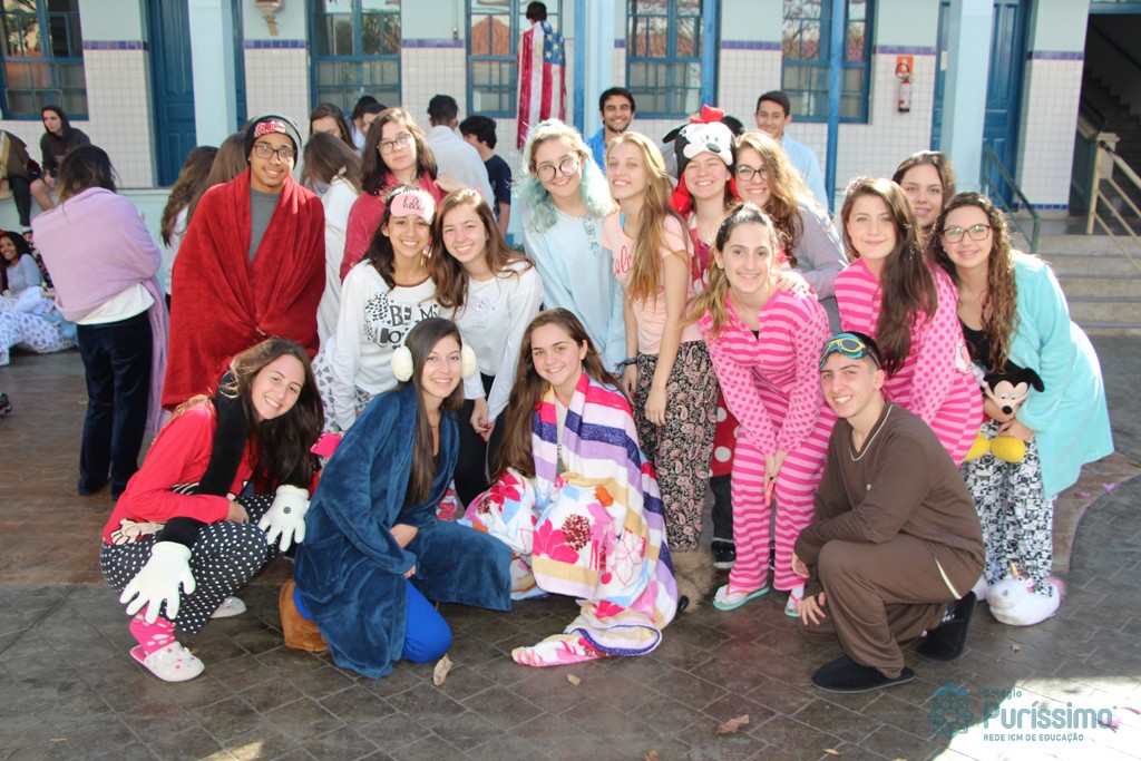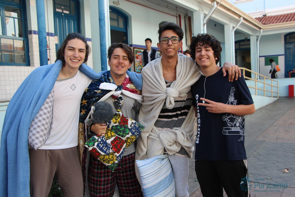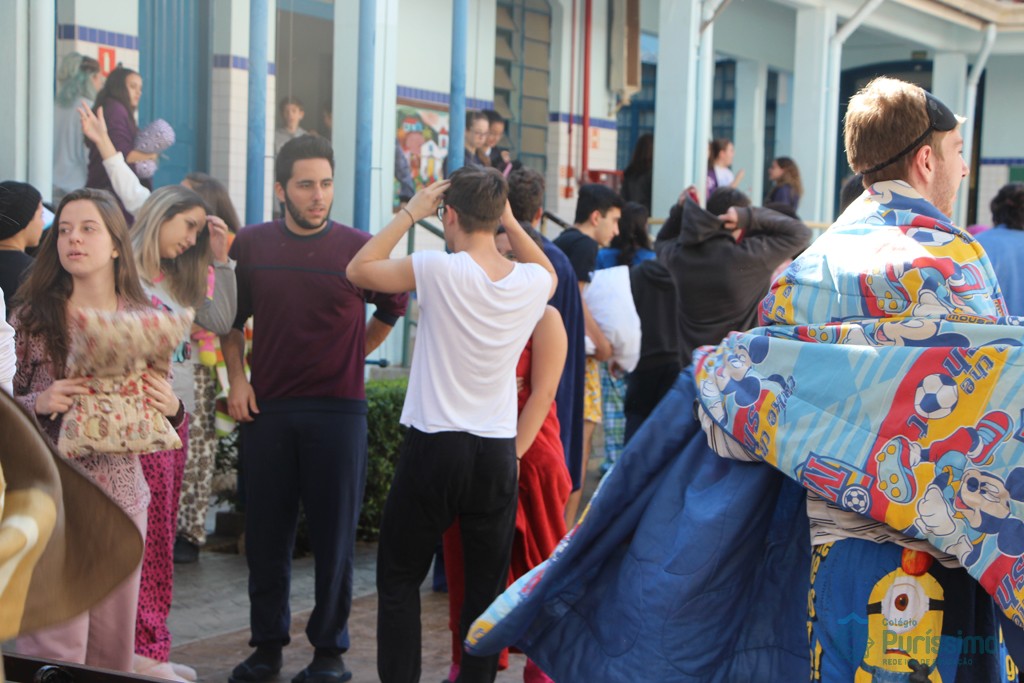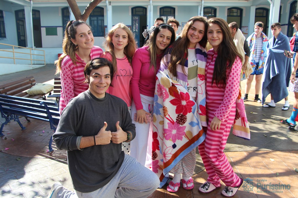 No intervalo dessa quinta – feira, 22 de junho, nem parecia que os alunos do Ensino Médio tinham saído da cama. Os estudantes trouxeram para o Colégio Puríssimo seus pijamas, cobertores e pantufas, para o último Trote do semestre.
