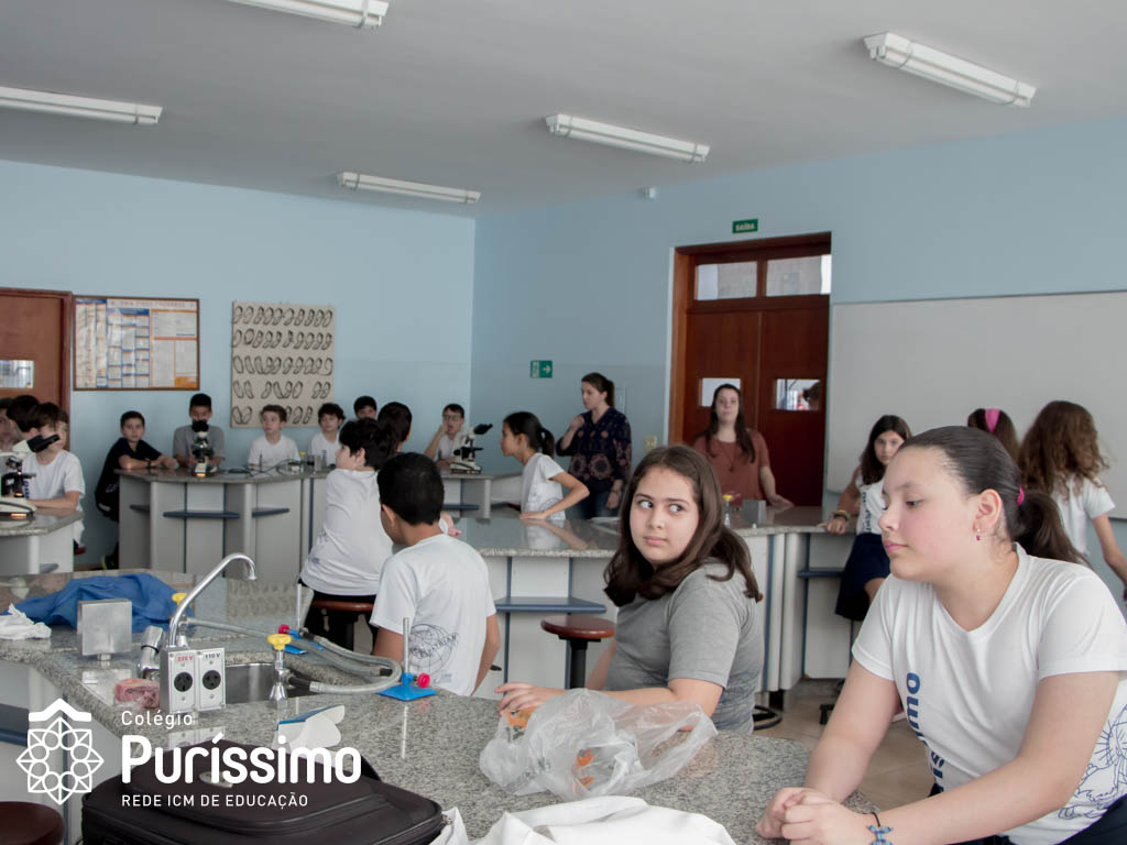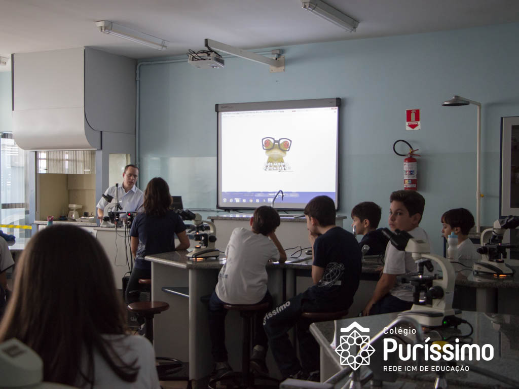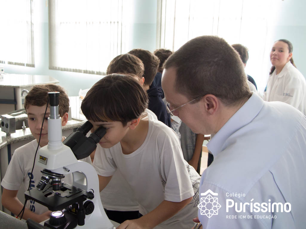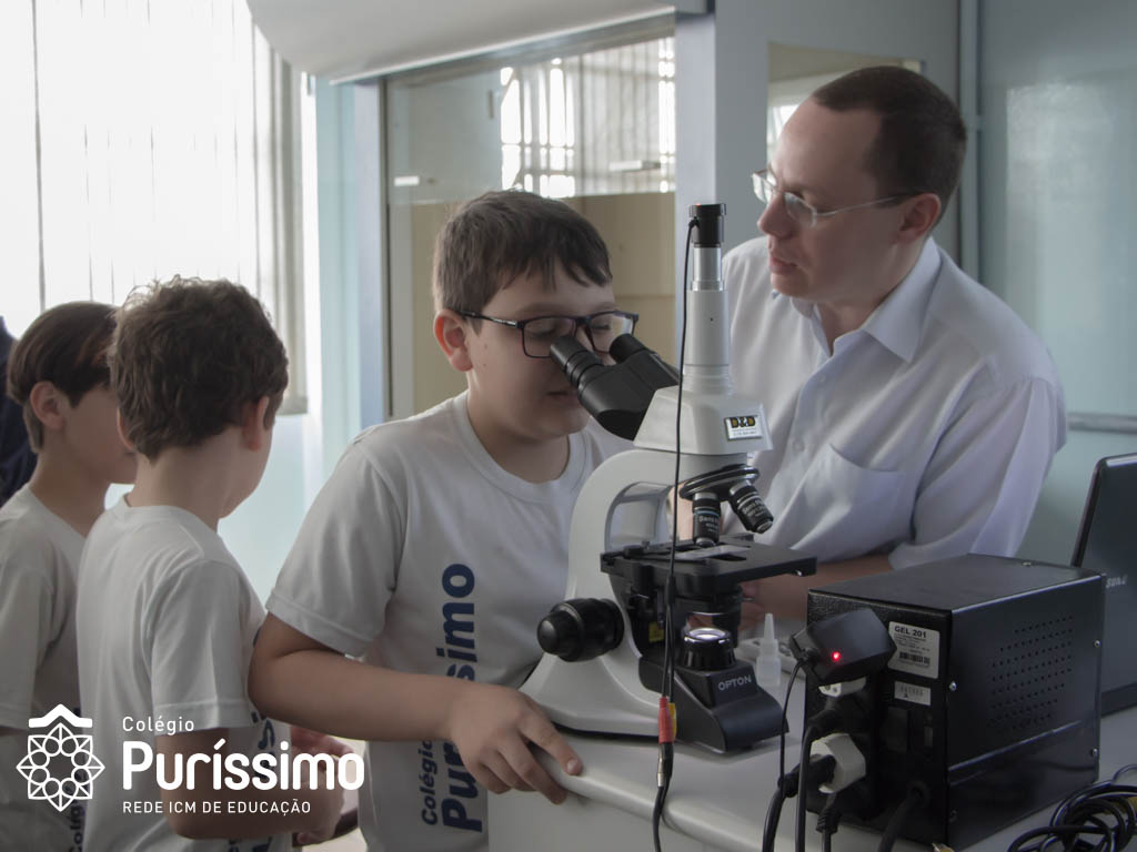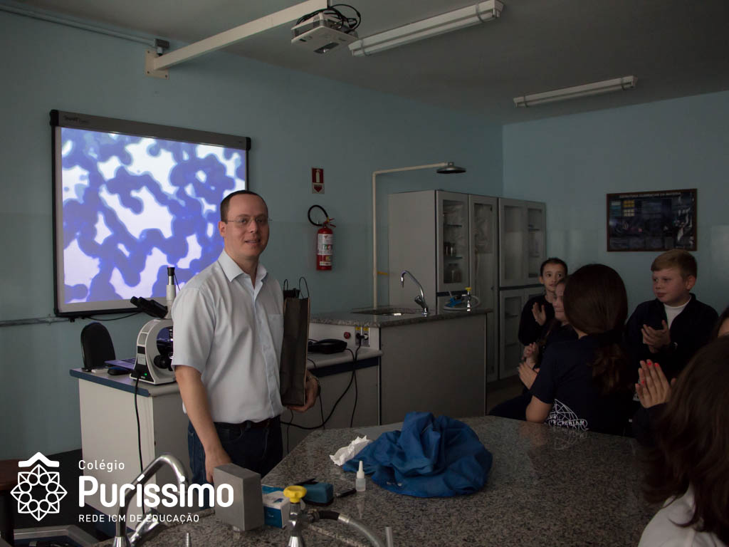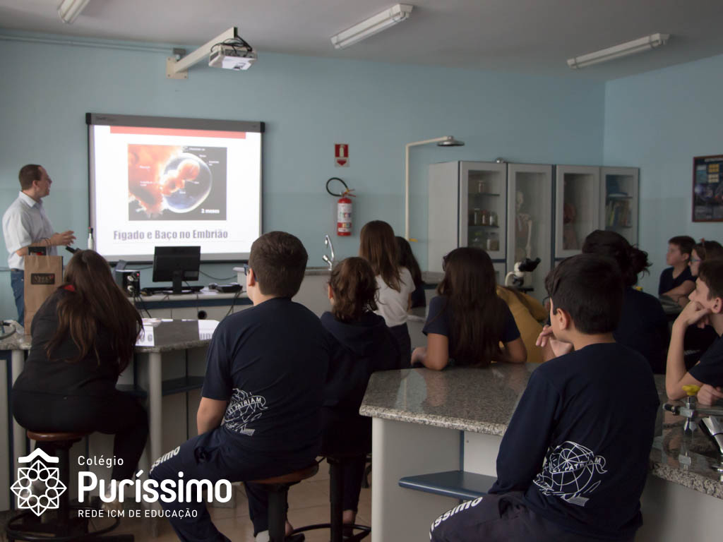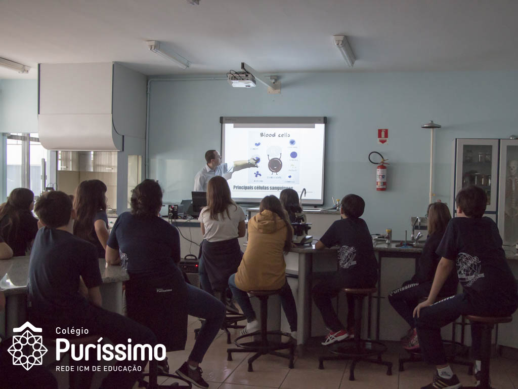 Os alunos do 5º ano tiveram uma aula especial de ciências na última quarta, 23, isso porque o Doutor Sergio Pimenta Terra Júnior, pai da aluna Mariana Dietrich Terra, do 5º1 da manhã, veio ao Colégio para complementar os estudos sobre as células sanguíneas.