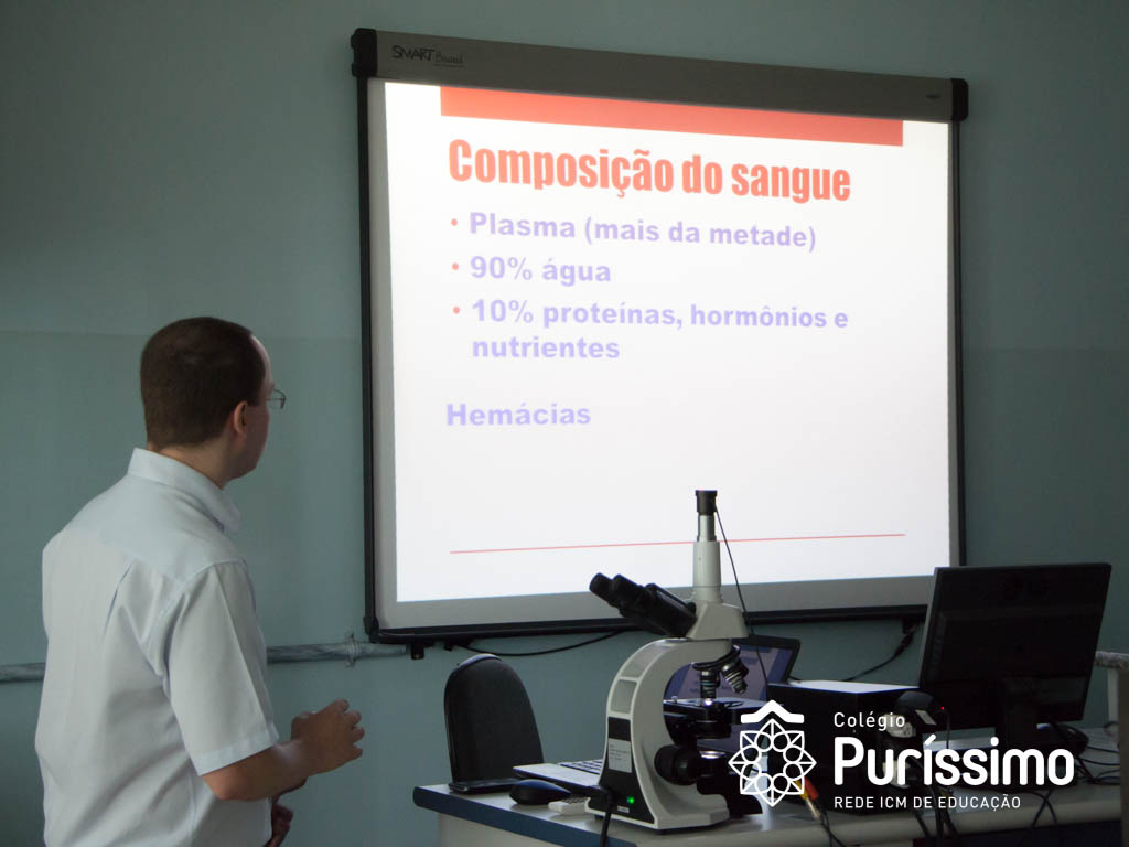 Além de fazer uma apresentação sobre o sangue, o Doutor Sergio, explicou sobre seus componentes e suas funções, elucidando as explicações com lâminas com amostra de sangue, que os alunos puderam examinar nos microscópios e verificar glóbulos vermelhos, hemácias, glóbulos brancos e leucócitos. Terra também trouxe um oxímetro, aparelho que mede a saturação do sangue, desconhecido por muitos alunos.