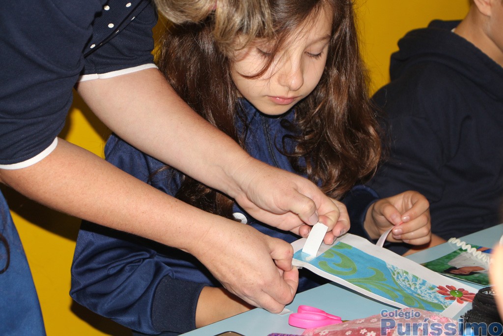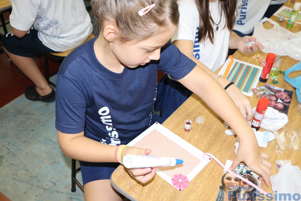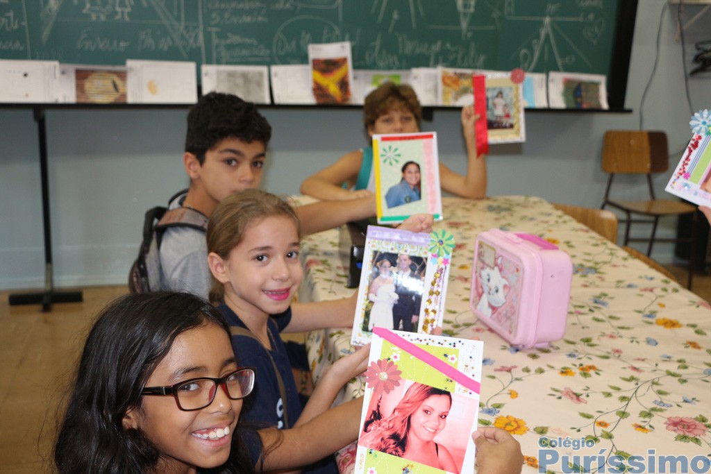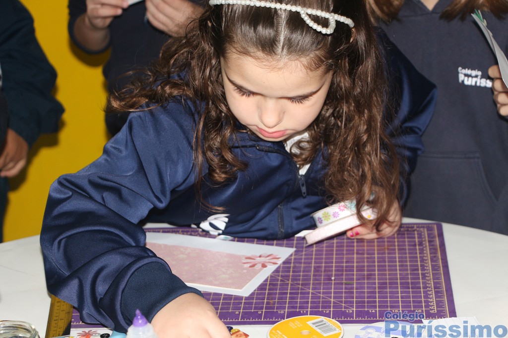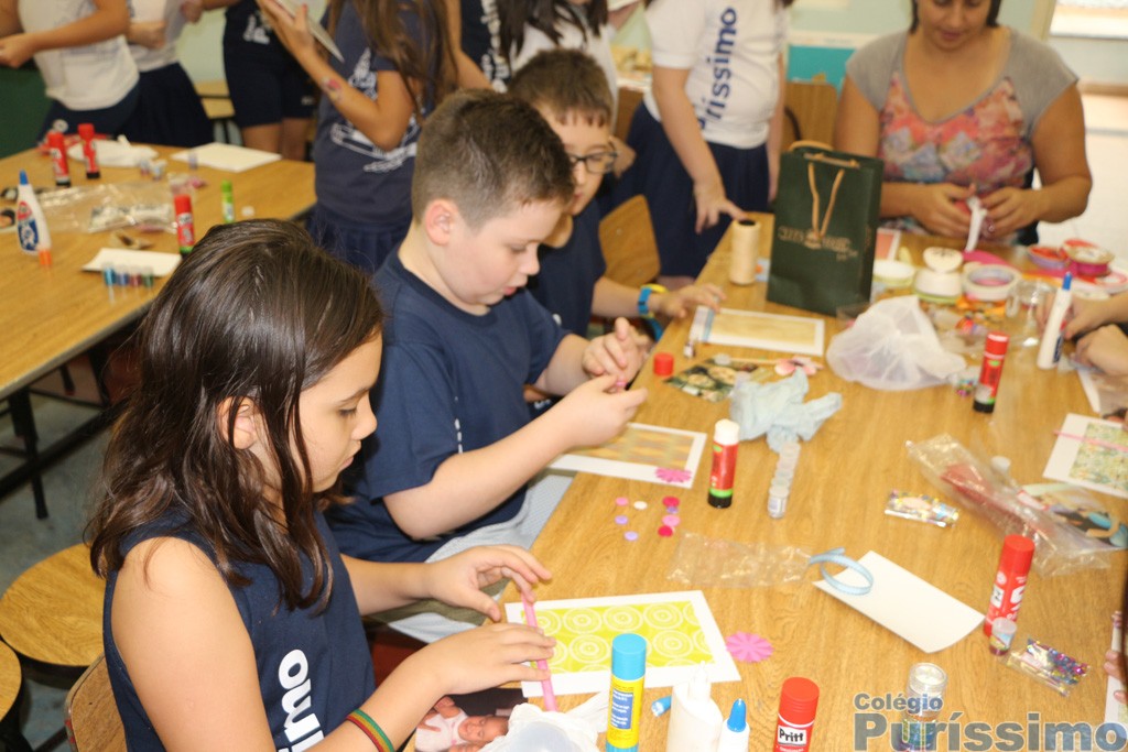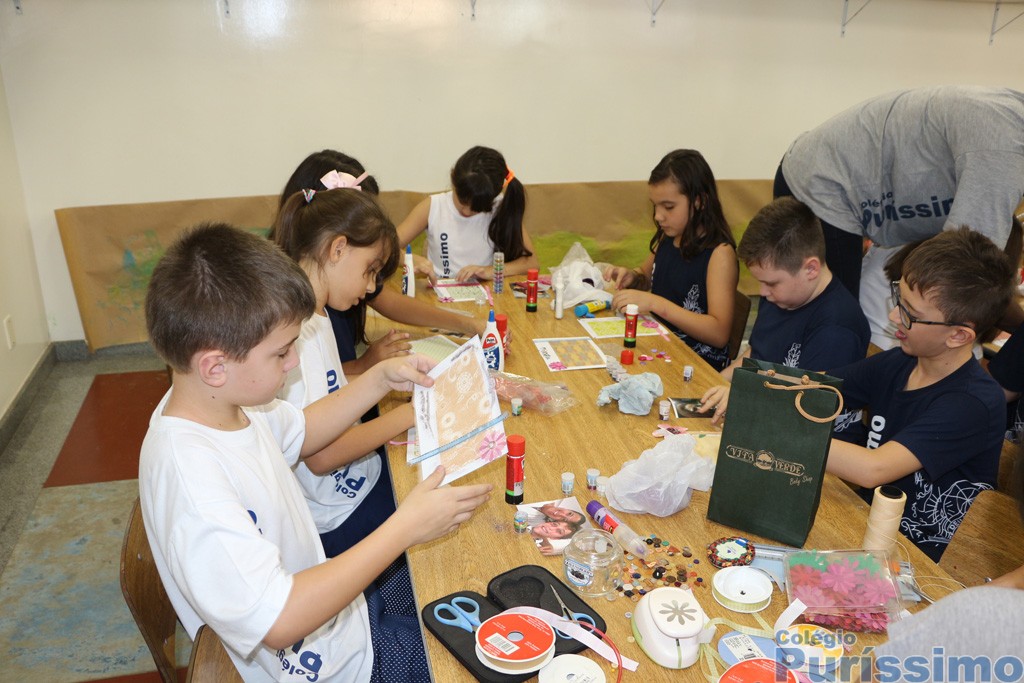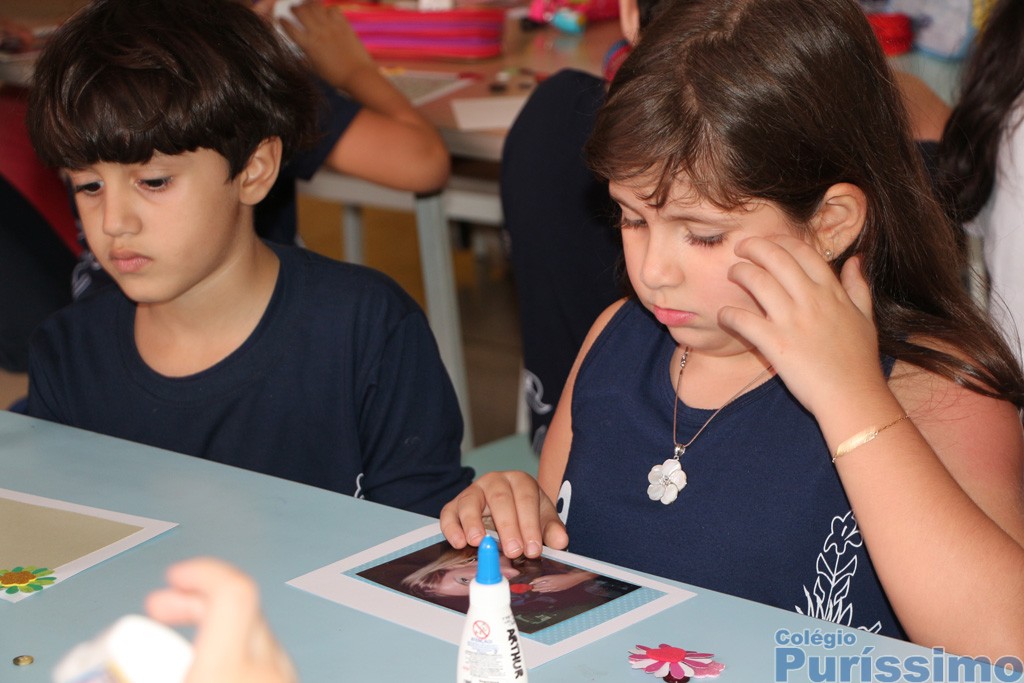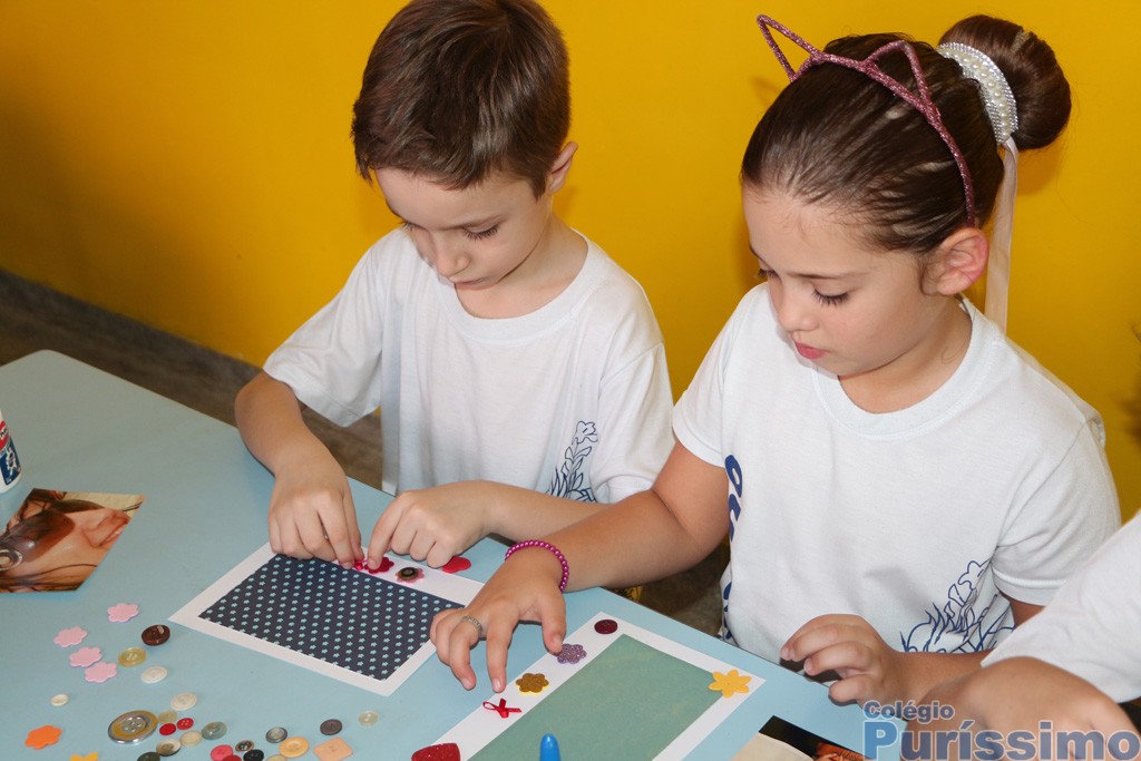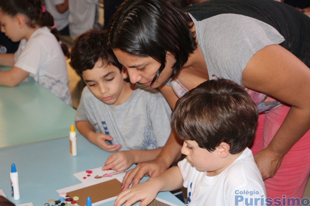 Em homenagem ao Dia das Mães os alunos do 2º ao 4º ano do Ensino Fundamental realizaram uma oficina de cartões para entregar para as mamães e responsáveis. Para a atividade contou – se com a presença da artesã Michele Concon, mãe dos alunos Tiago e Cauã do Ensino Fundamental II.