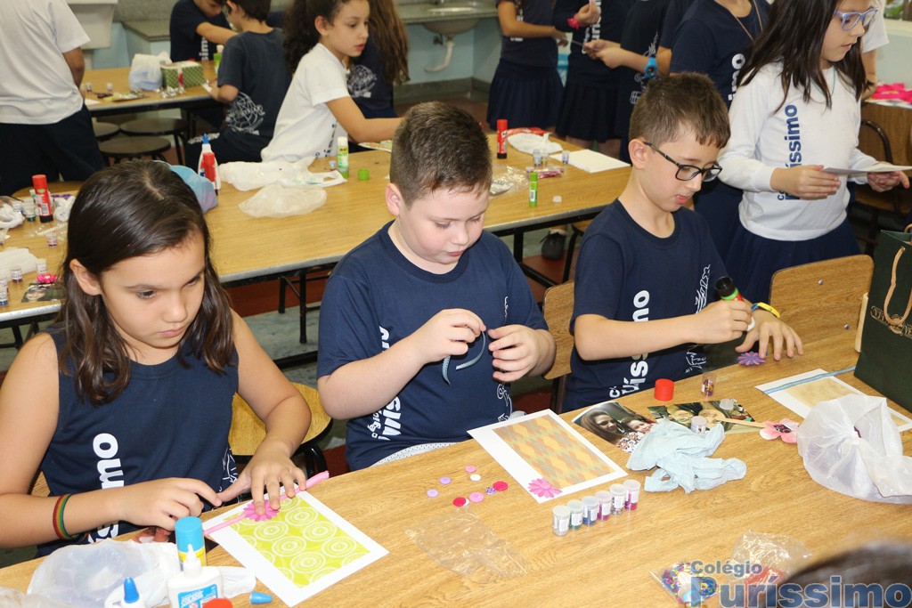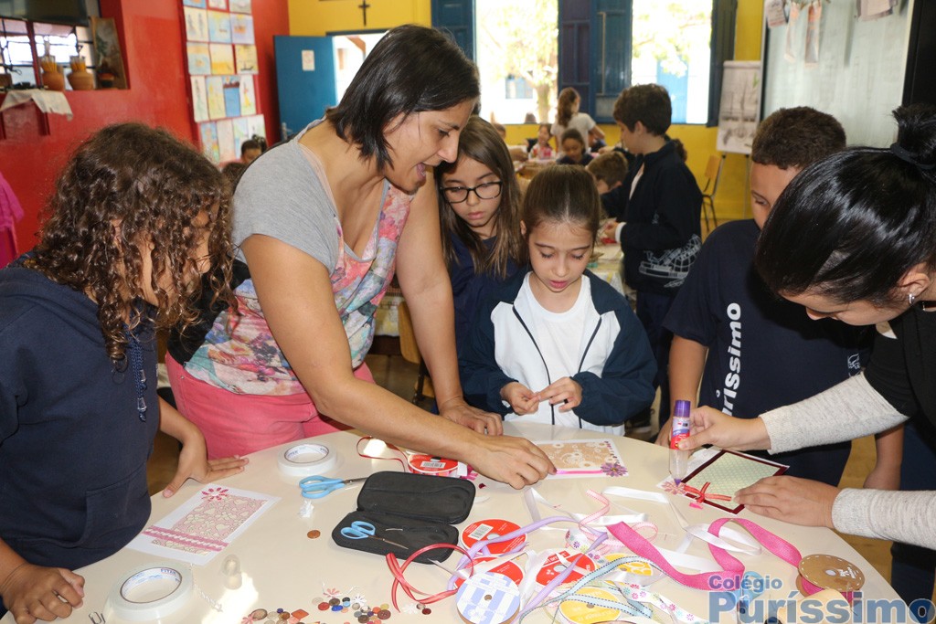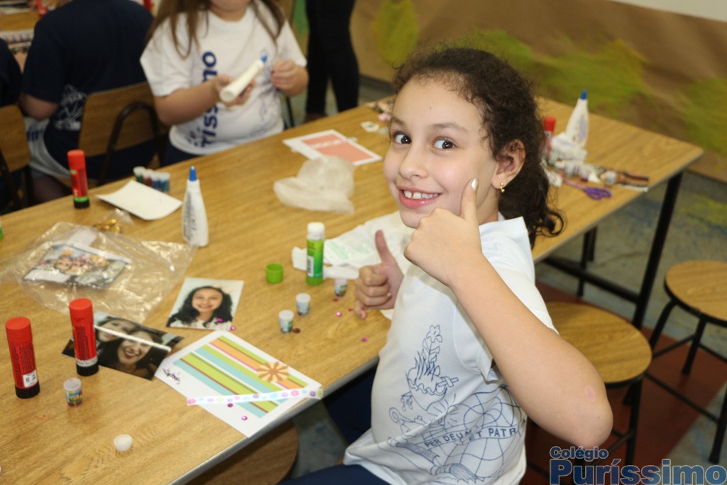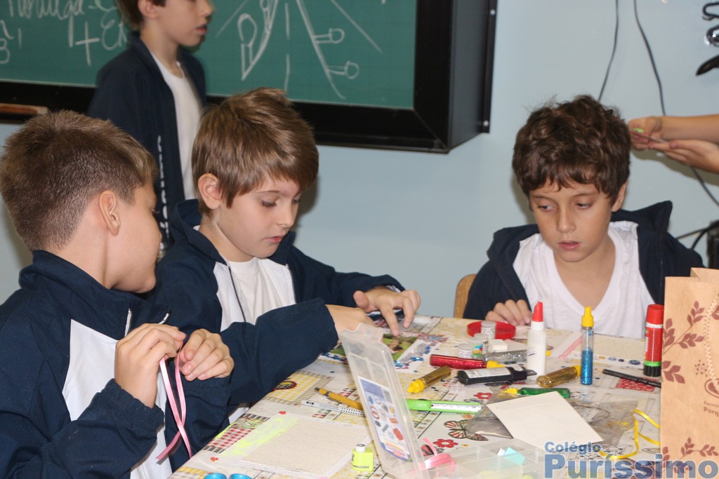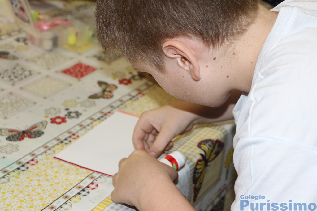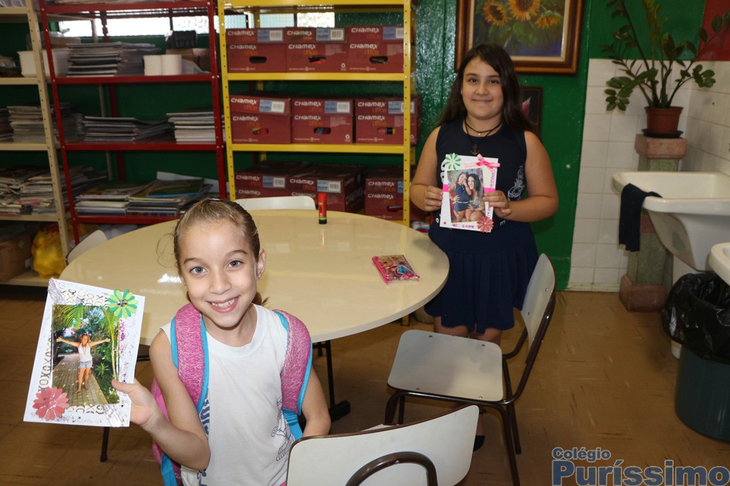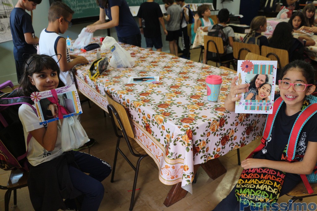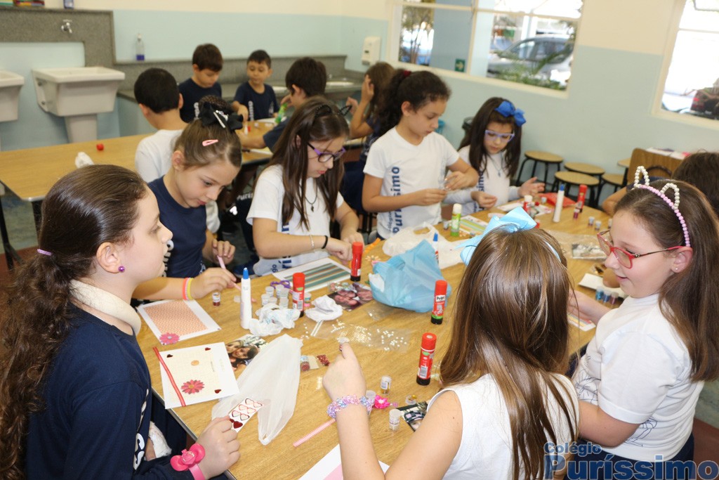Em homenagem ao Dia das Mães os alunos do 2º ao 4º ano do Ensino Fundamental realizaram uma oficina de cartões para entregar para as mamães e responsáveis. Para a atividade contou – se com a presença da artesã Michele Concon, mãe dos alunos Tiago e Cauã do Ensino Fundamental II.
