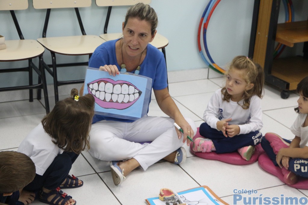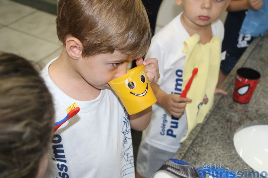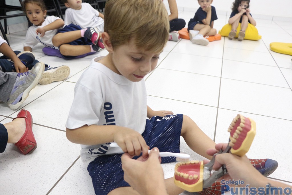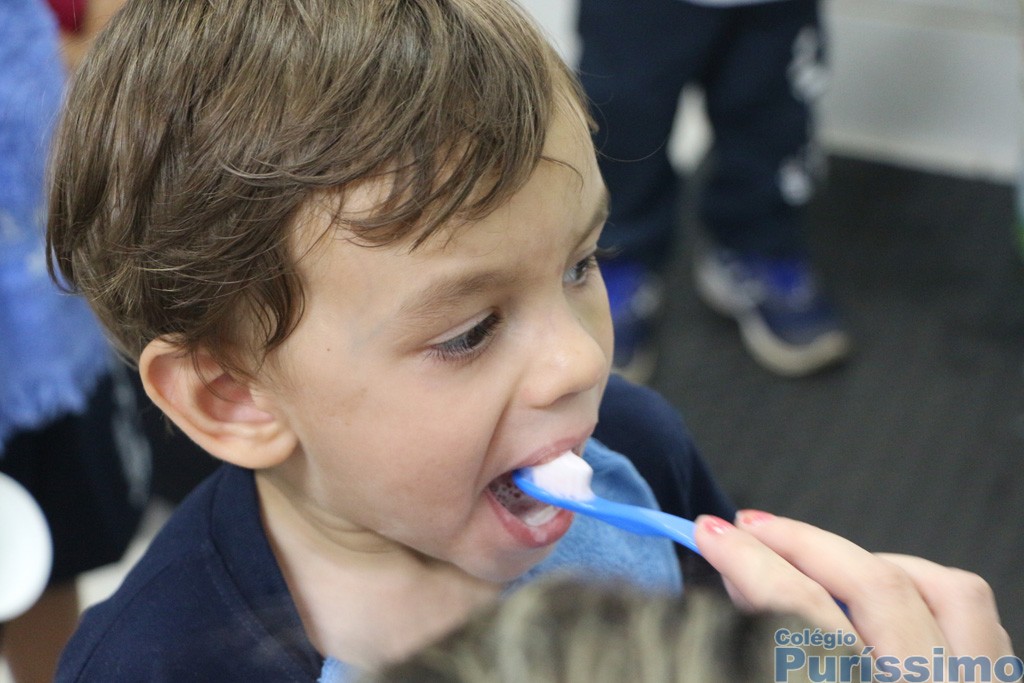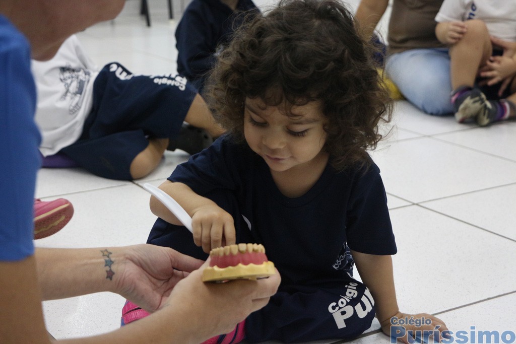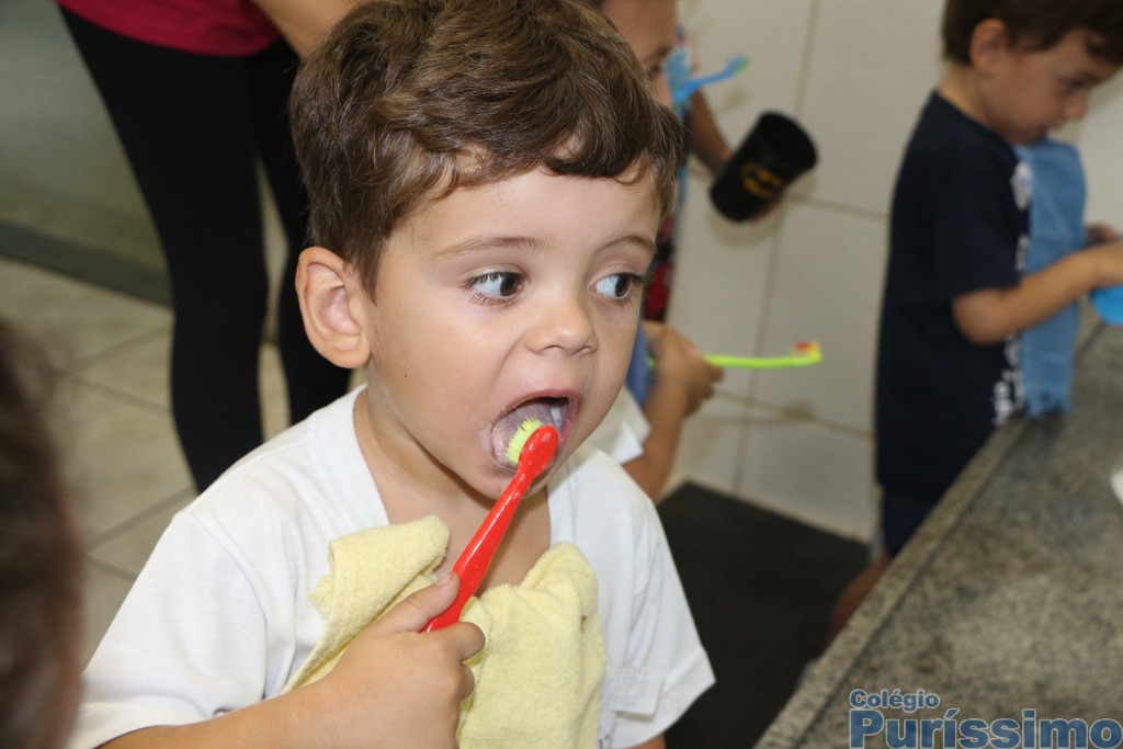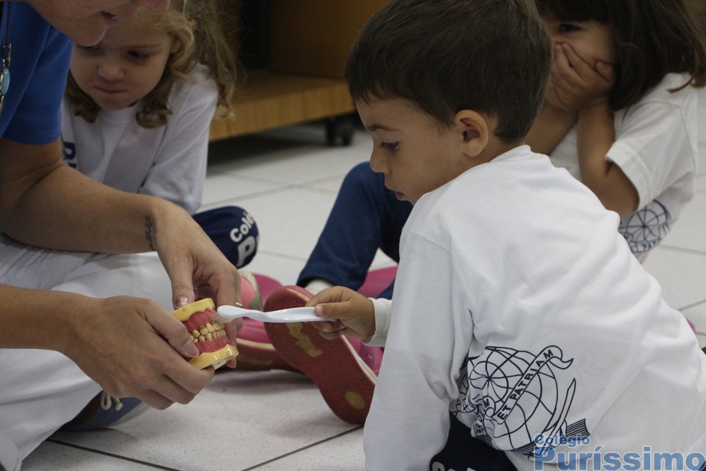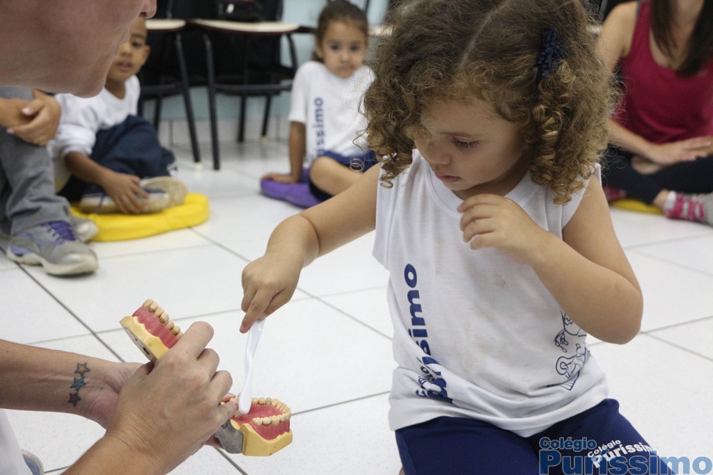 Com essa intenção a coordenação da Educação Infantil organizou uma visita da dentista Maria Eduarda Biscaro, mãe da aluna Isabella Biscaro Bovo, do Jardim I da manhã. Foi realizada uma palestra com os pequenos do Maternal II (manhã e tarde) afim de mostrar o que acontece com os dentes caso eles não tenham a devida higiene, além disso, Maria Eduarda ensinou as crianças as técnicas de escovação. Posteriormente eles foram aplicar, utilizando o kit escova que trouxeram e que passará a ser usado diariamente após o lanche.