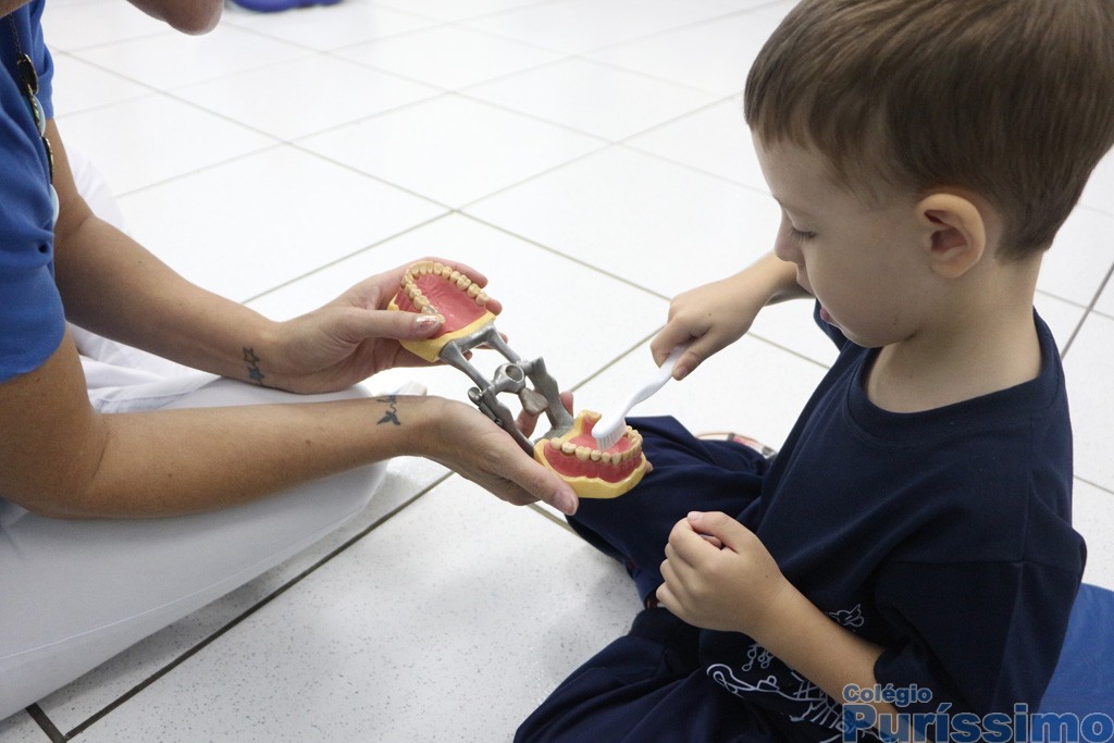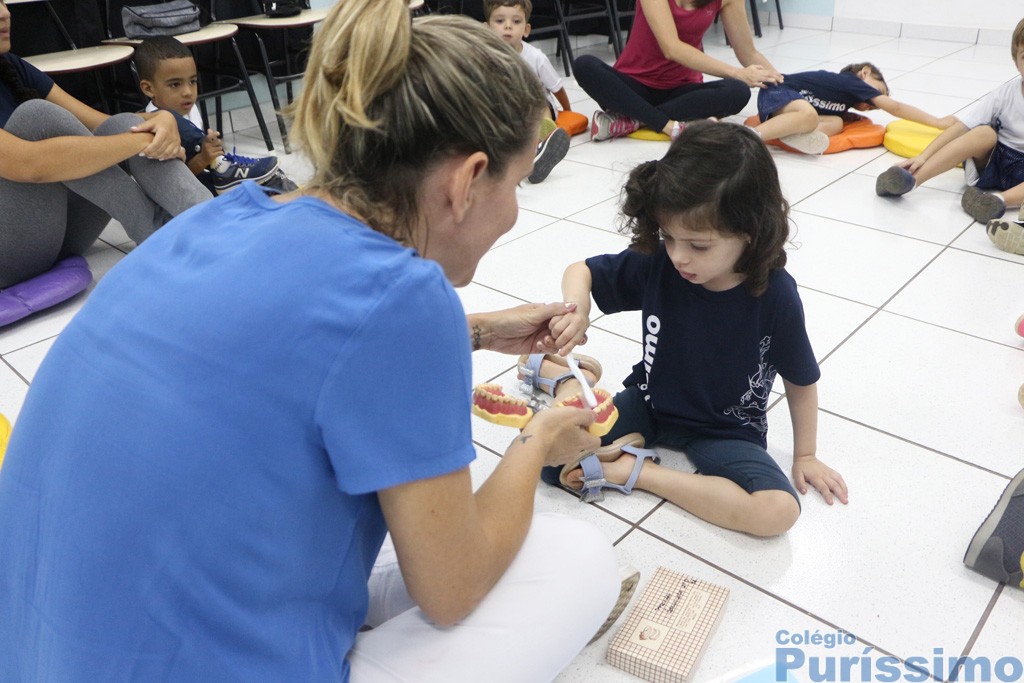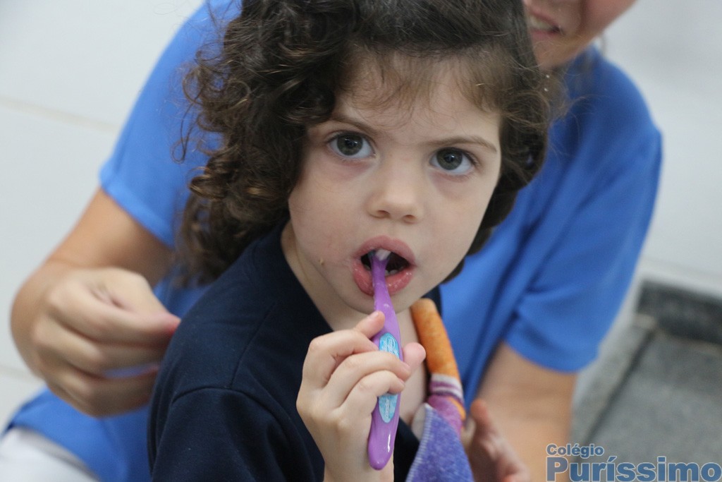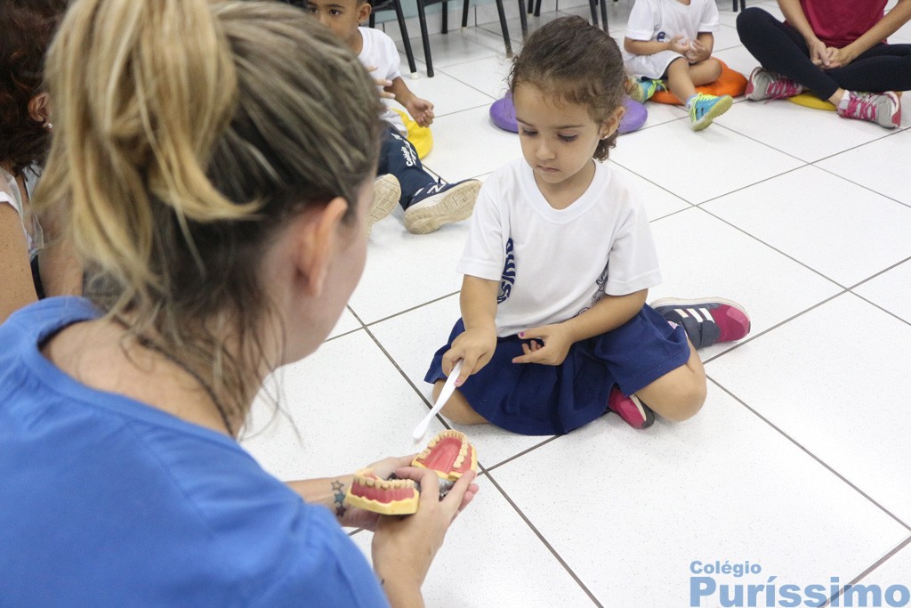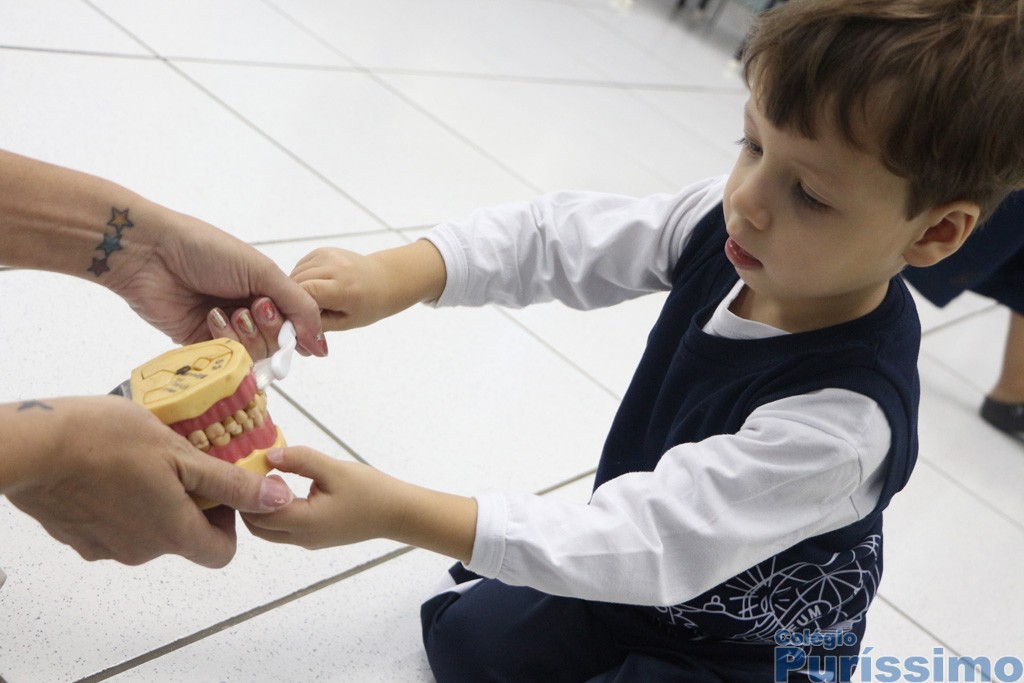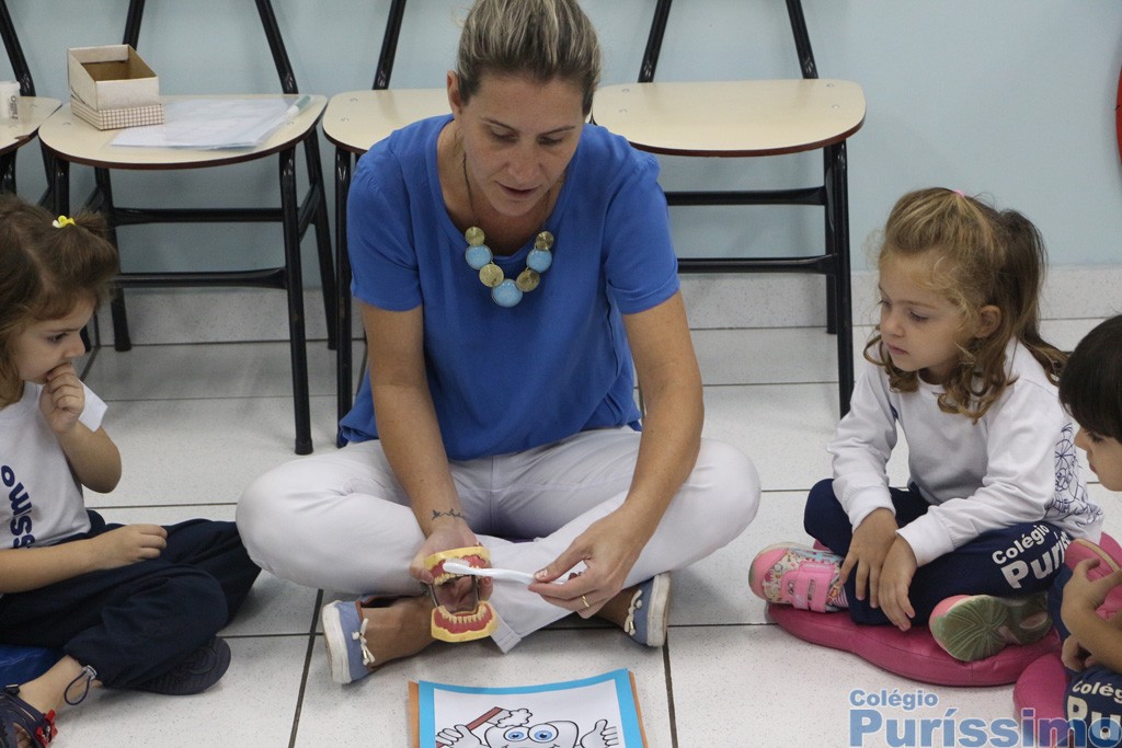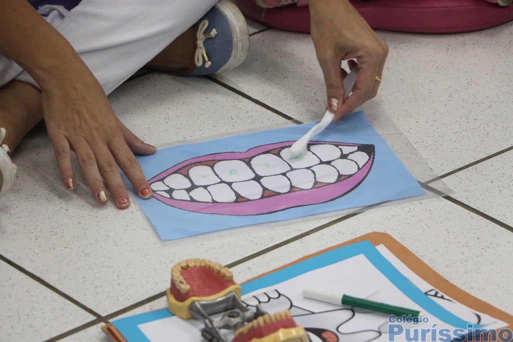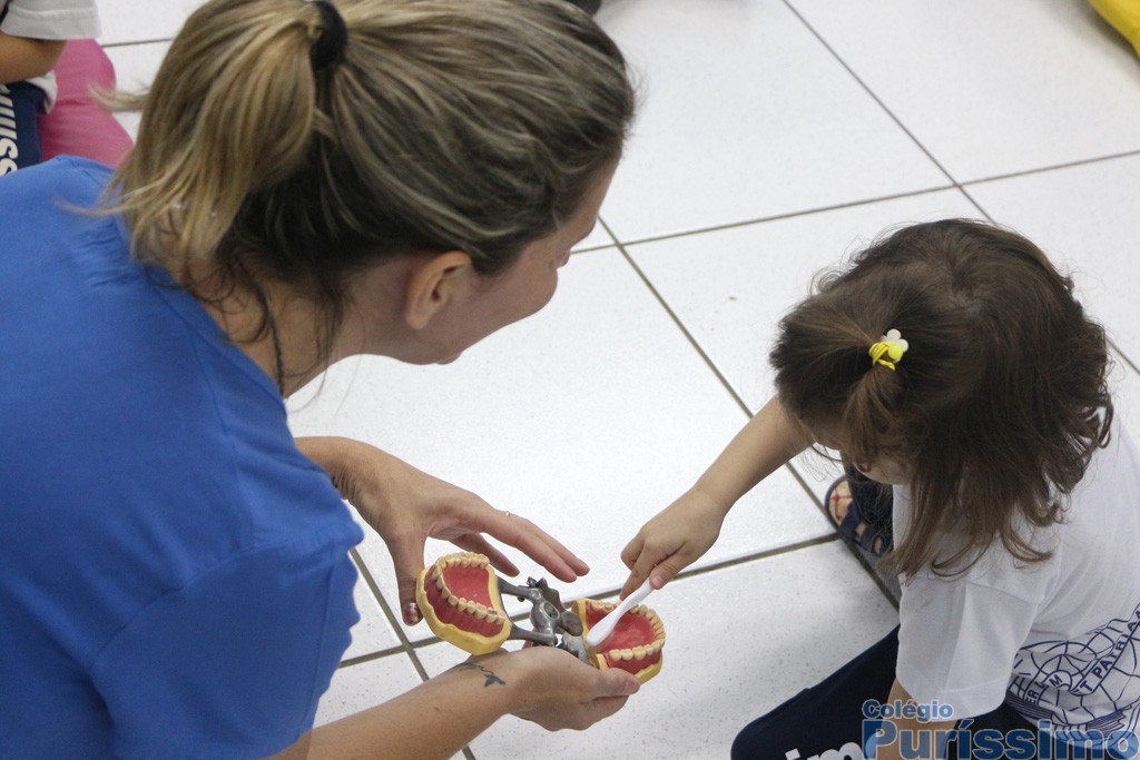 Com essa intenção a coordenação da Educação Infantil organizou uma visita da dentista Maria Eduarda Biscaro, mãe da aluna Isabella Biscaro Bovo, do Jardim I da manhã. Foi realizada uma palestra com os pequenos do Maternal II (manhã e tarde) afim de mostrar o que acontece com os dentes caso eles não tenham a devida higiene, além disso, Maria Eduarda ensinou as crianças as técnicas de escovação. Posteriormente eles foram aplicar, utilizando o kit escova que trouxeram e que passará a ser usado diariamente após o lanche.