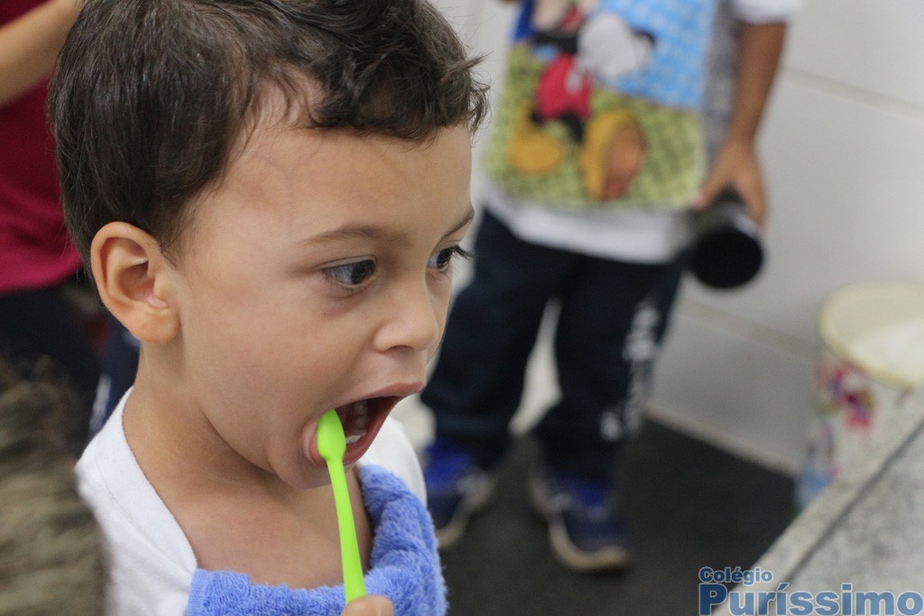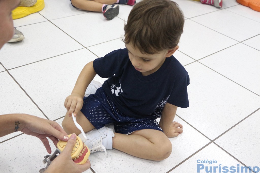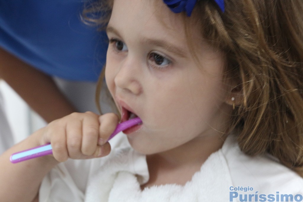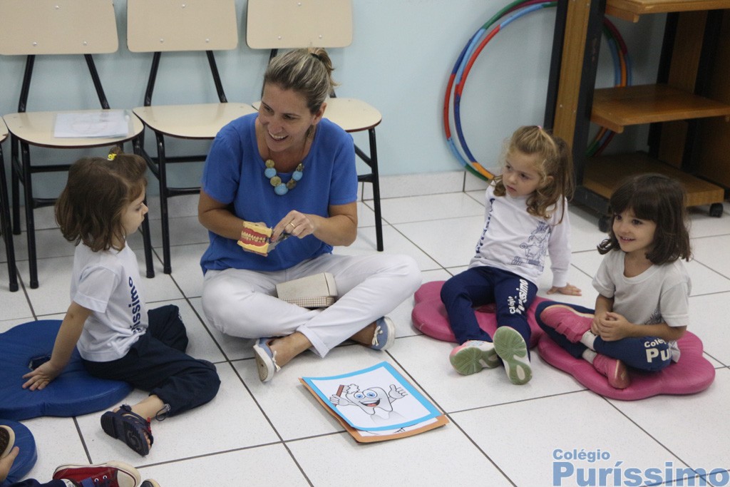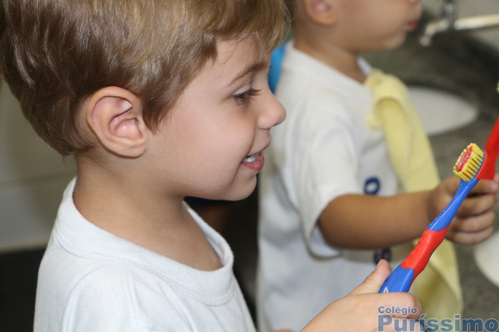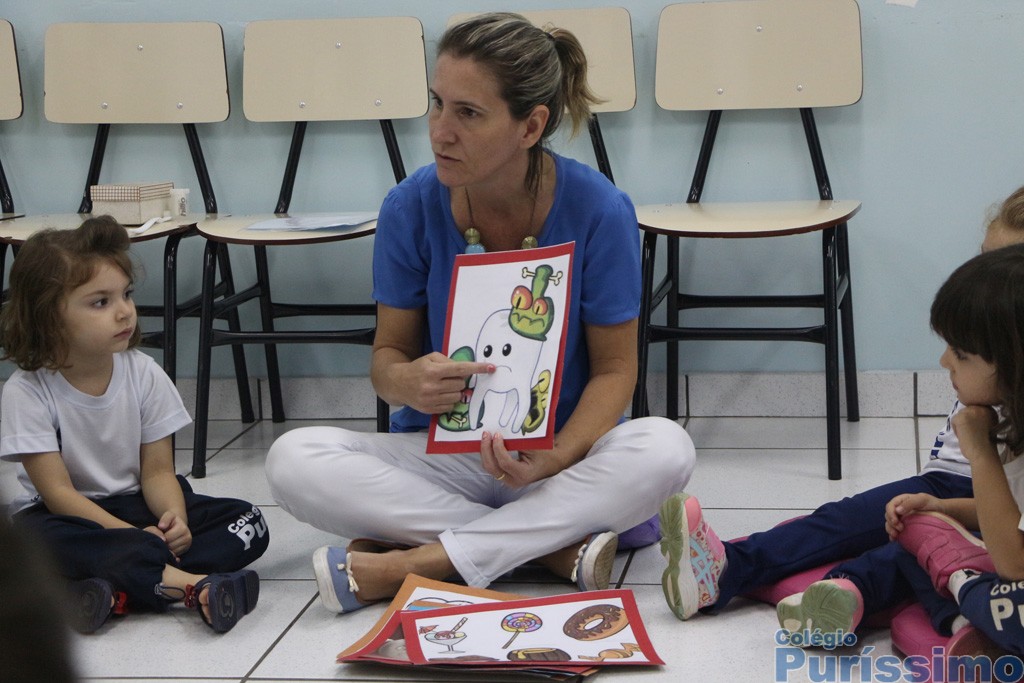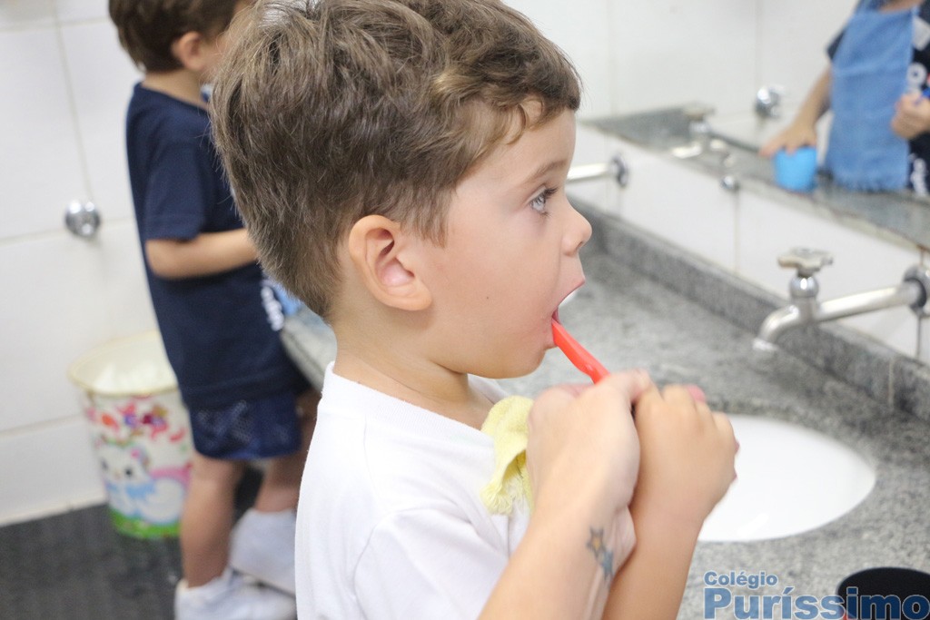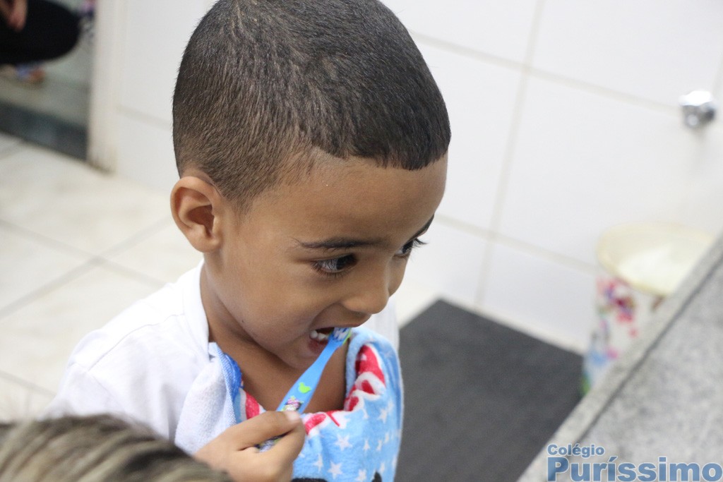 Com essa intenção a coordenação da Educação Infantil organizou uma visita da dentista Maria Eduarda Biscaro, mãe da aluna Isabella Biscaro Bovo, do Jardim I da manhã. Foi realizada uma palestra com os pequenos do Maternal II (manhã e tarde) afim de mostrar o que acontece com os dentes caso eles não tenham a devida higiene, além disso, Maria Eduarda ensinou as crianças as técnicas de escovação. Posteriormente eles foram aplicar, utilizando o kit escova que trouxeram e que passará a ser usado diariamente após o lanche.
