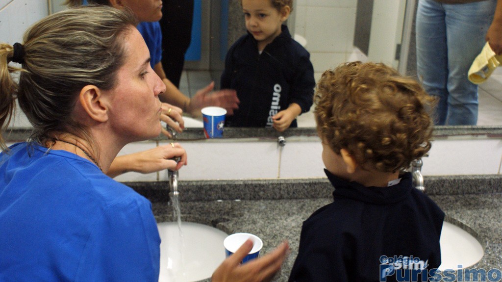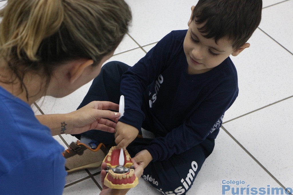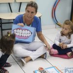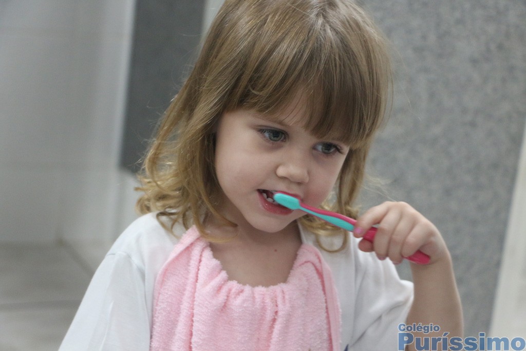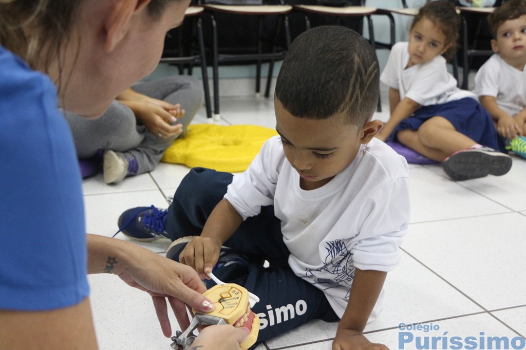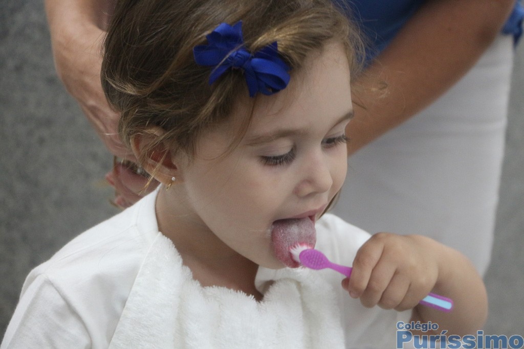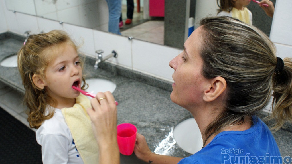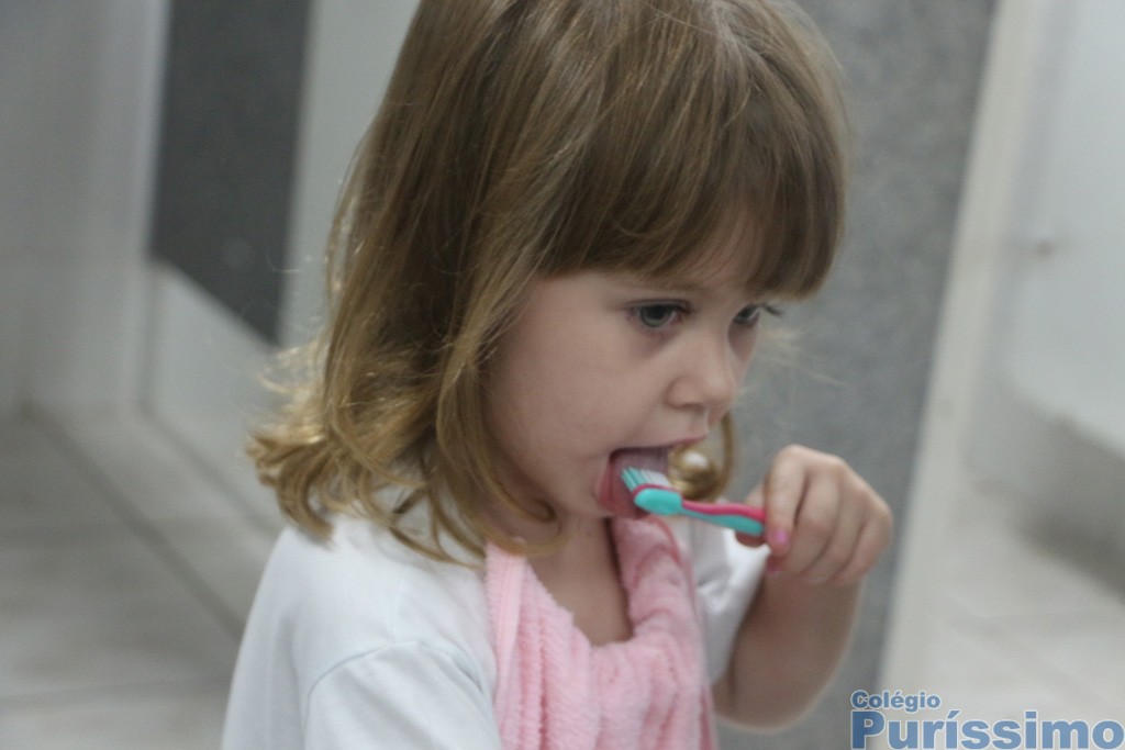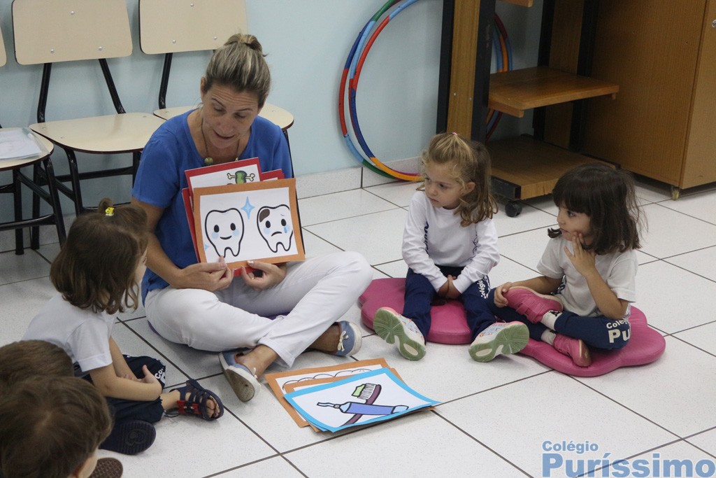 Com essa intenção a coordenação da Educação Infantil organizou uma visita da dentista Maria Eduarda Biscaro, mãe da aluna Isabella Biscaro Bovo, do Jardim I da manhã. Foi realizada uma palestra com os pequenos do Maternal II (manhã e tarde) afim de mostrar o que acontece com os dentes caso eles não tenham a devida higiene, além disso, Maria Eduarda ensinou as crianças as técnicas de escovação. Posteriormente eles foram aplicar, utilizando o kit escova que trouxeram e que passará a ser usado diariamente após o lanche.