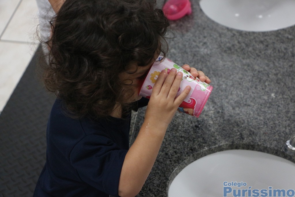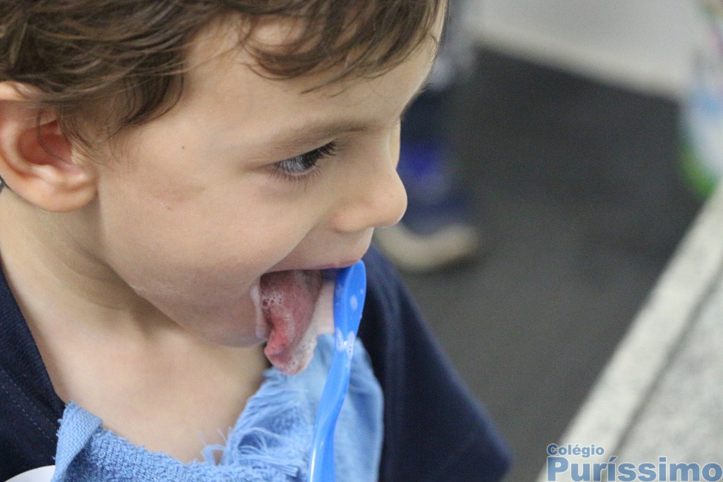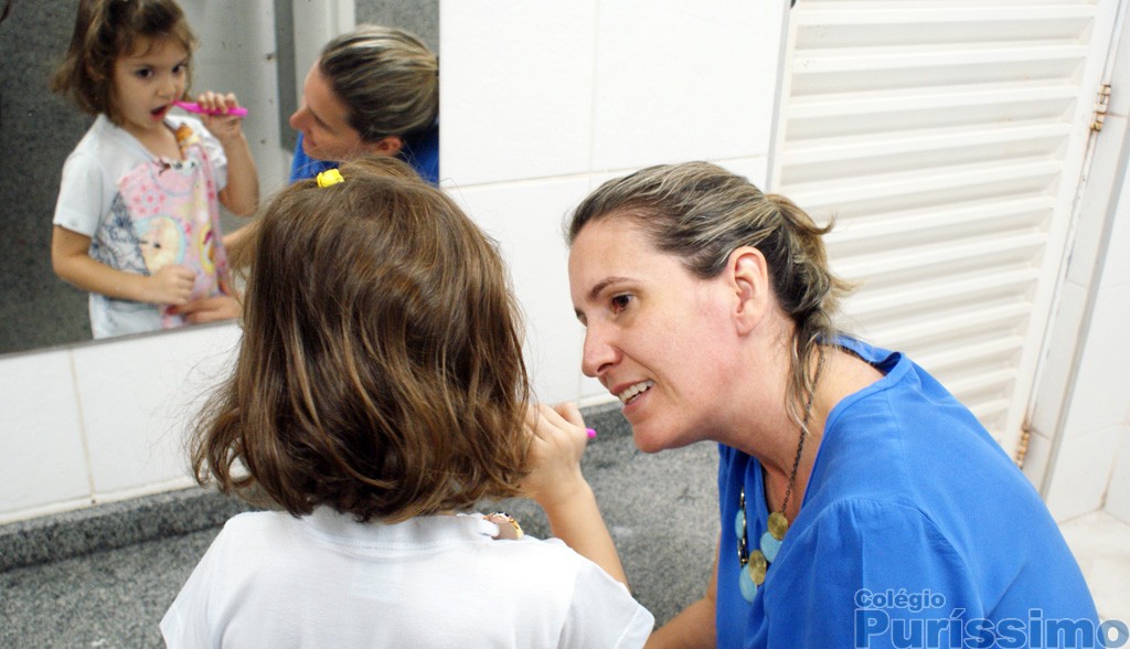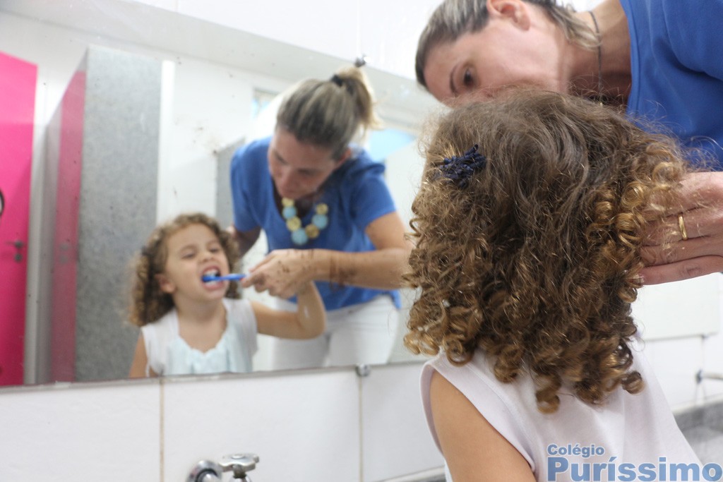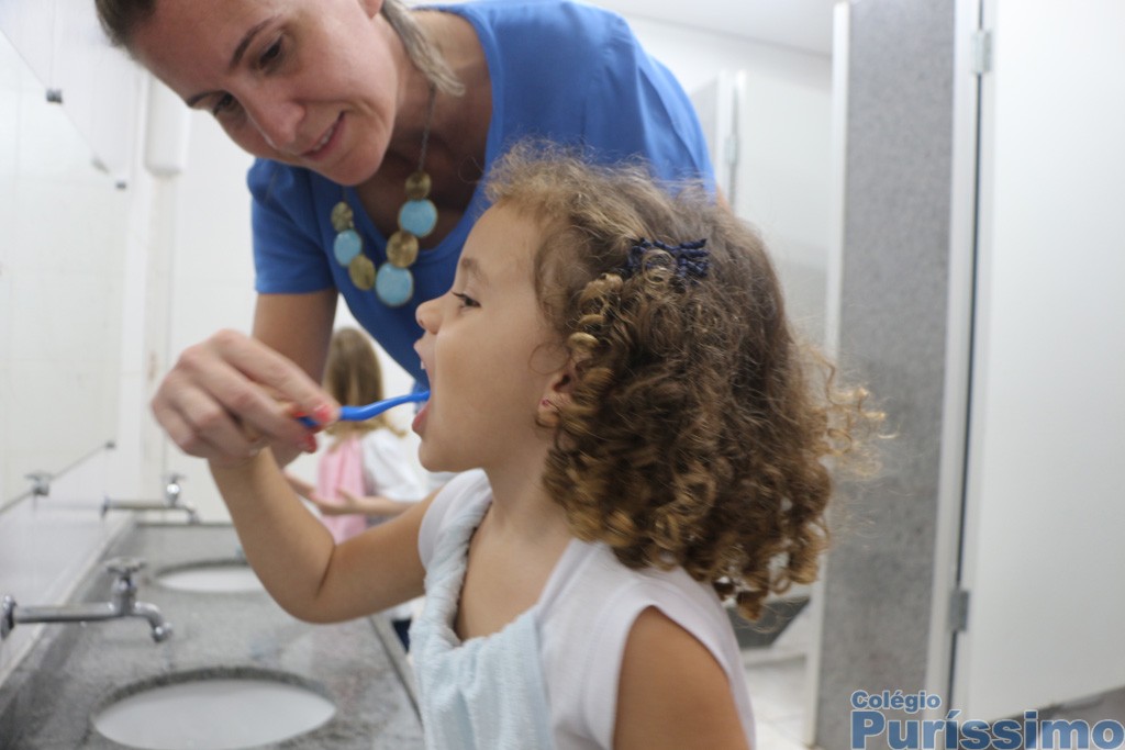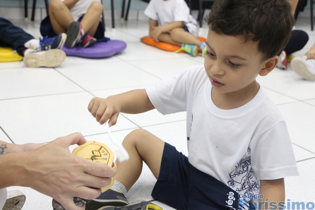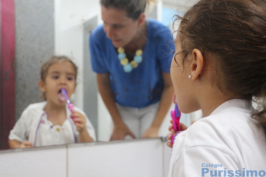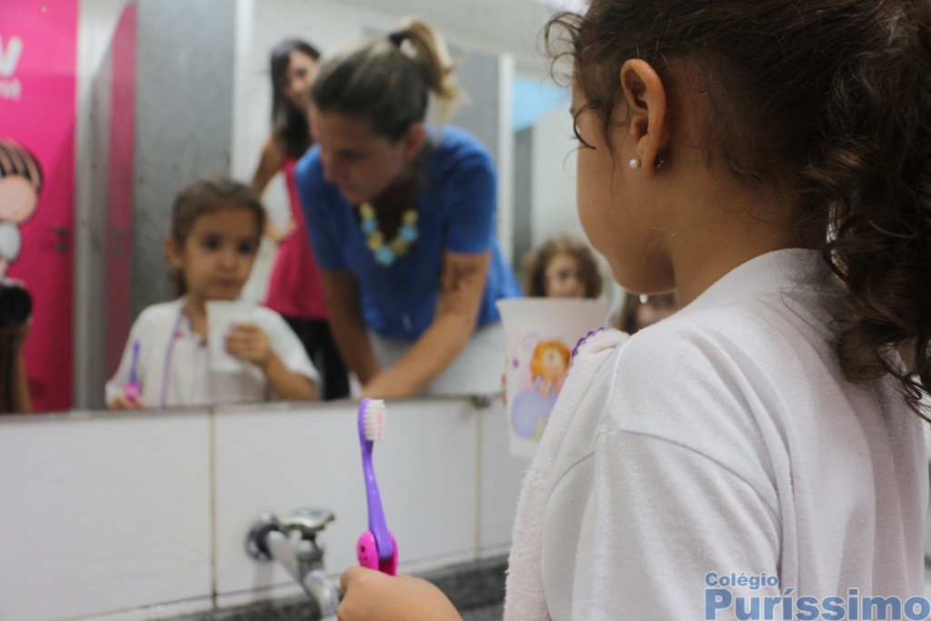 Com essa intenção a coordenação da Educação Infantil organizou uma visita da dentista Maria Eduarda Biscaro, mãe da aluna Isabella Biscaro Bovo, do Jardim I da manhã. Foi realizada uma palestra com os pequenos do Maternal II (manhã e tarde) afim de mostrar o que acontece com os dentes caso eles não tenham a devida higiene, além disso, Maria Eduarda ensinou as crianças as técnicas de escovação. Posteriormente eles foram aplicar, utilizando o kit escova que trouxeram e que passará a ser usado diariamente após o lanche.