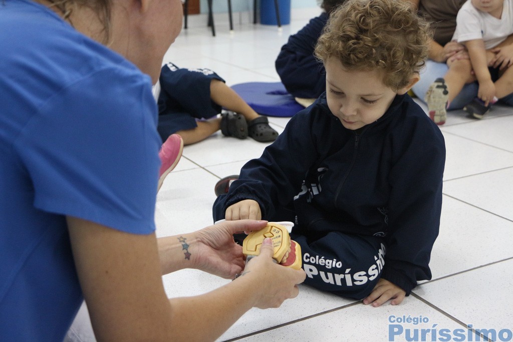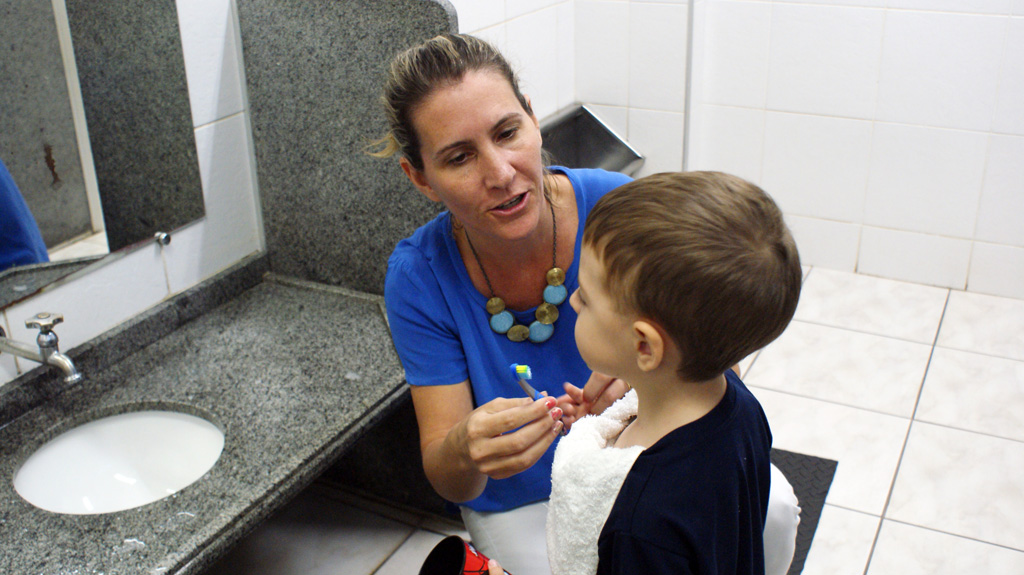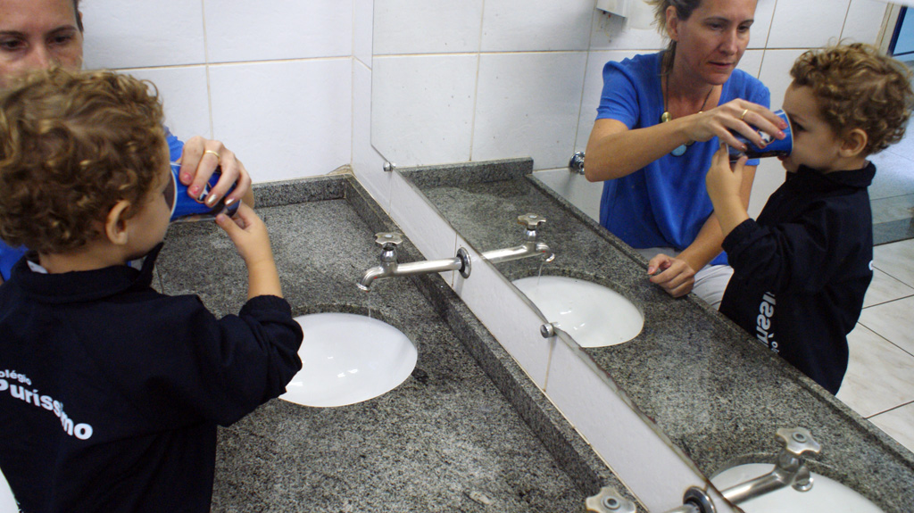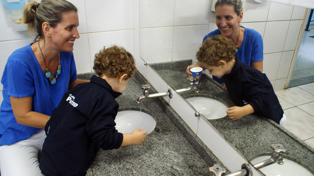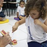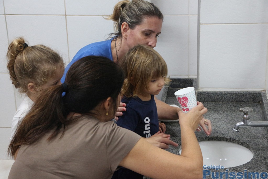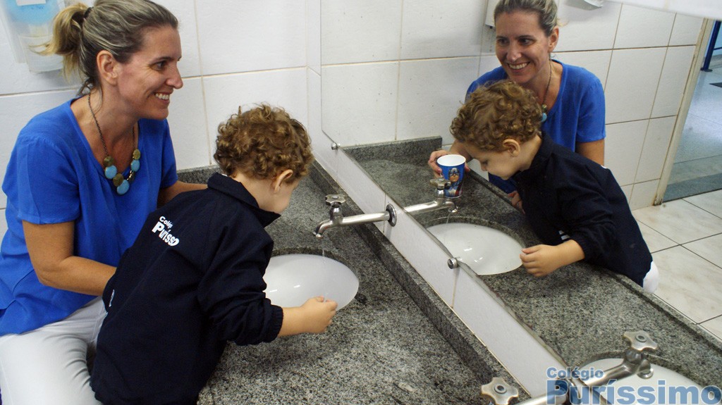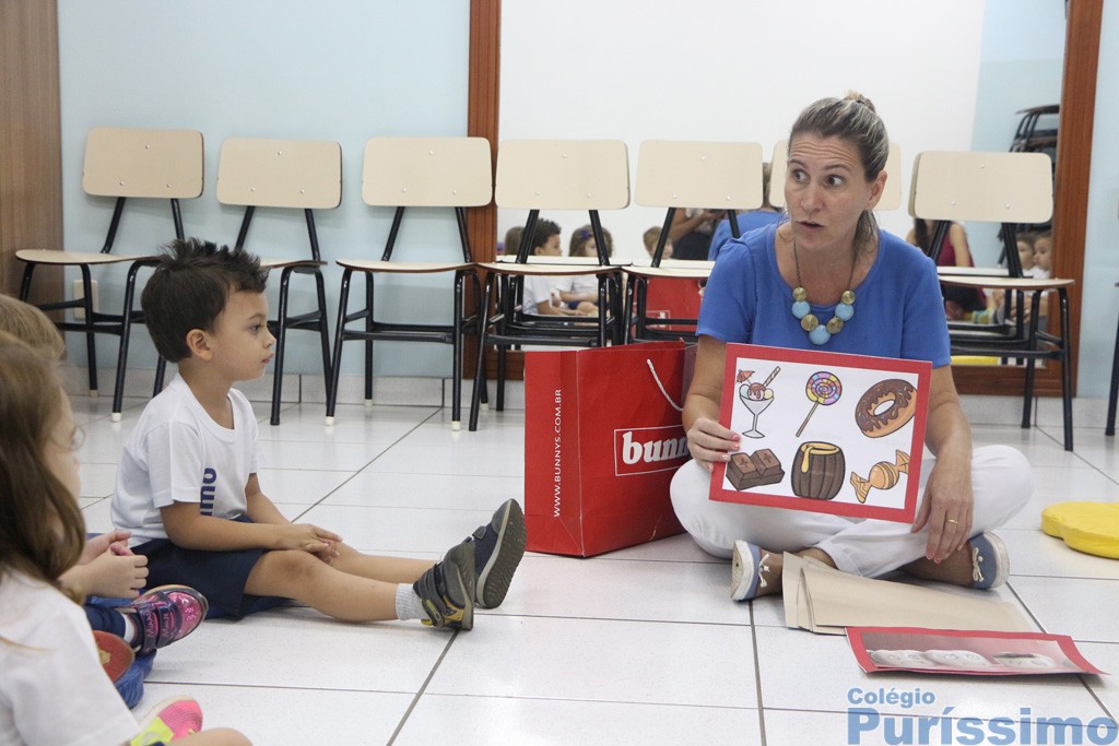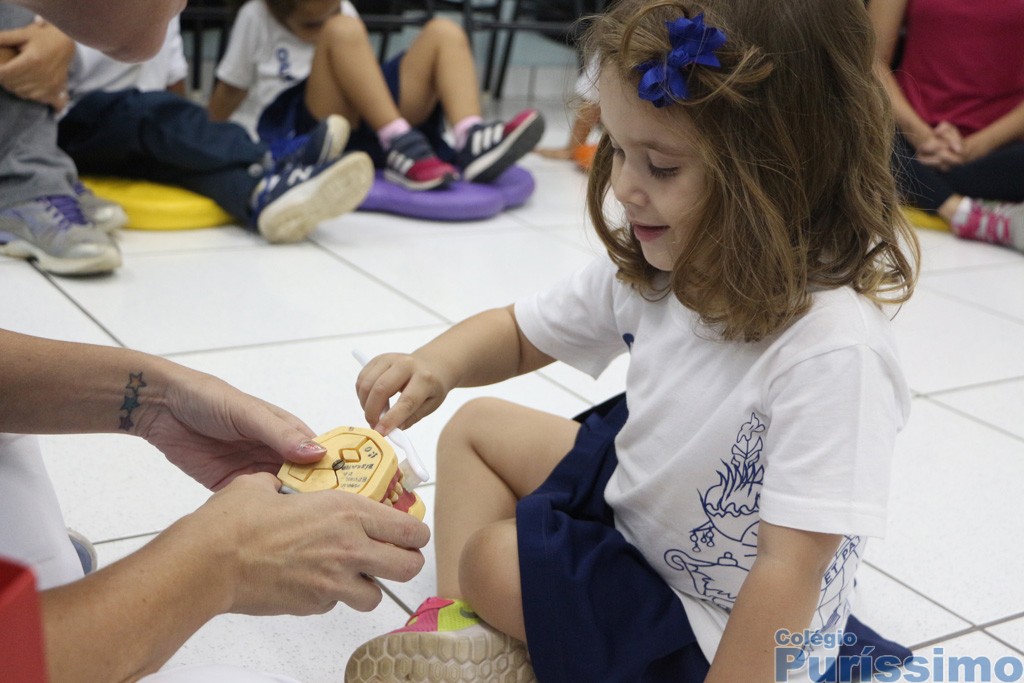 Com essa intenção a coordenação da Educação Infantil organizou uma visita da dentista Maria Eduarda Biscaro, mãe da aluna Isabella Biscaro Bovo, do Jardim I da manhã. Foi realizada uma palestra com os pequenos do Maternal II (manhã e tarde) afim de mostrar o que acontece com os dentes caso eles não tenham a devida higiene, além disso, Maria Eduarda ensinou as crianças as técnicas de escovação. Posteriormente eles foram aplicar, utilizando o kit escova que trouxeram e que passará a ser usado diariamente após o lanche.