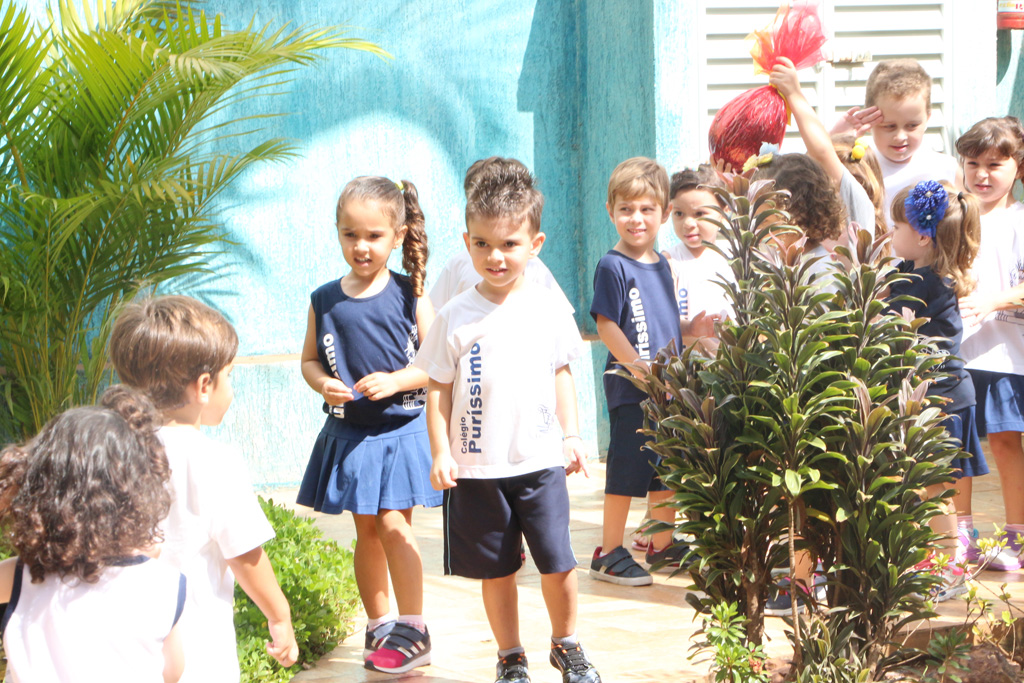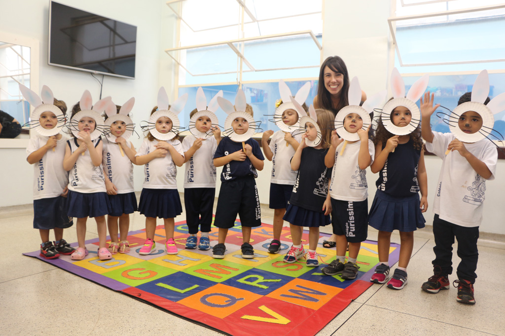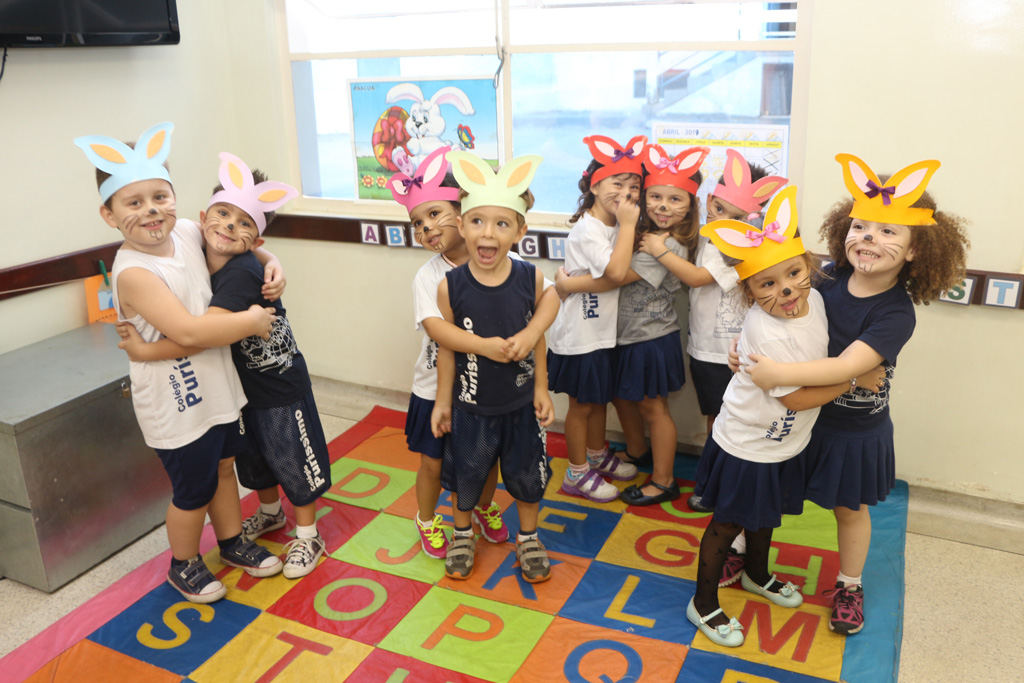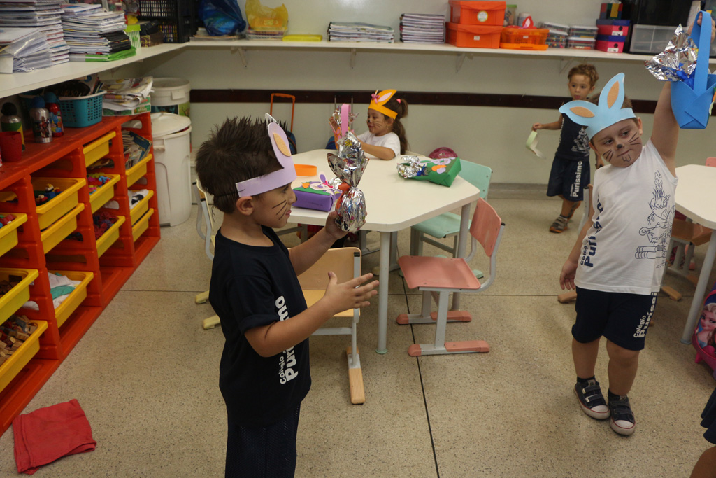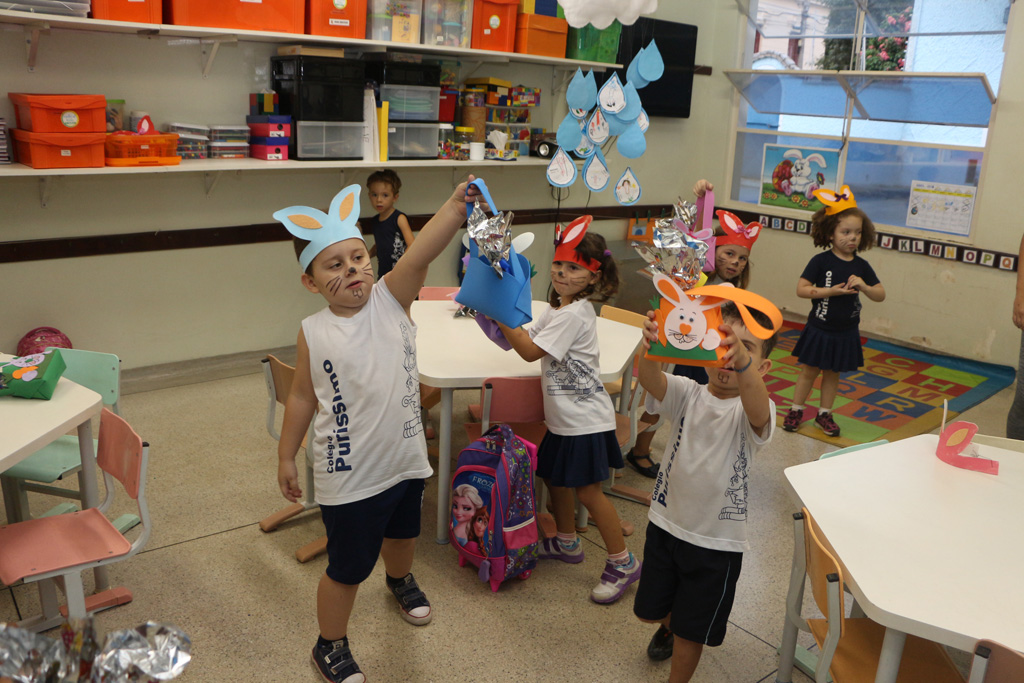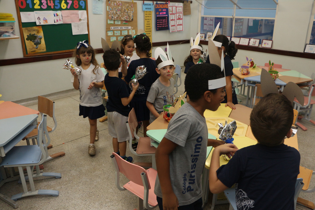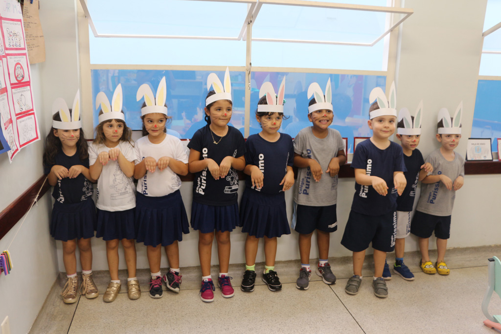 Os alunos da Educação Infantil e dos primeiros anos do Ensino Fundamental comemoraram a Páscoa com muitas atividades divertidas. Eles fizeram a caça aos ovos, a partilha do ovo, e por fim o Puríssimo ficou cheio de coelhinhos, os pequenos colocaram máscaras, se pintaram e fantasiaram de coelhos.