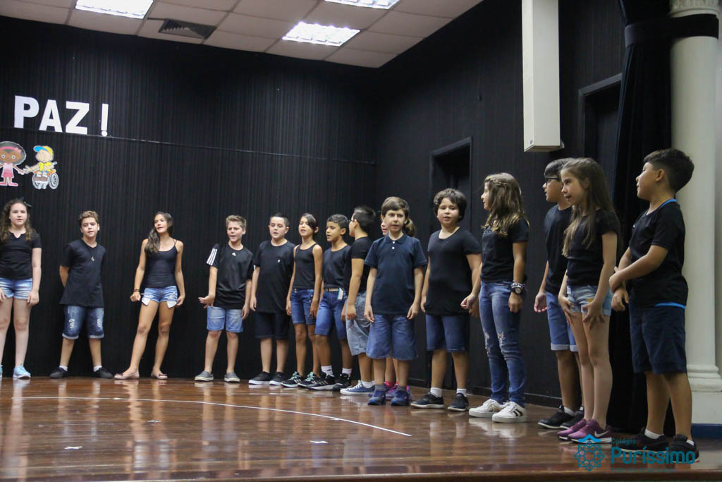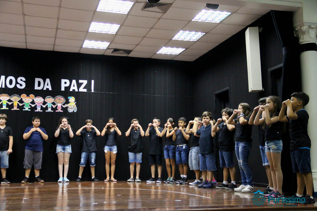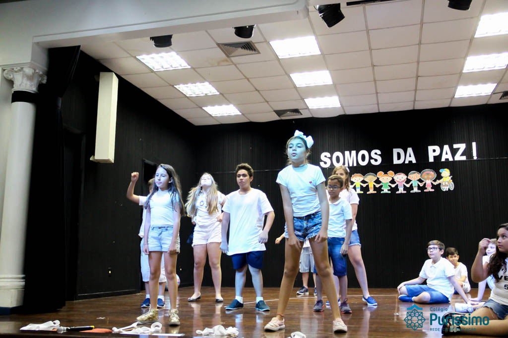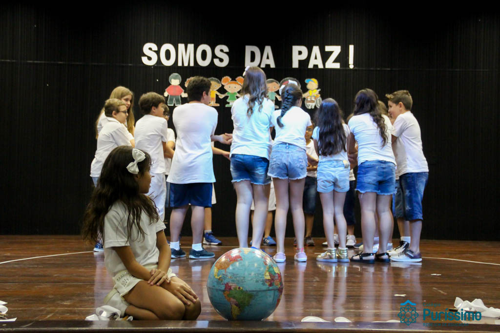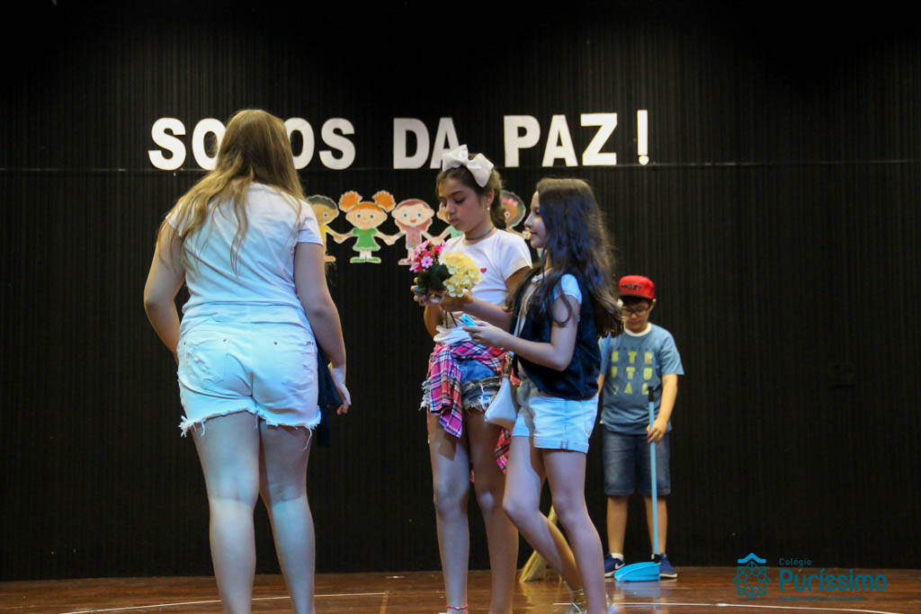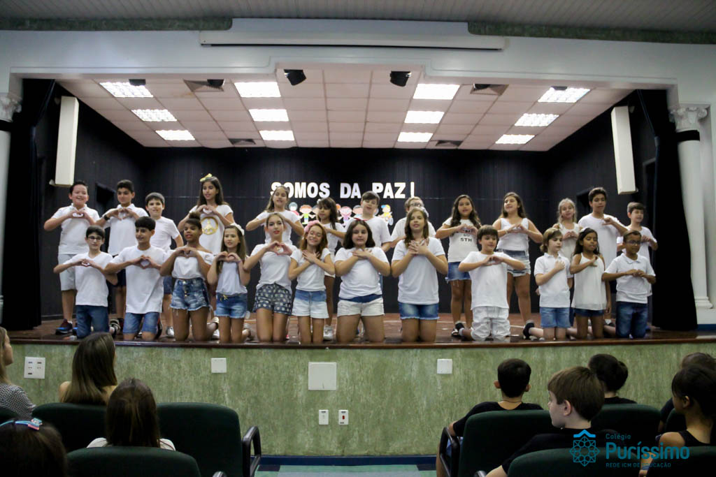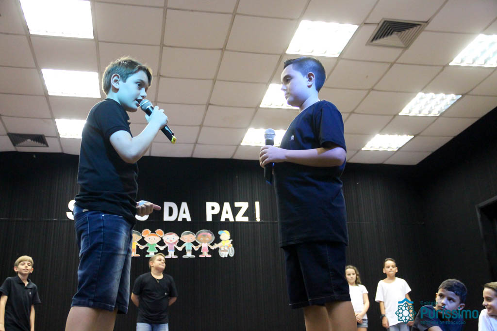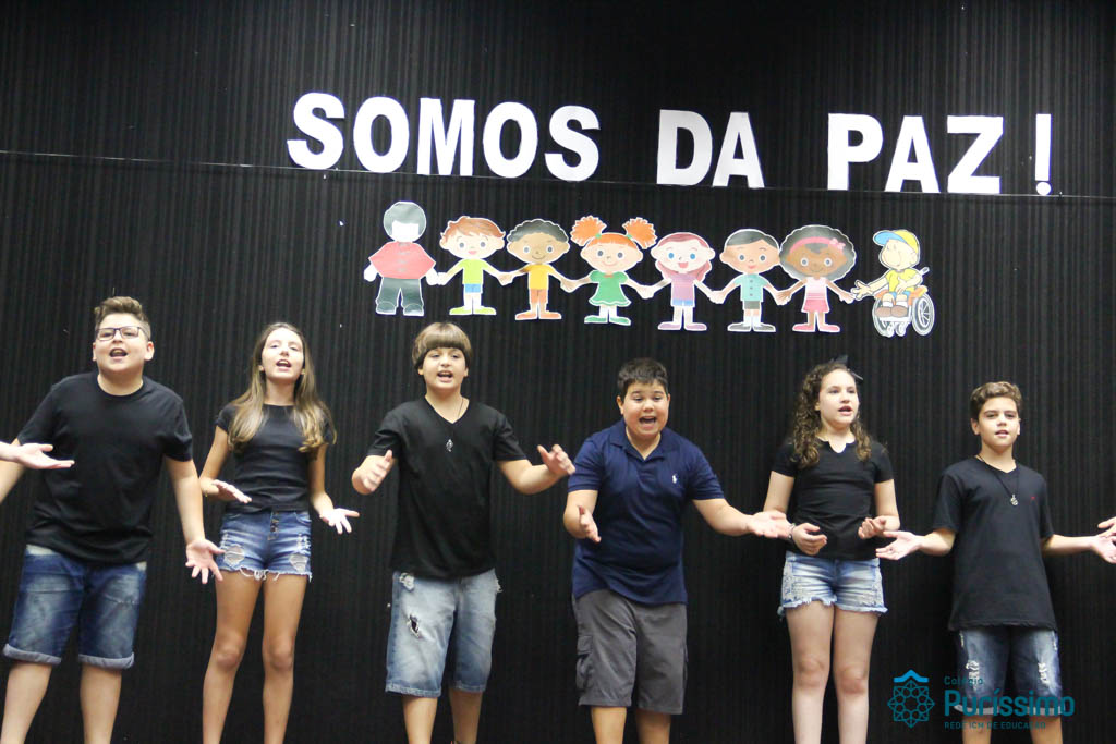Os 5ºs anos se apresentaram na última sexta-feira, 06/04, e falaram sobre a paz. Frisando os tempos de violência o qual estamos vivendo, eles pregaram a empatia e a vontade de querer um mundo melhor para o futuro das crianças. Deixaram uma mensagem linda sobre o mundo que deveríamos lutar para ter. Vamos “perder mais tempo”
