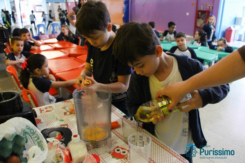 Para unir o conteúdo plantas na alimentação e as medidas de peso que estão trabalhando na matemática, a coordenadora Valéria realizou com as crianças a produção de um bolo de cenoura (raiz), estimulando-as a perceber as diferentes medidas utilizadas na receita e suas equivalências.