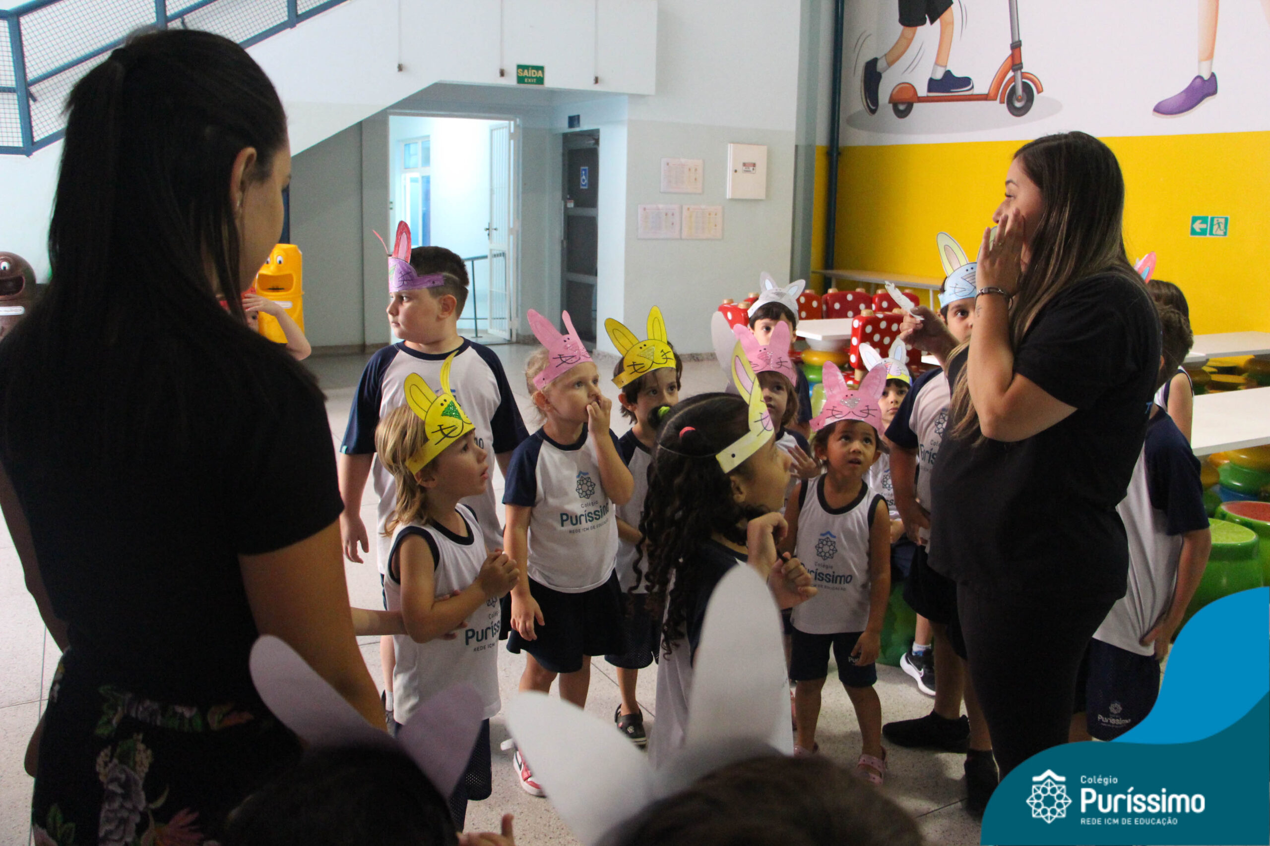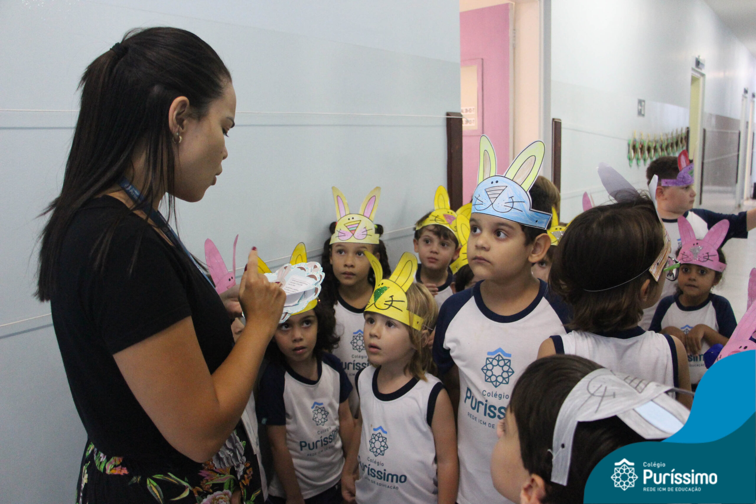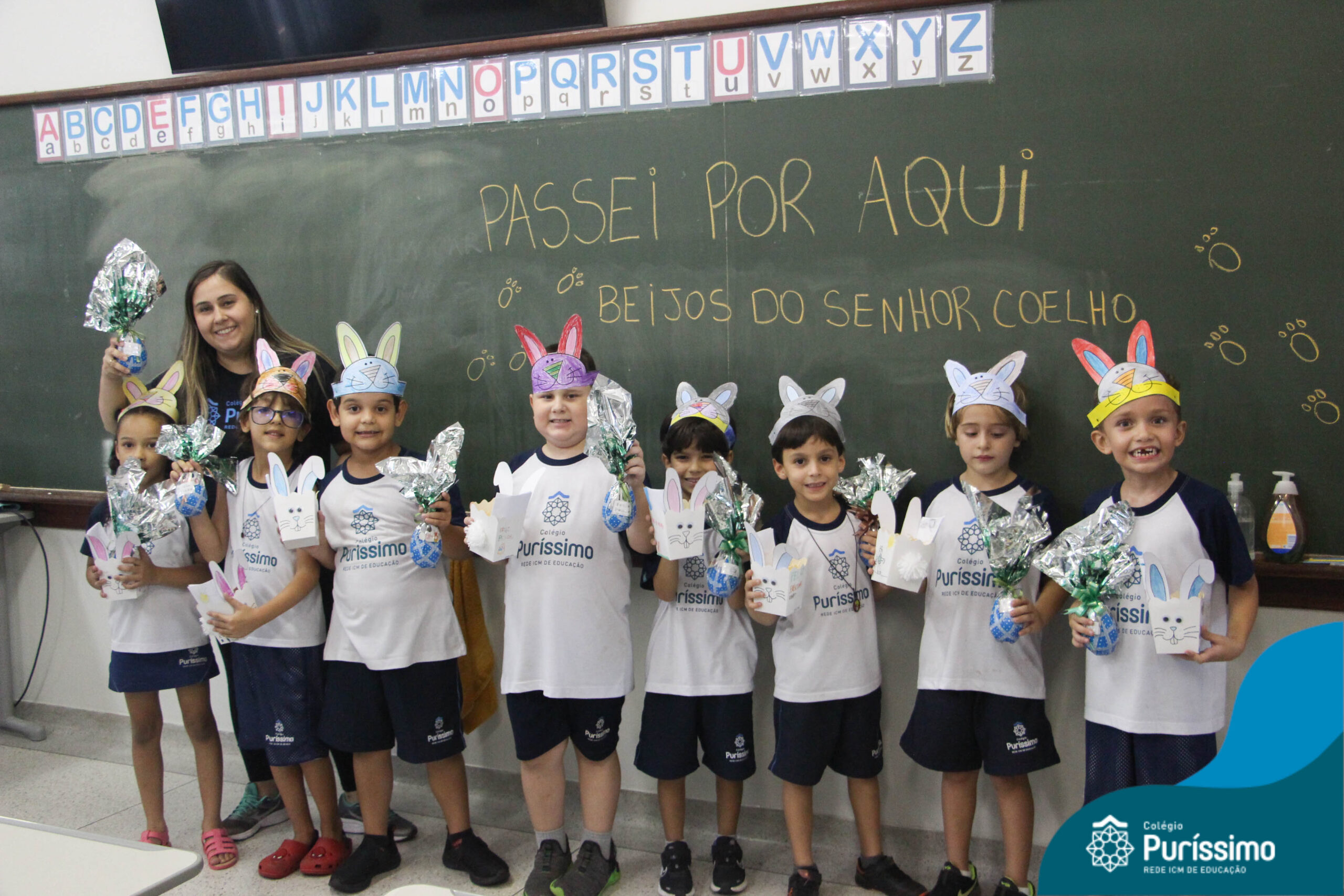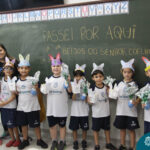 Os alunos da Educação Infantil e do Ensino Fundamental – Anos Iniciais tiveram um dia bem agitado procurando os ovos deixados pelo coelhinho com pistas em português e em inglês também.