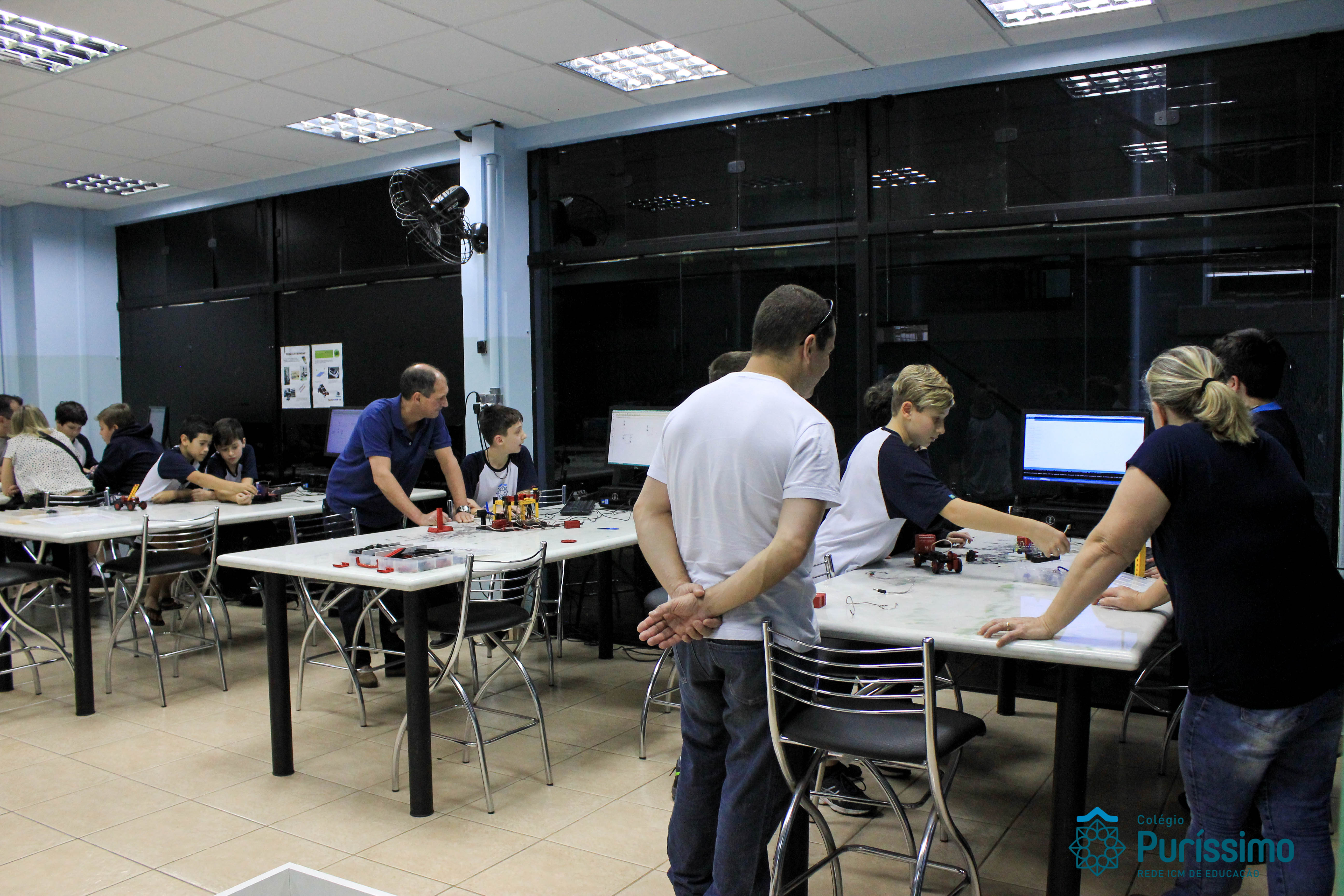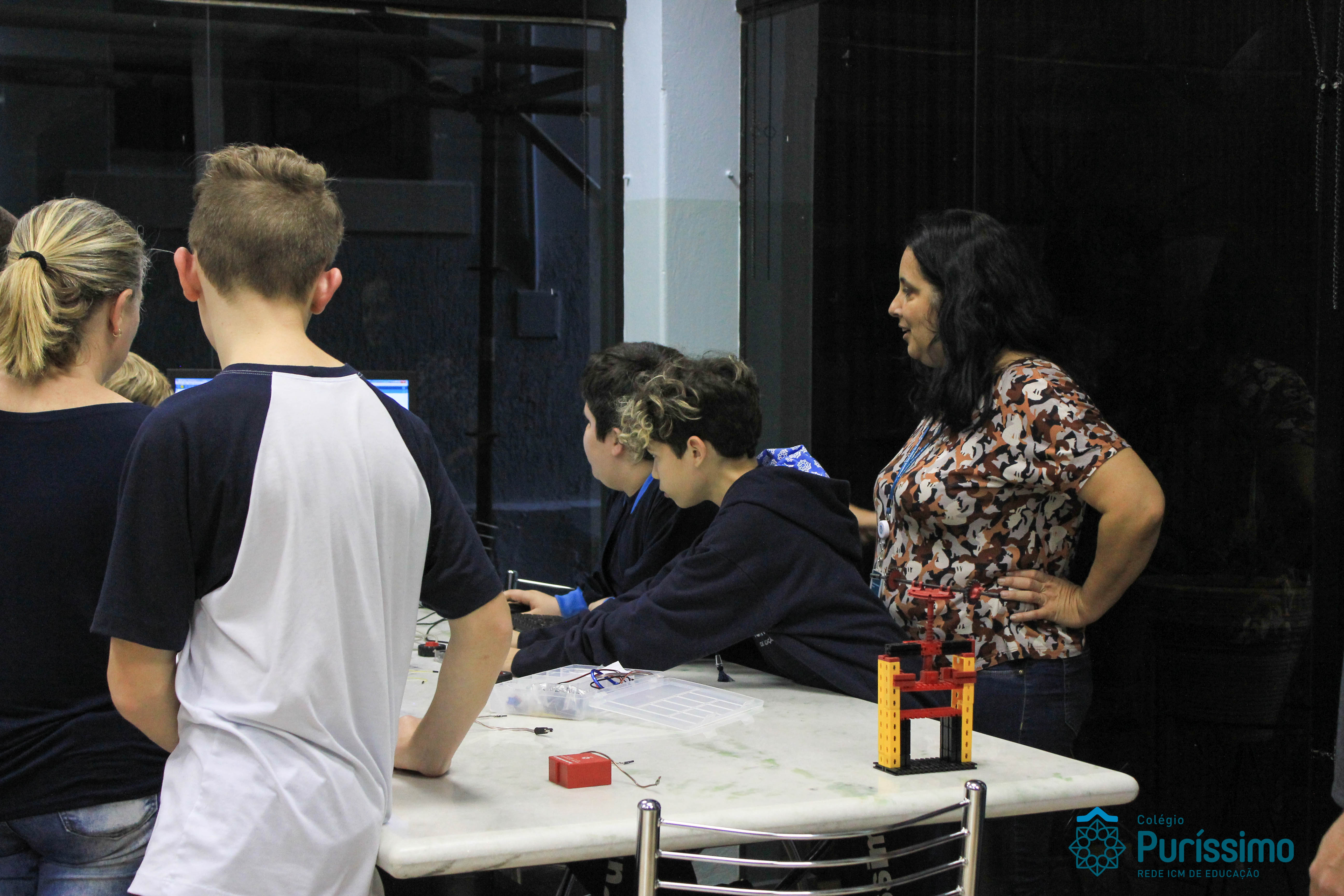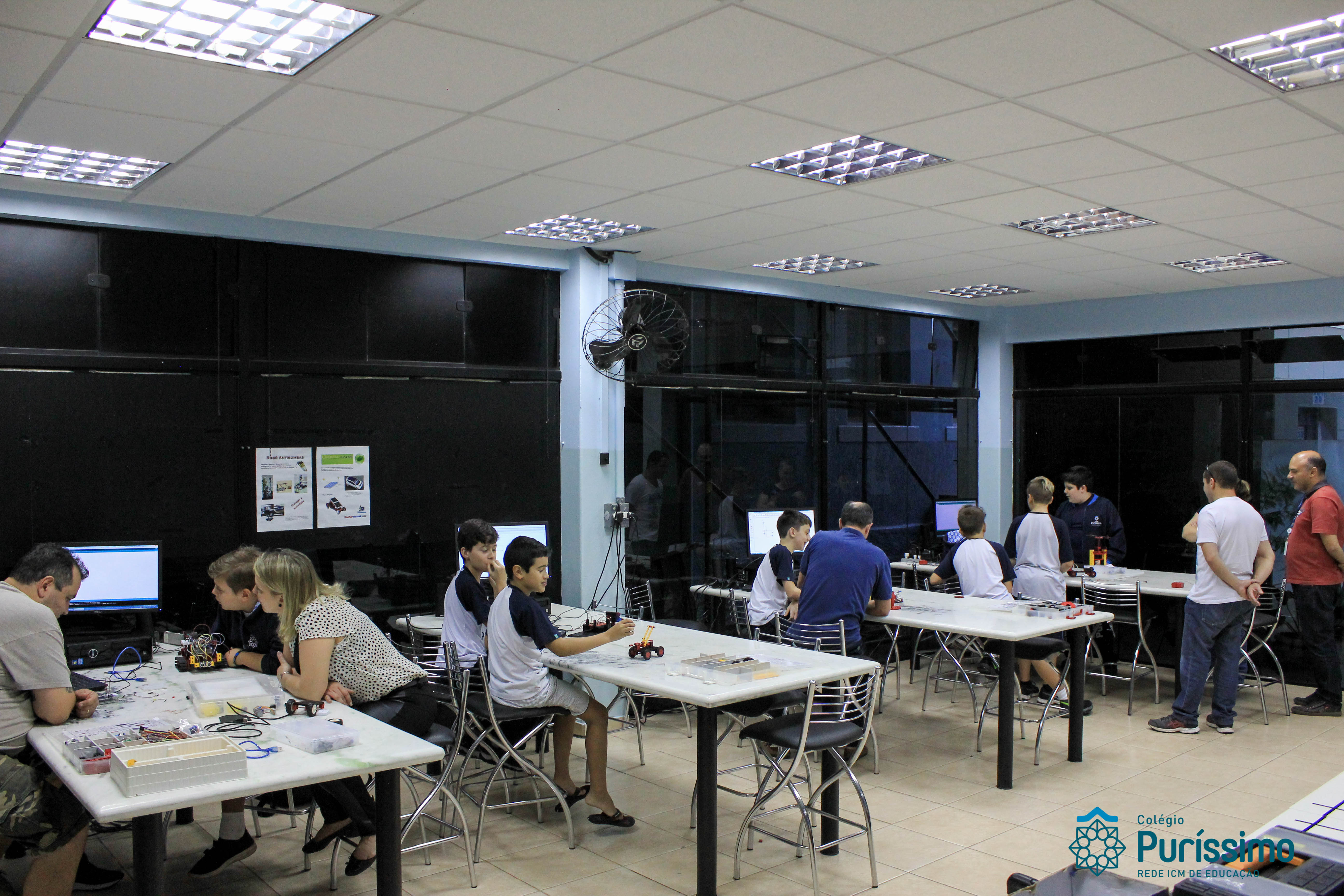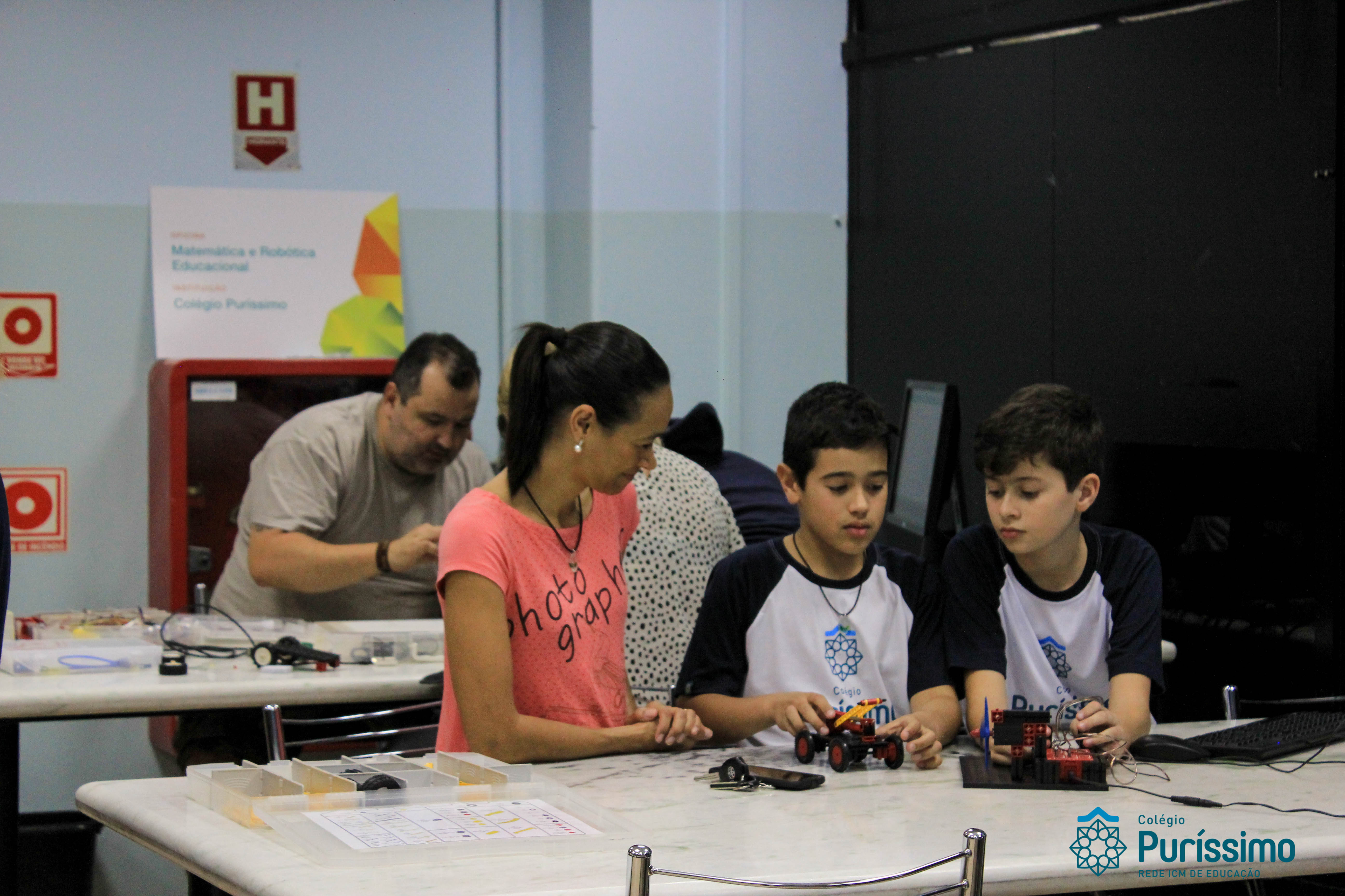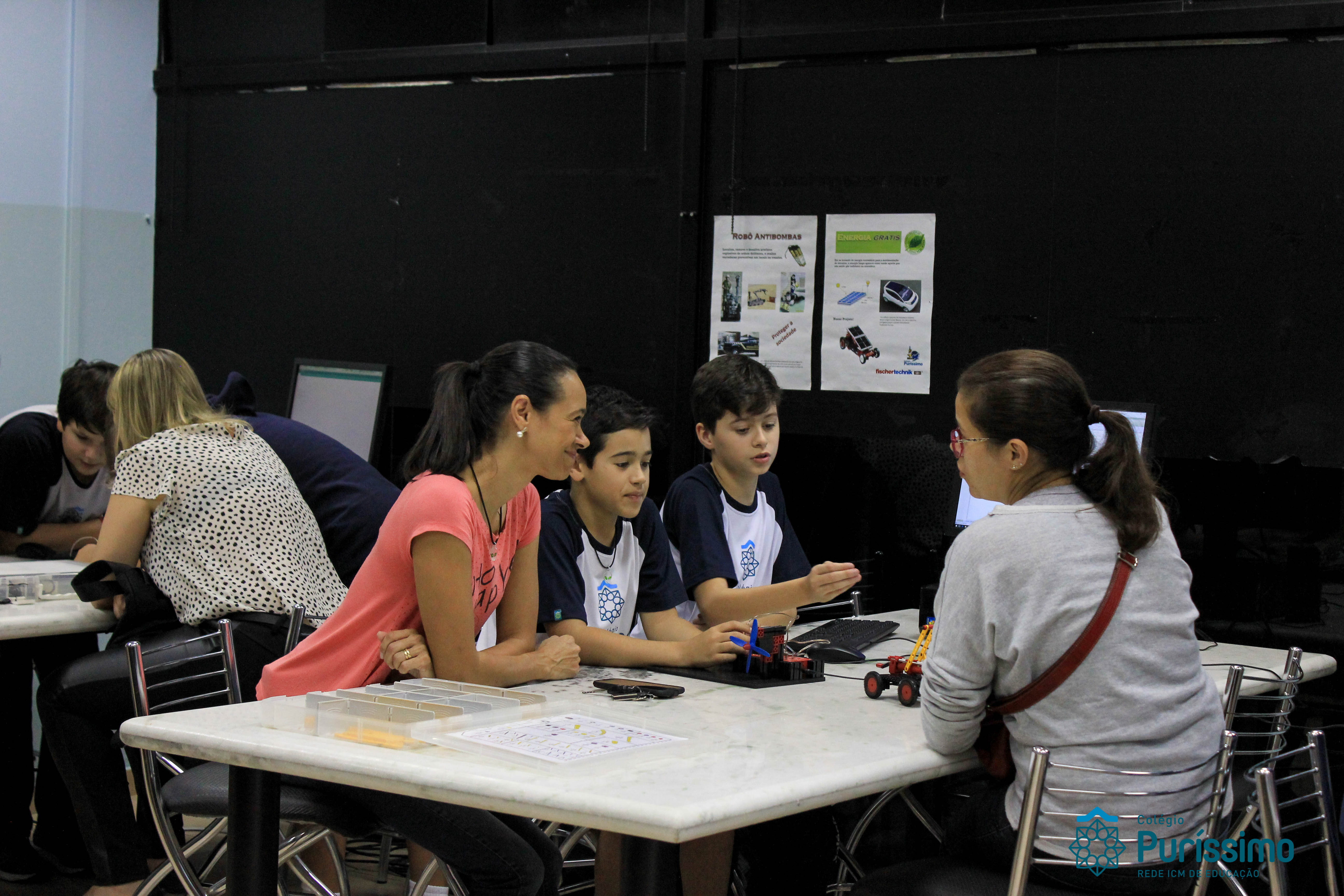 Ao longo da semana passada ocorreu o encerramento das Oficinas dos 6ºs anos para esse primeiro semestre. Os pais foram convidados a comparecerem para acompanharem de perto o trabalho desenvolvido pelos seus filhos no decorrer dos meses. Na oficina de design de games, as crianças explicaram aos pais os jogos desenvolvidos e o passo a passo que aprenderam durante as aulas, na oficina de gastronomia os alunos decoraram uma mesa com diversos doces feitos por eles e que ficaram para a degustação dos presentes. Já na oficina de robótica, os alunos explicaram aos pais como foram criados os robôs, os programas de computação usados para dar movimento e direção a alguns deles e o funcionamento de cada um.