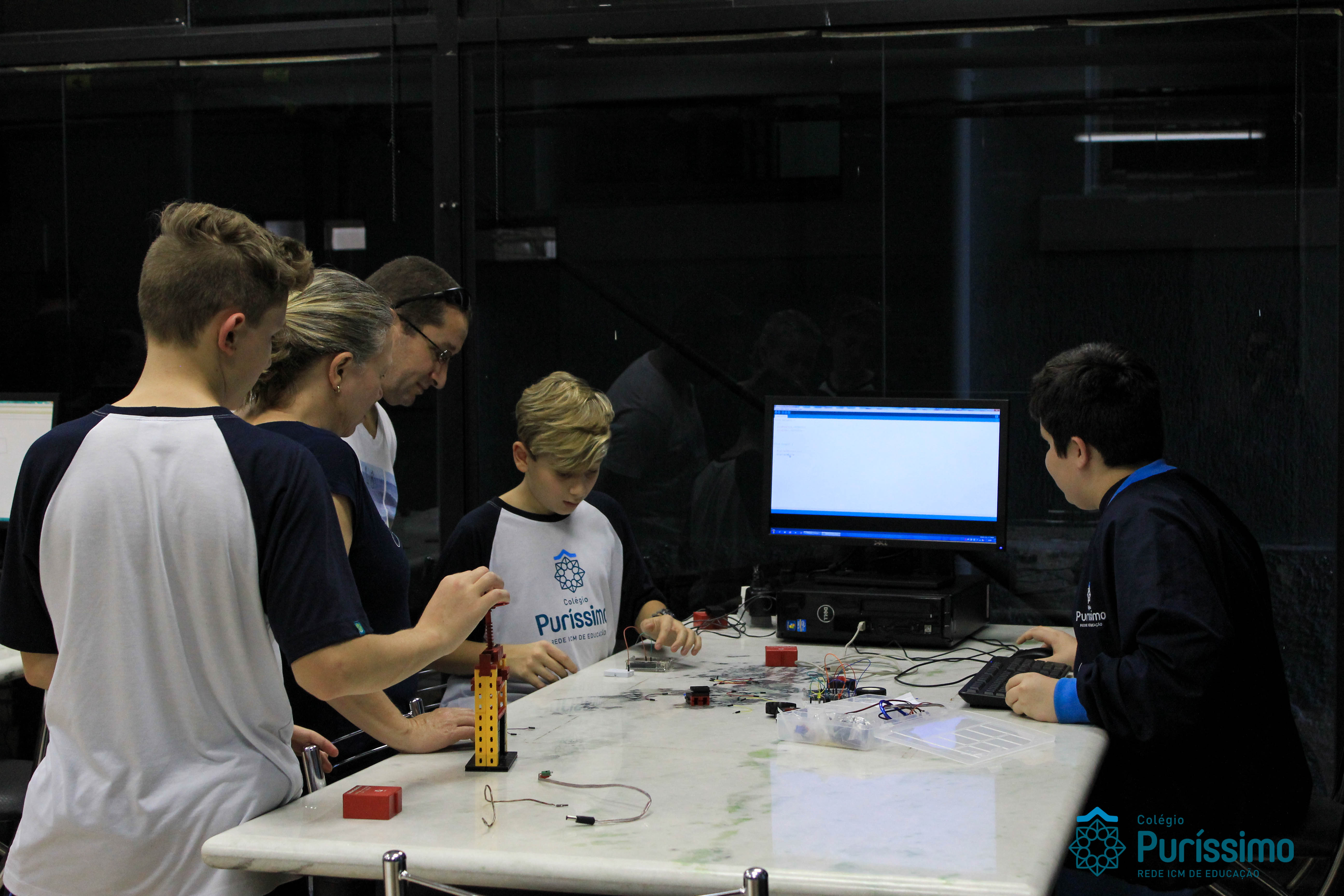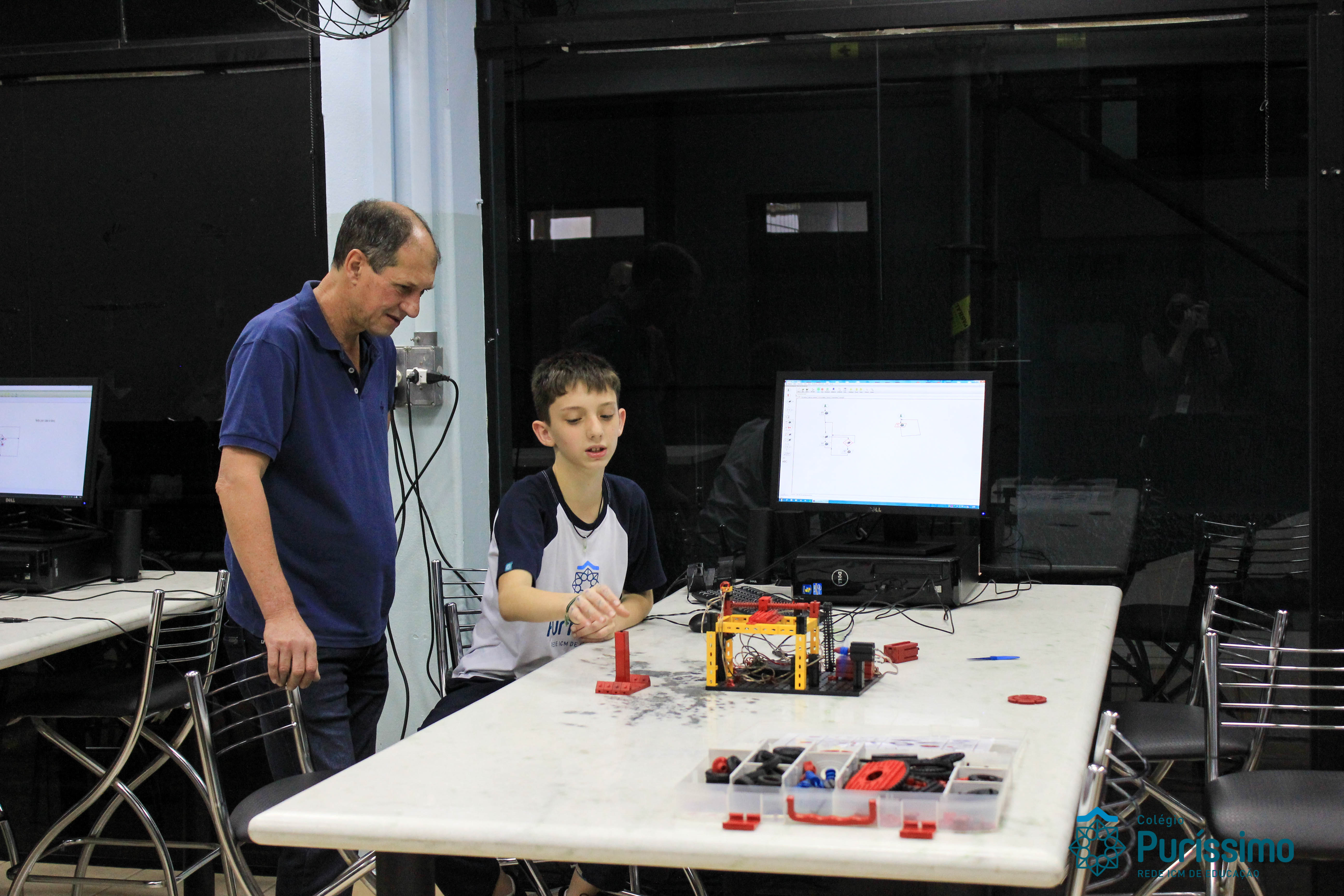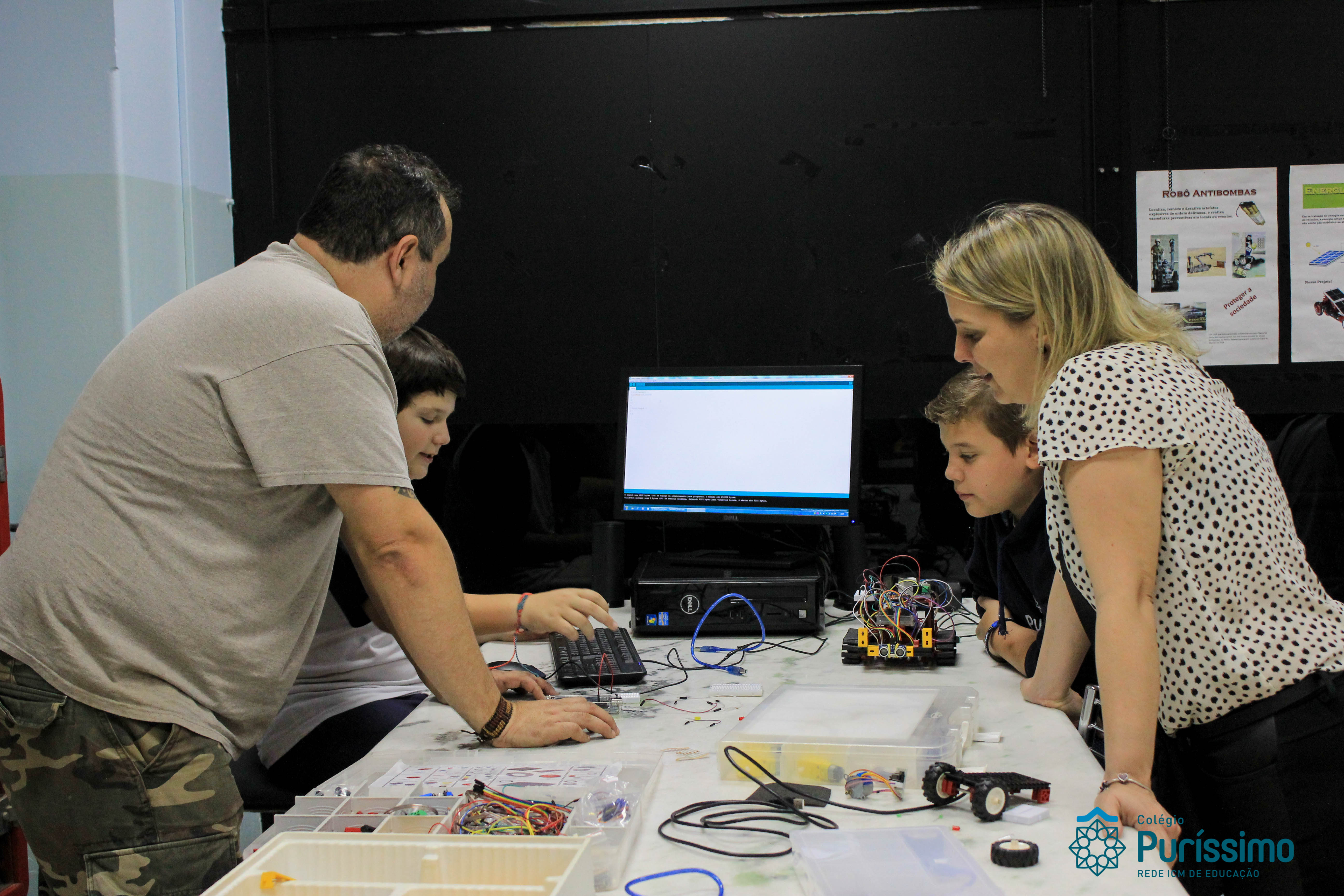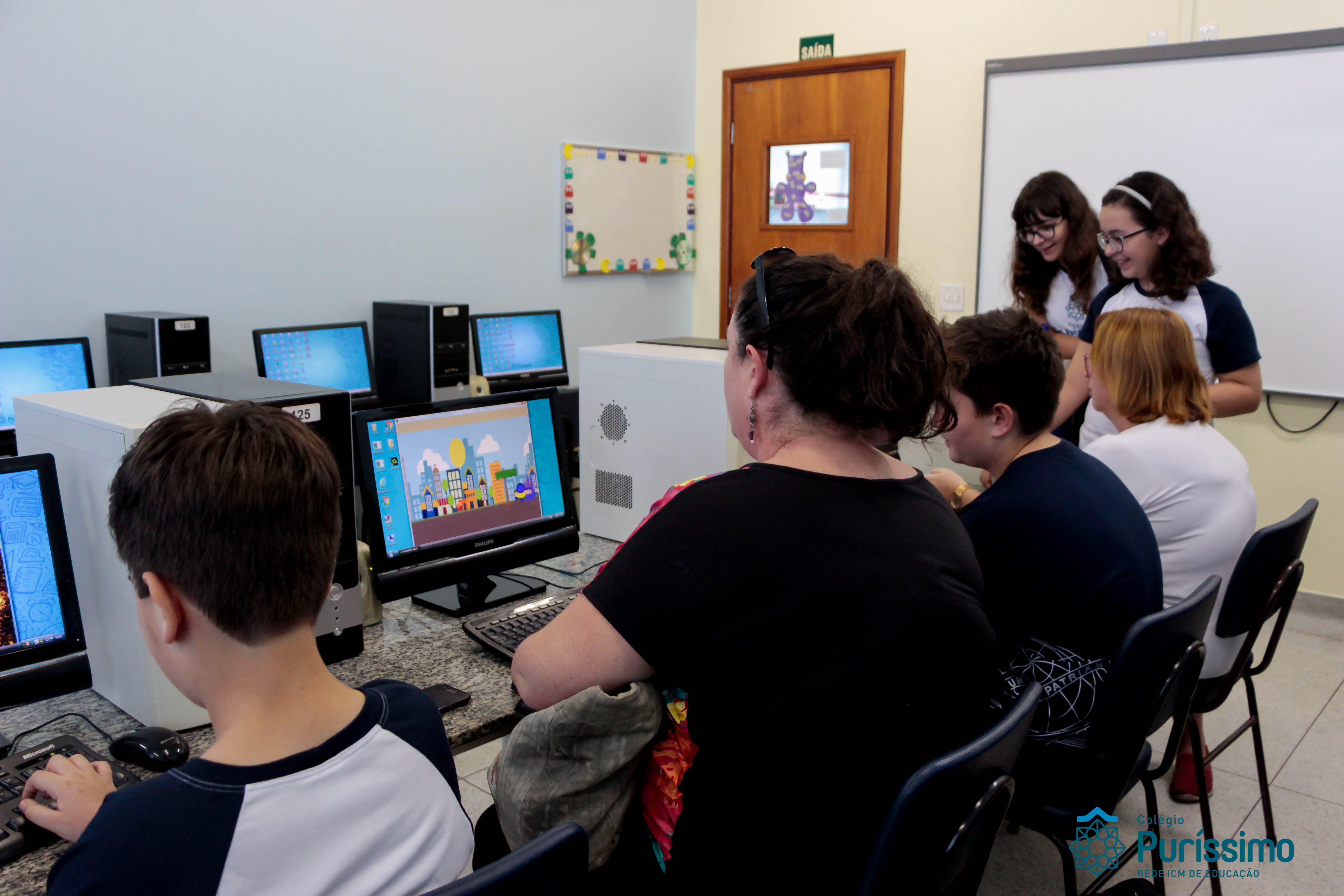 Ao longo da semana passada ocorreu o encerramento das Oficinas dos 6ºs anos para esse primeiro semestre. Os pais foram convidados a comparecerem para acompanharem de perto o trabalho desenvolvido pelos seus filhos no decorrer dos meses. Na oficina de design de games, as crianças explicaram aos pais os jogos desenvolvidos e o passo a passo que aprenderam durante as aulas, na oficina de gastronomia os alunos decoraram uma mesa com diversos doces feitos por eles e que ficaram para a degustação dos presentes. Já na oficina de robótica, os alunos explicaram aos pais como foram criados os robôs, os programas de computação usados para dar movimento e direção a alguns deles e o funcionamento de cada um.