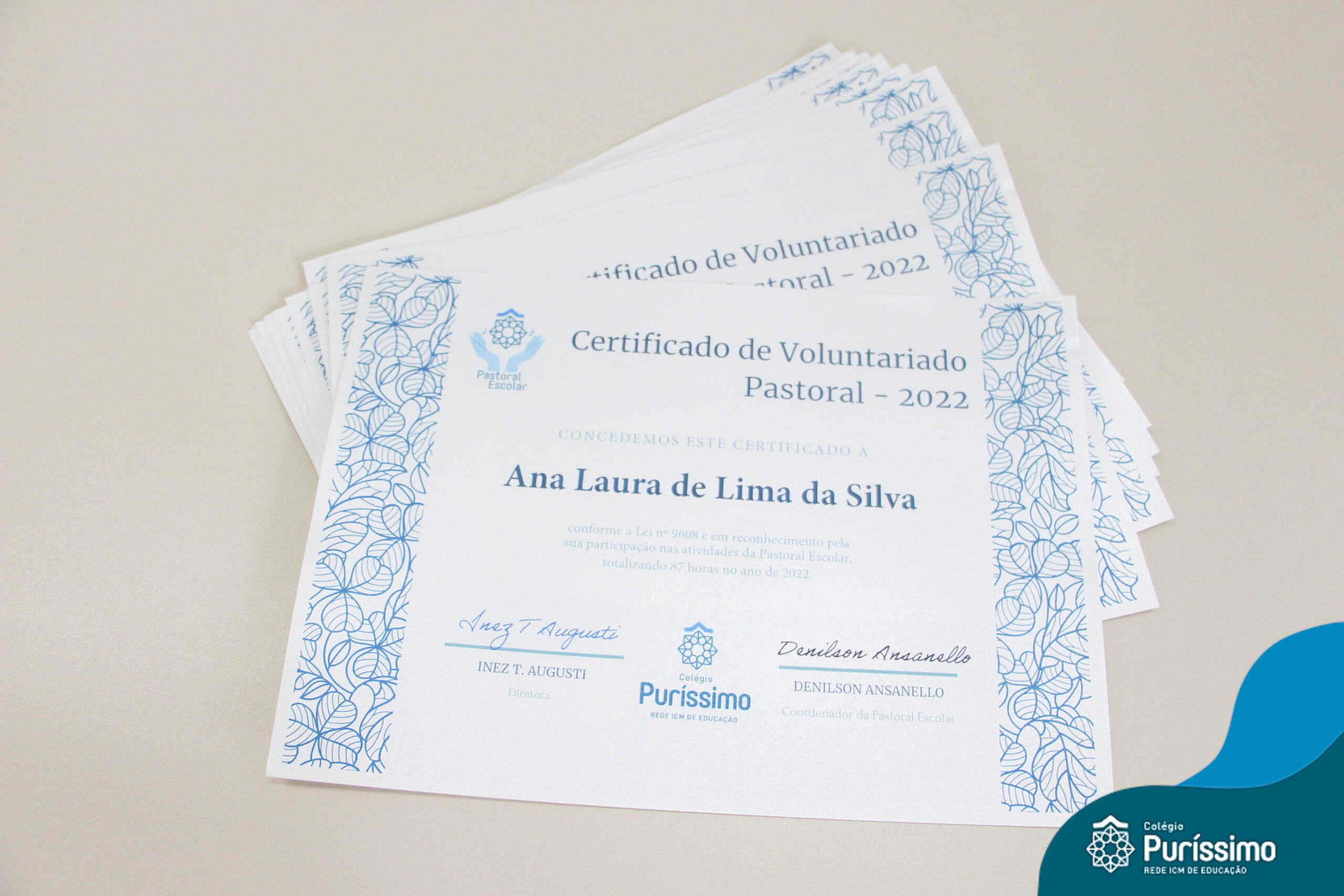 Conforme a lei 9608, que trata sobre o serviço voluntário e que tenha objetivos cívicos, culturais, educacionais, científicos, recreativos ou de assistência à pessoa, os alunos da Pastoral Escolar receberam um certificado de participação e ajuda pelas atividades prestadas a Pastoral ao longo do ano de 2022.