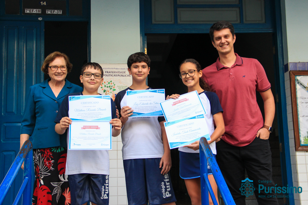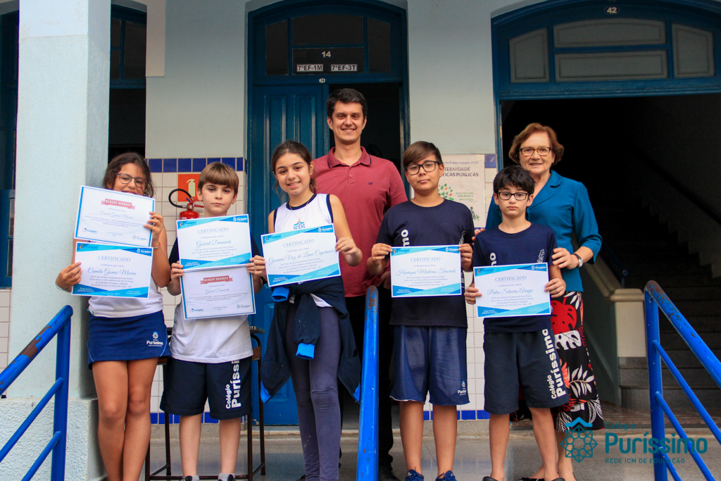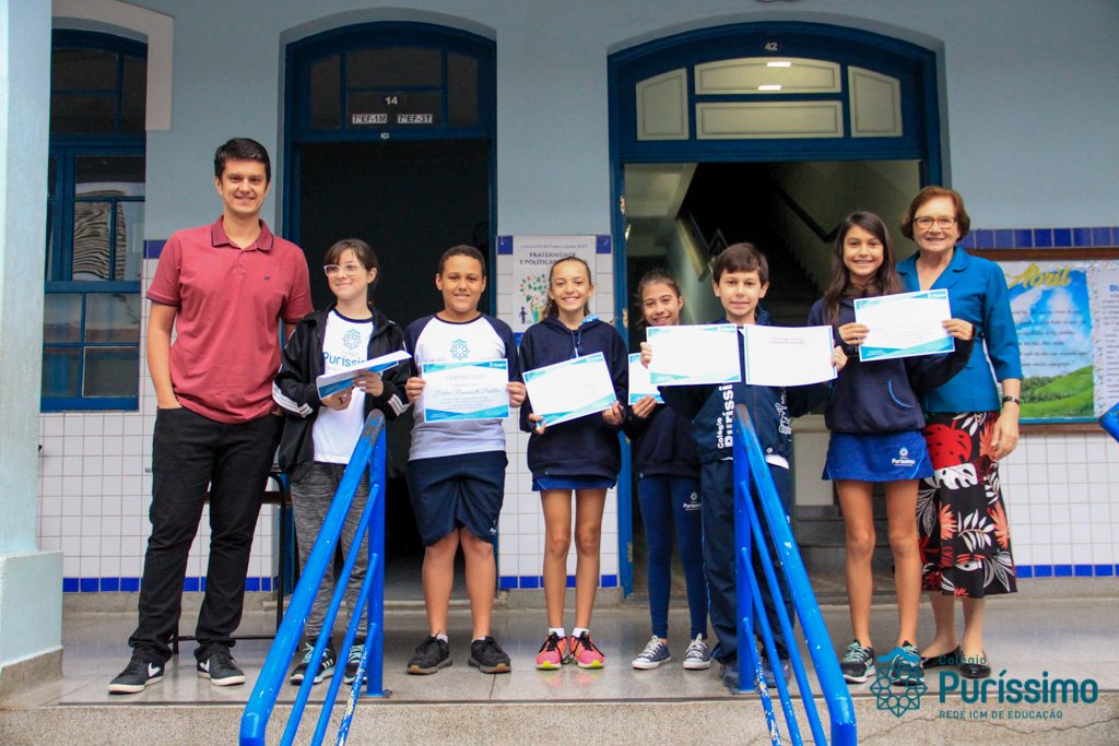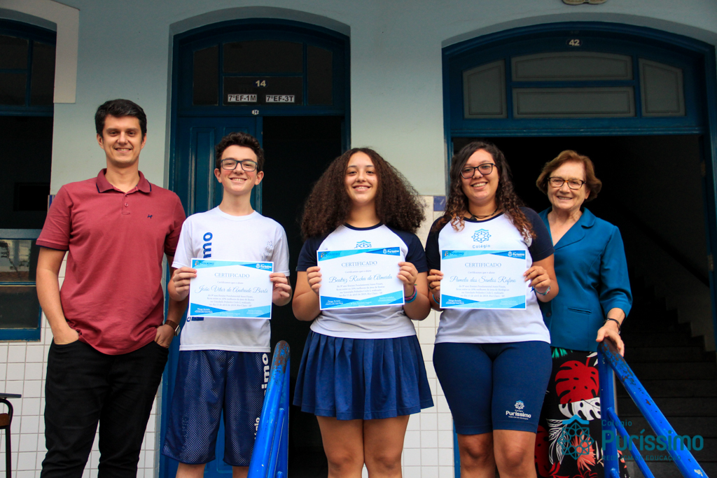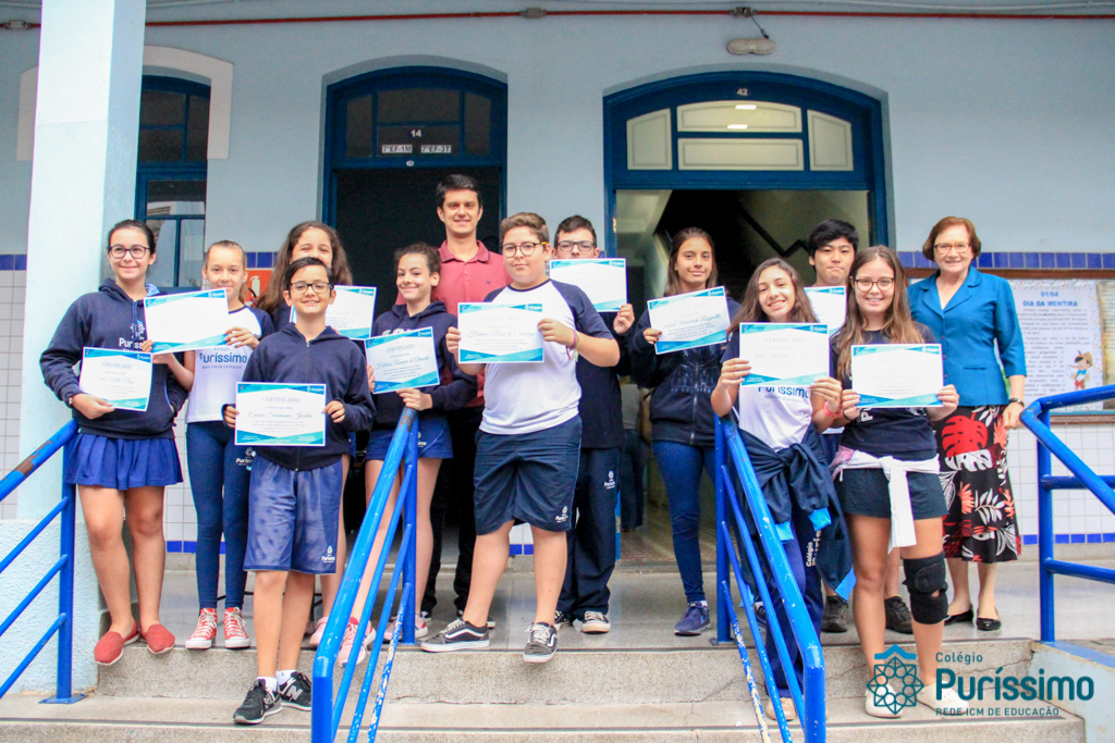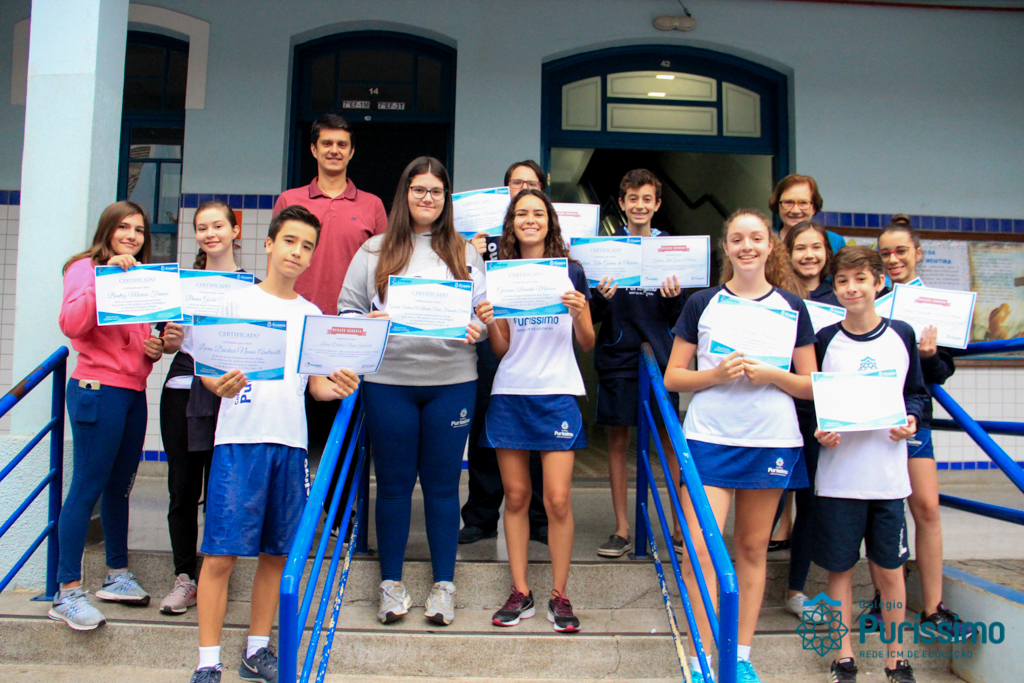 Na última terça, 30 de abril, os alunos do 6º ao 8º ano classificados entre os 10% melhores no Simulado Puríssimo, de acordo com a área que escolheram, receberam um certificado para comemorarem as notas. Além disso, os alunos classificados de primeiro a terceiro lugar na média geral de cada ano, receberam menção honrosa.