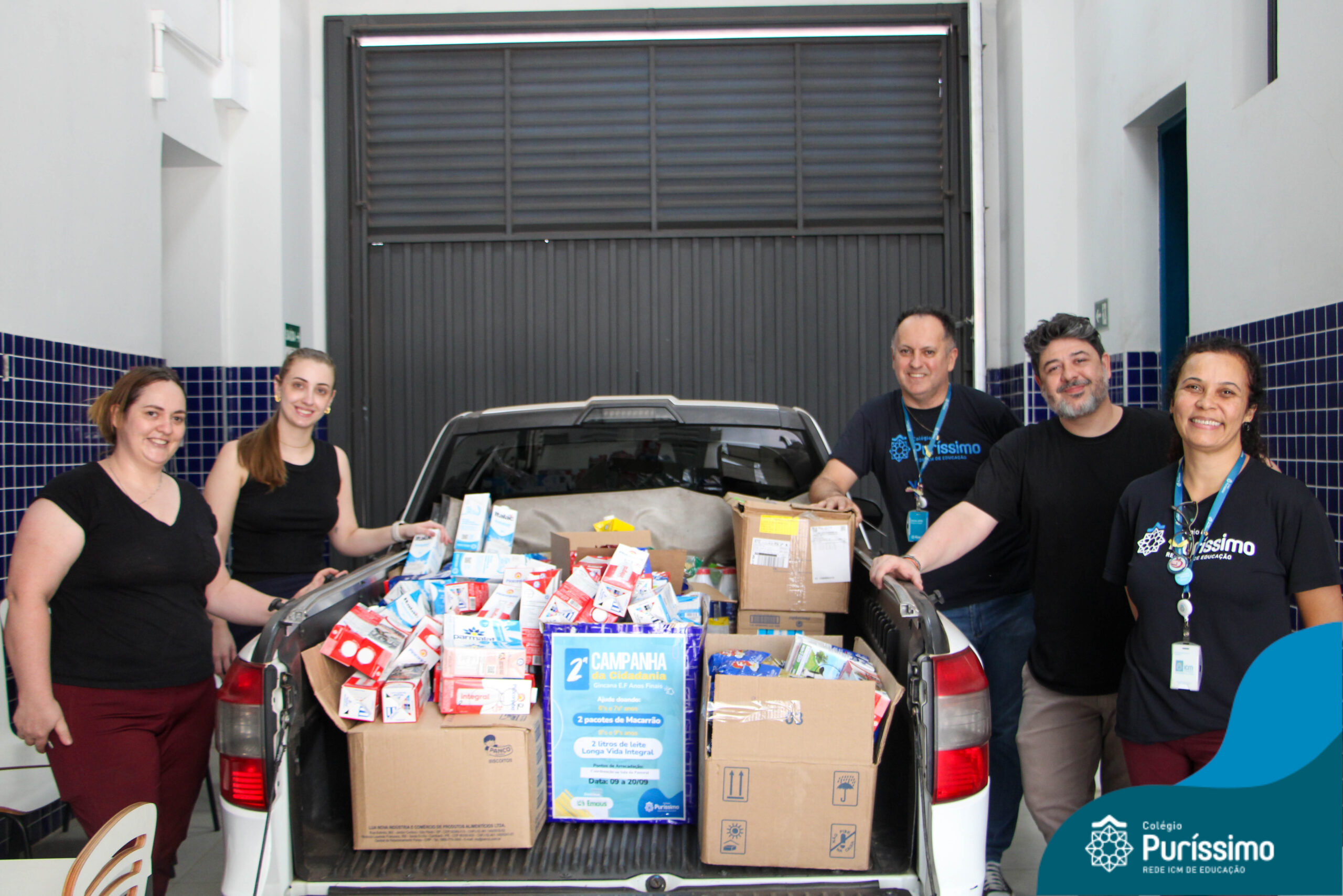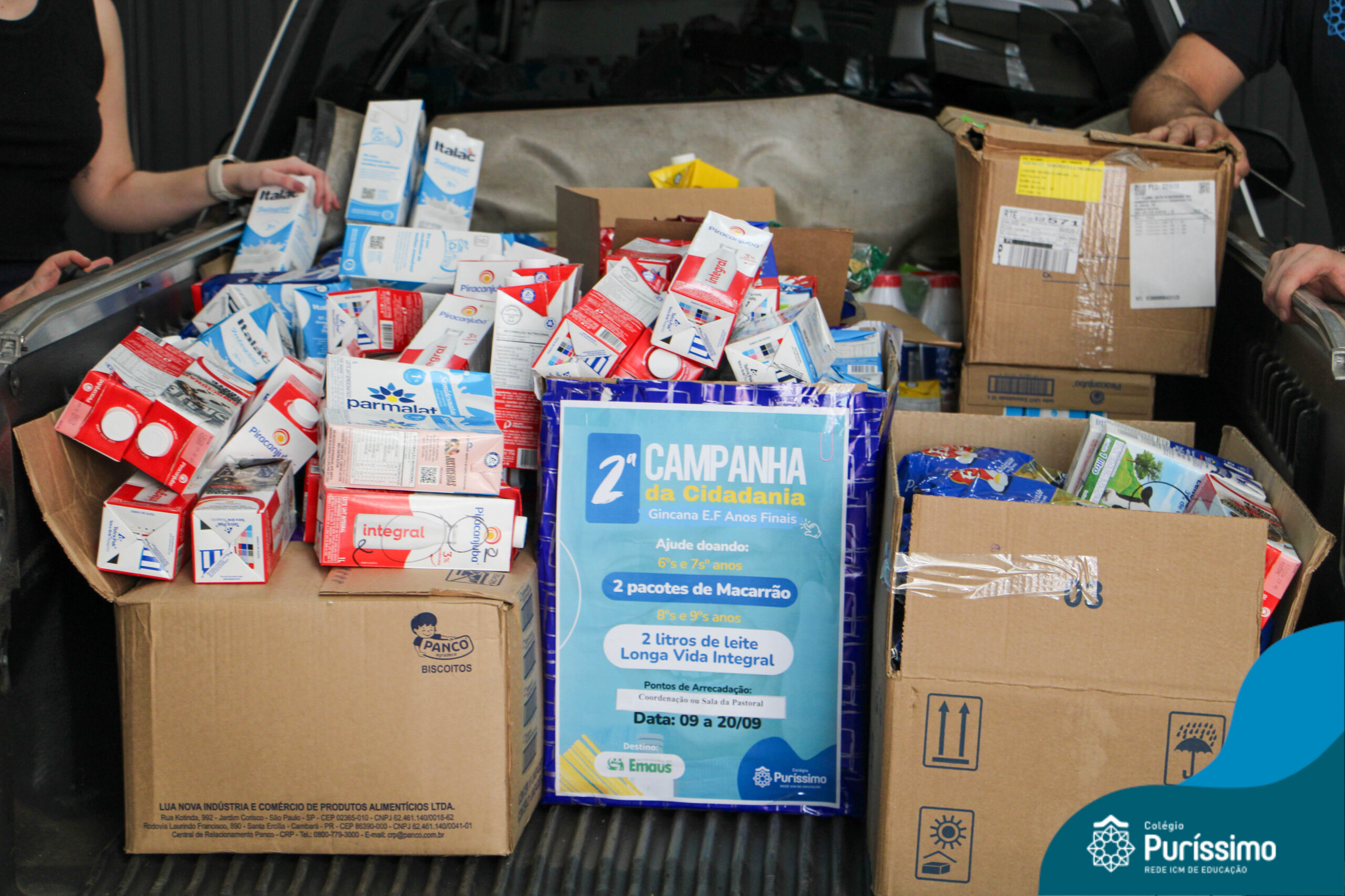 A coordenação do Ensino Fundamental – Anos Finais e a Pastoral Escolar fizeram a entrega das doações de macarrão e leite referente à campanha realizada com os alunos de 6º ao 9º ano, contemplando a segunda prova de cidadania da gincana que acontecerá em dezembro.