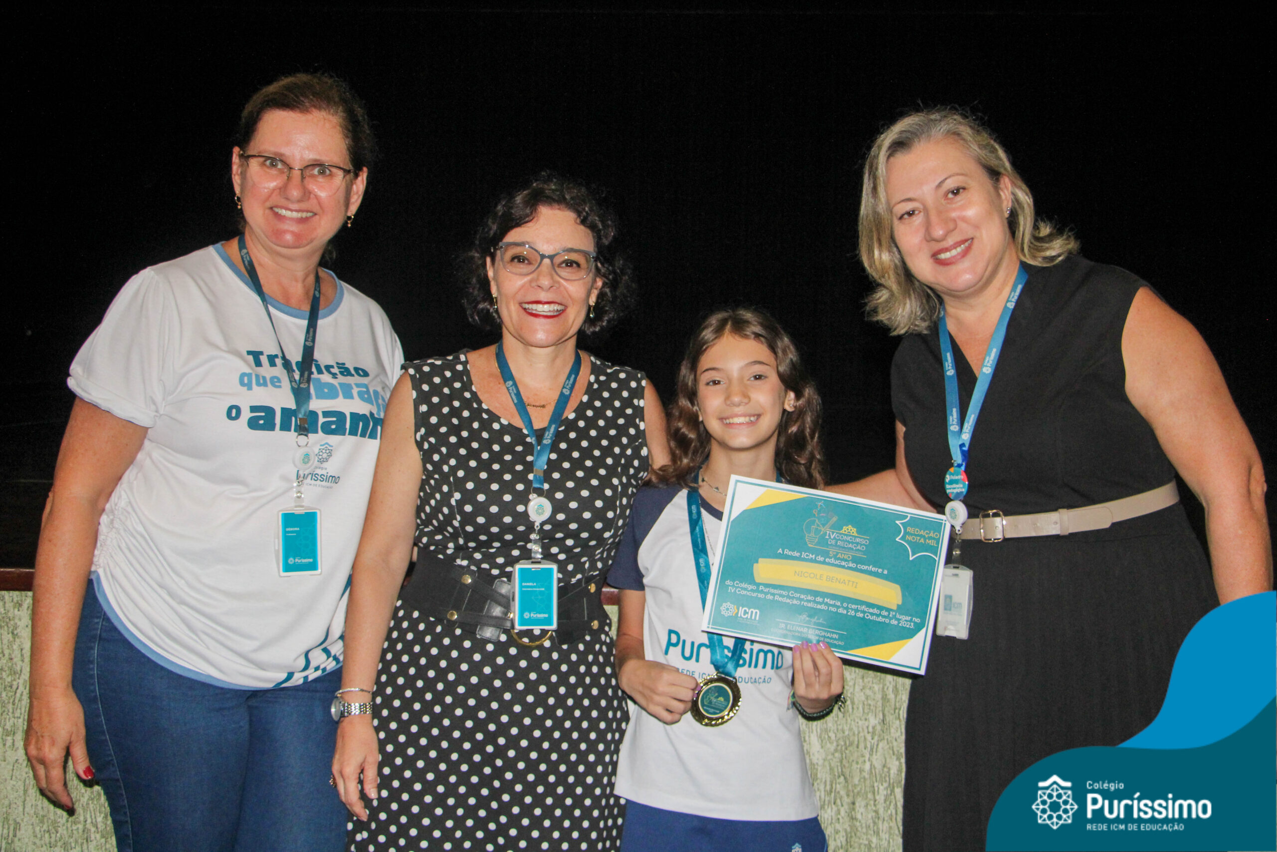 A estudante Nicole Benatti, do 5º ano, recebeu o certificado e a medalha do 4º Concurso de Redação da Rede ICM por ter atingido o 1º lugar com nota MÁXIMA.
