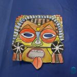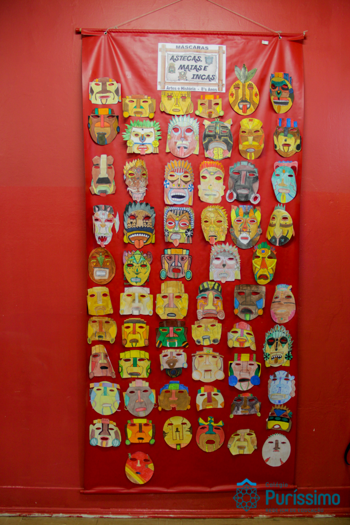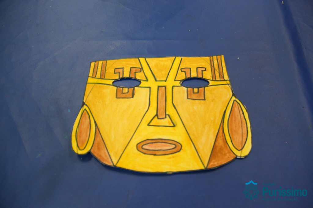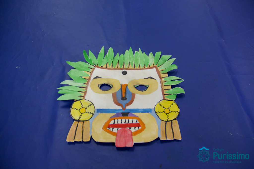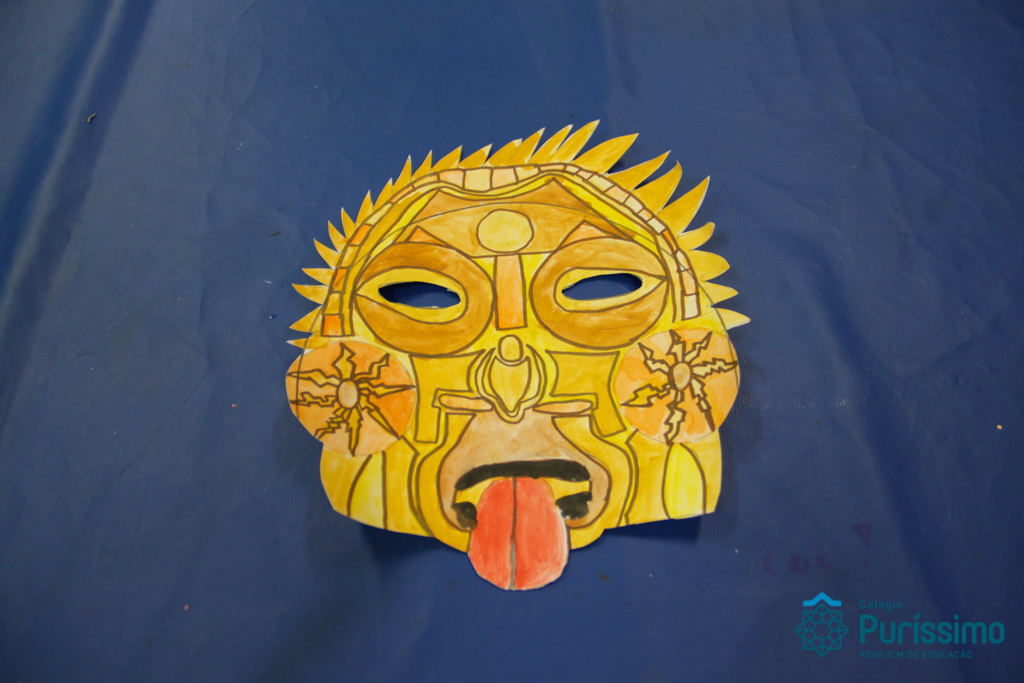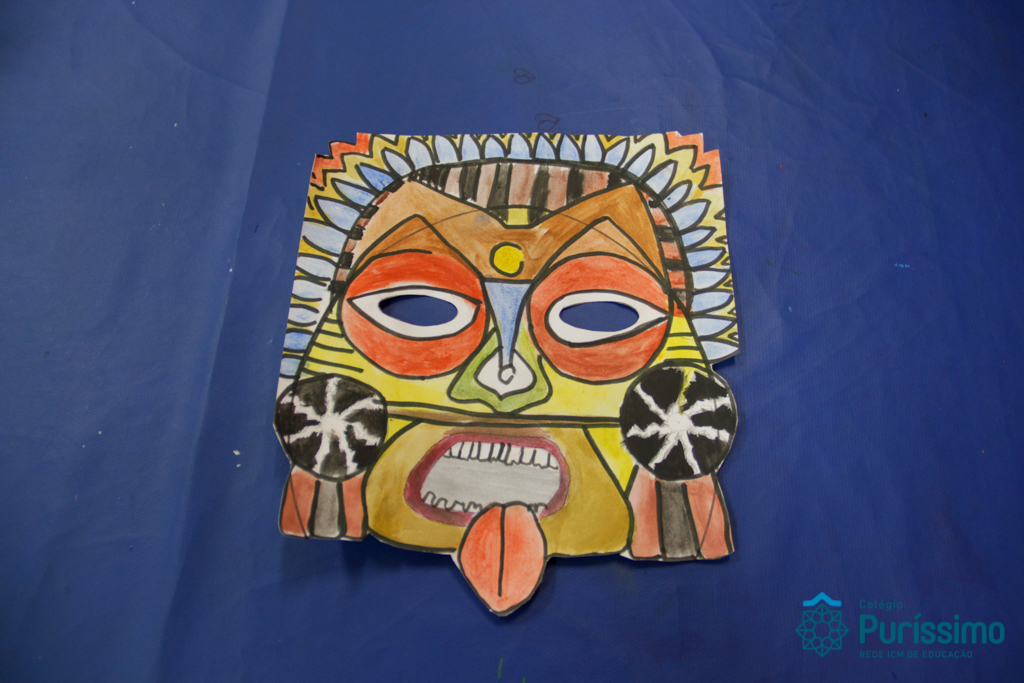 Utilizando técnicas de desenho e pintura com guache, canetinha e lápis de cor, os alunos produziram máscaras dos índios das regiões Maia, Astecas e Incas.