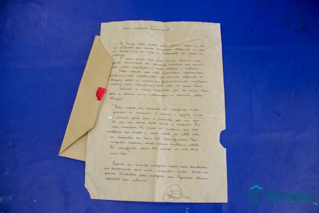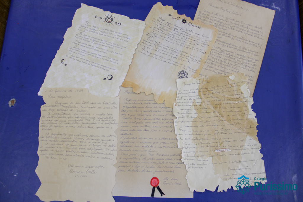 A partir de pesquisa do conteúdo estudado, foram produzidas cartas que relatam a chegada dos colonizadores e seus objetivos, já os trechos de diários mostram a suposta visão daqueles que já habitavam a região, os indígenas.