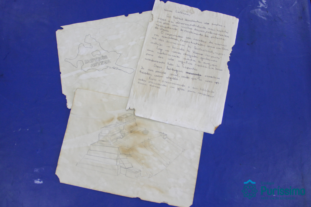 Os alunos dos 8ºs anos realizaram uma exposição de artes envolvendo o conteúdo de história. A exposição traz cartas e trechos de diários produzidos pelos alunos, cujo objetivo foi retratar a relação entre os nativos e os espanhóis durante a colonização da América Espanhola.