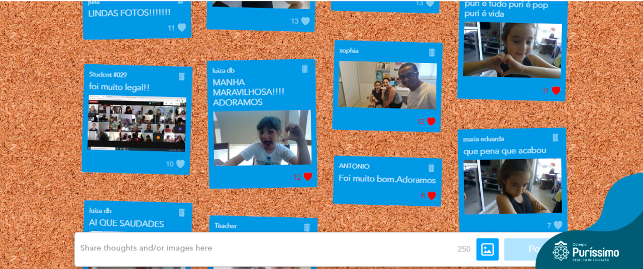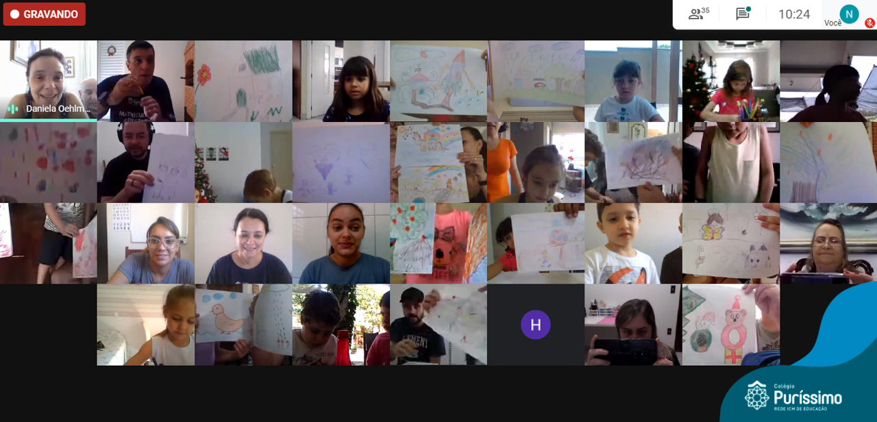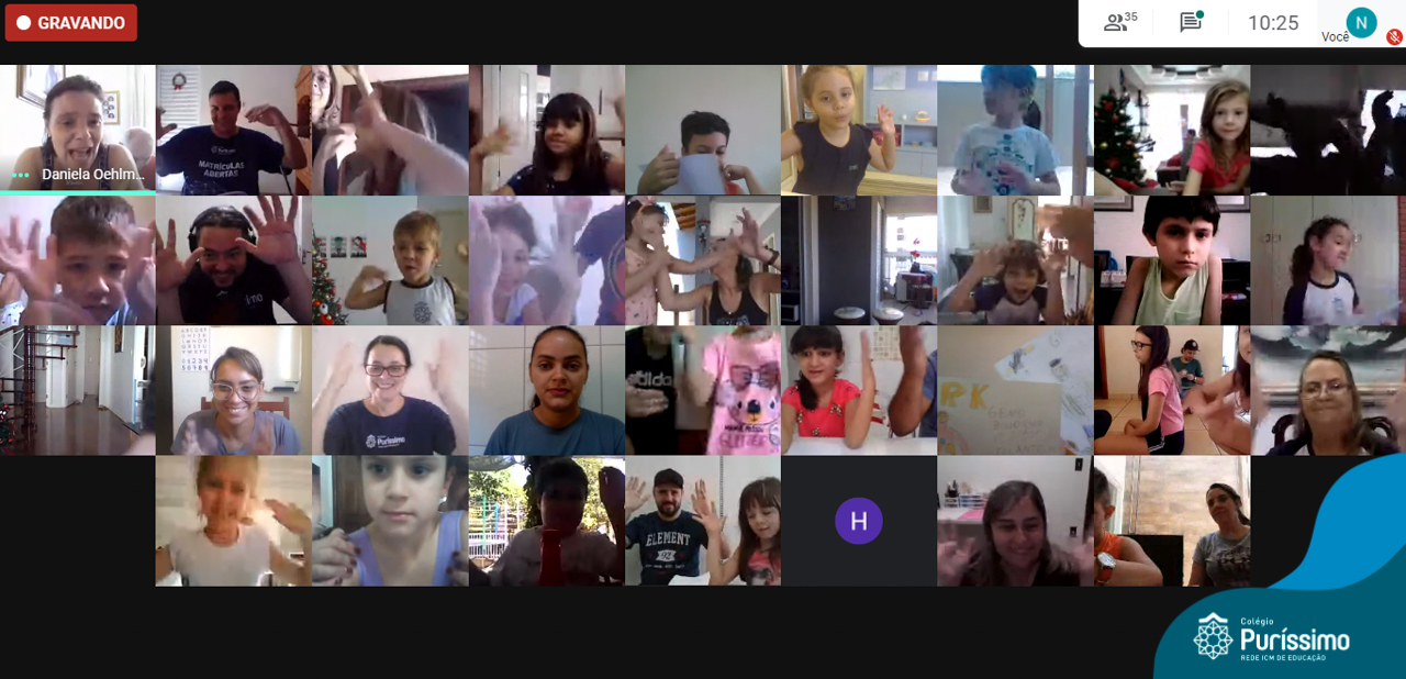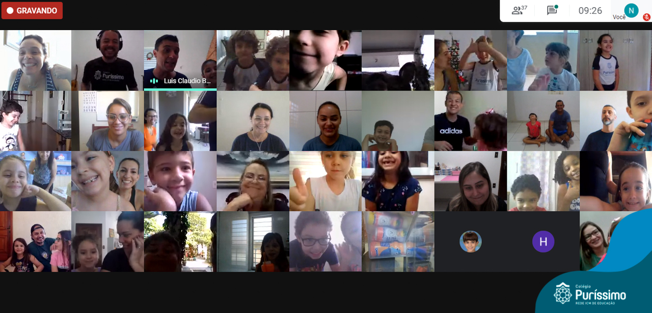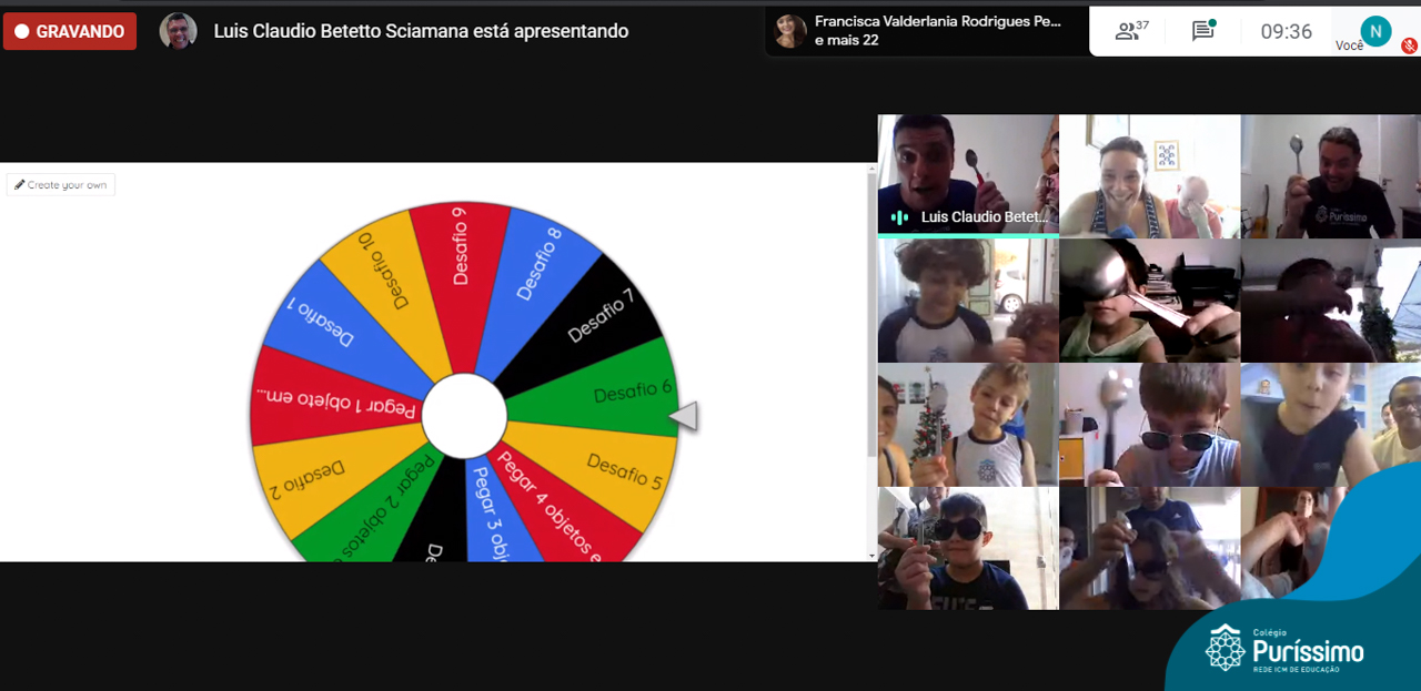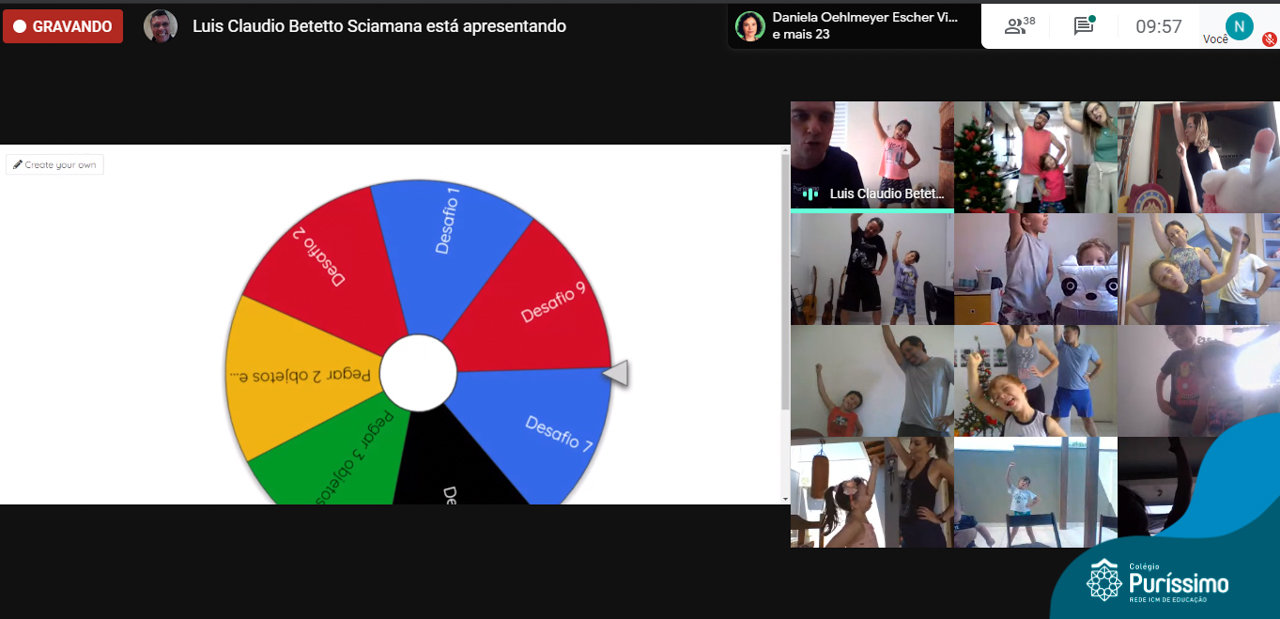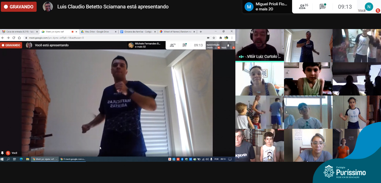 Os professores Luís Claudio e Vitor fizeram uma manhã divertida para os pais e crianças que dançaram, participaram de desafios como pegar objetos pela casa (toalha, ferramenta, óculos, prendedor, sabonete, garrafa de água, brinquedo, almofada, relógio de pulso, escova de dente e porta retrato), brincaram de batata-quente, de dança da cadeira, de dançar abraçados e de trocar os desenhos! Ao final da manhã, as famílias deixaram recados e fotos no mural do Nearpod a respeito da gincana!