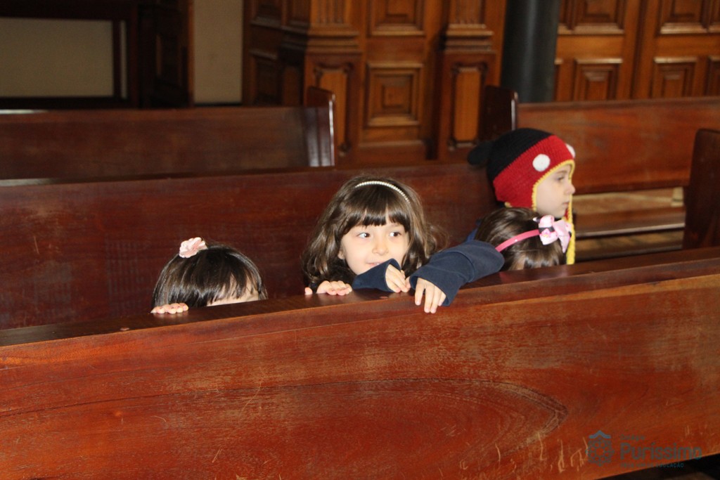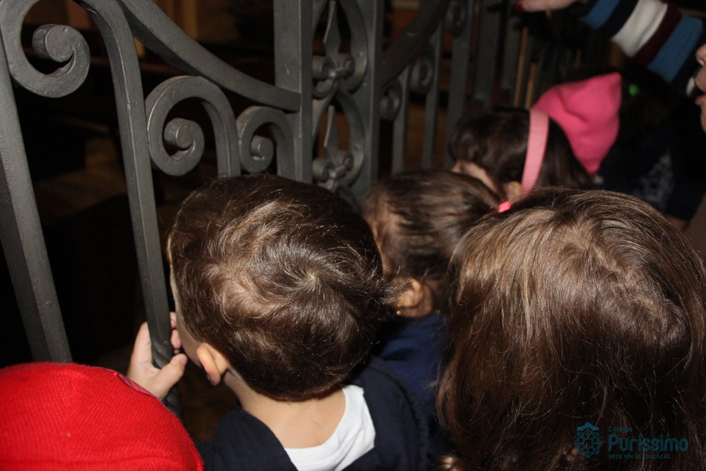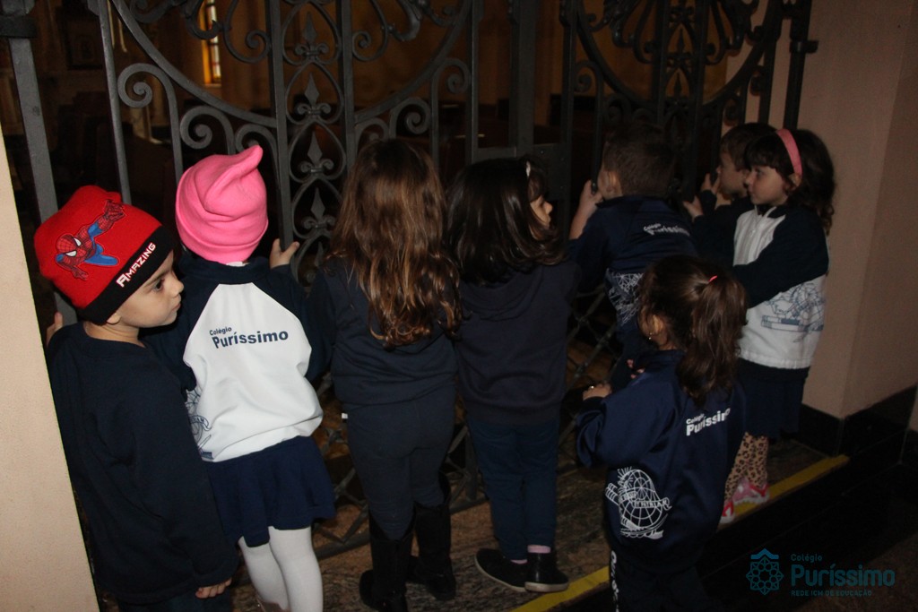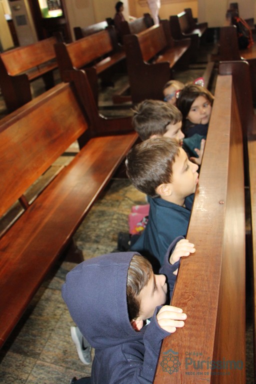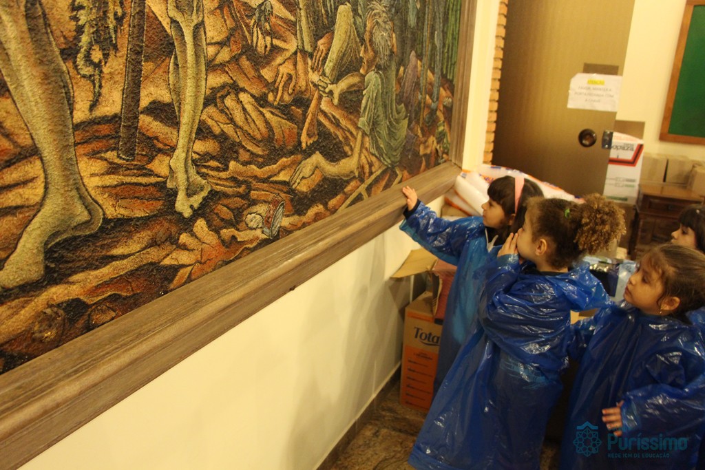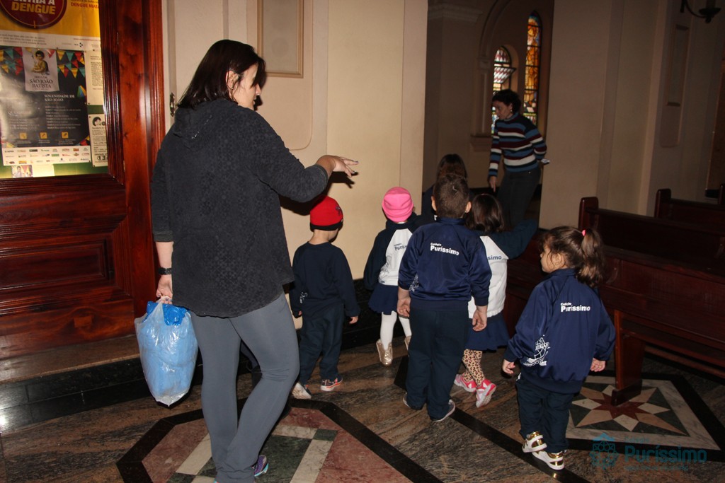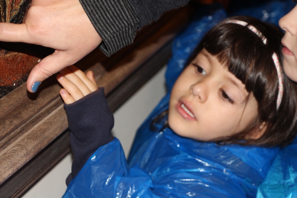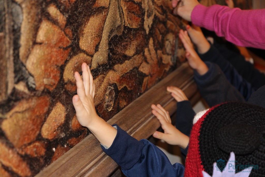 Os pequenos puderam visitar a parte interna da igreja que possui um quadro que usa diferentes materiais artísticos, eles tocaram e puderam sentir elementos como: prego, serragem, madeira, entre outros.