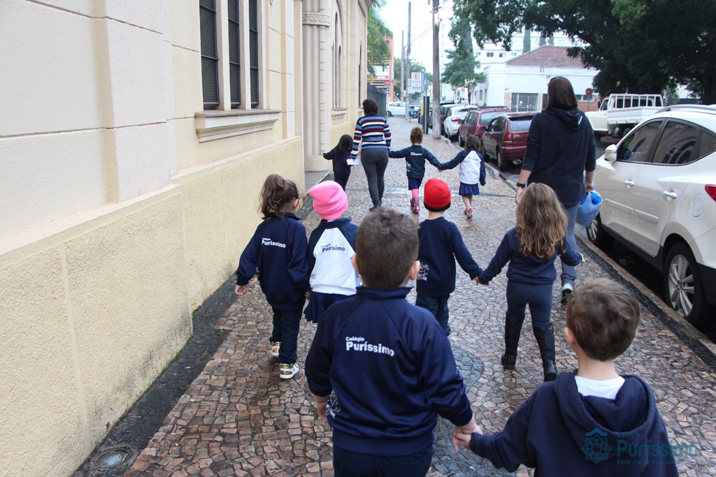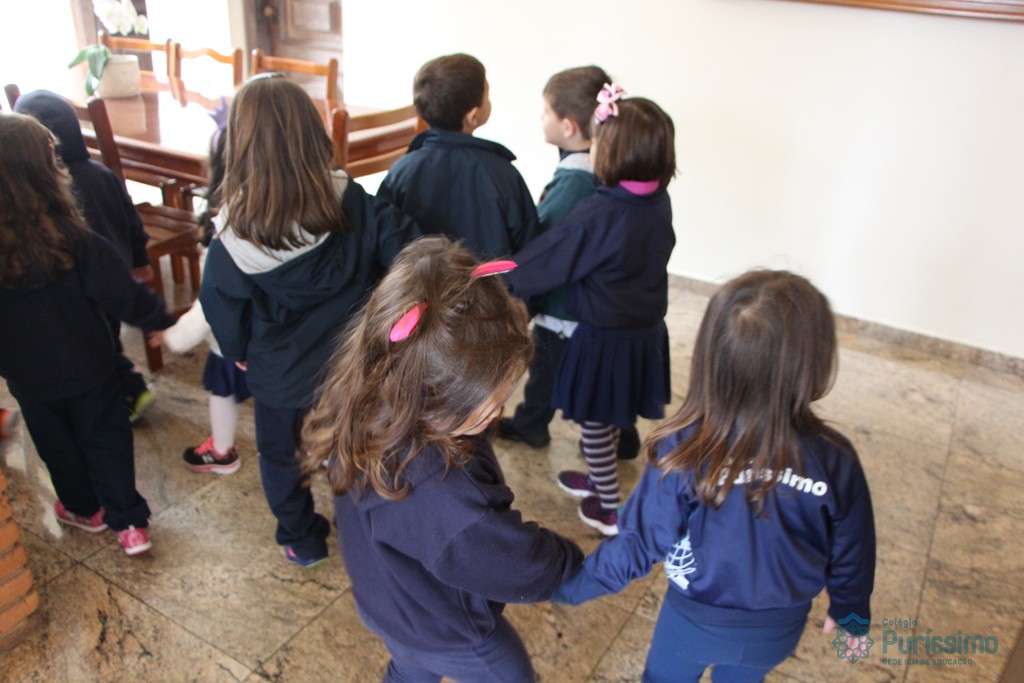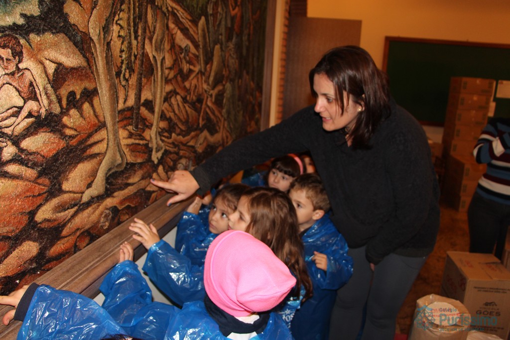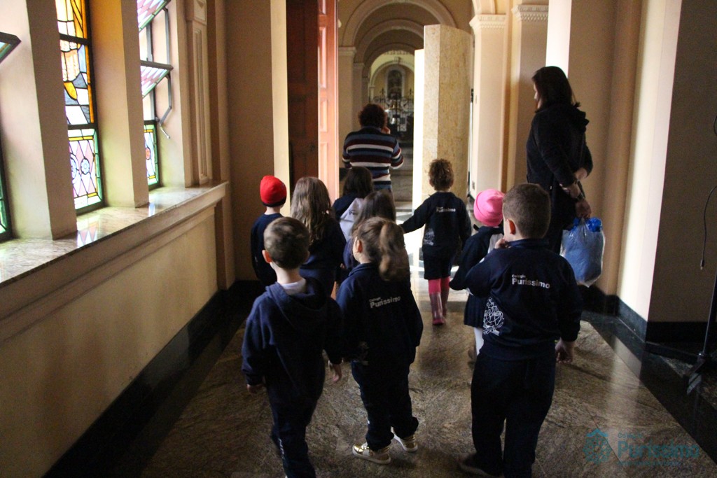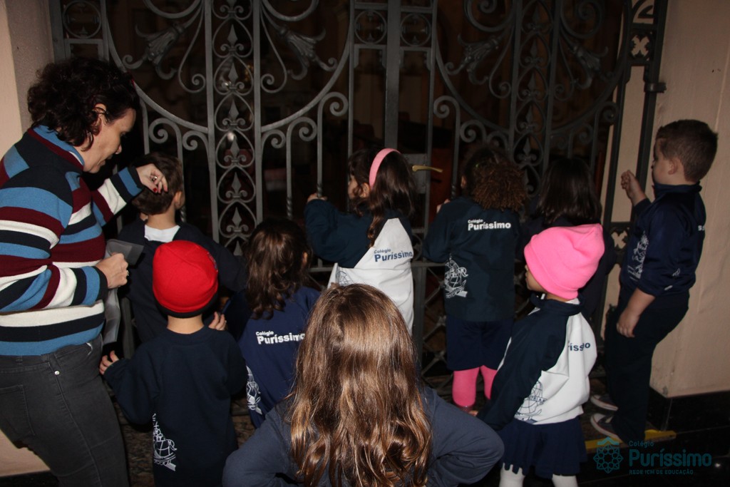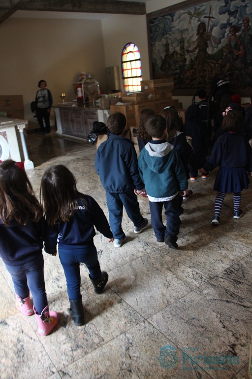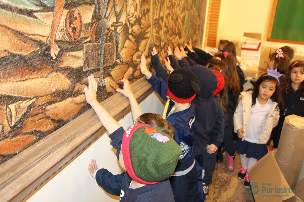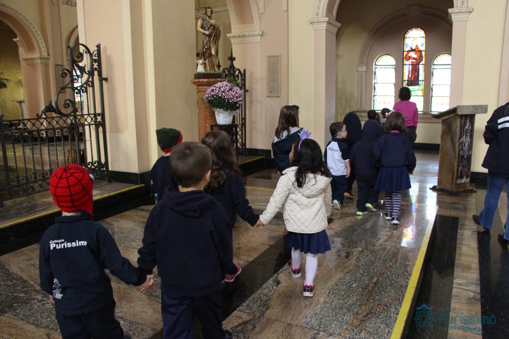 Os pequenos puderam visitar a parte interna da igreja que possui um quadro que usa diferentes materiais artísticos, eles tocaram e puderam sentir elementos como: prego, serragem, madeira, entre outros.