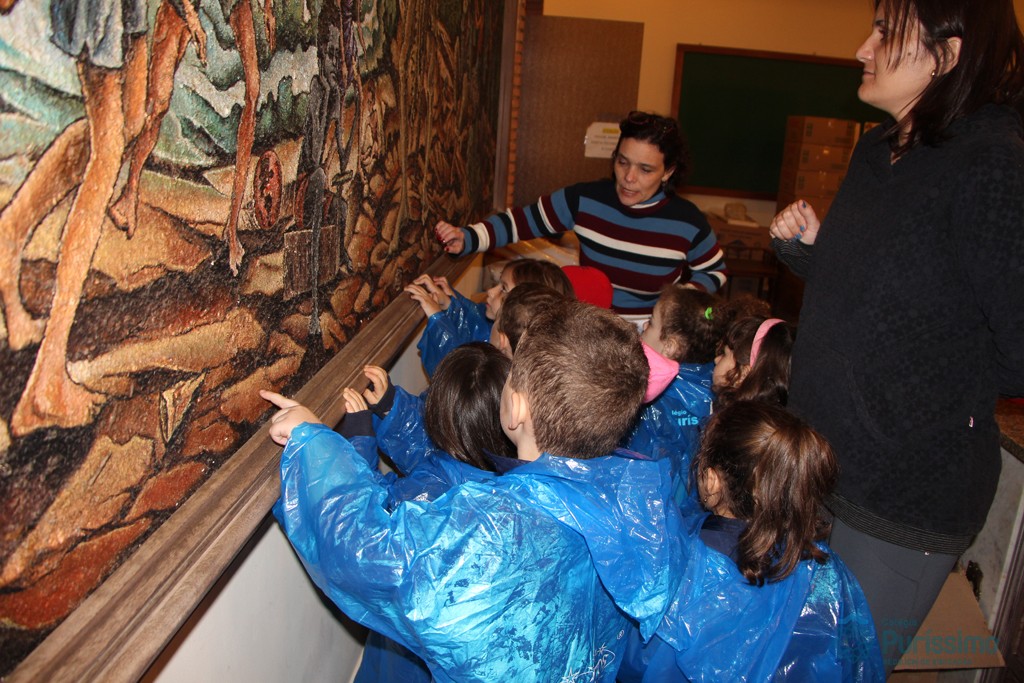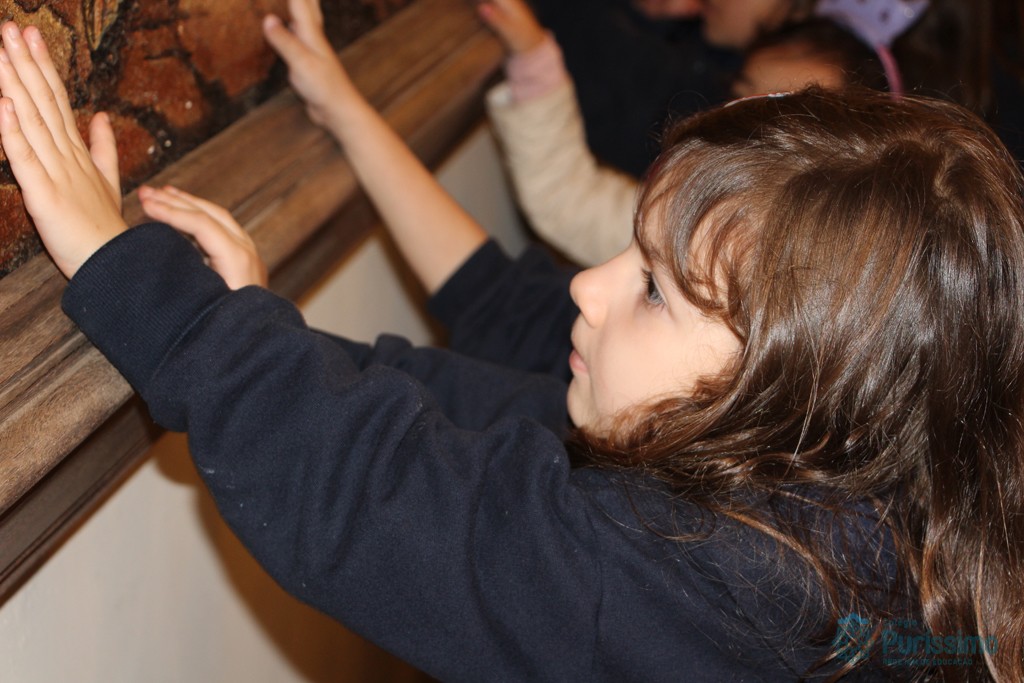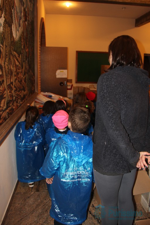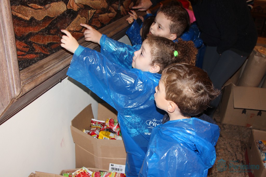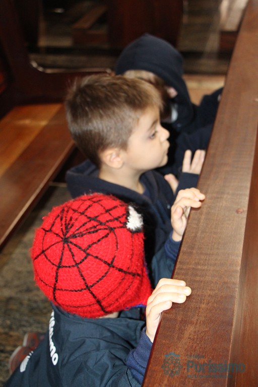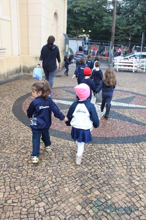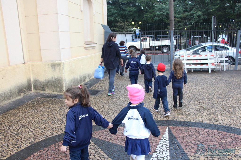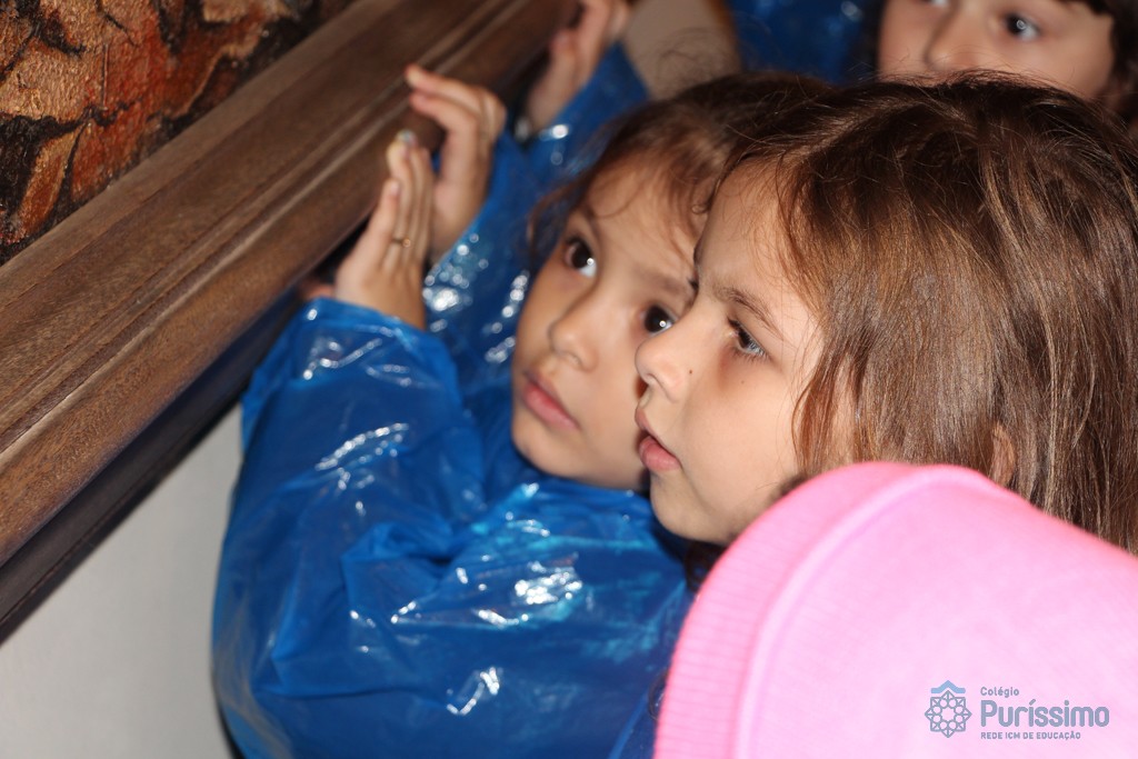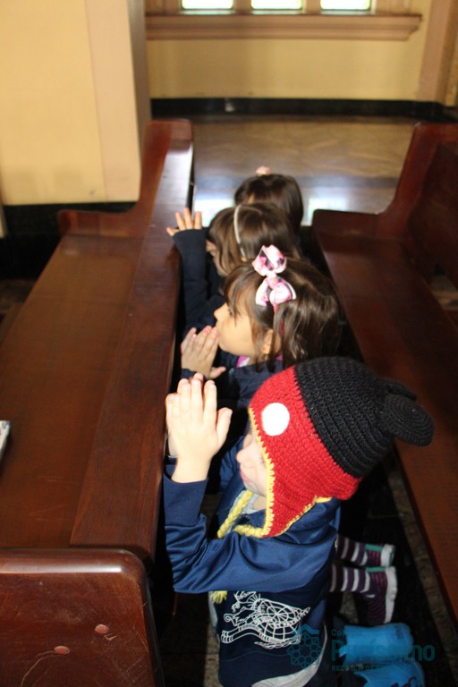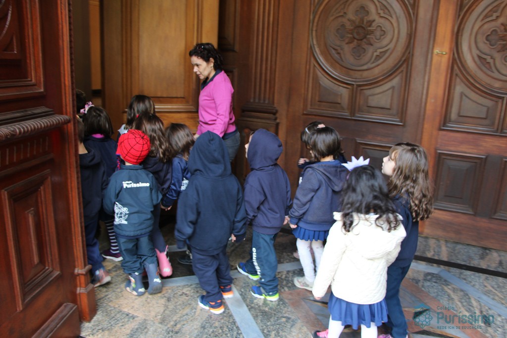 Os pequenos puderam visitar a parte interna da igreja que possui um quadro que usa diferentes materiais artísticos, eles tocaram e puderam sentir elementos como: prego, serragem, madeira, entre outros.