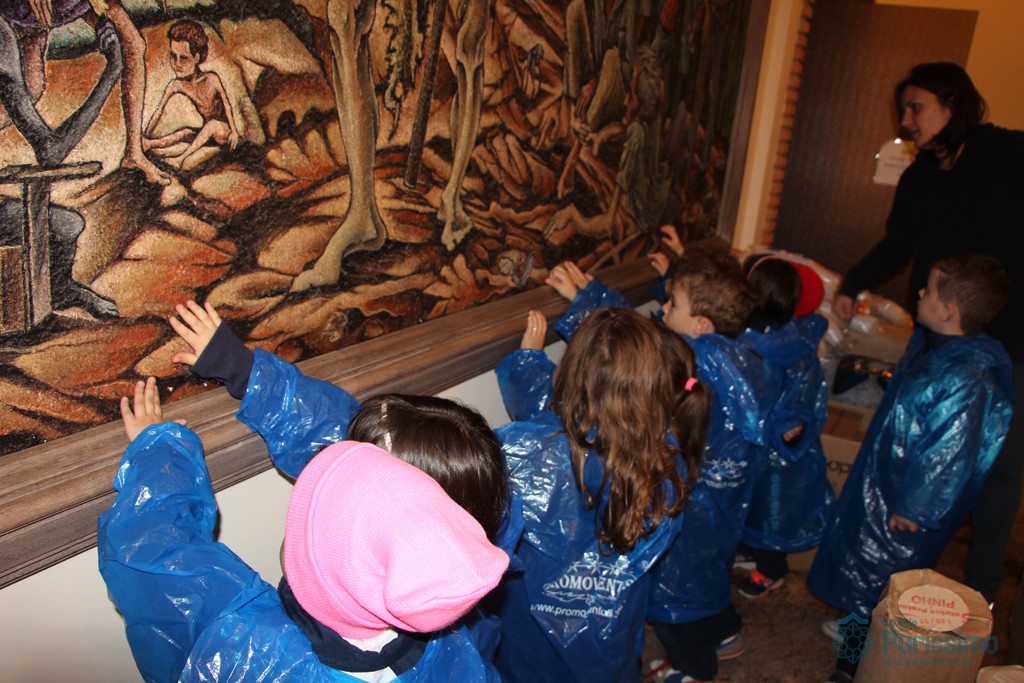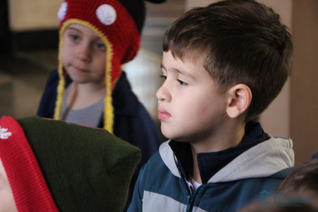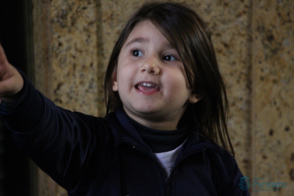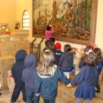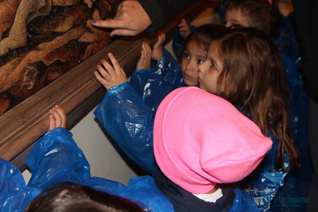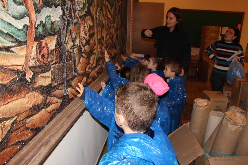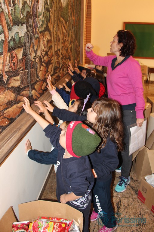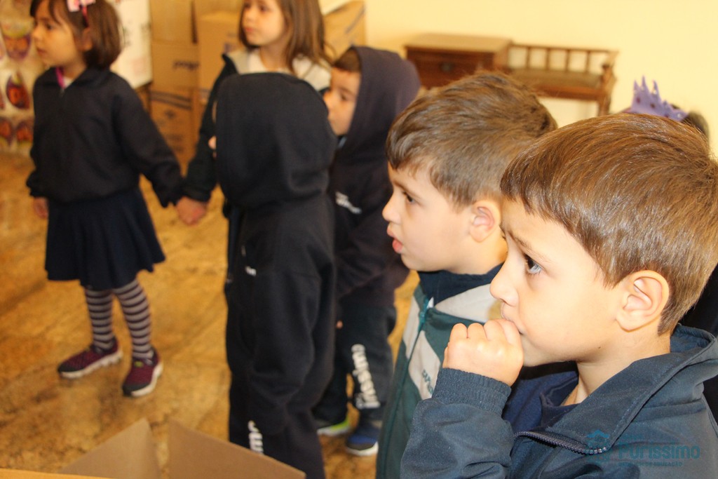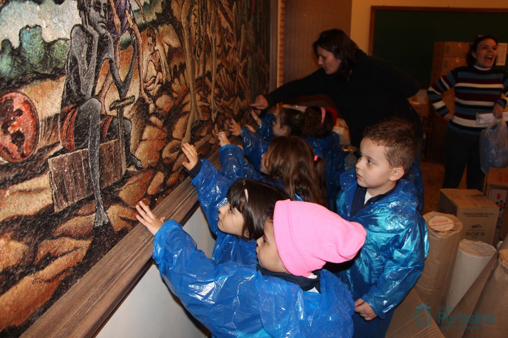 Os pequenos puderam visitar a parte interna da igreja que possui um quadro que usa diferentes materiais artísticos, eles tocaram e puderam sentir elementos como: prego, serragem, madeira, entre outros.