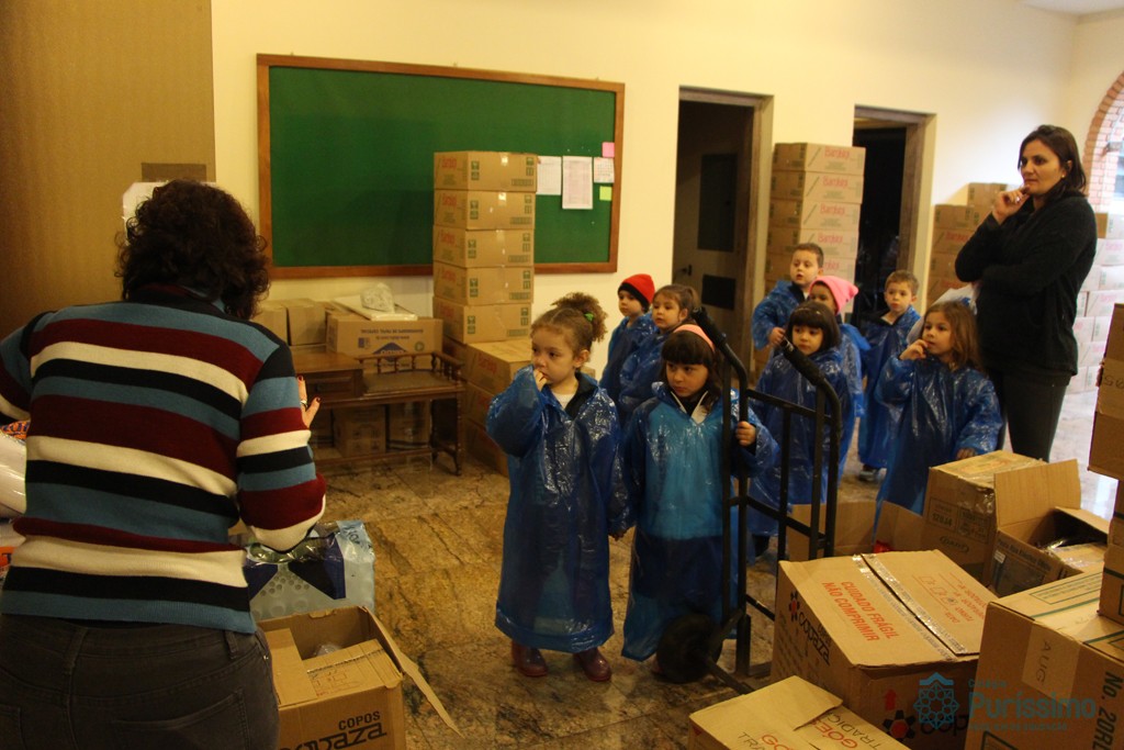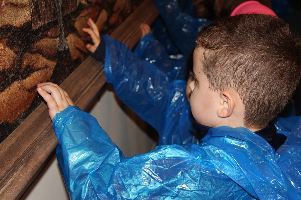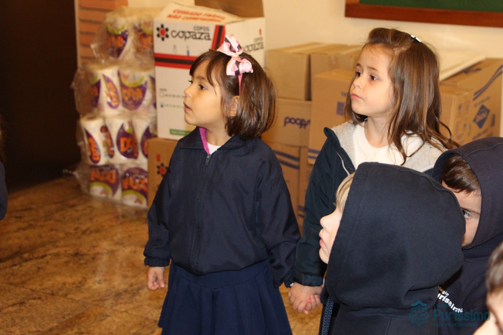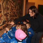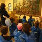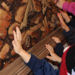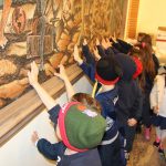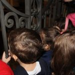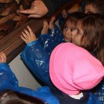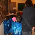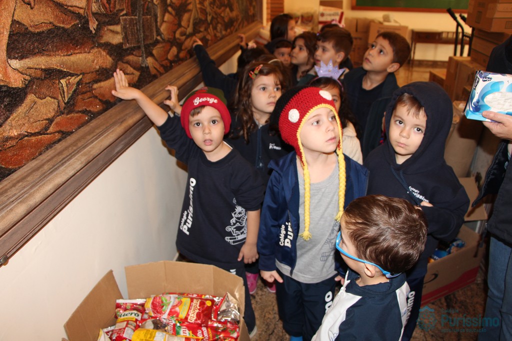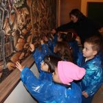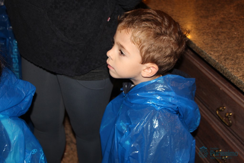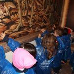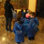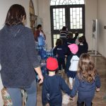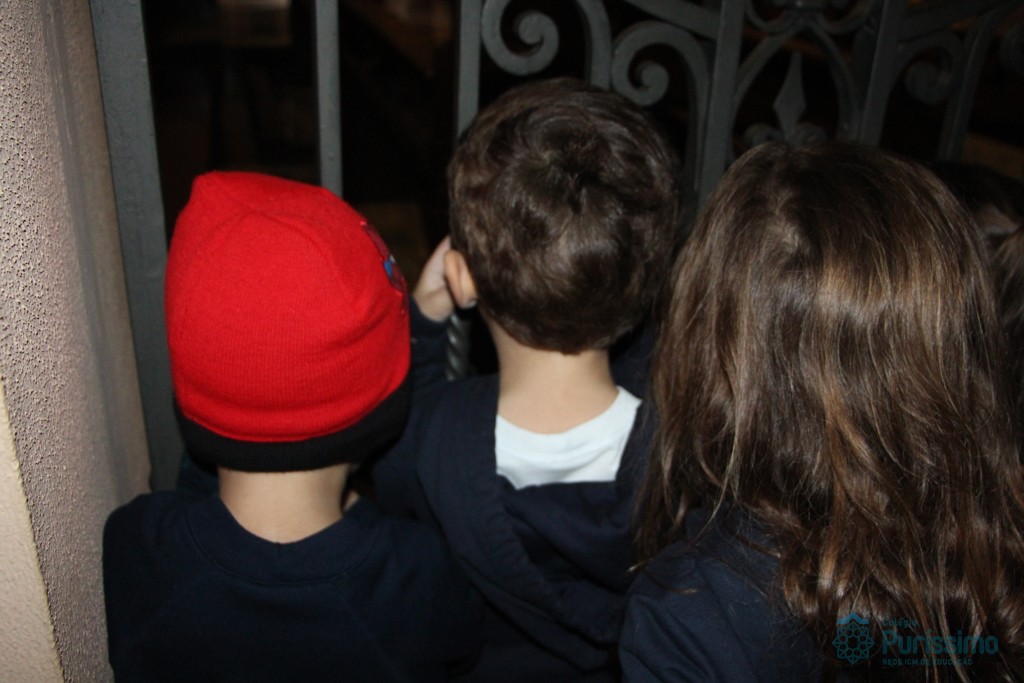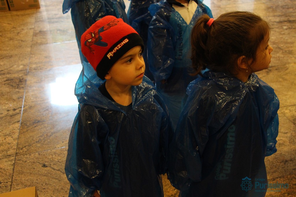 Os pequenos puderam visitar a parte interna da igreja que possui um quadro que usa diferentes materiais artísticos, eles tocaram e puderam sentir elementos como: prego, serragem, madeira, entre outros.