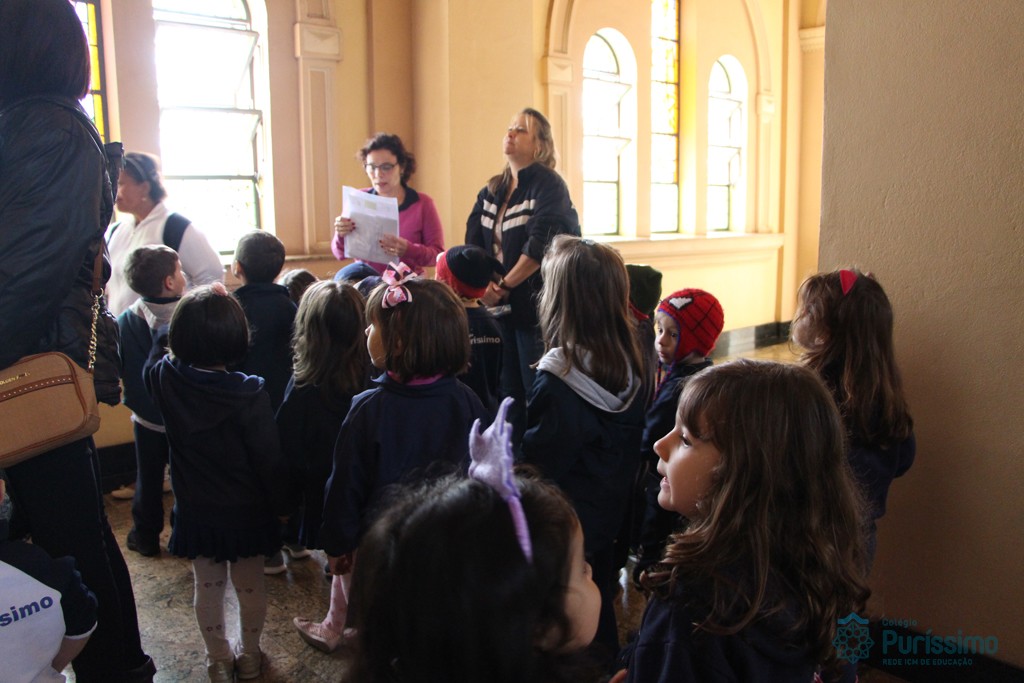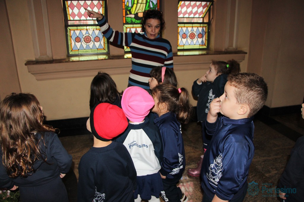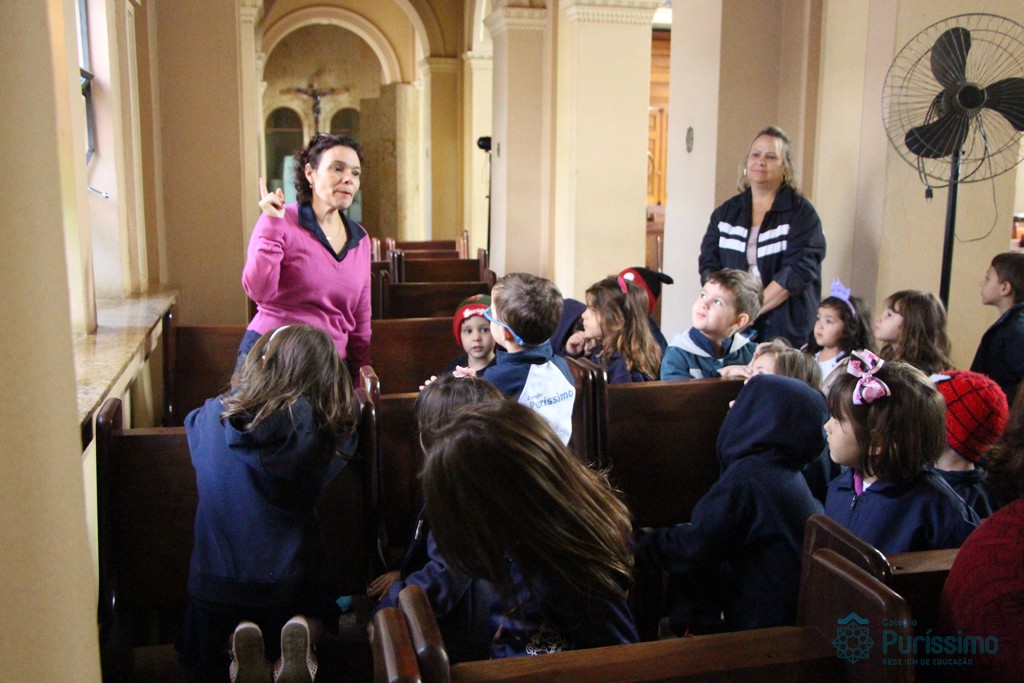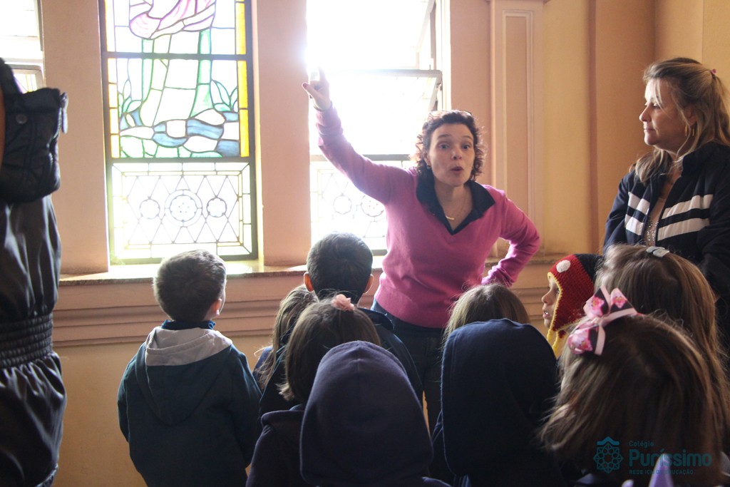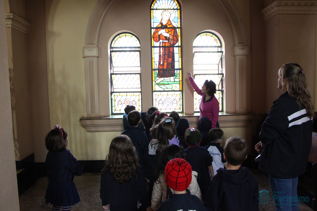 Depois disso, eles visitaram o interior da igreja e observaram a arquitetura do local e as pinturas dos vitrais, além de aprenderem um pouco sobre a história dos personagens santos mostrados nas imagens.