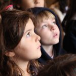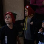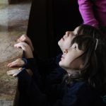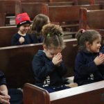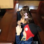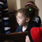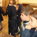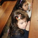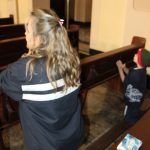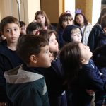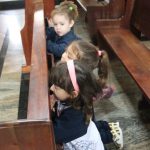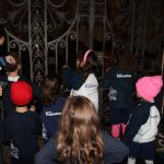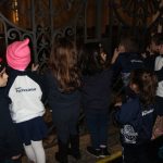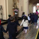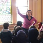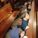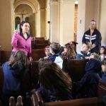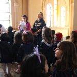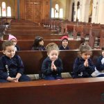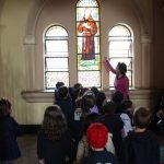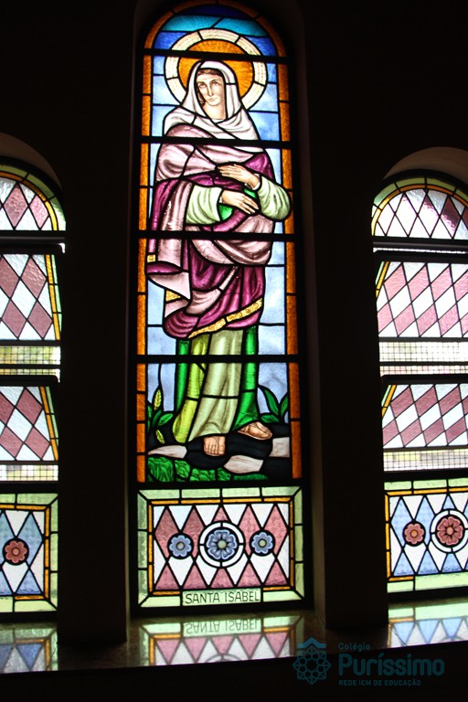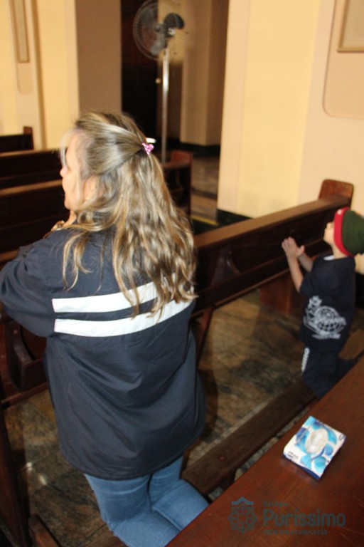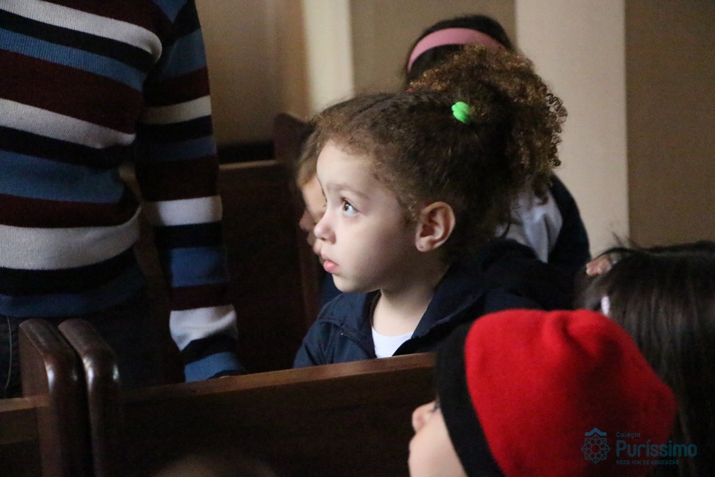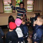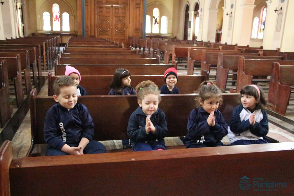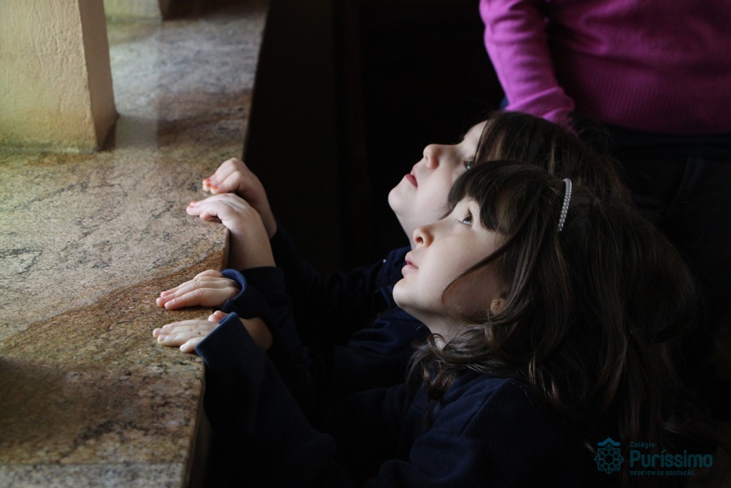 Depois disso, eles visitaram o interior da igreja e observaram a arquitetura do local e as pinturas dos vitrais, além de aprenderem um pouco sobre a história dos personagens santos mostrados nas imagens.