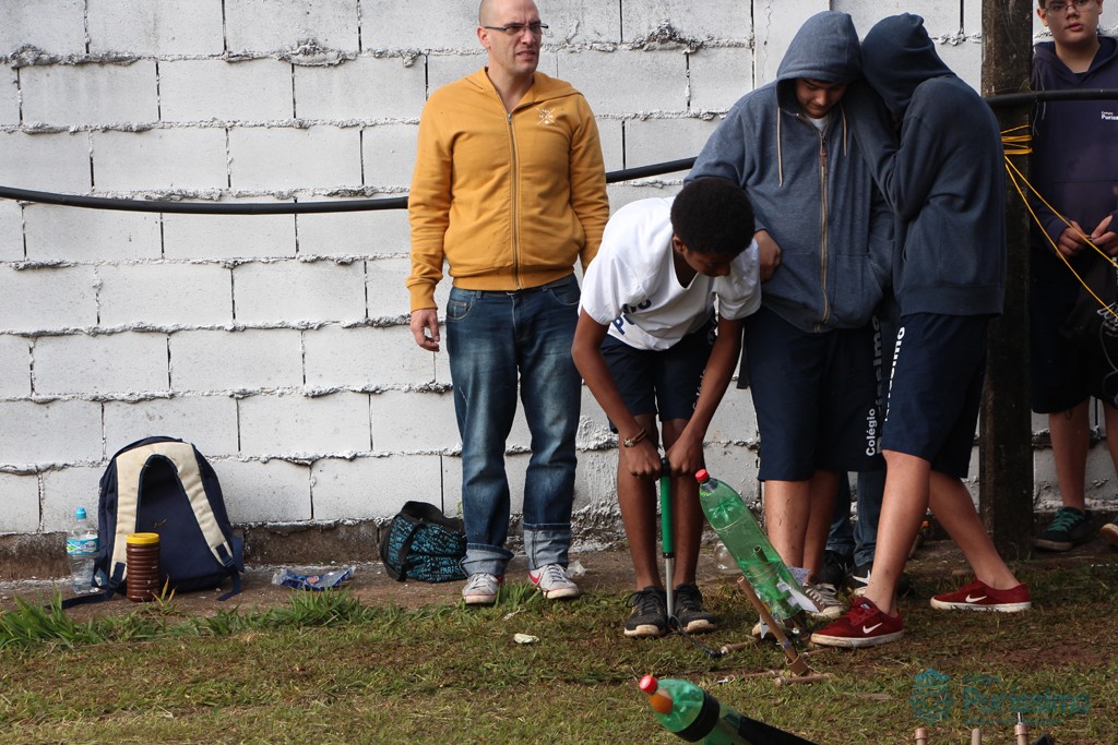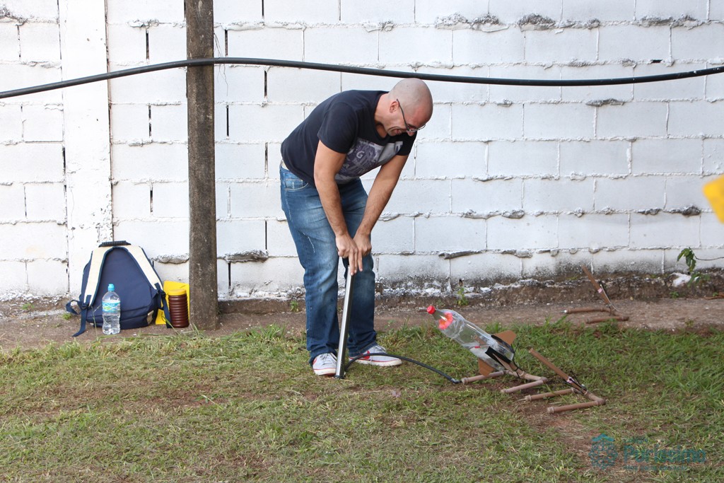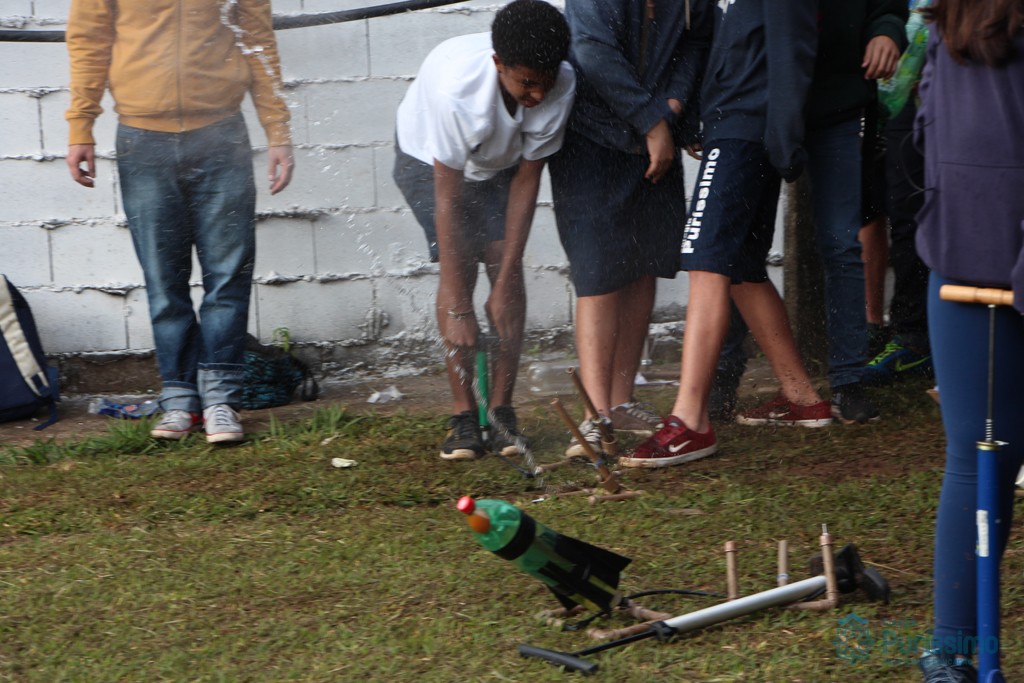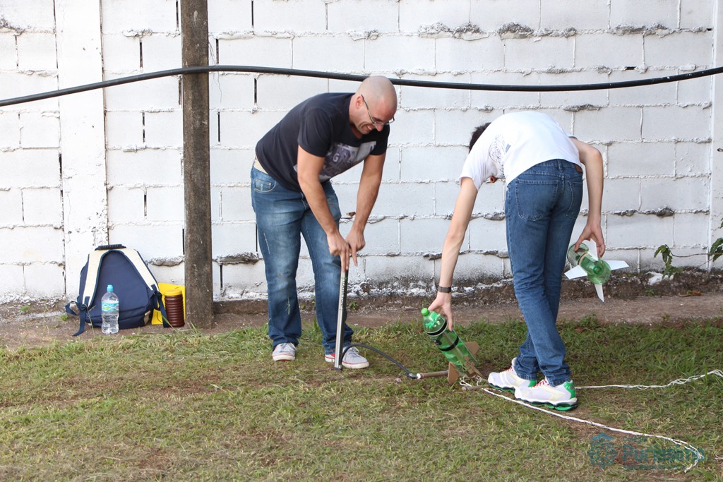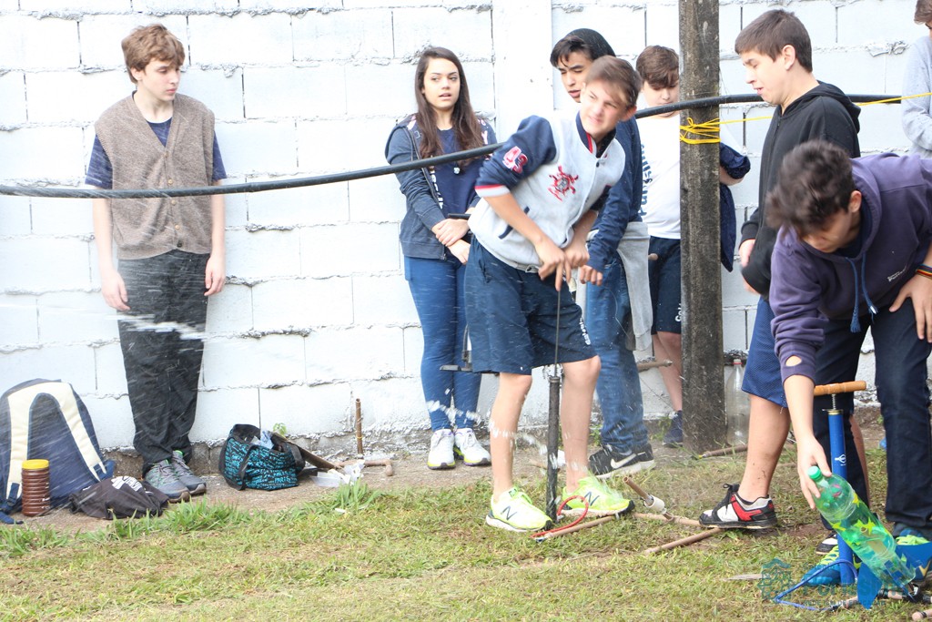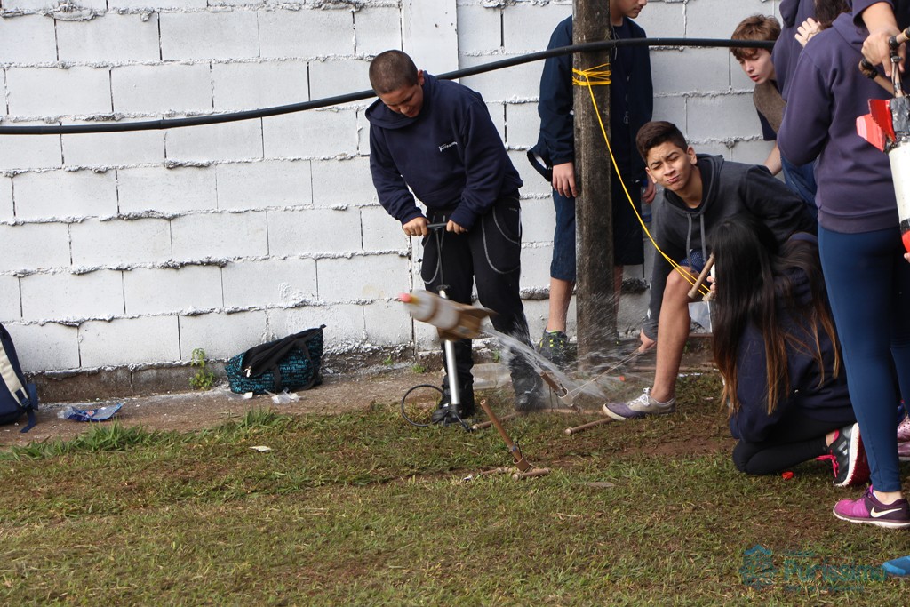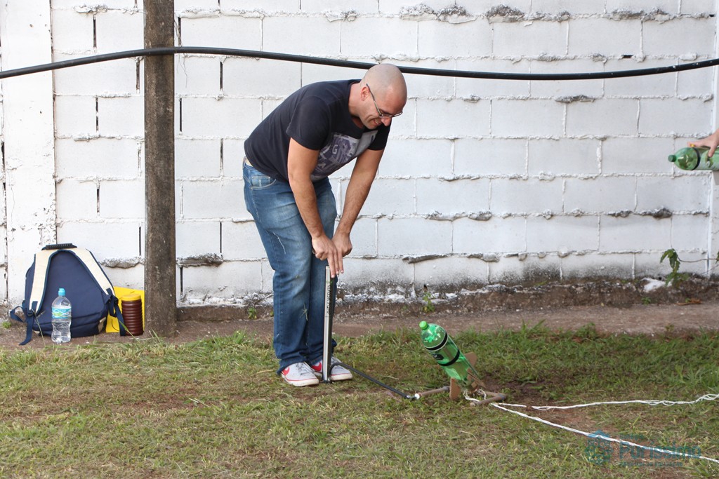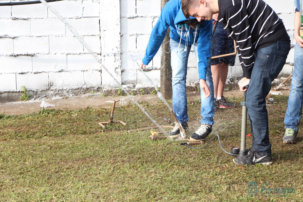 Para lançar os foguetes produzidos com garrafas PET e movidos à água e ar comprimido, os alunos se organizaram em equipes assim realizaram os lançamentos que foram medidos a fim de selecionar os projetos para participar da Mostra Brasileira de Foguetes (MOBFOG).