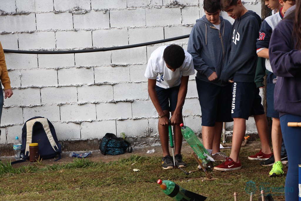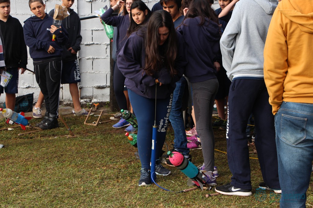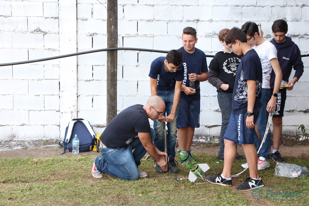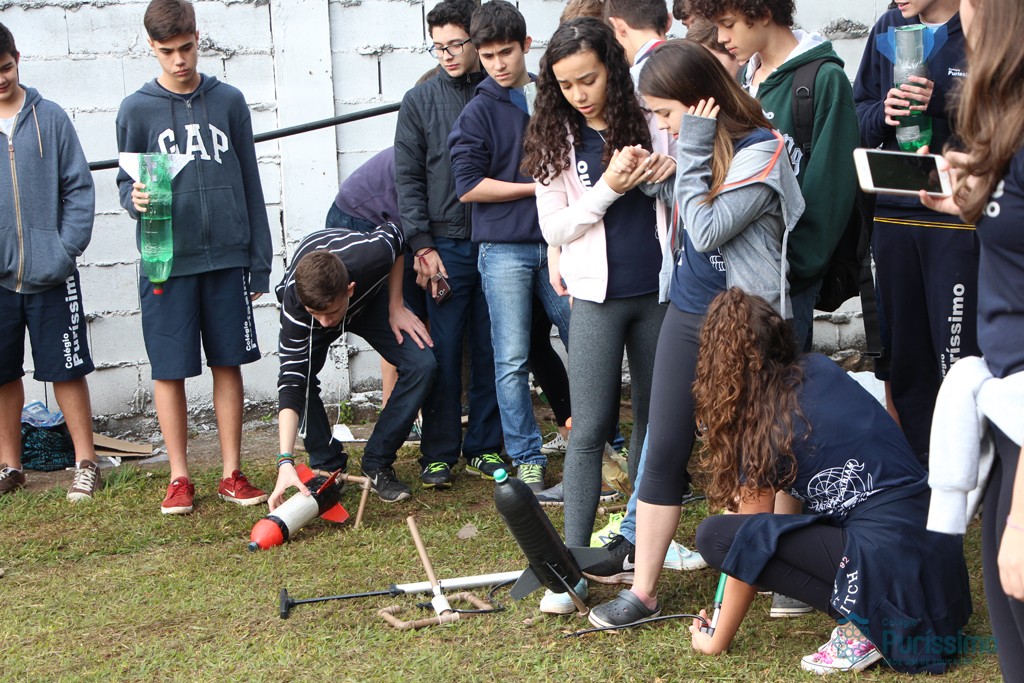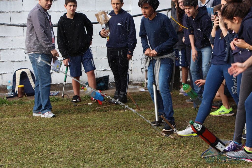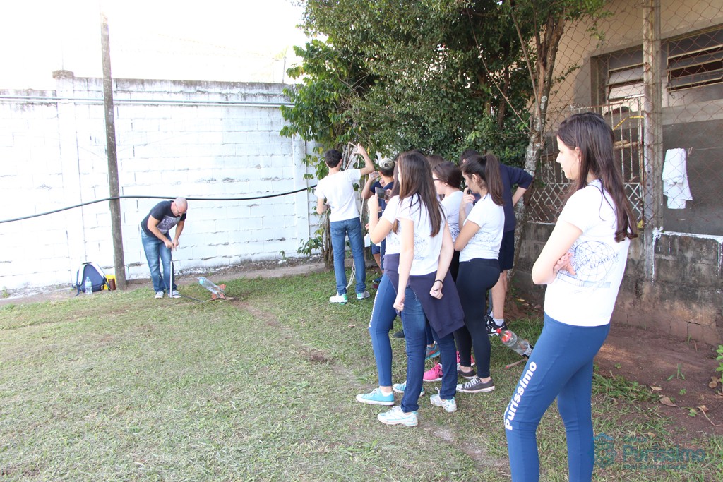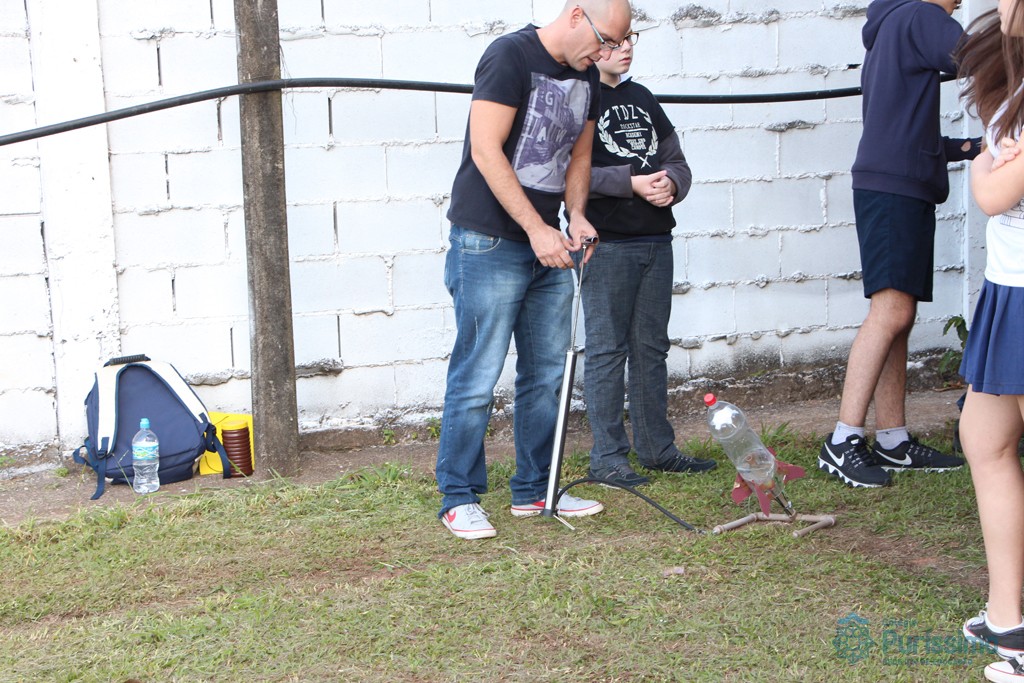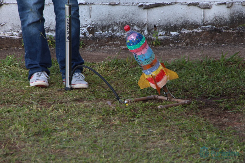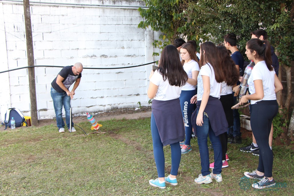 Para lançar os foguetes produzidos com garrafas PET e movidos à água e ar comprimido, os alunos se organizaram em equipes assim realizaram os lançamentos que foram medidos a fim de selecionar os projetos para participar da Mostra Brasileira de Foguetes (MOBFOG).