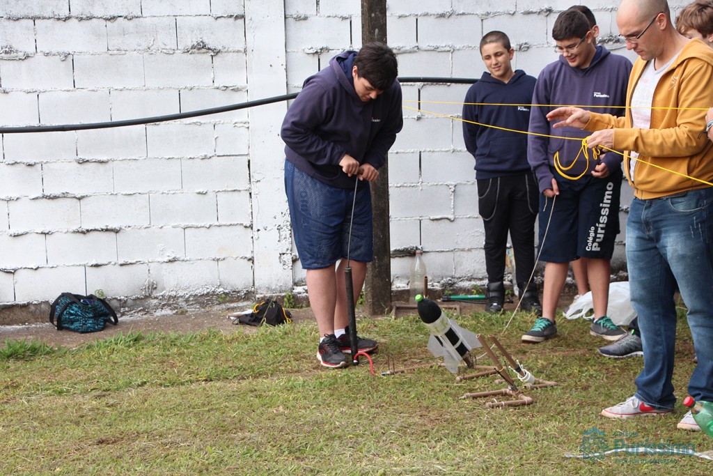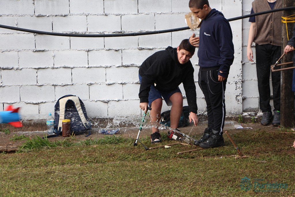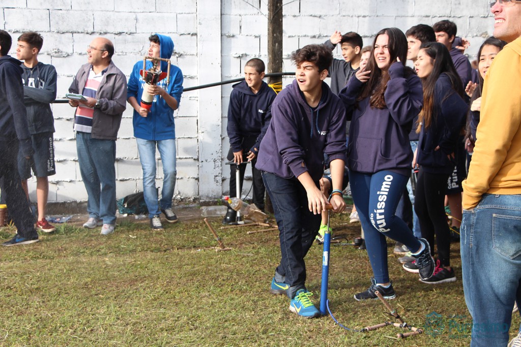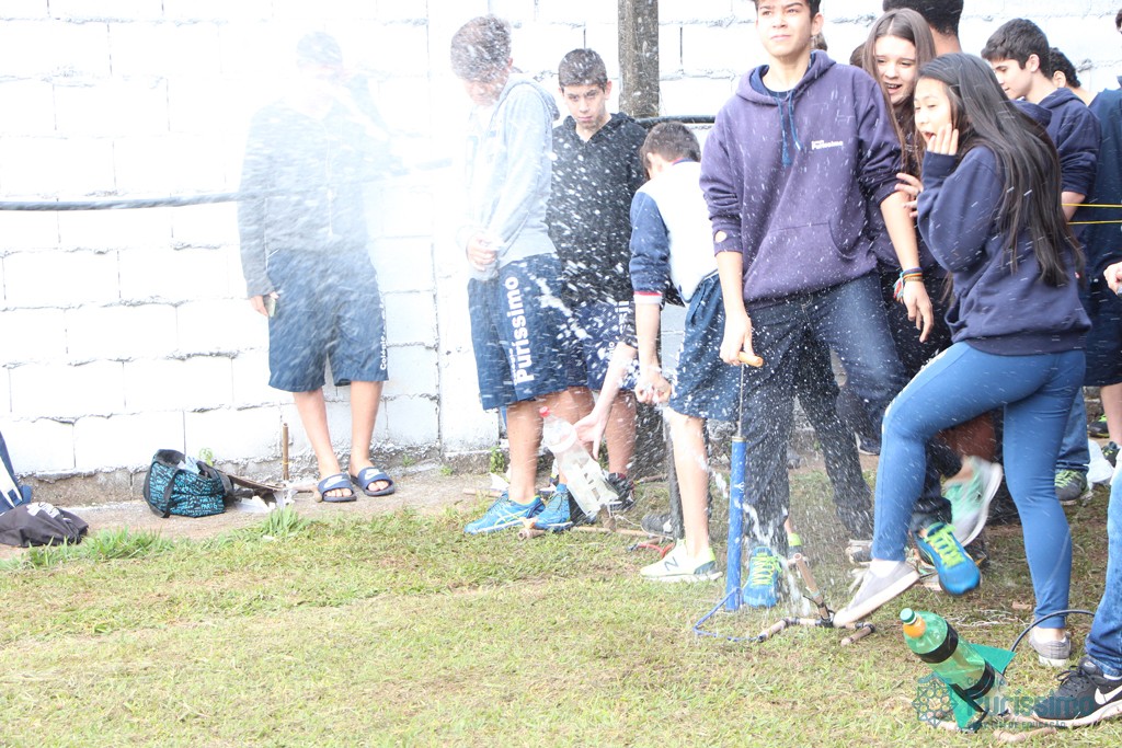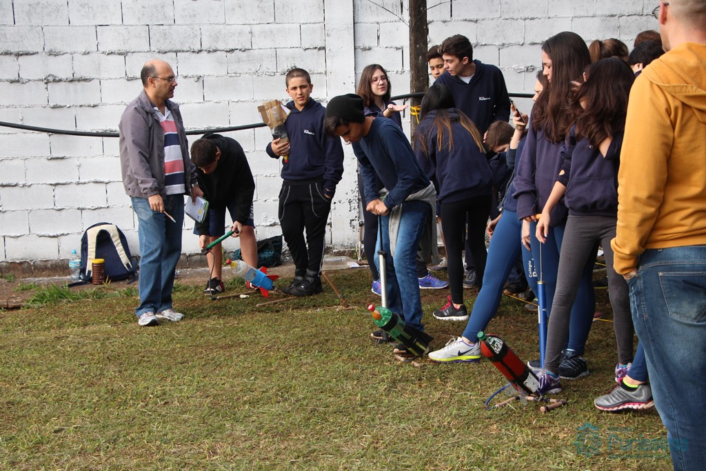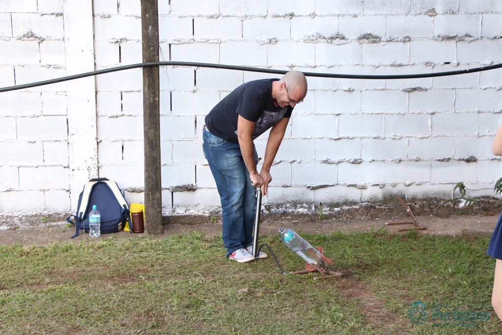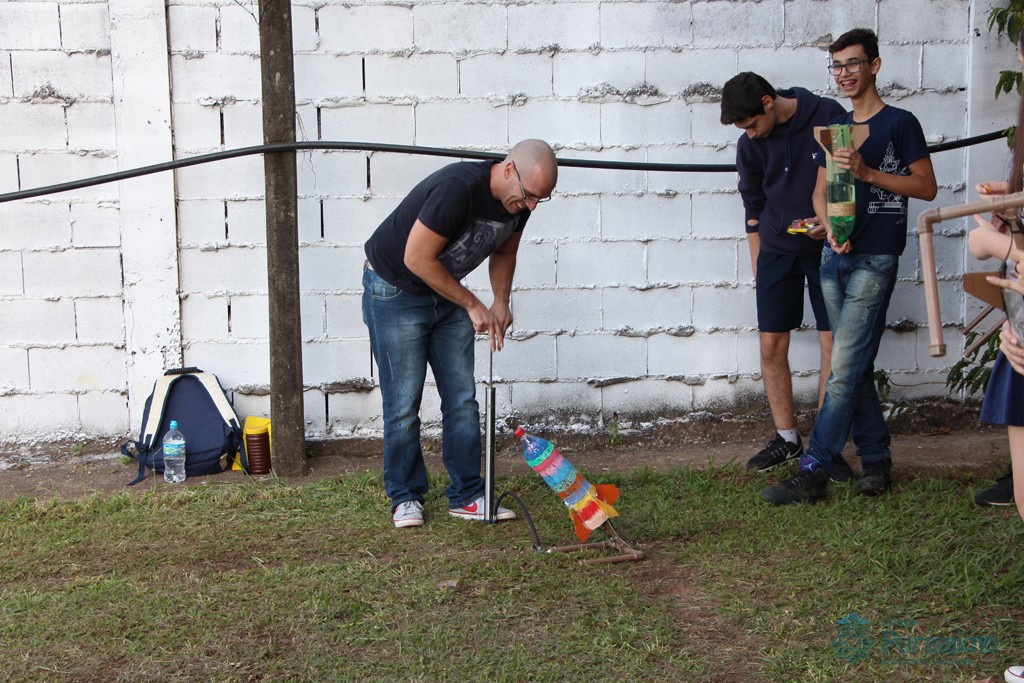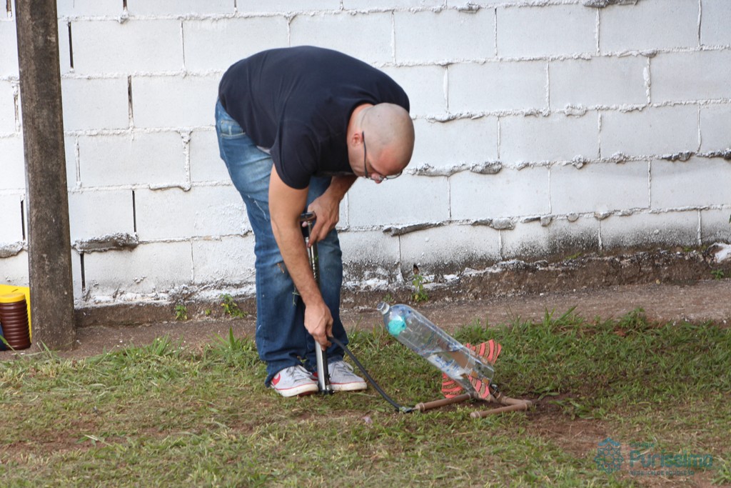 Para lançar os foguetes produzidos com garrafas PET e movidos à água e ar comprimido, os alunos se organizaram em equipes assim realizaram os lançamentos que foram medidos a fim de selecionar os projetos para participar da Mostra Brasileira de Foguetes (MOBFOG).