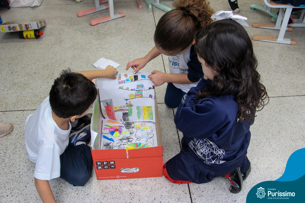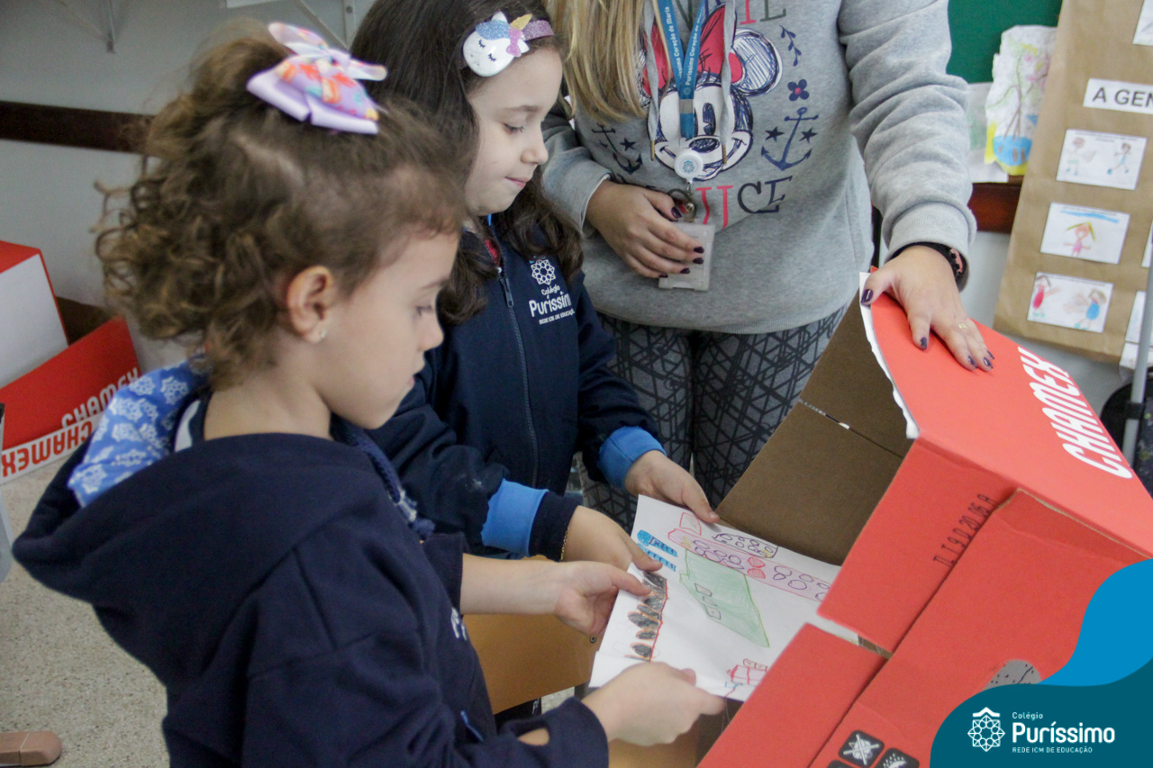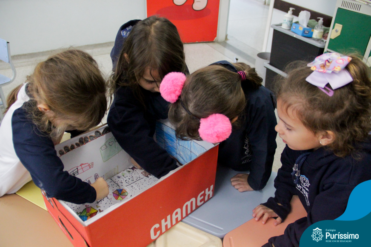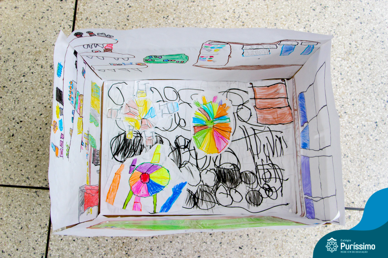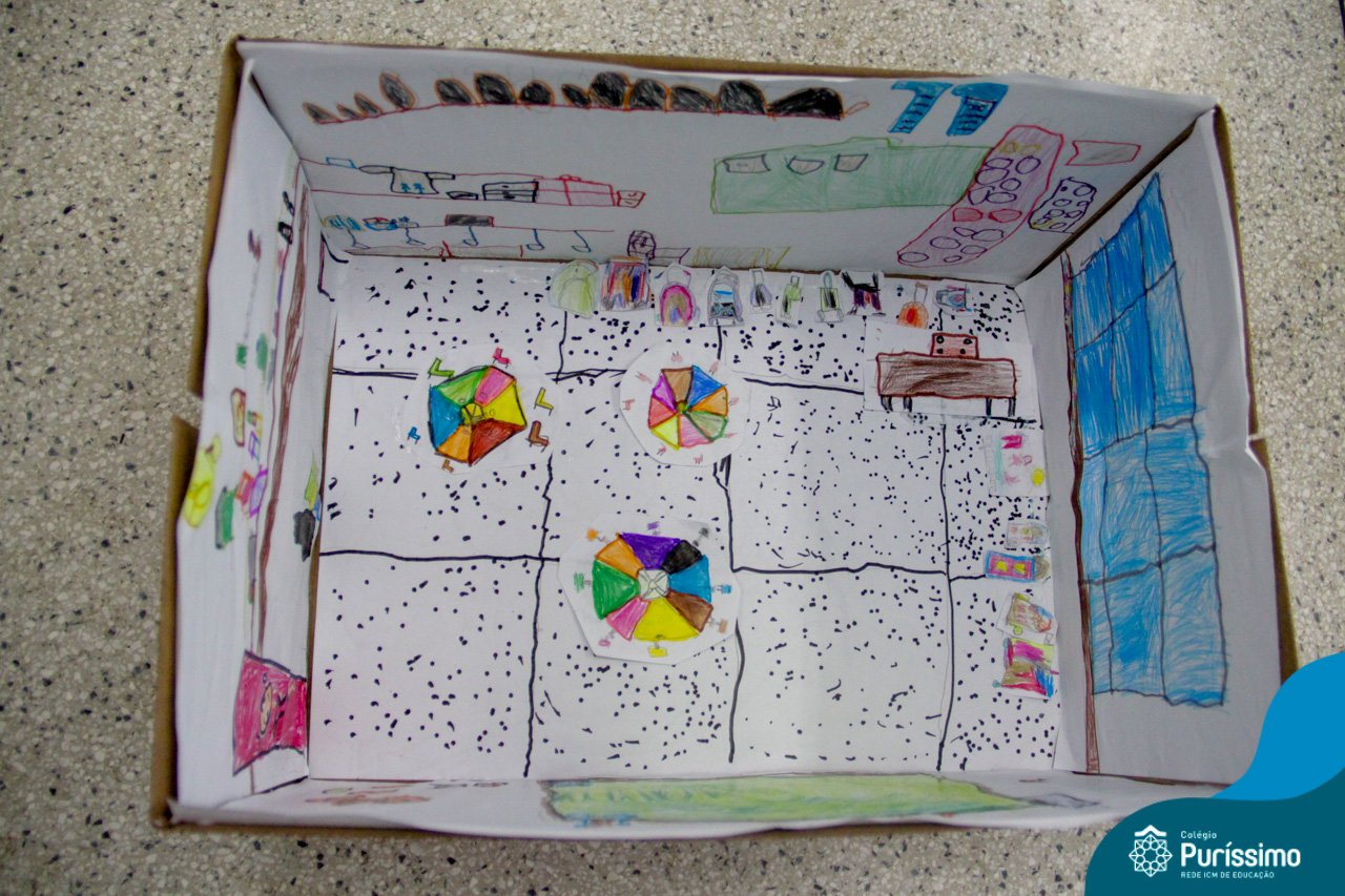 Para isso, iniciaram um projeto com iPads utilizando o jogo “Toca Builders”, onde as crianças tiveram que tentar reproduzir a sala de aula. Após a construção digital, partiram para a construção da maquete 2D onde as crianças divididas em grupos desenharam a sala. A terceira fase foi a construção da maquete com sucata e materiais que tinham na sala, como massinha, tinta e brinquedos.