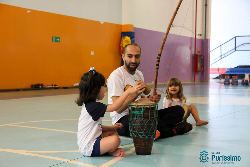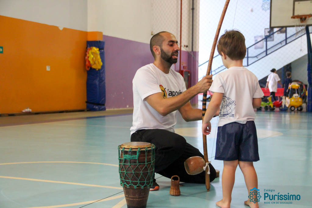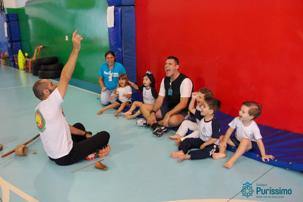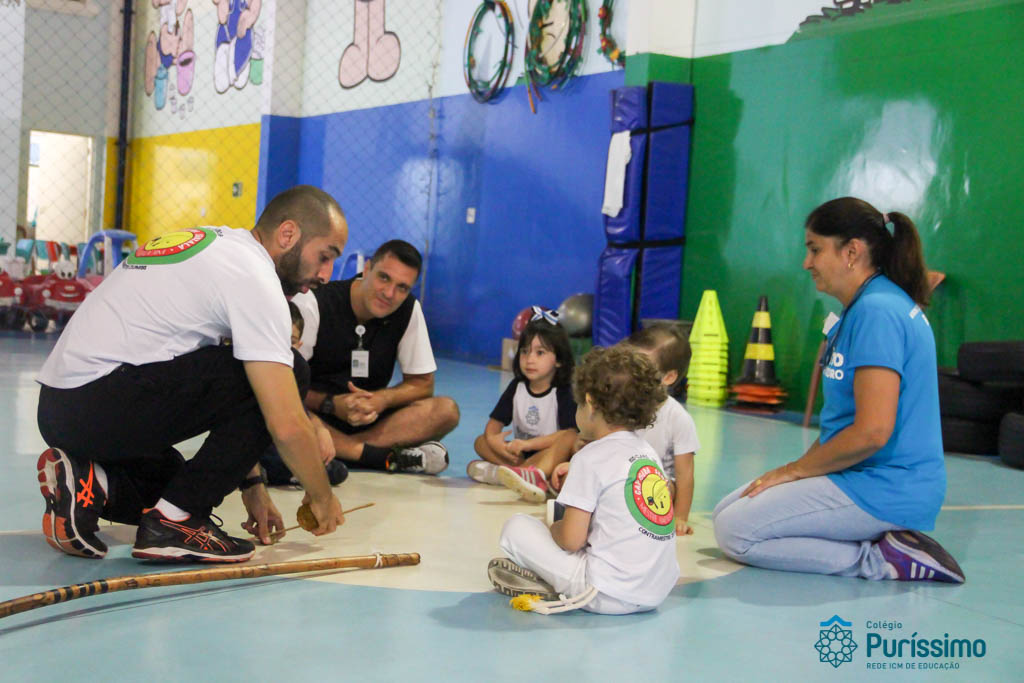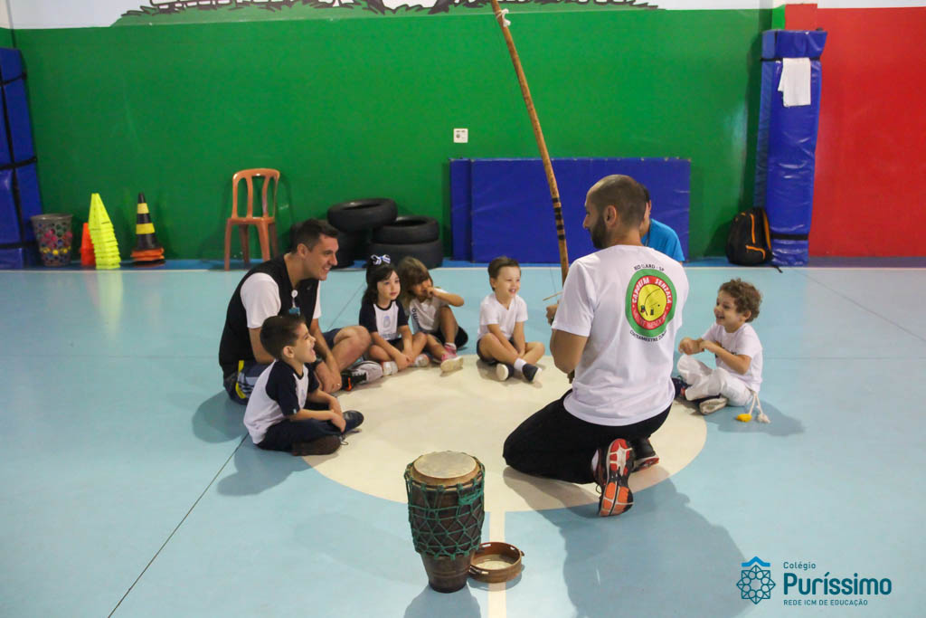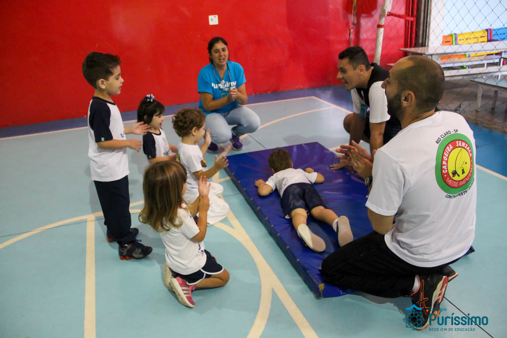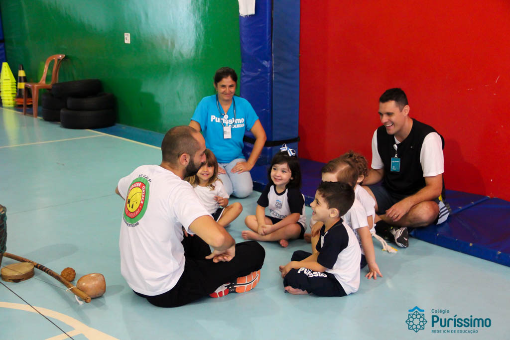 Ontem, 21/03, as crianças do Maternal II da manhã, juntamente com o Tio Lú e a Tia Fran, receberam a visita do Prof. Thercio, pai do aluno Antônio e que é capoeirista.