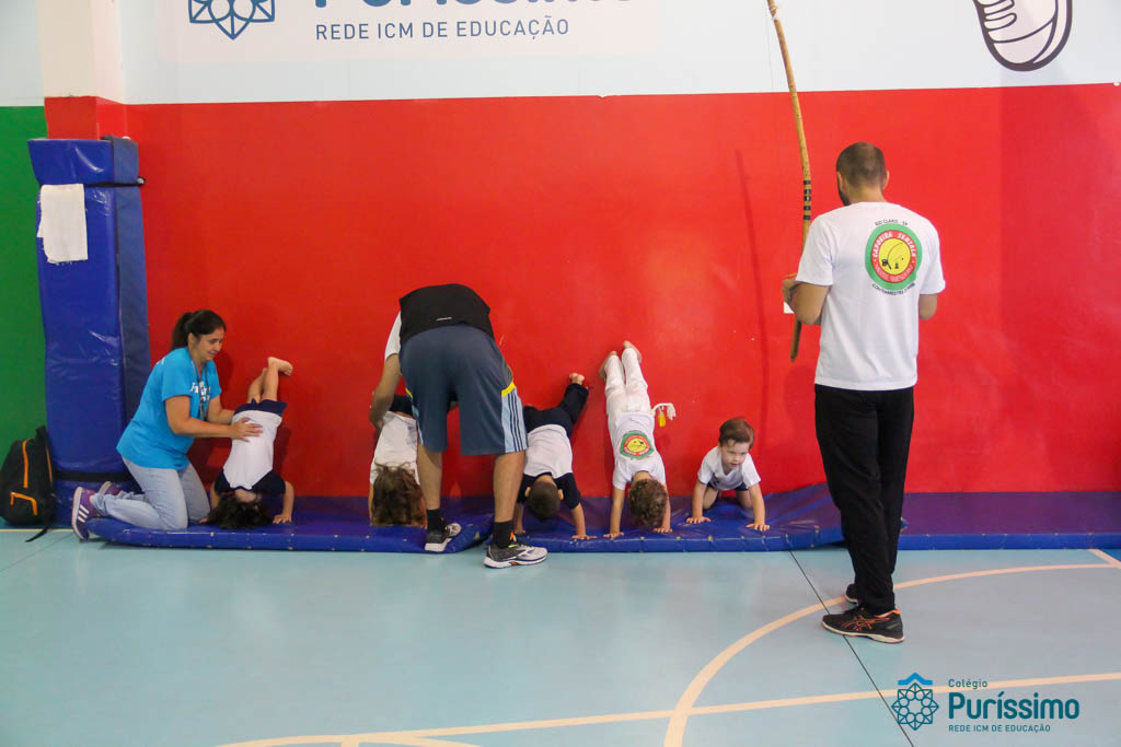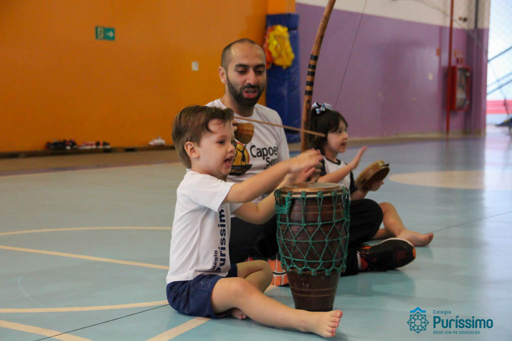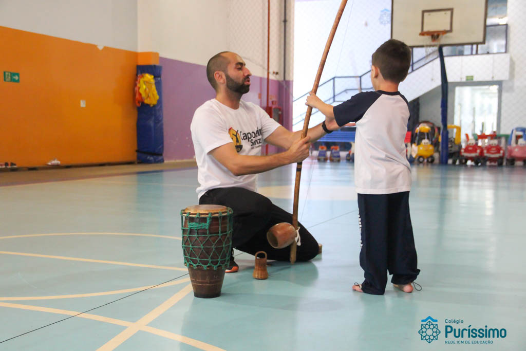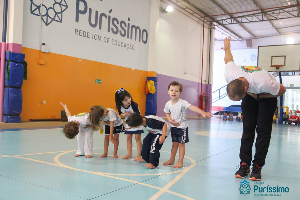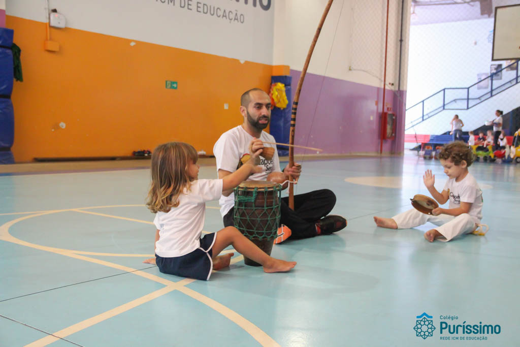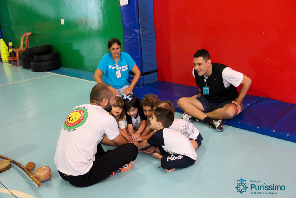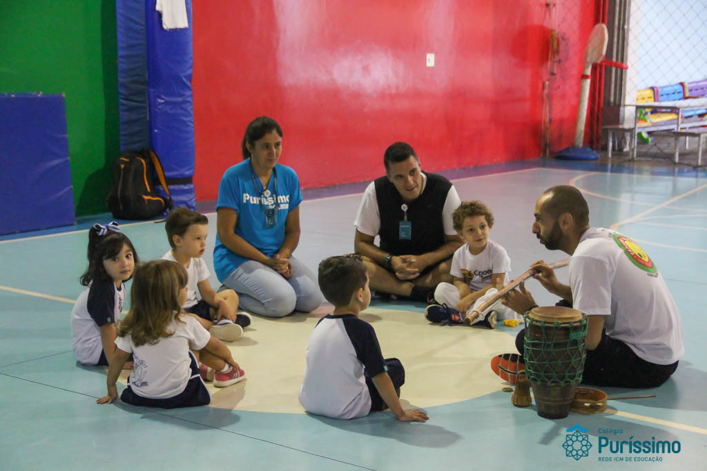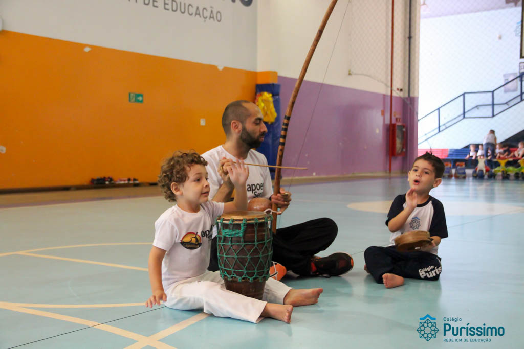 Ontem, 21/03, as crianças do Maternal II da manhã, juntamente com o Tio Lú e a Tia Fran, receberam a visita do Prof. Thercio, pai do aluno Antônio e que é capoeirista.
