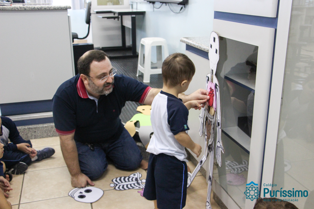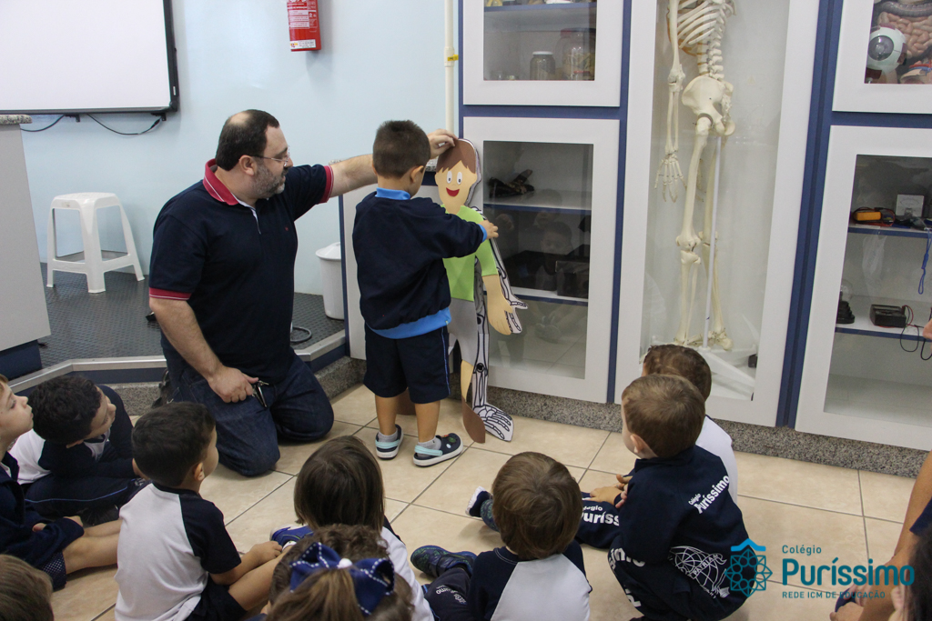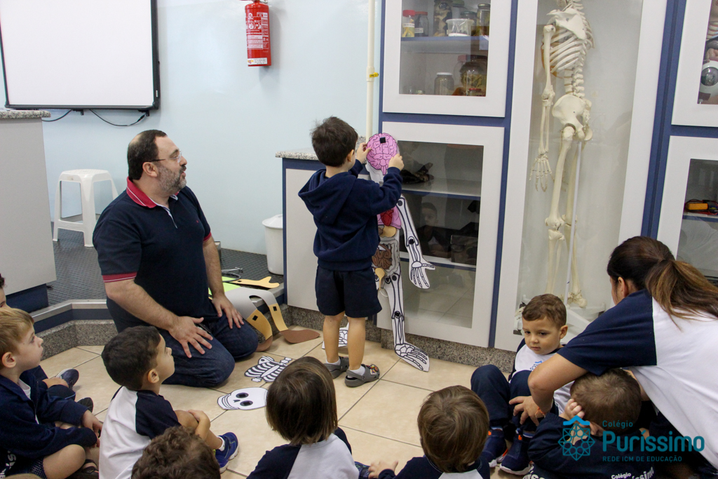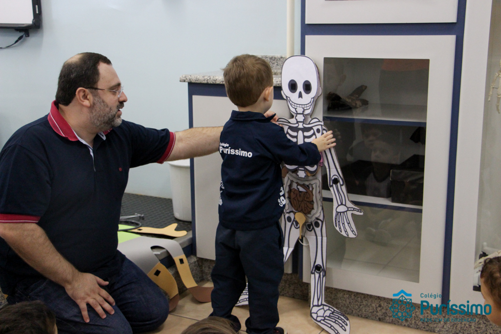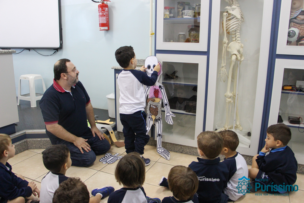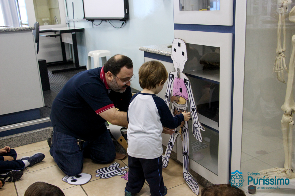 Em maio recebemos a visita do pai do Arthur (Maternal 2 manhã), o Dr. Marcelo Chiode Bueno. As crianças fizeram uma visita ao laboratório de Biologia do Ensino Médio e conversaram sobre o corpo humano, elas observaram e ajudaram a montar os órgãos em um boneco e o esqueleto humano.