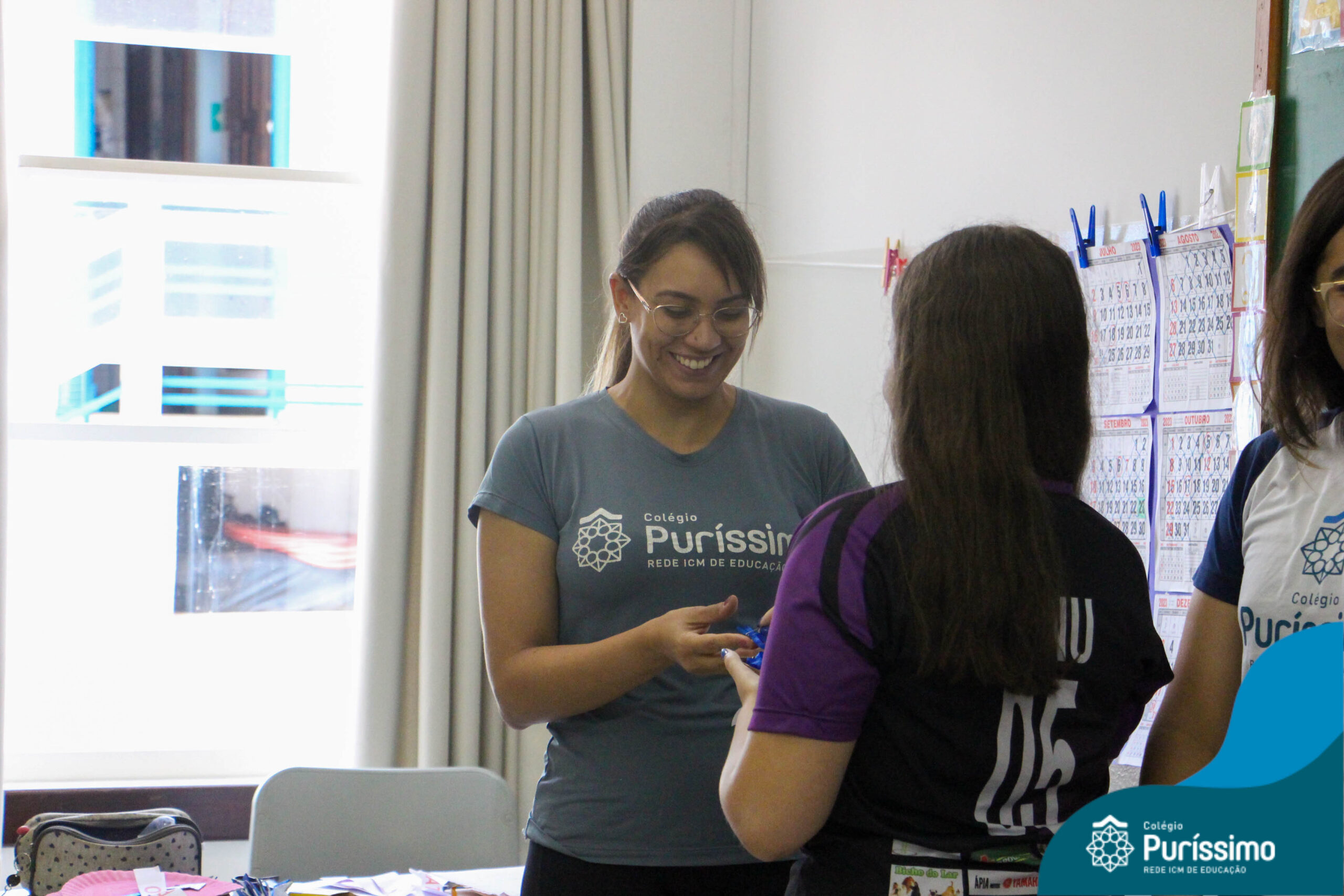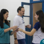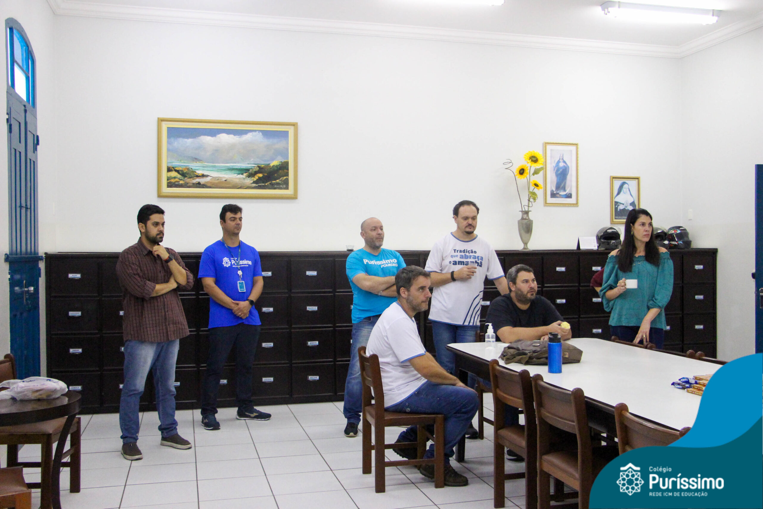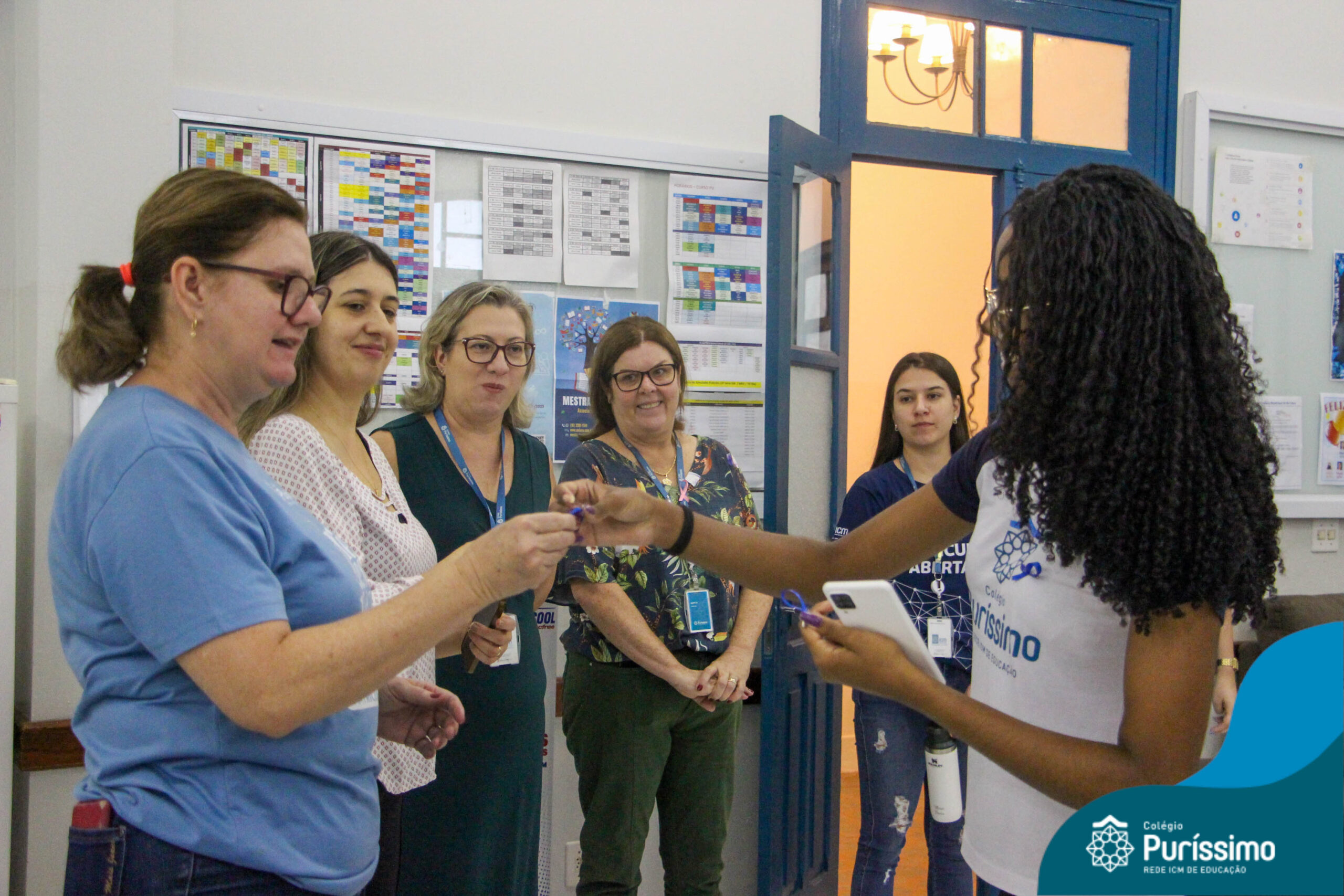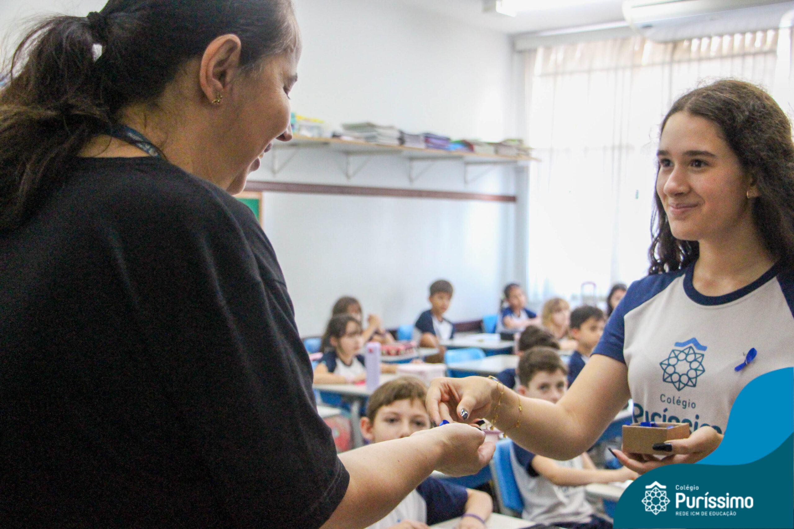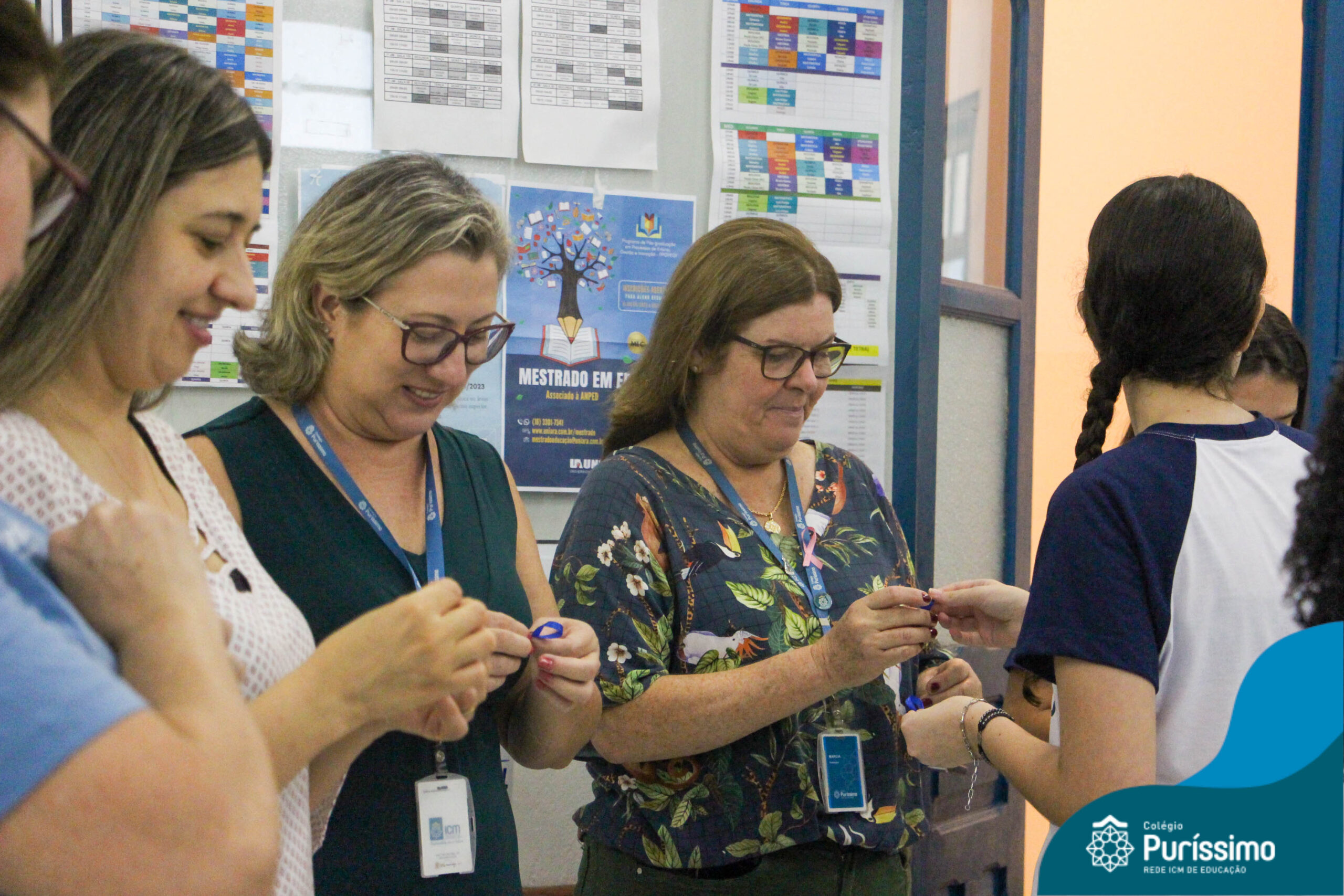 Ao final, entregaram para cada professor e colaborador um laço azul, para que a campanha deste mês seja sempre lembrada.