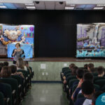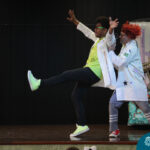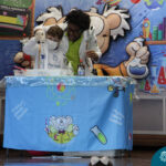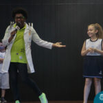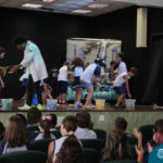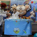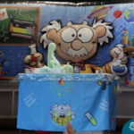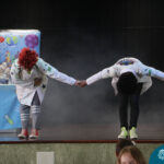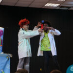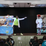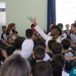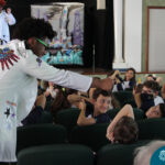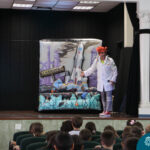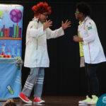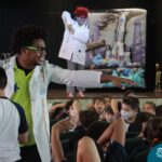 A performance possui caráter interativo e contou com a participação dos estudantes, que auxiliaram os atores nas experiências realizadas.
