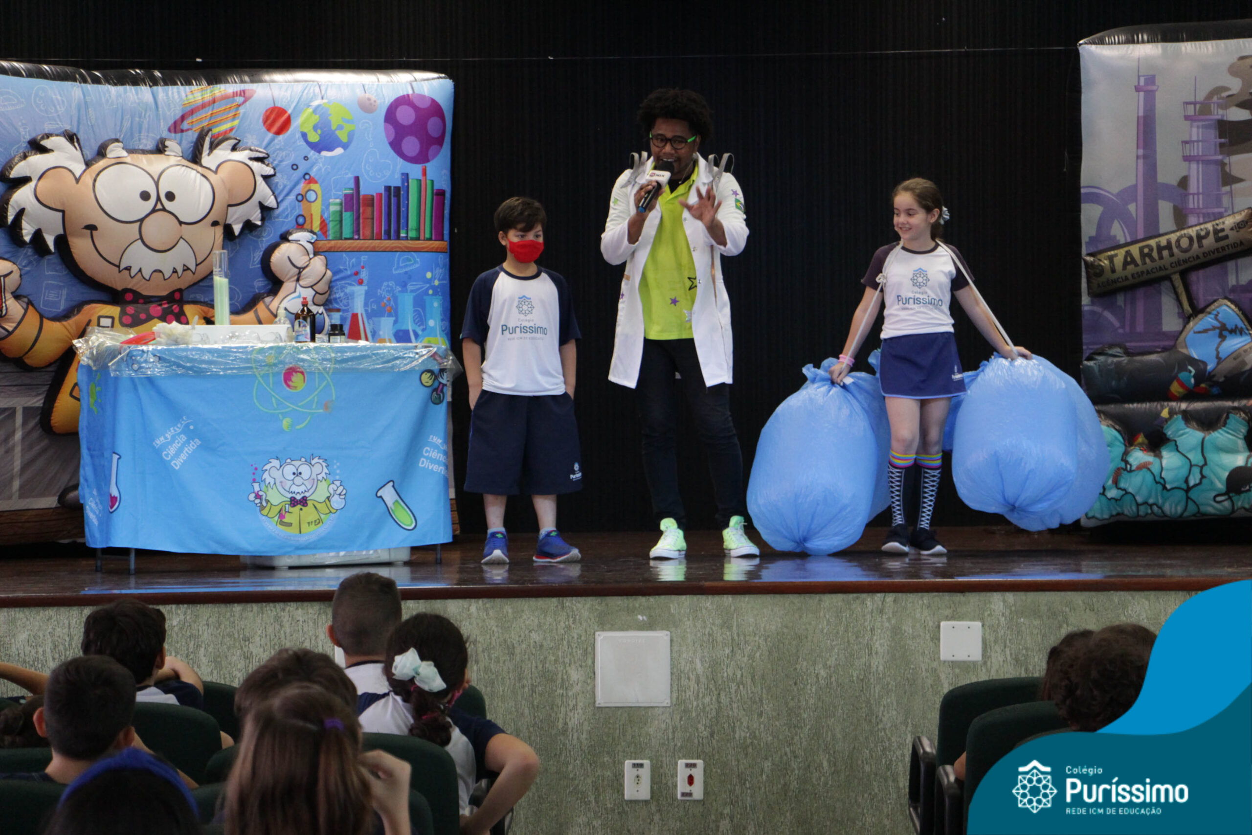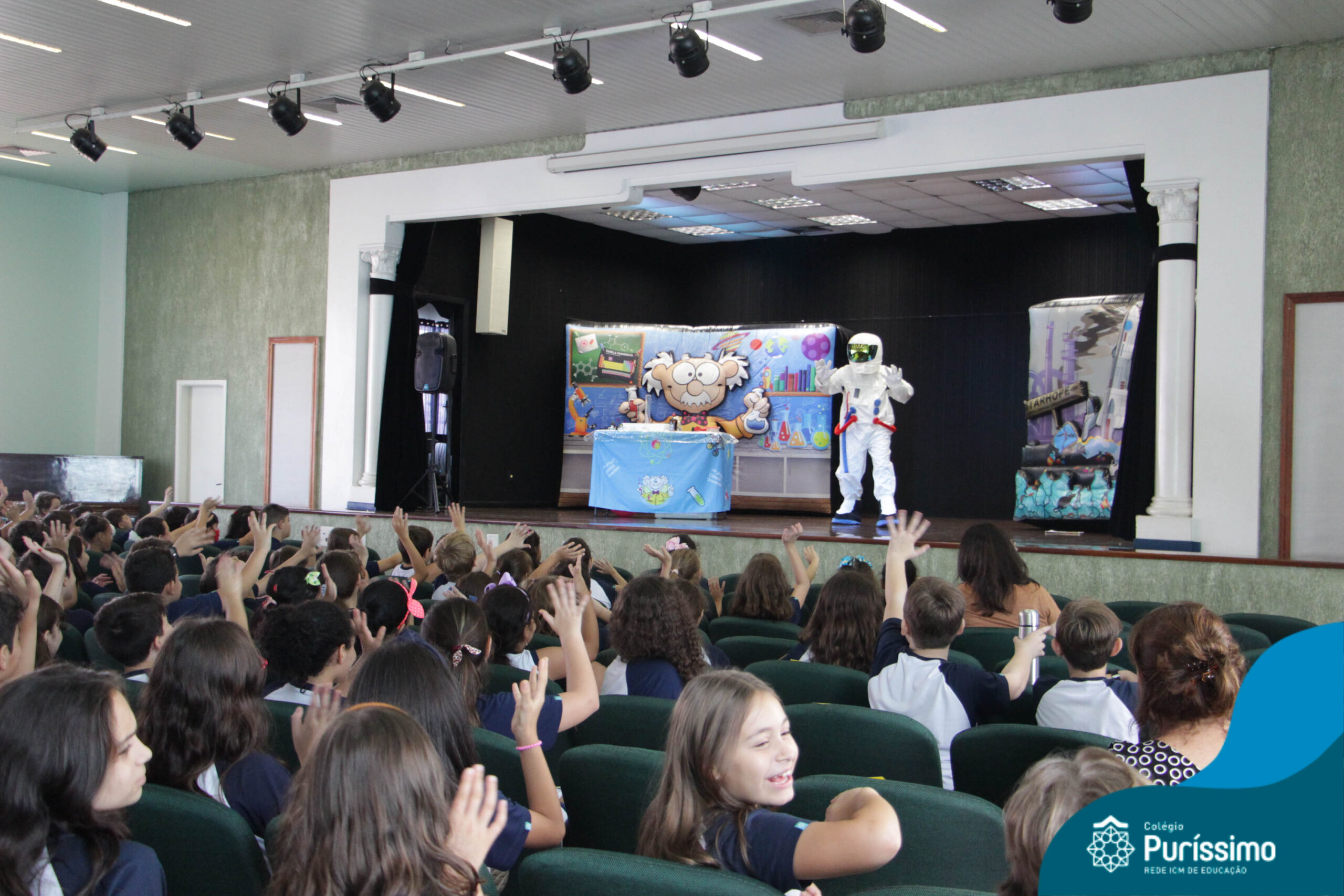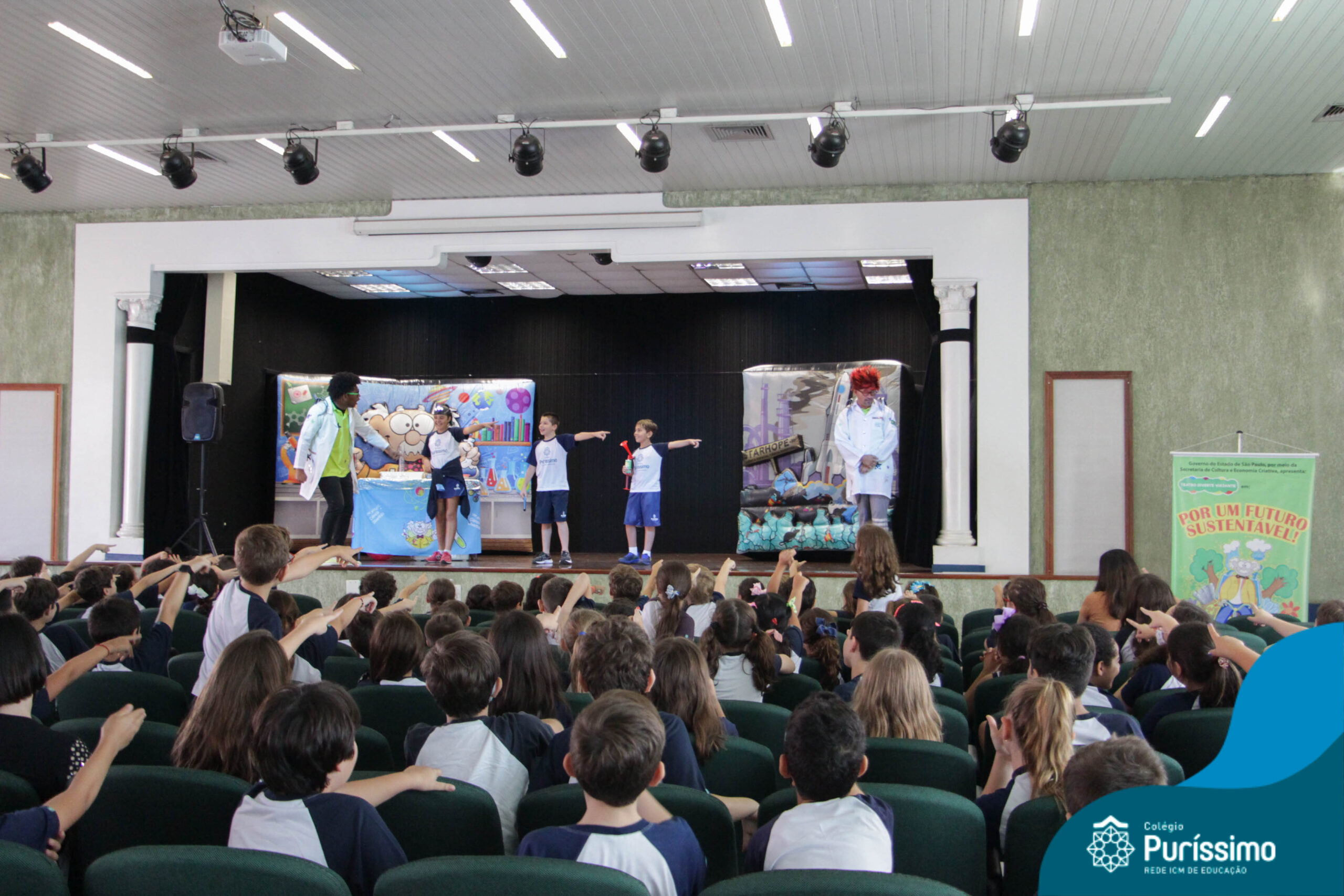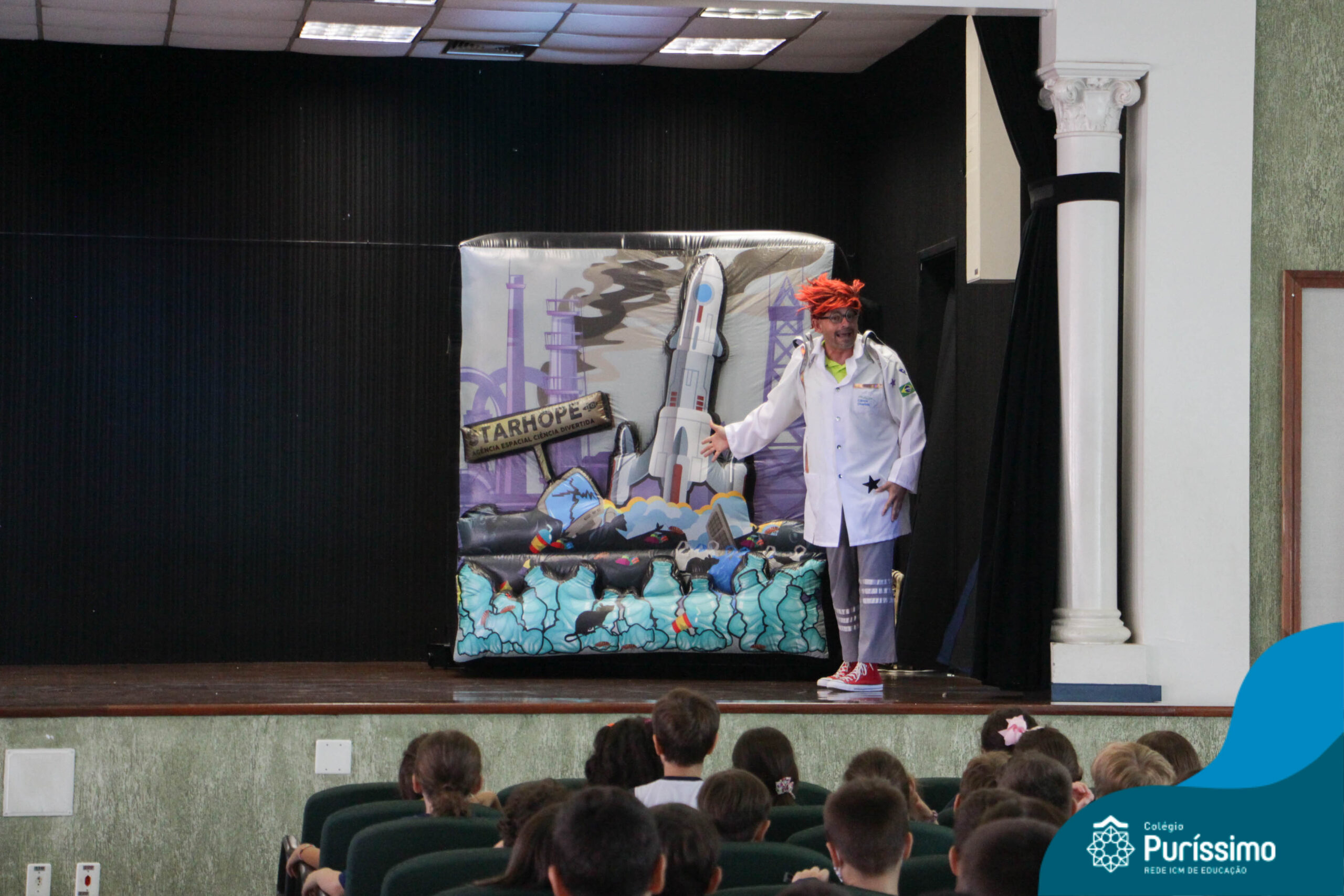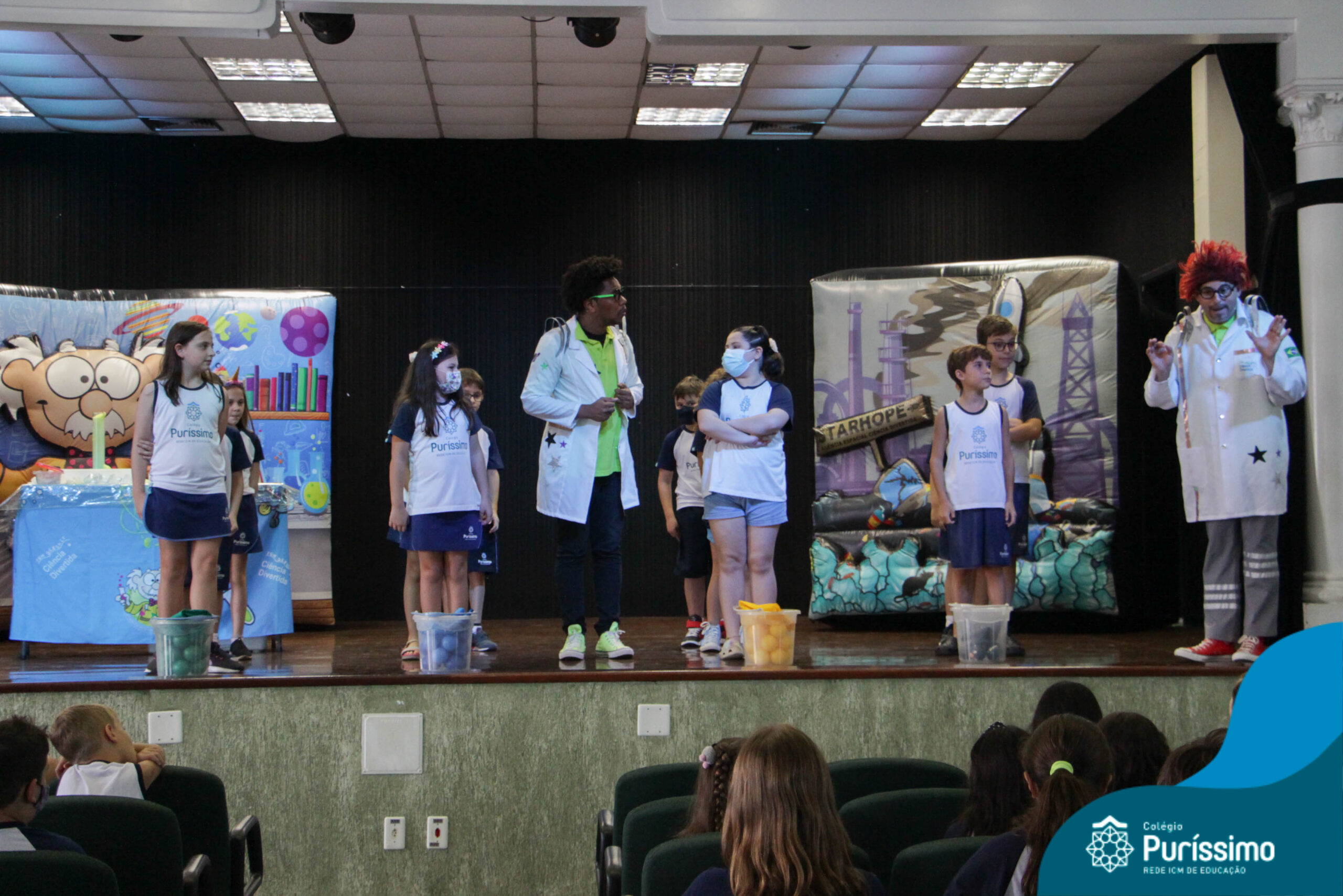 Os alunos do 3º aos 5º anos do EF Anos Iniciais, da manhã e tarde, tiveram a oportunidade de assistir a peça “Por um futuro sustentável”, a qual conta a história de dois cientistas do futuro que voltam ao passado para alertar a população sobre os problemas que serão causados pelo consumo excessivo de recursos naturais no presente.