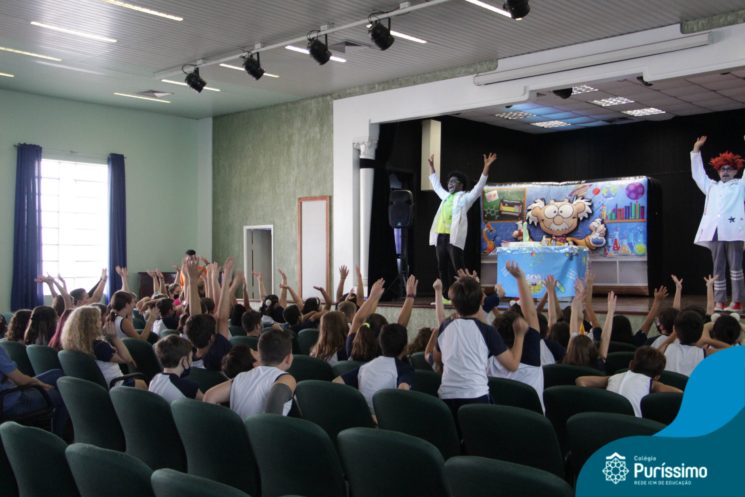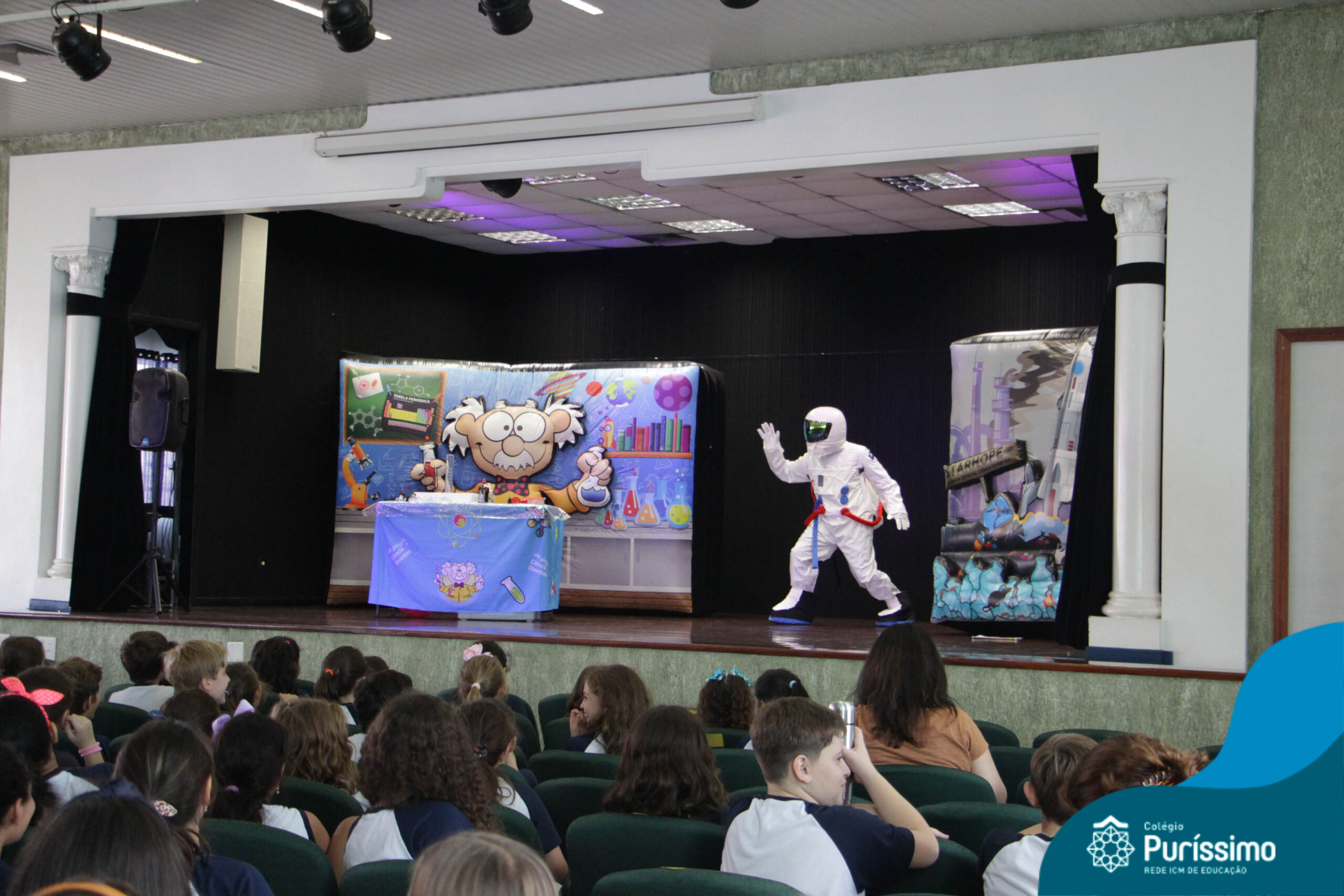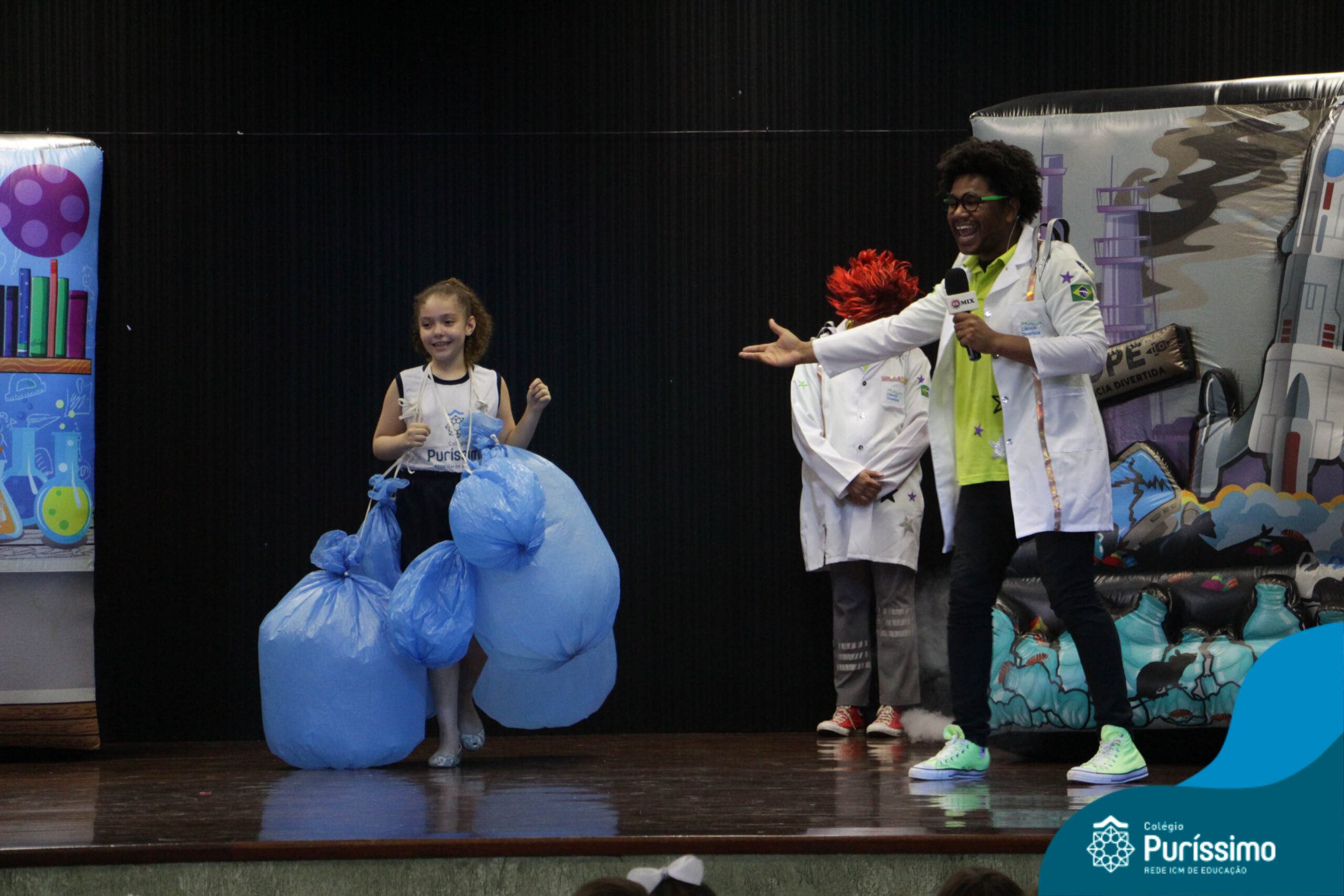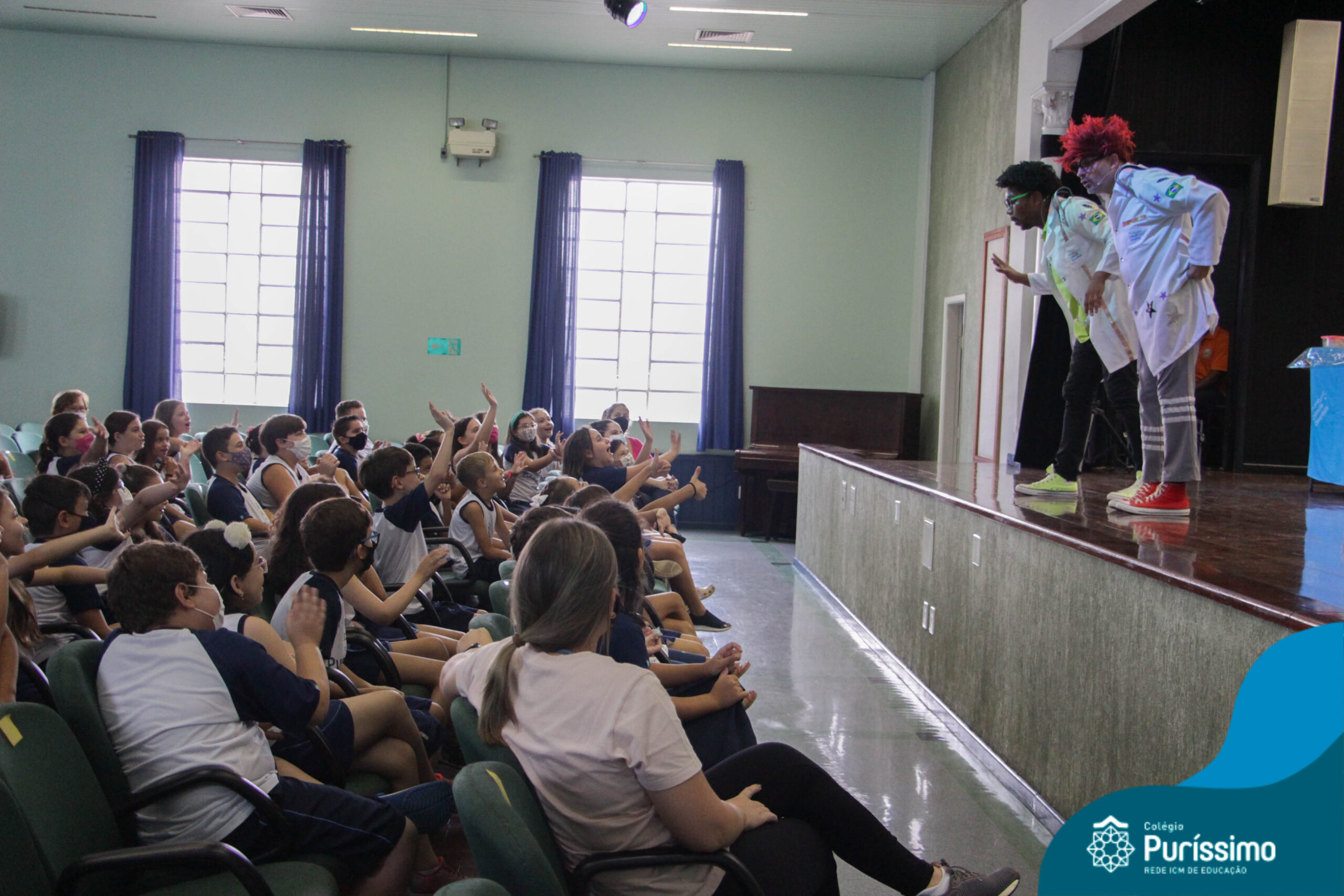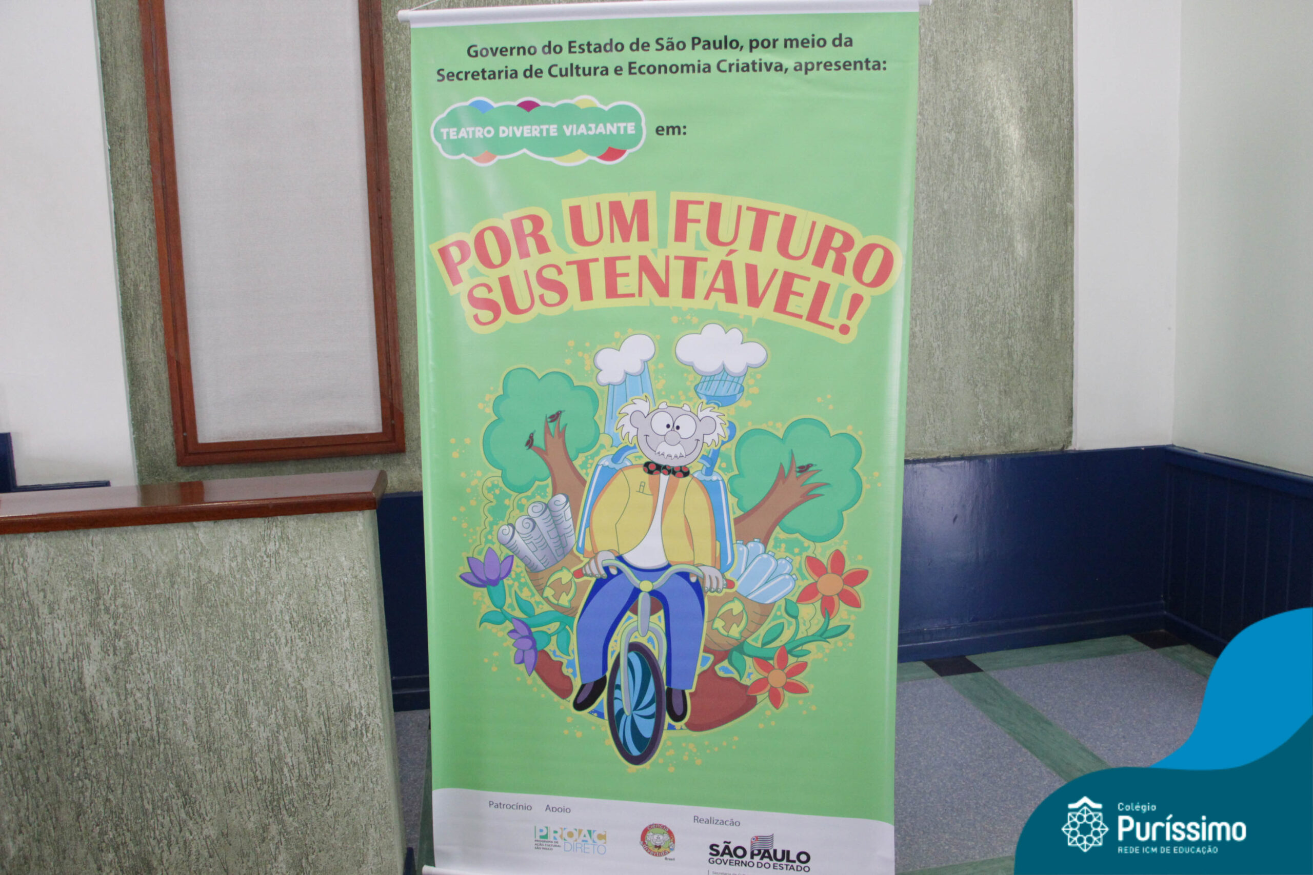 Os alunos do 3º aos 5º anos do EF Anos Iniciais, da manhã e tarde, tiveram a oportunidade de assistir a peça “Por um futuro sustentável”, a qual conta a história de dois cientistas do futuro que voltam ao passado para alertar a população sobre os problemas que serão causados pelo consumo excessivo de recursos naturais no presente.