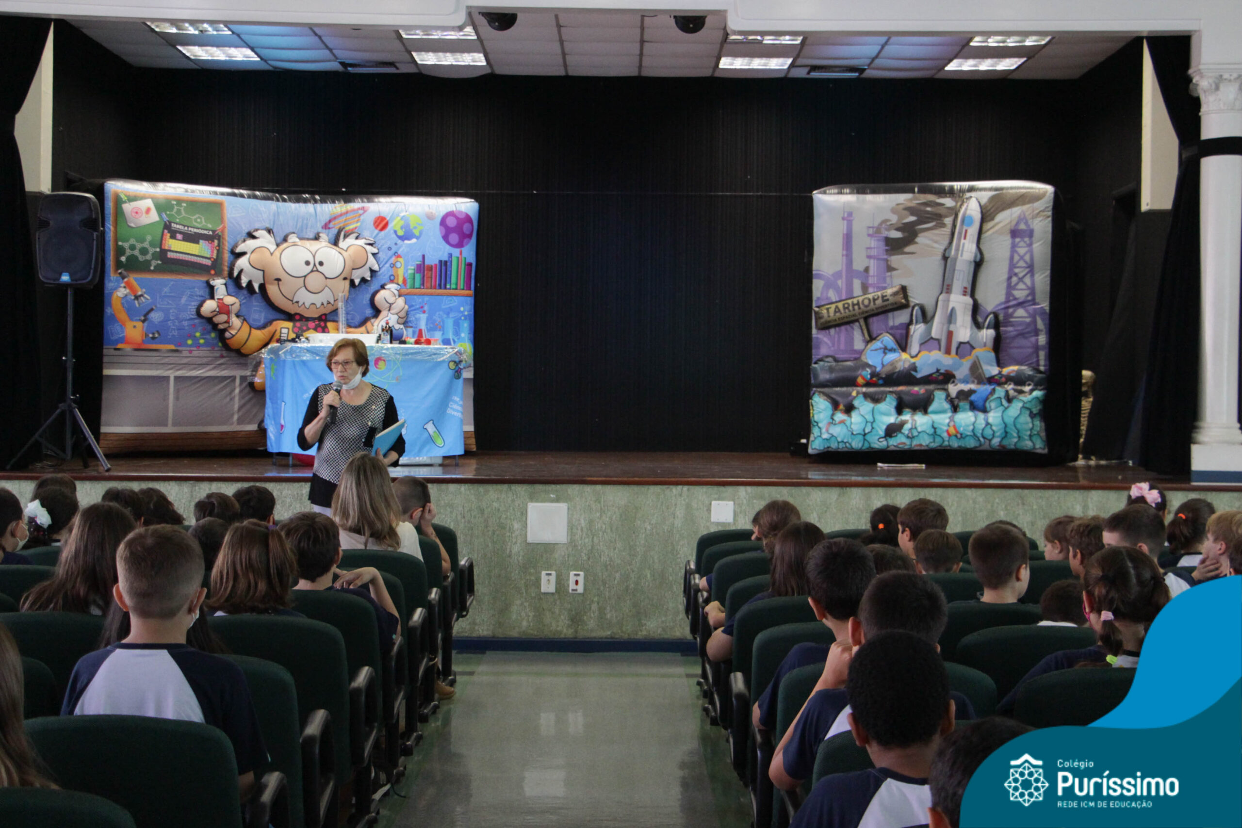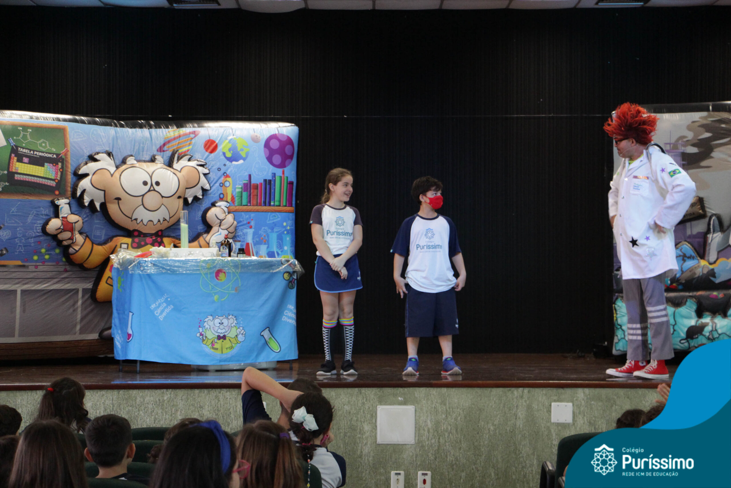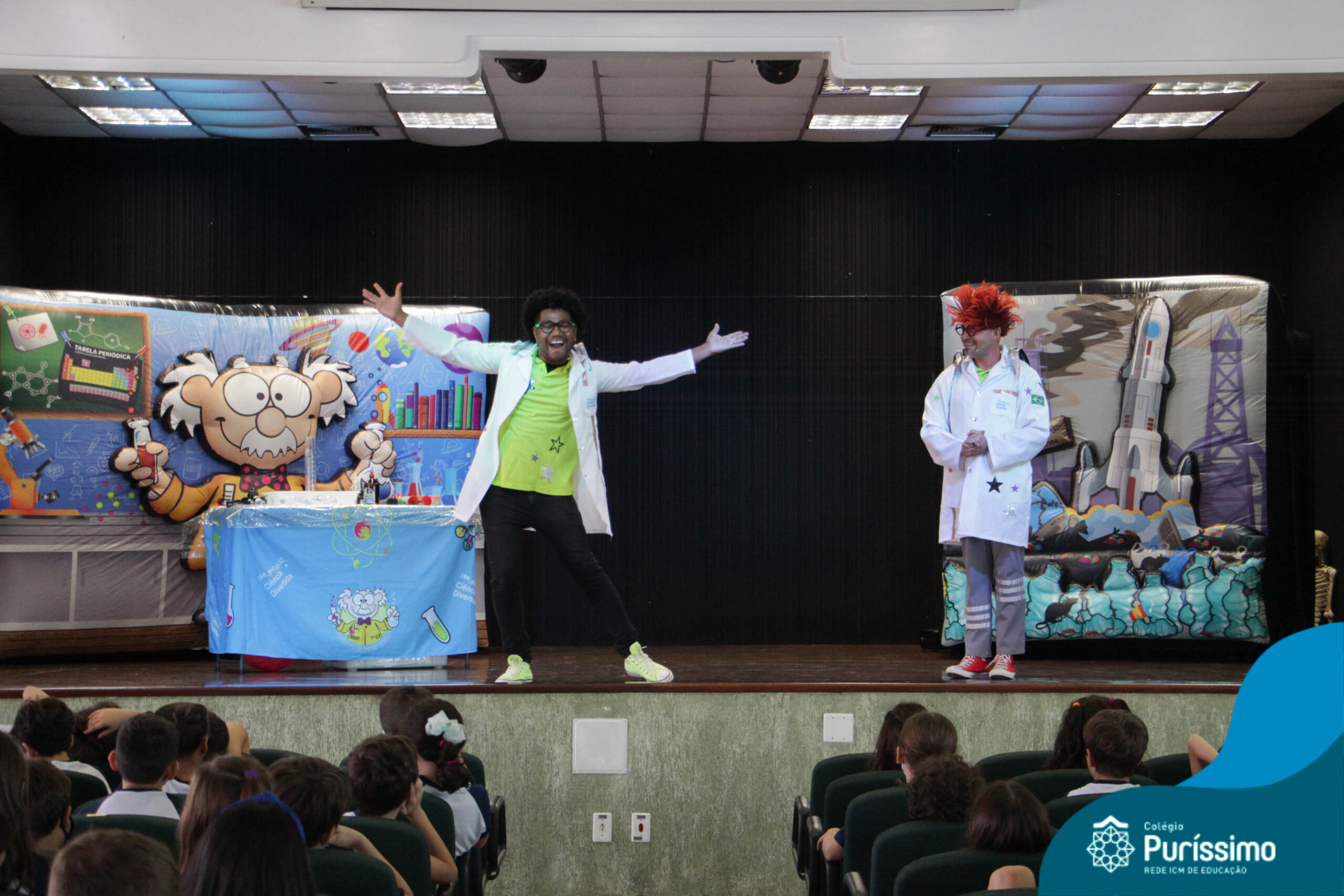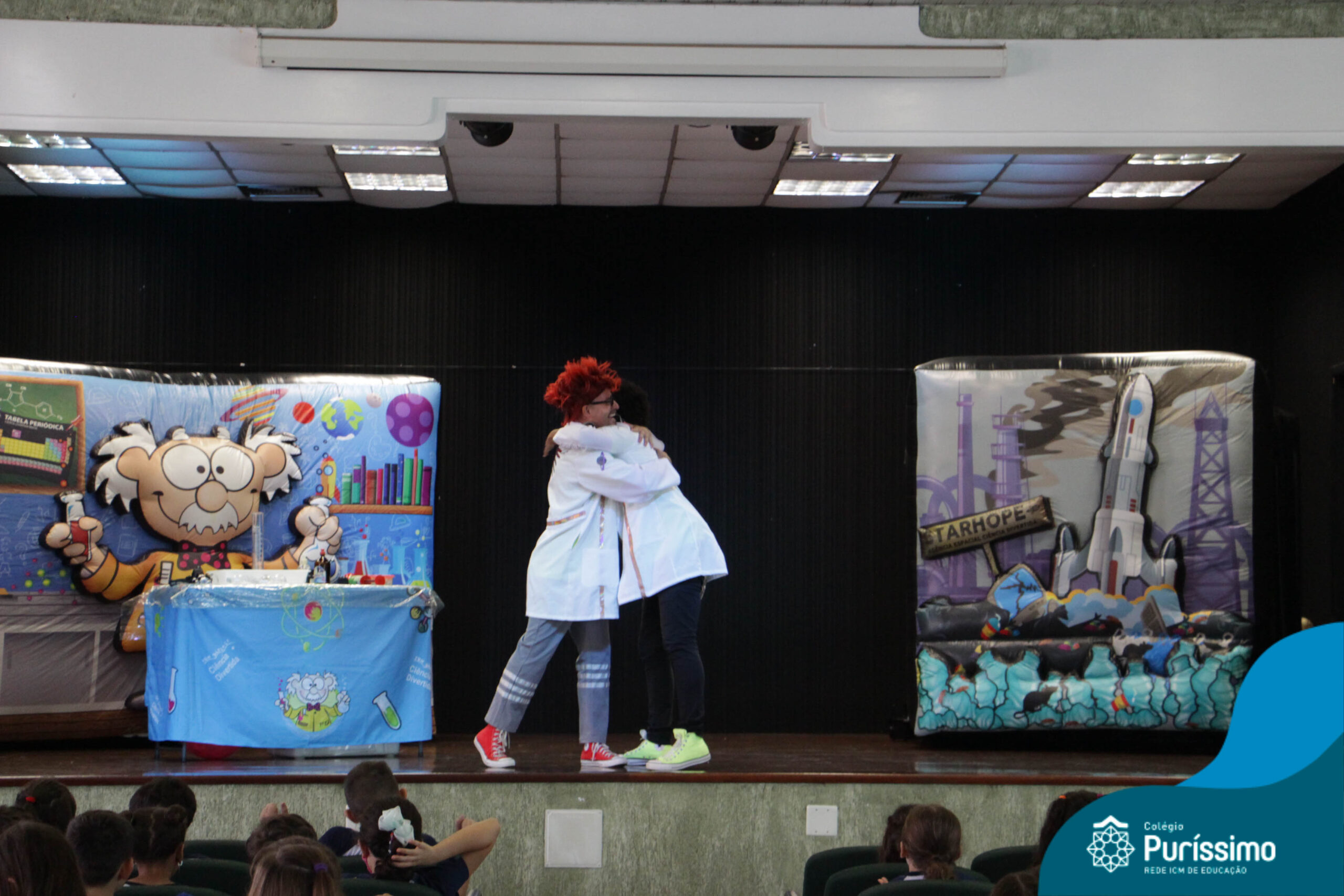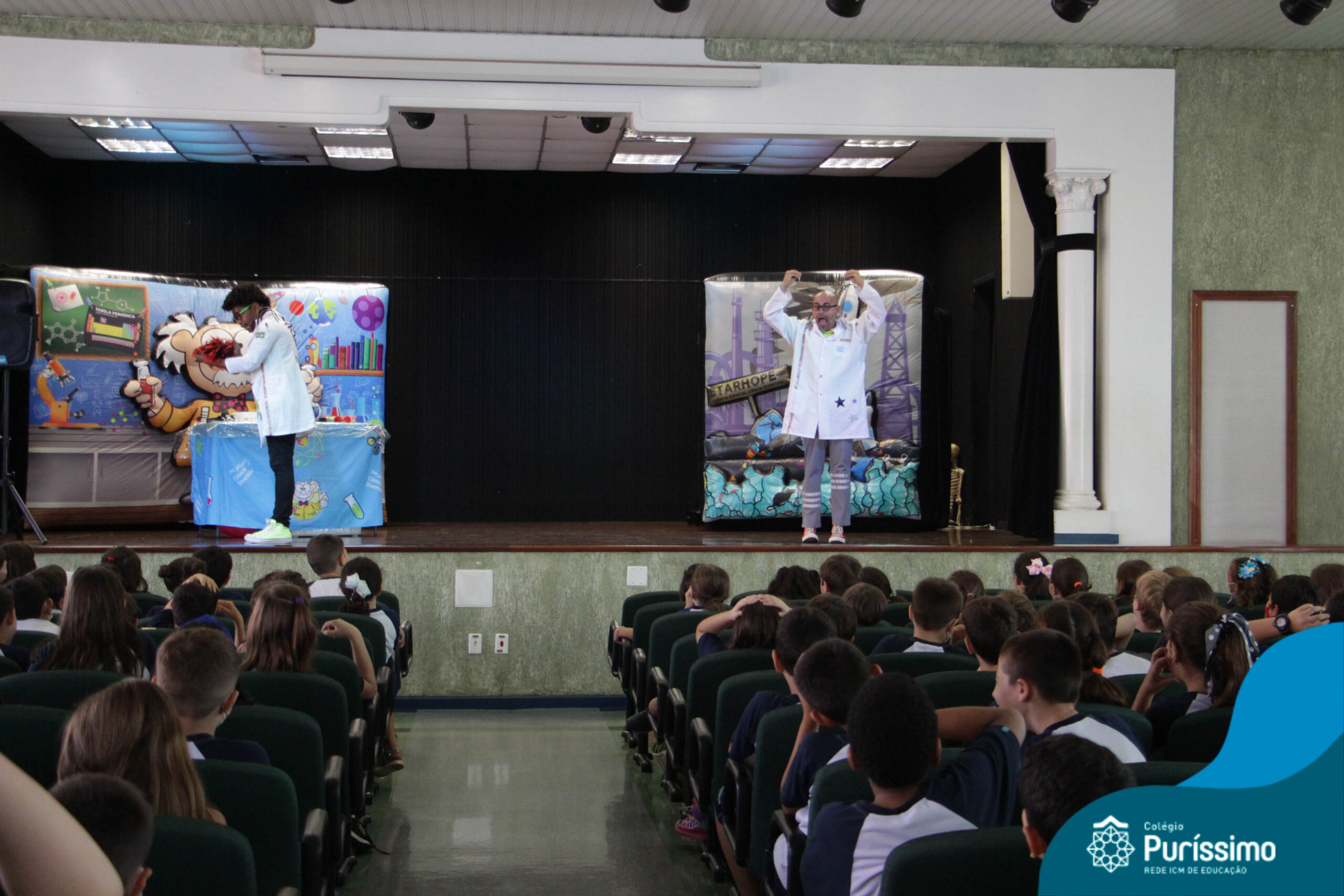 Os alunos do 3º aos 5º anos do EF Anos Iniciais, da manhã e tarde, tiveram a oportunidade de assistir a peça “Por um futuro sustentável”, a qual conta a história de dois cientistas do futuro que voltam ao passado para alertar a população sobre os problemas que serão causados pelo consumo excessivo de recursos naturais no presente.