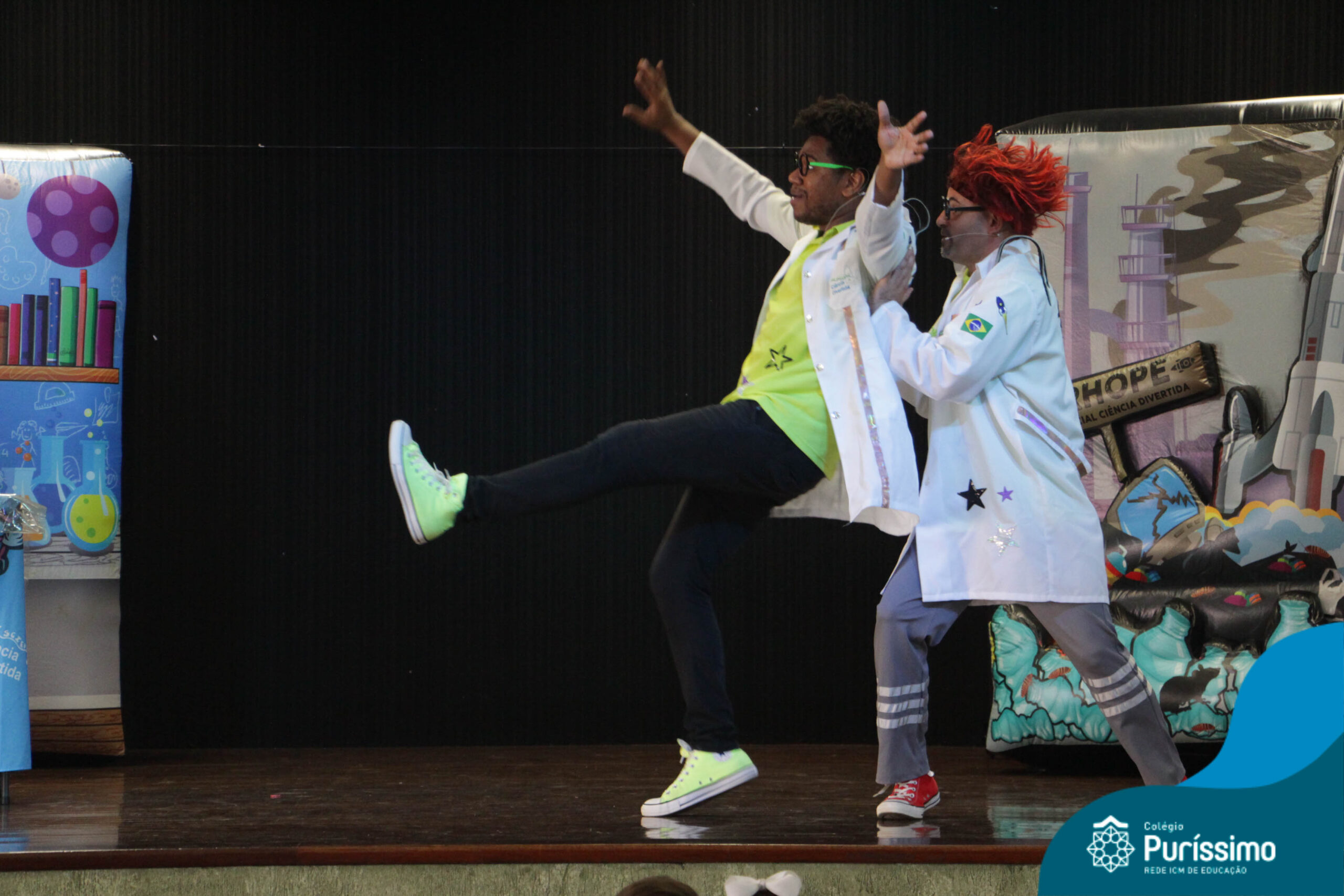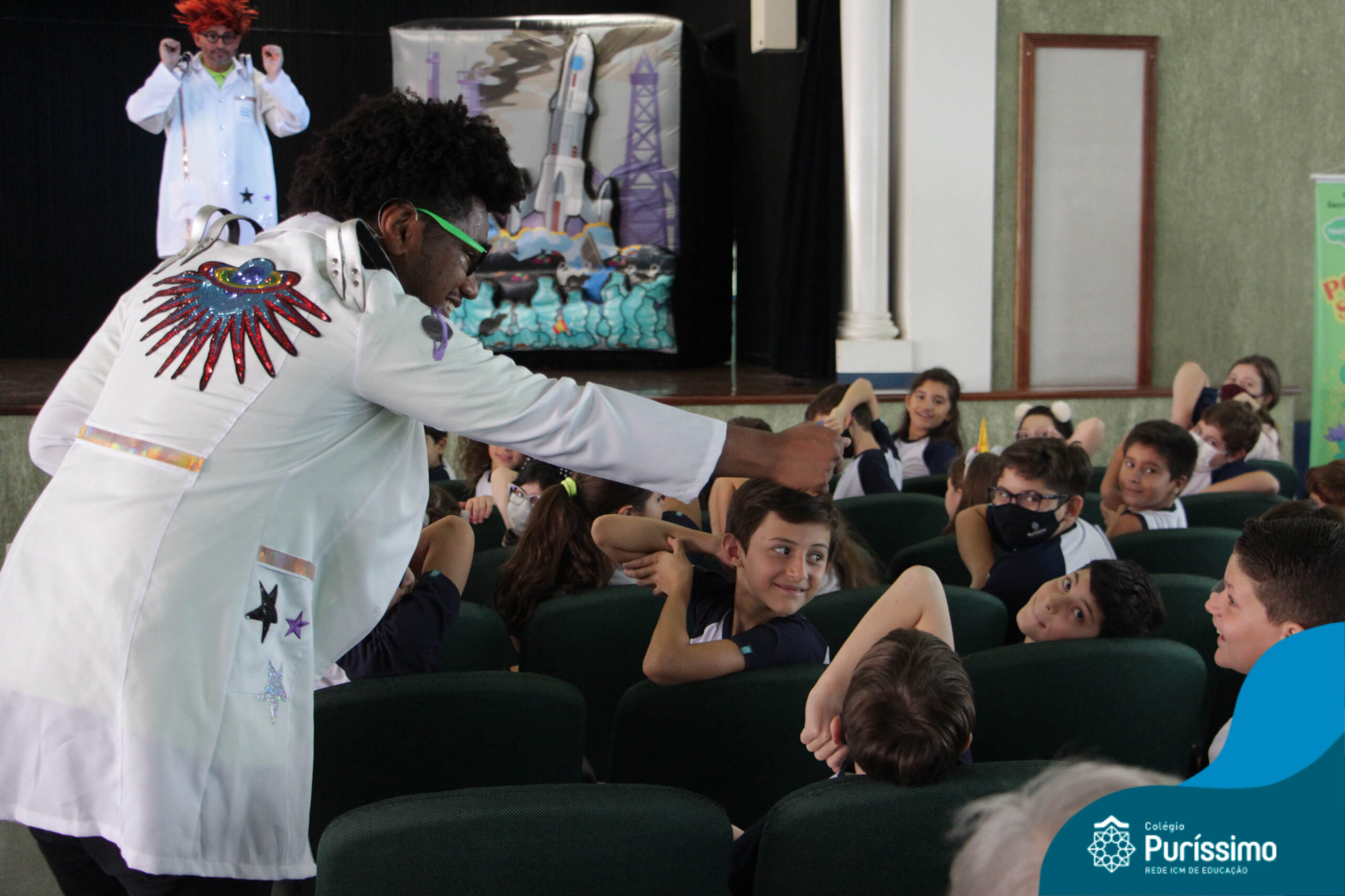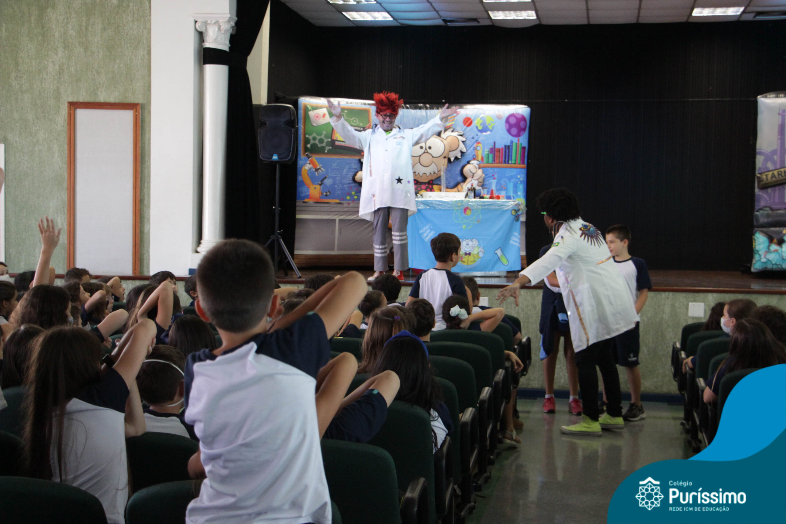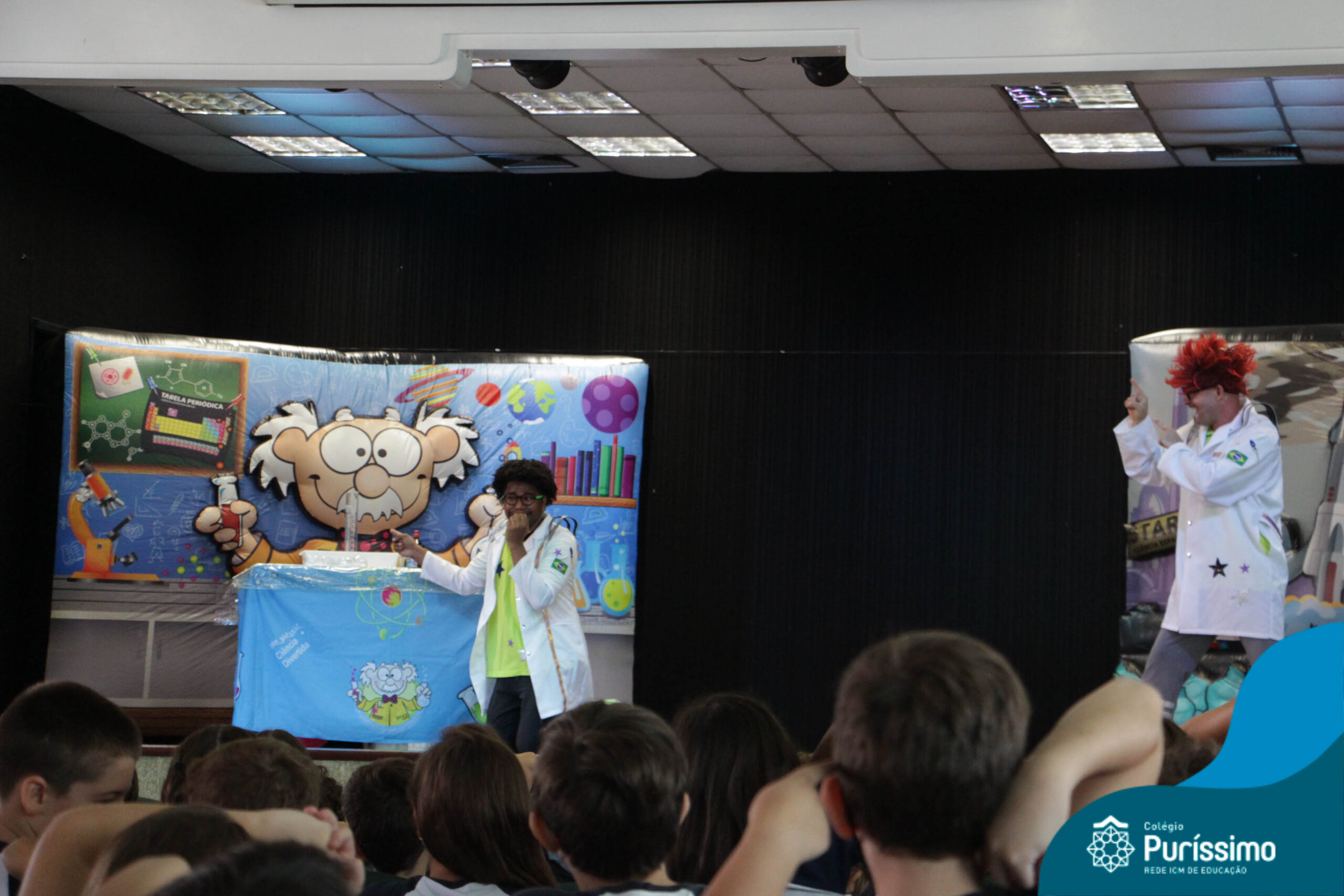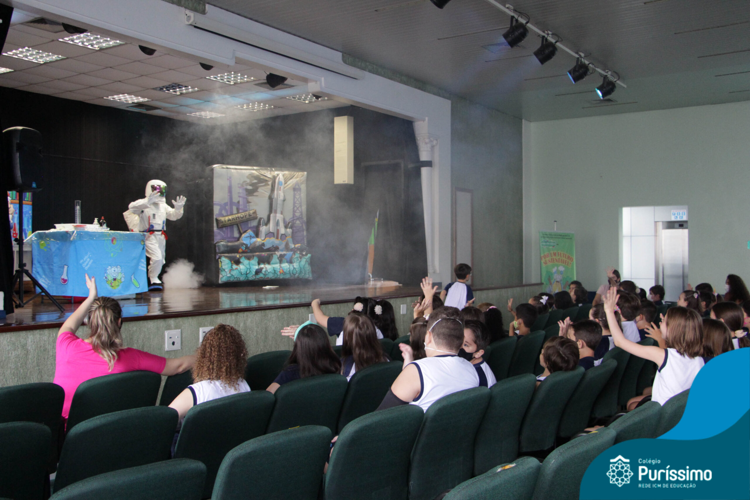 Os alunos do 3º aos 5º anos do EF Anos Iniciais, da manhã e tarde, tiveram a oportunidade de assistir a peça “Por um futuro sustentável”, a qual conta a história de dois cientistas do futuro que voltam ao passado para alertar a população sobre os problemas que serão causados pelo consumo excessivo de recursos naturais no presente.