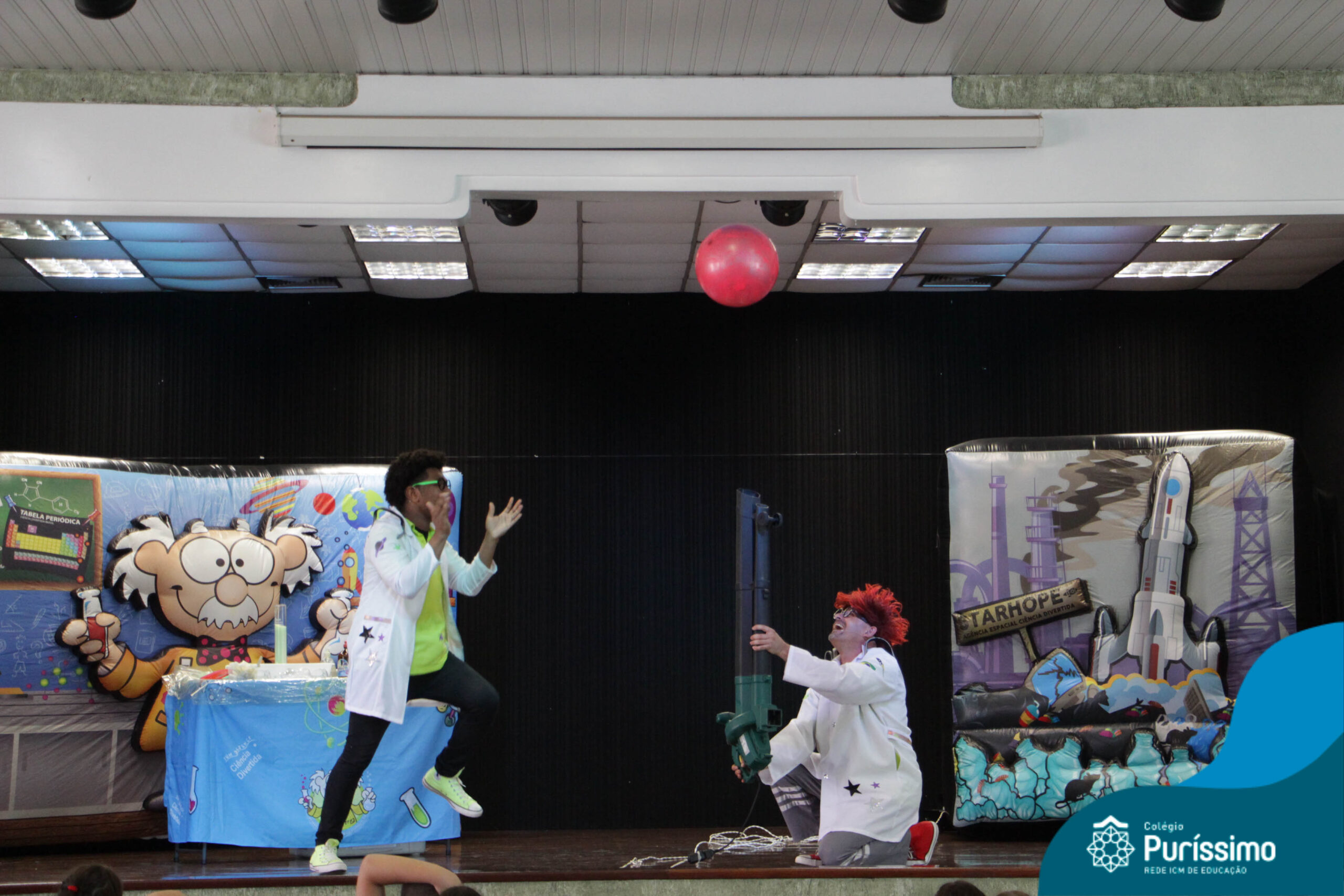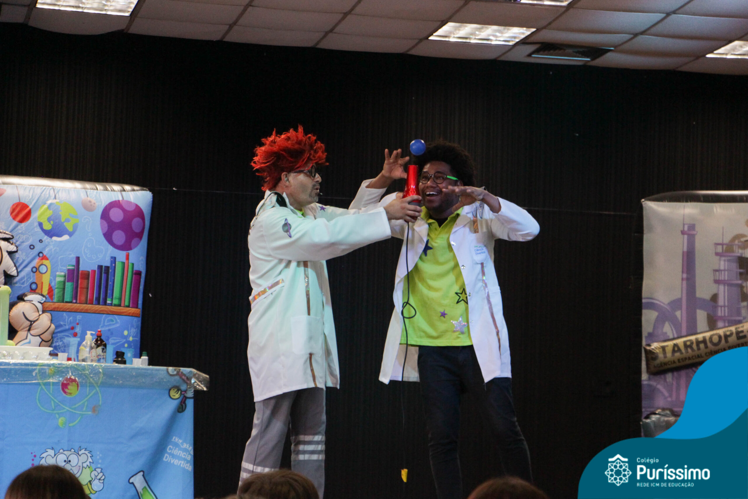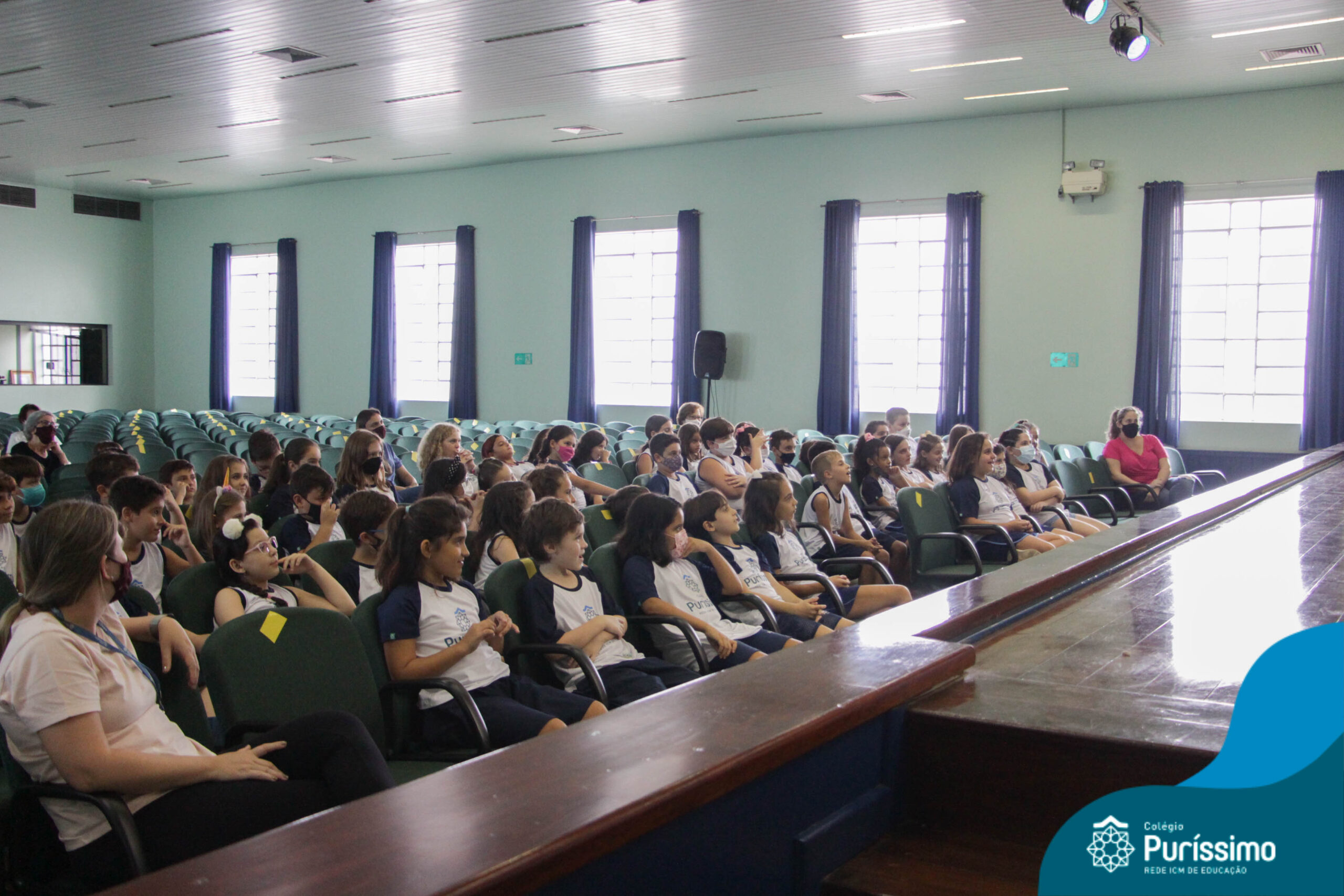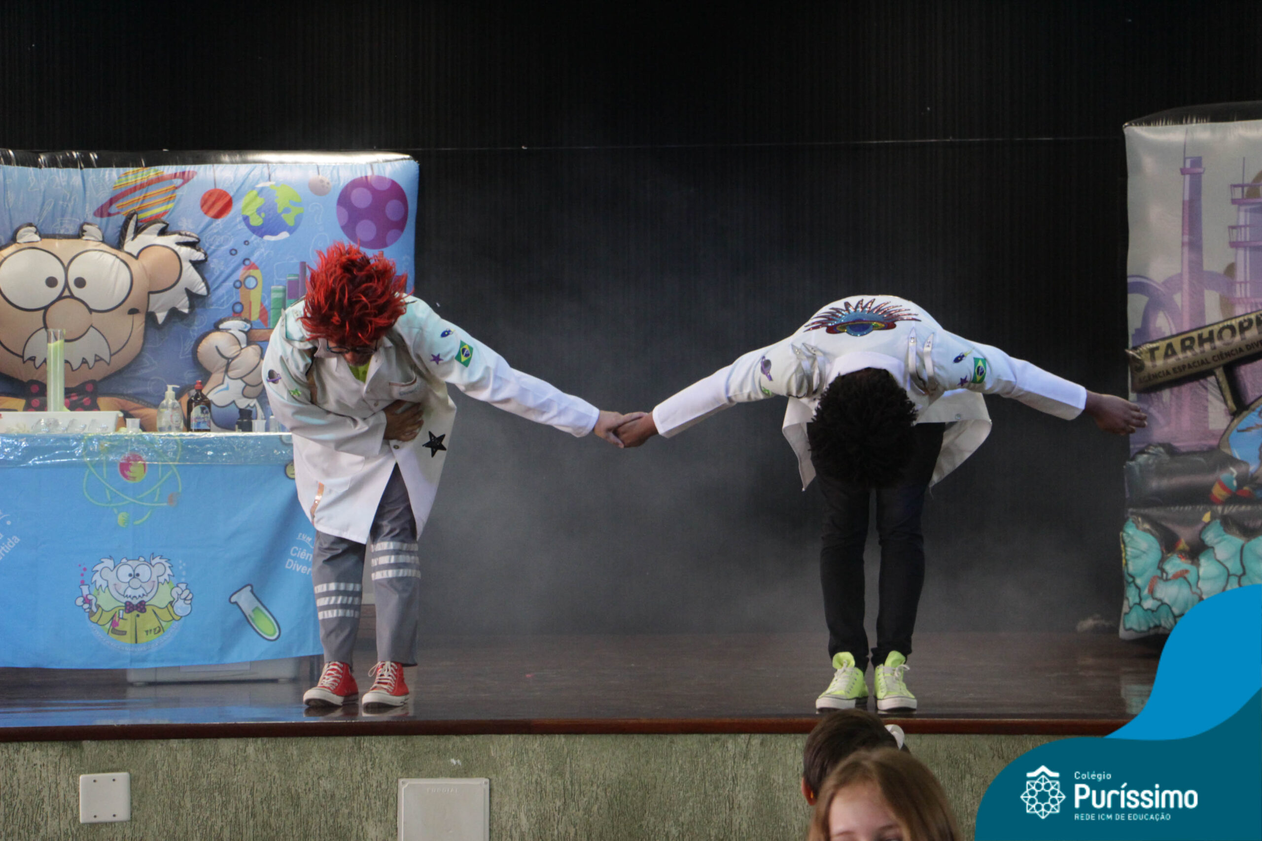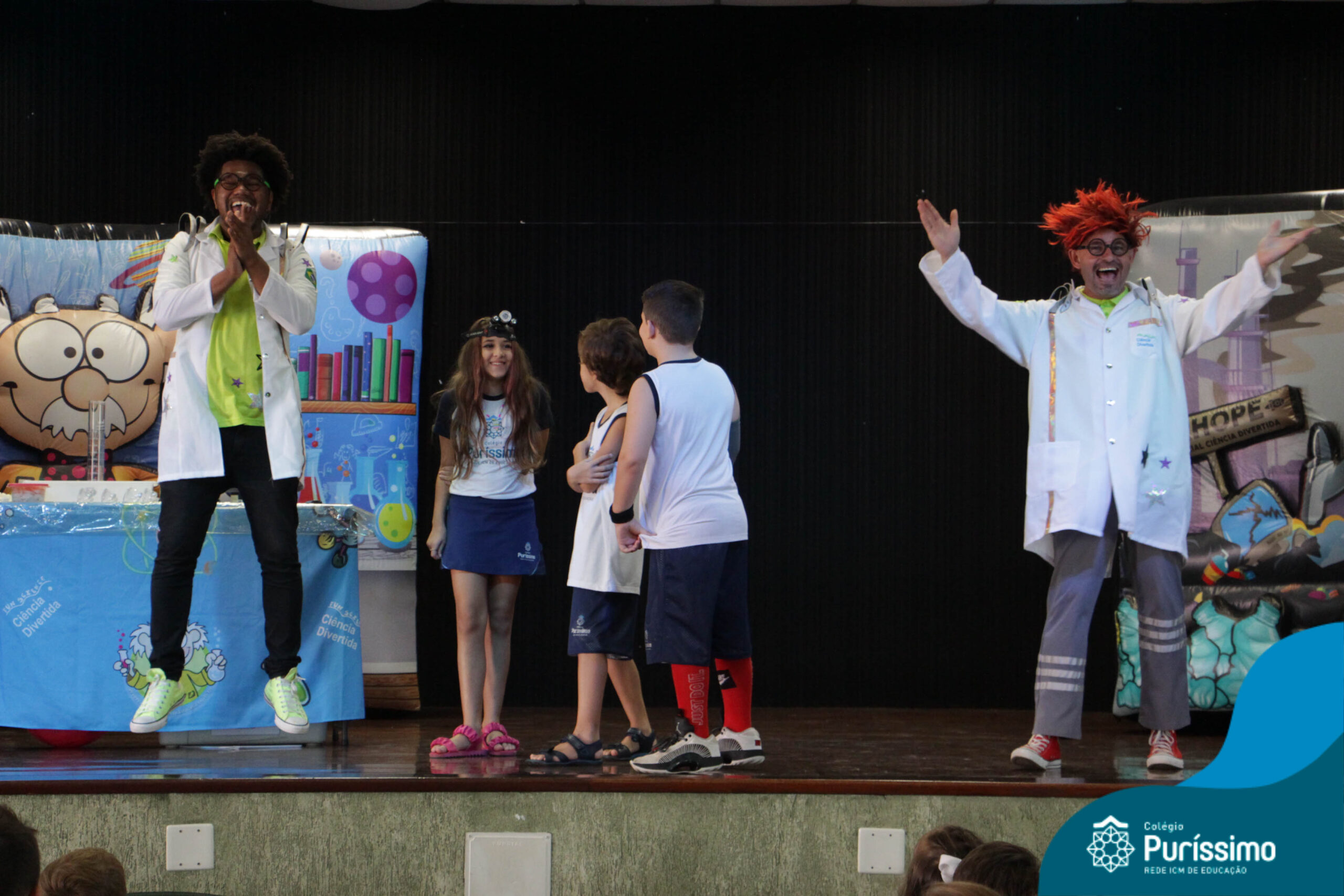 Os alunos do 3º aos 5º anos do EF Anos Iniciais, da manhã e tarde, tiveram a oportunidade de assistir a peça “Por um futuro sustentável”, a qual conta a história de dois cientistas do futuro que voltam ao passado para alertar a população sobre os problemas que serão causados pelo consumo excessivo de recursos naturais no presente.