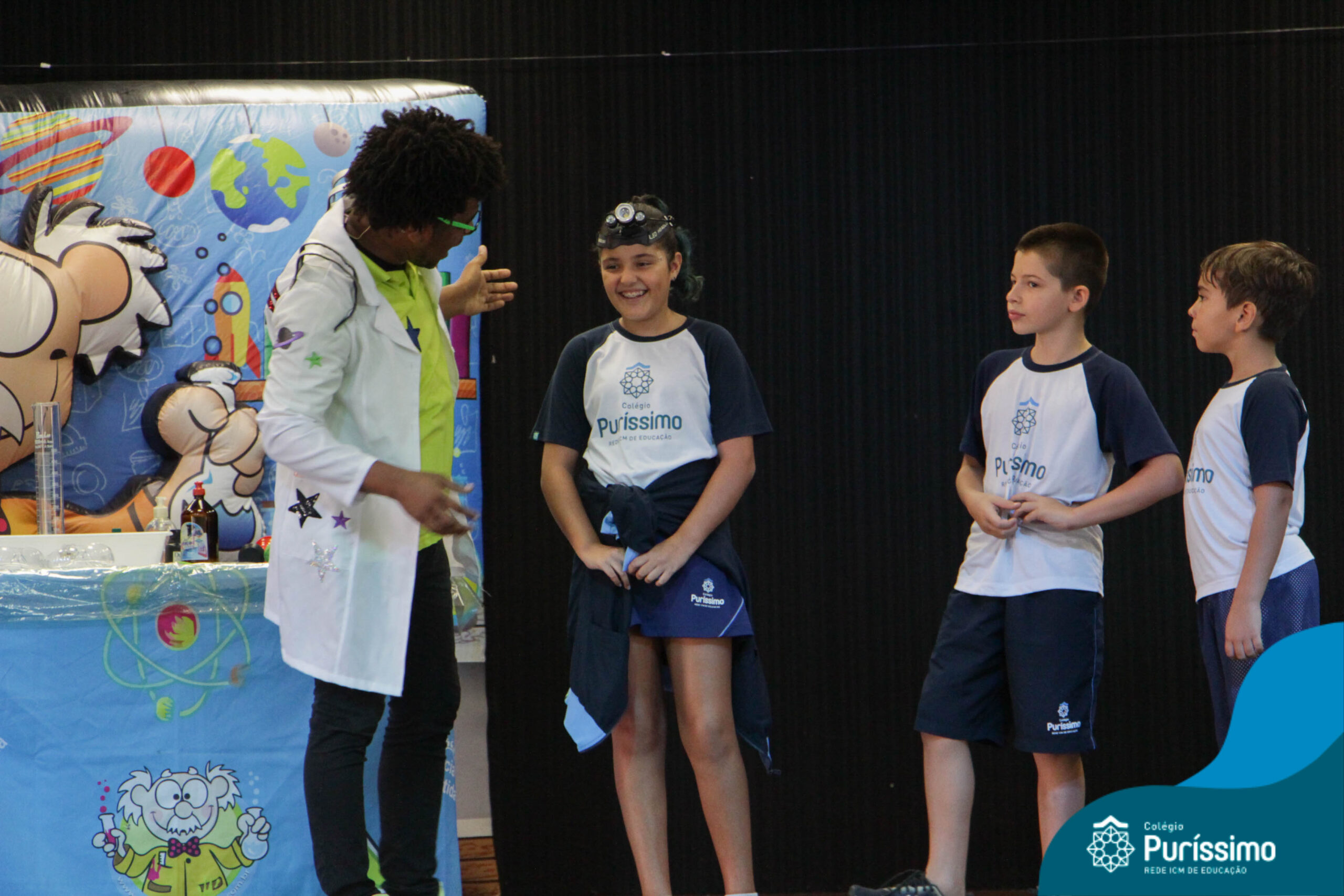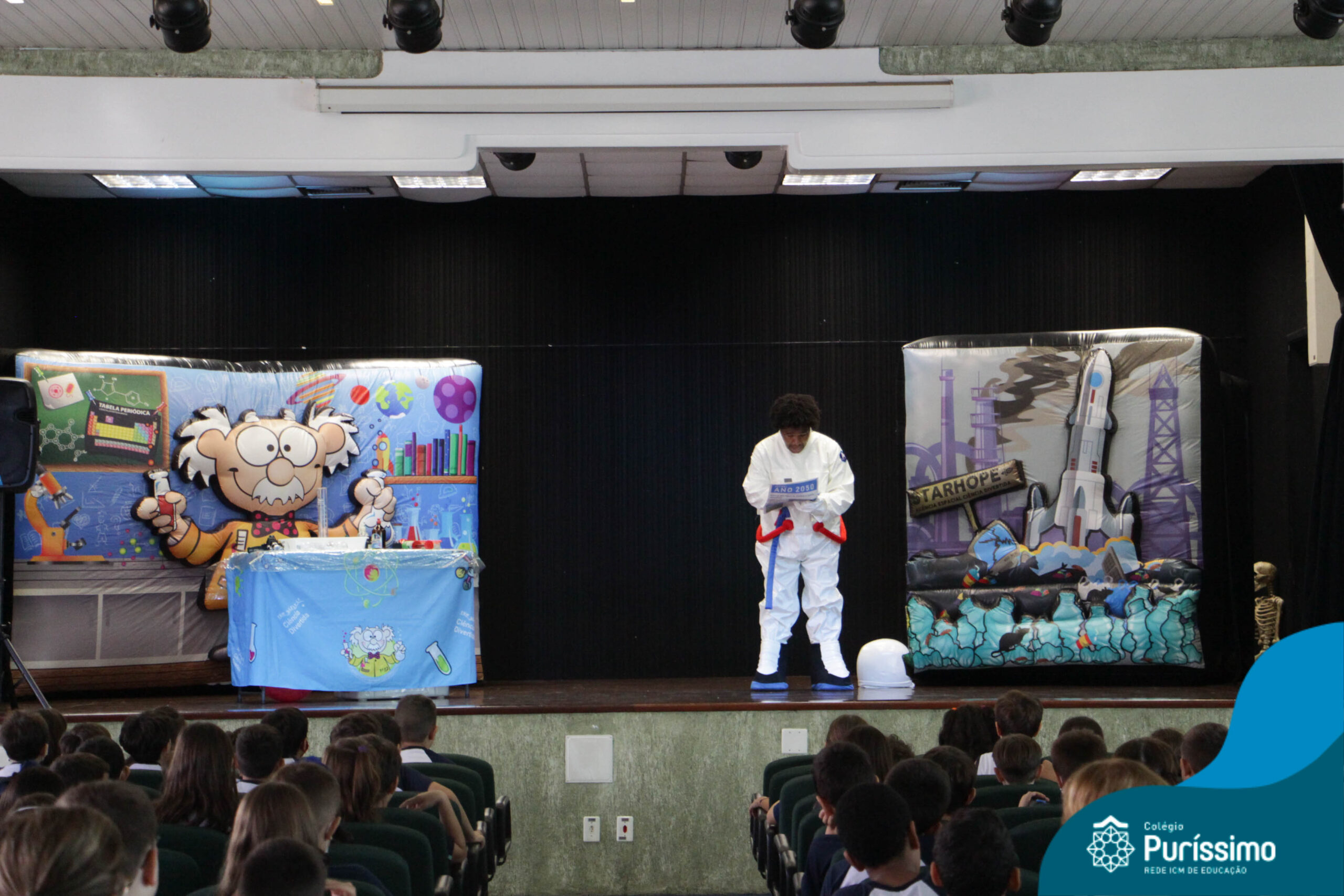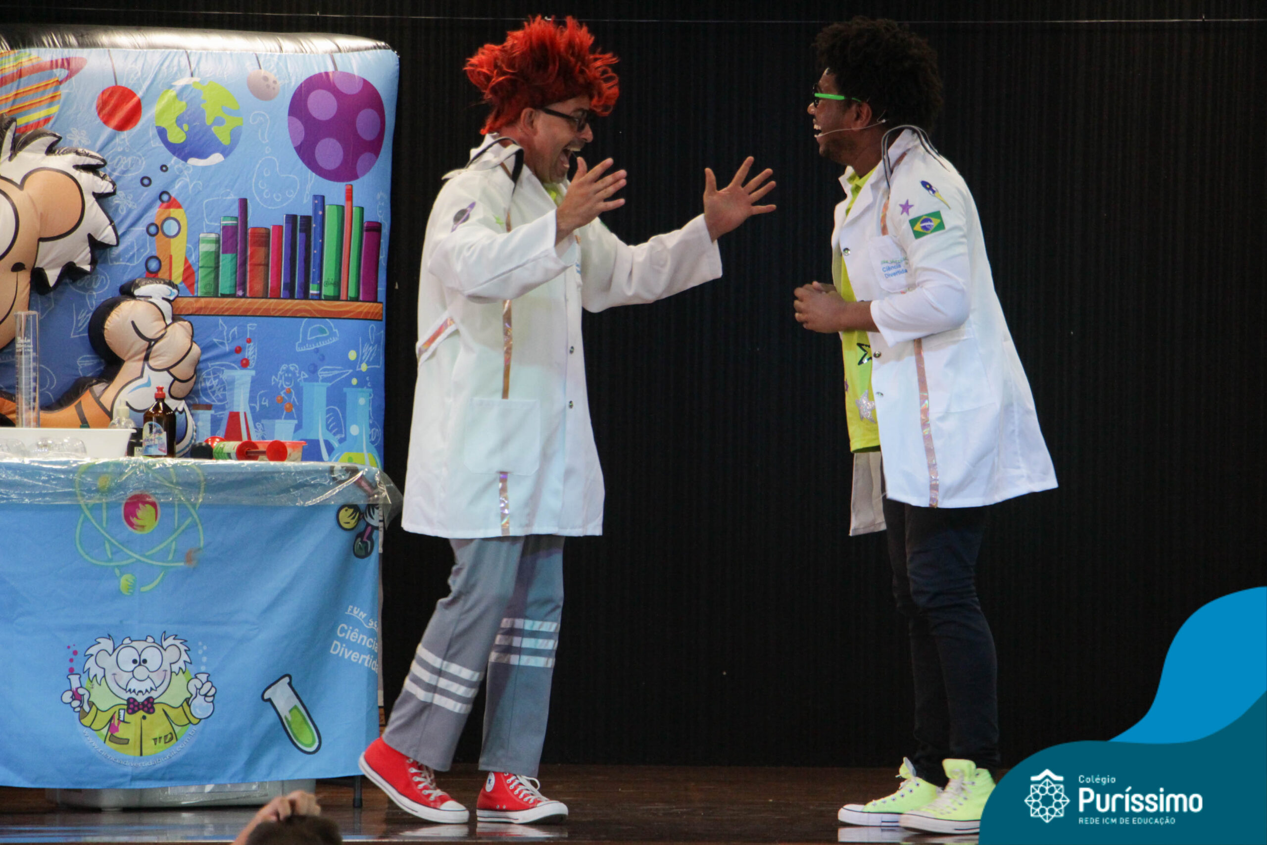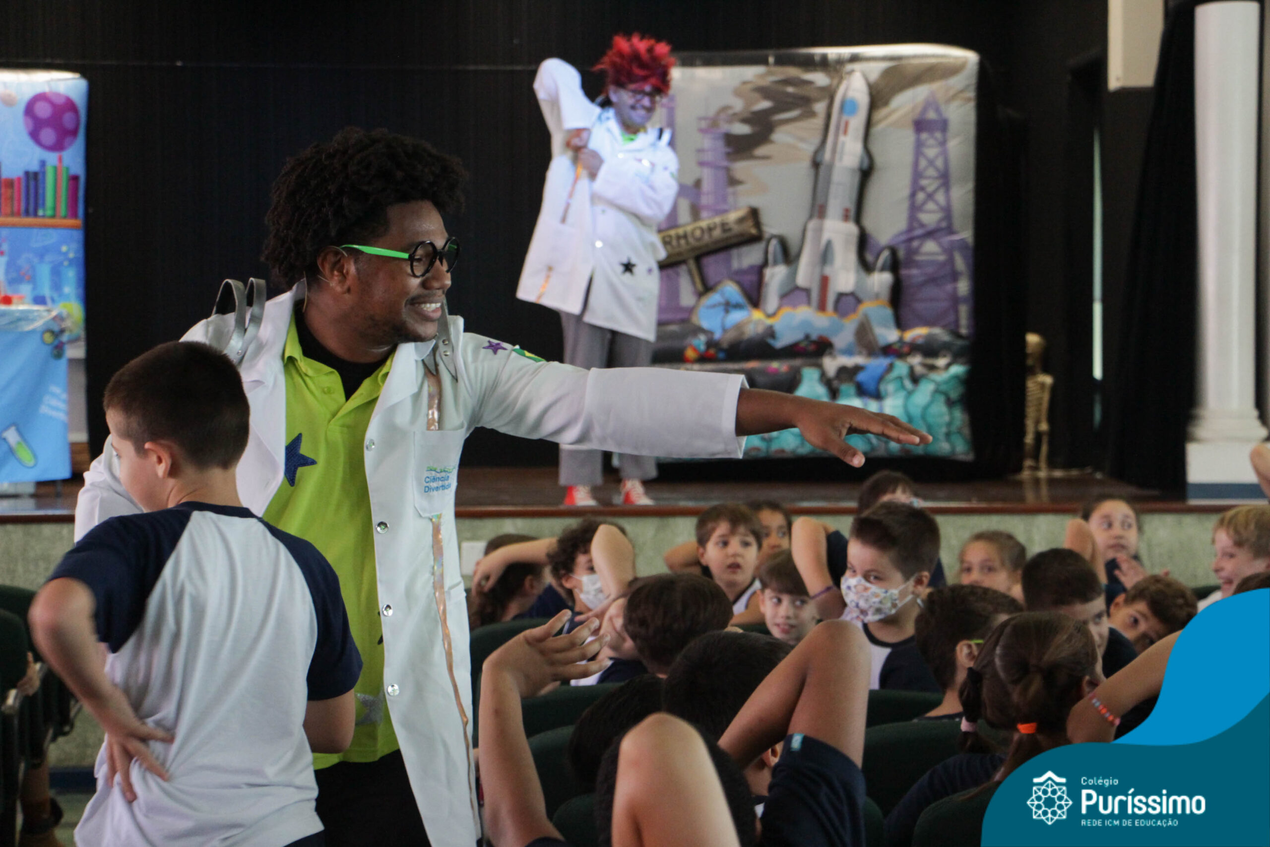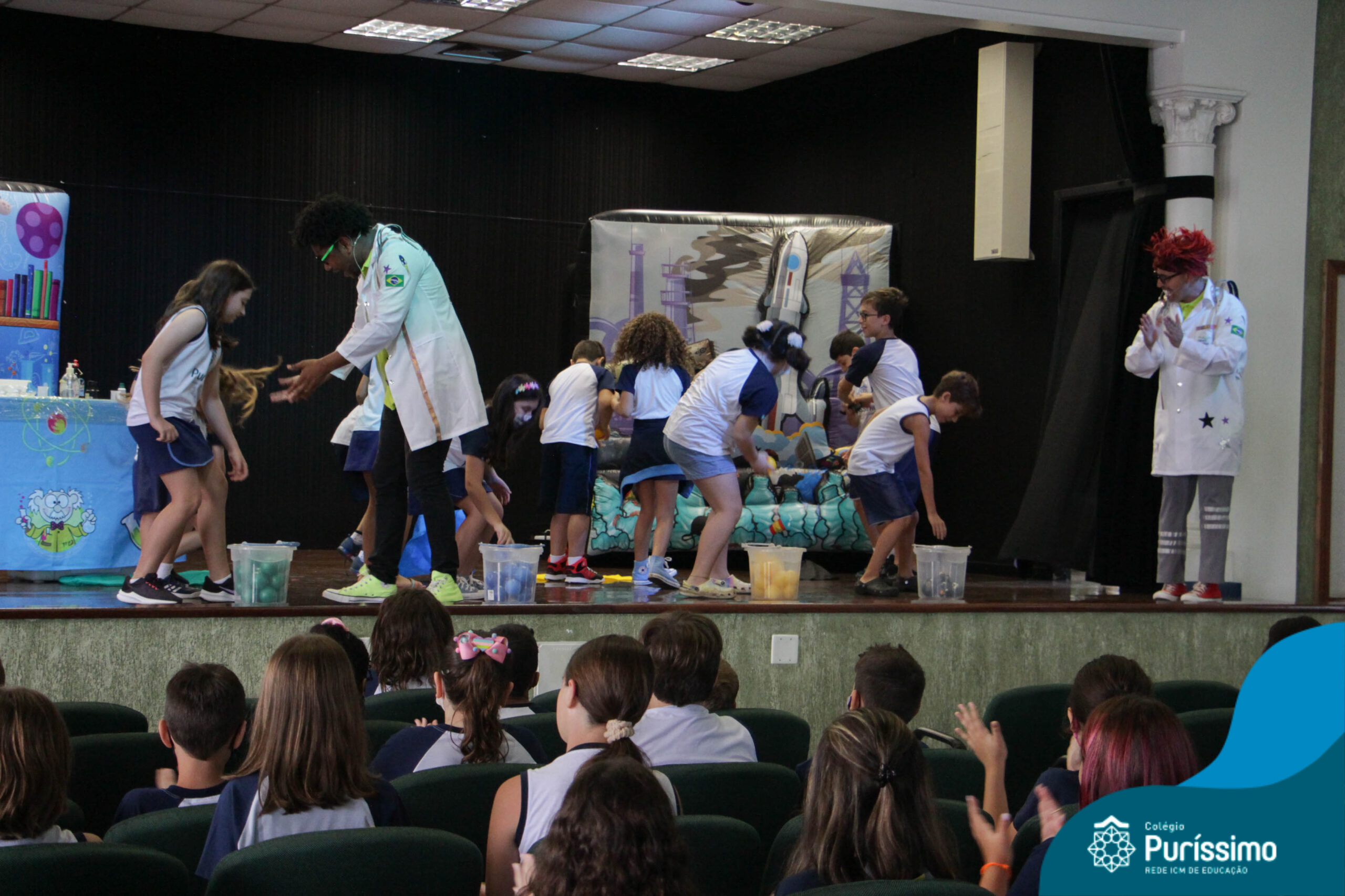 Os alunos do 3º aos 5º anos do EF Anos Iniciais, da manhã e tarde, tiveram a oportunidade de assistir a peça “Por um futuro sustentável”, a qual conta a história de dois cientistas do futuro que voltam ao passado para alertar a população sobre os problemas que serão causados pelo consumo excessivo de recursos naturais no presente.