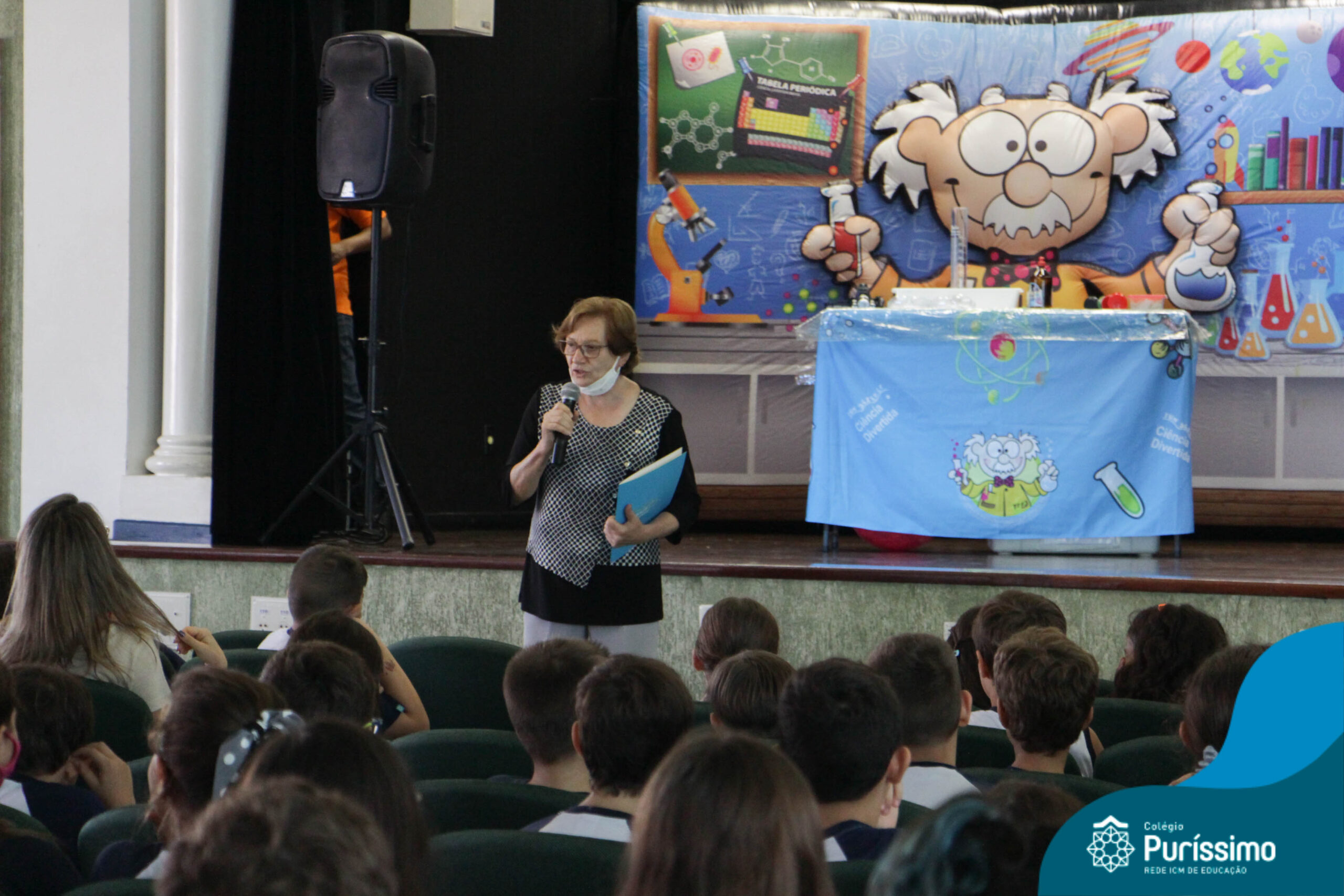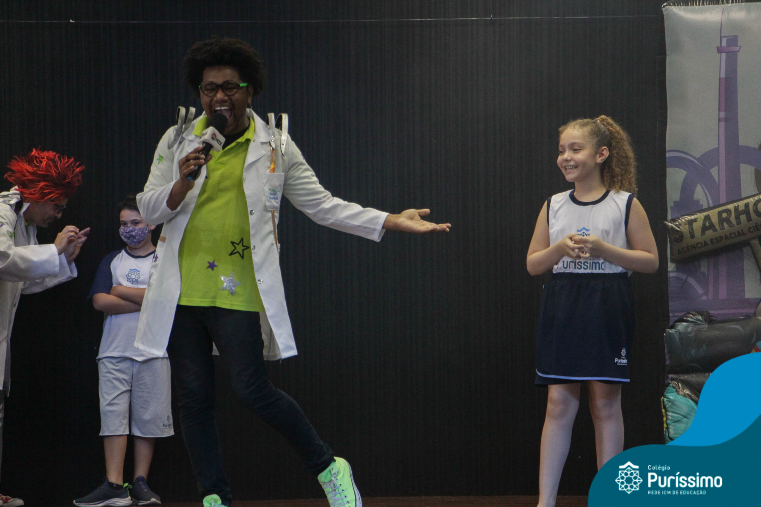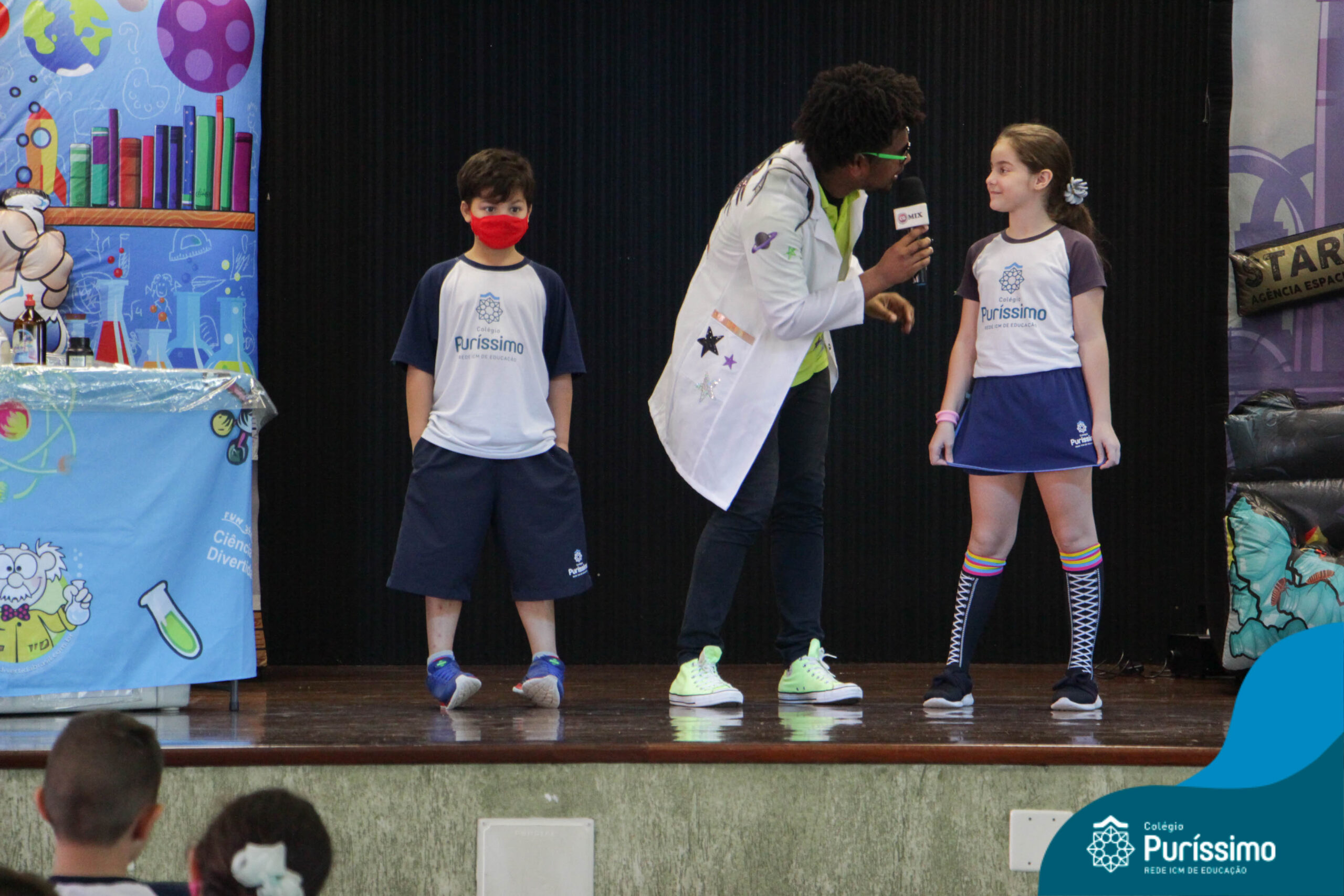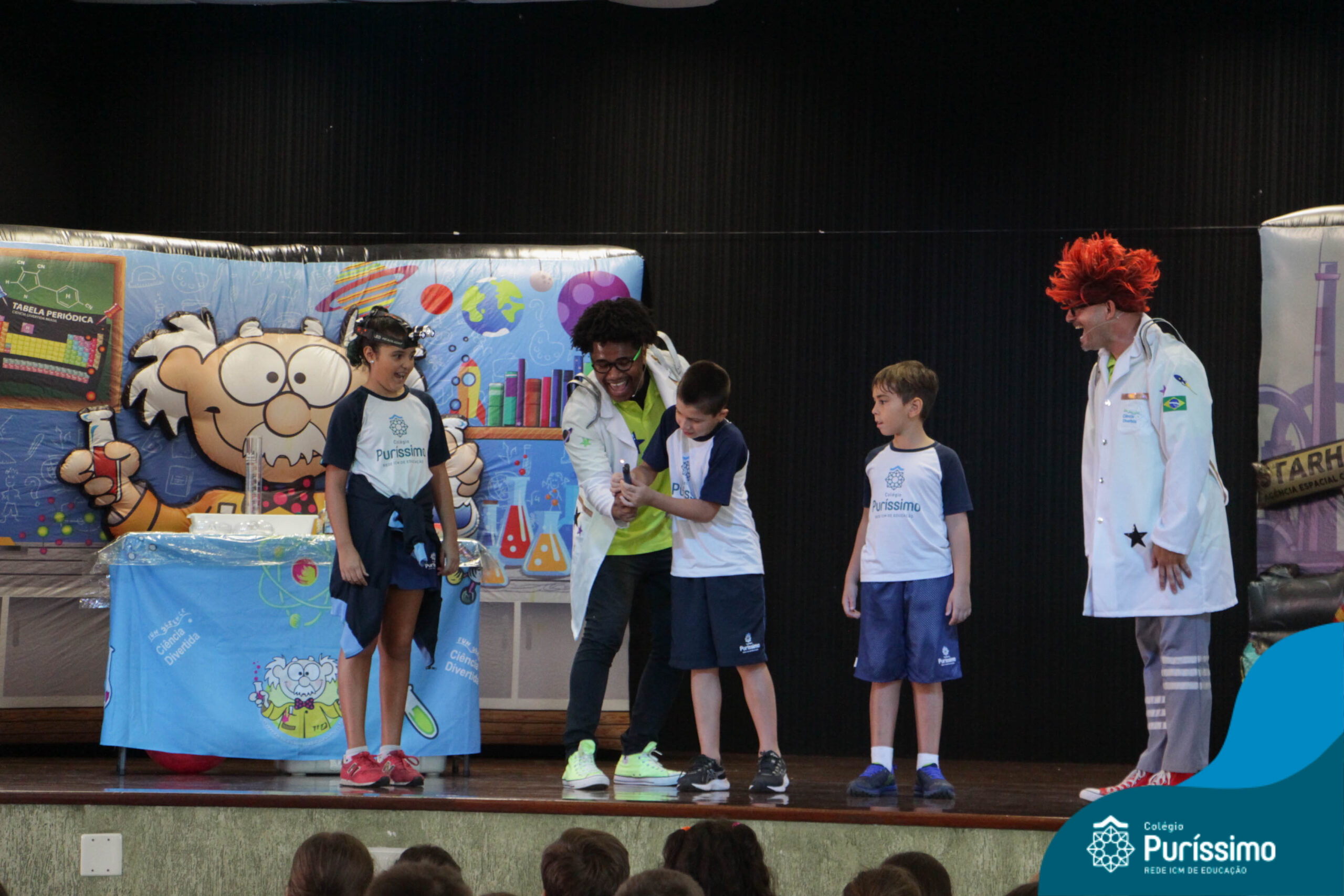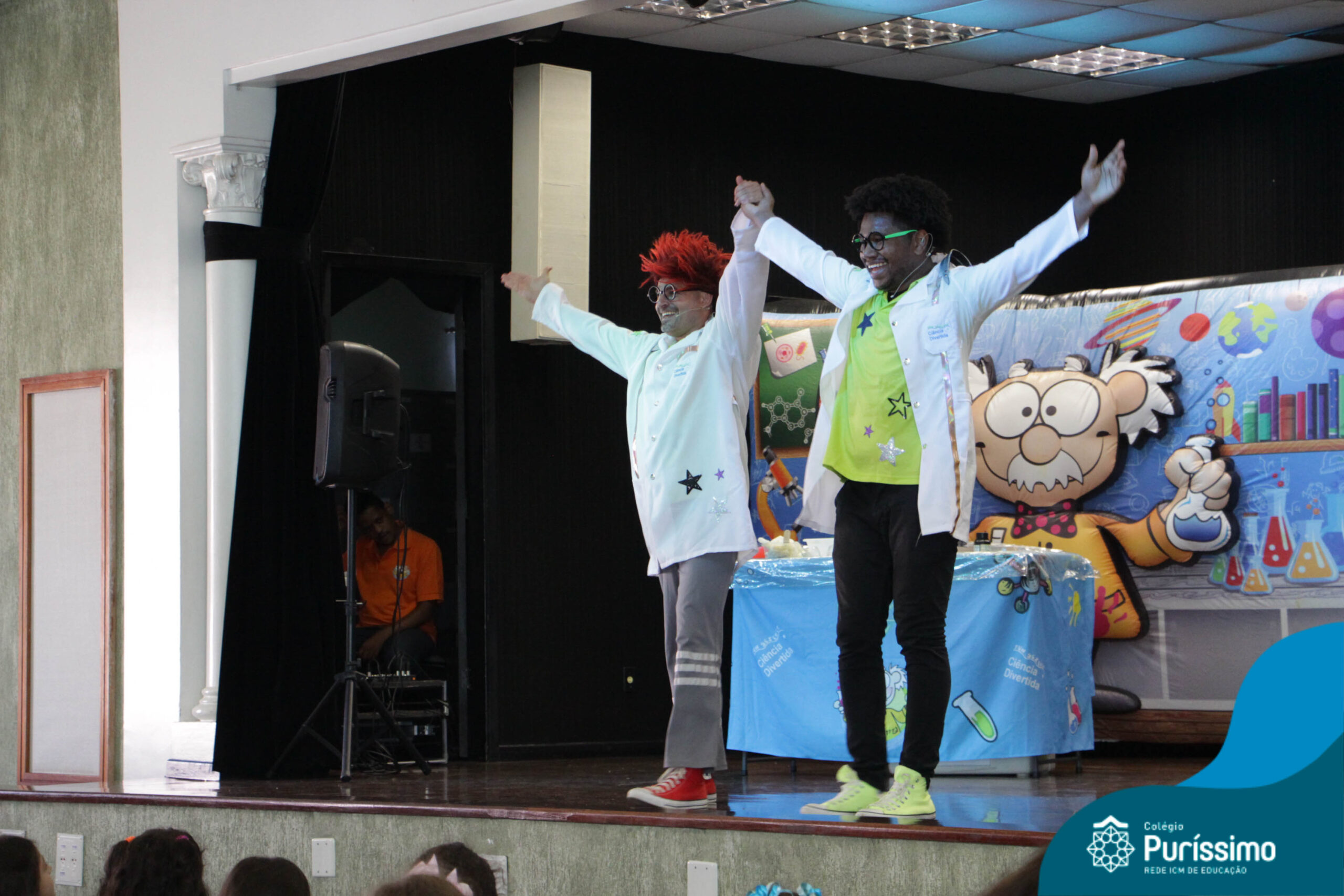 Os alunos do 3º aos 5º anos do EF Anos Iniciais, da manhã e tarde, tiveram a oportunidade de assistir a peça “Por um futuro sustentável”, a qual conta a história de dois cientistas do futuro que voltam ao passado para alertar a população sobre os problemas que serão causados pelo consumo excessivo de recursos naturais no presente.
